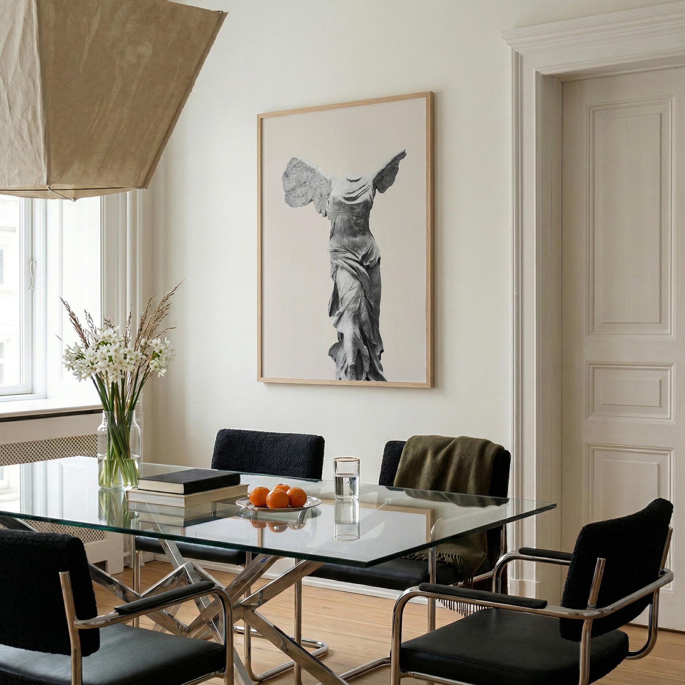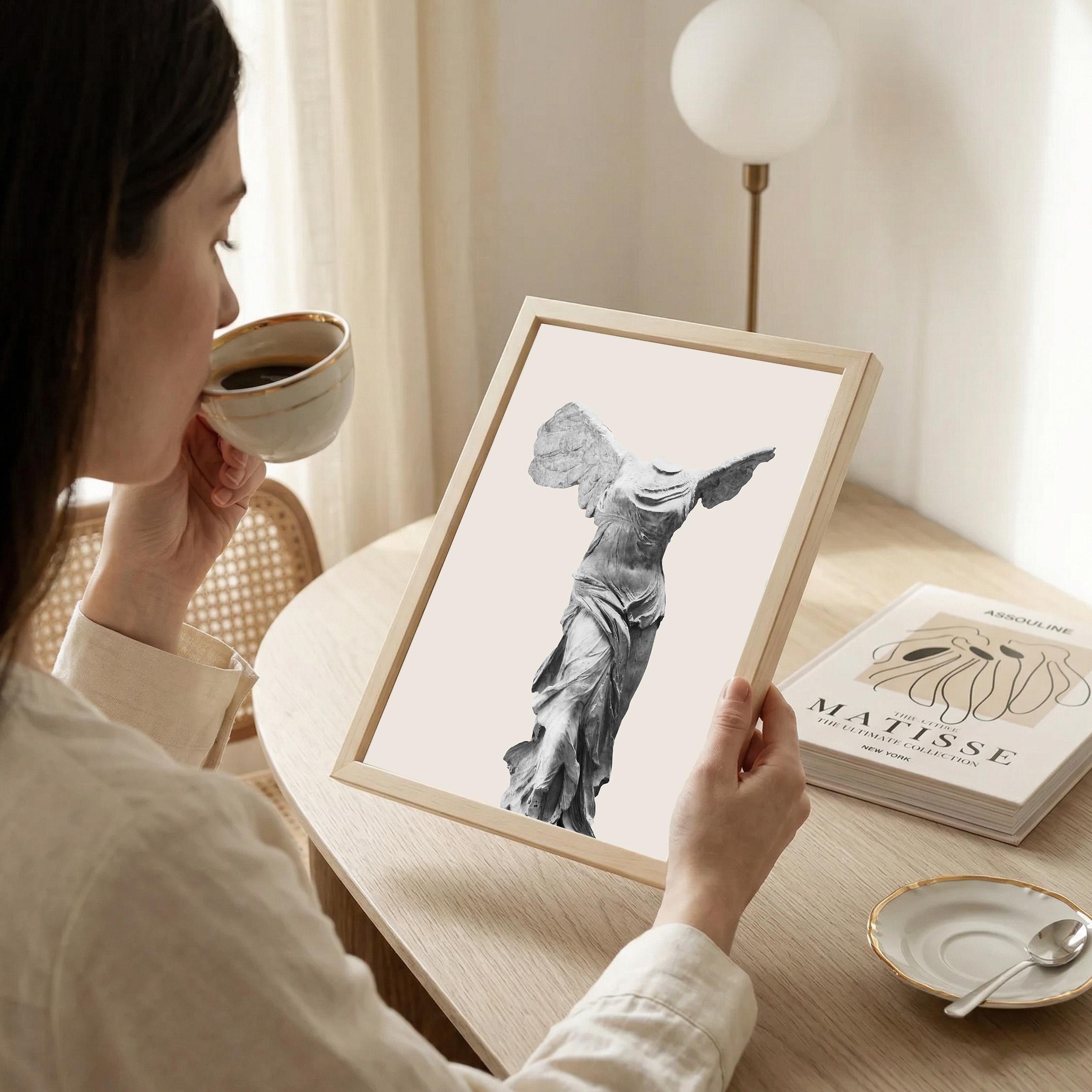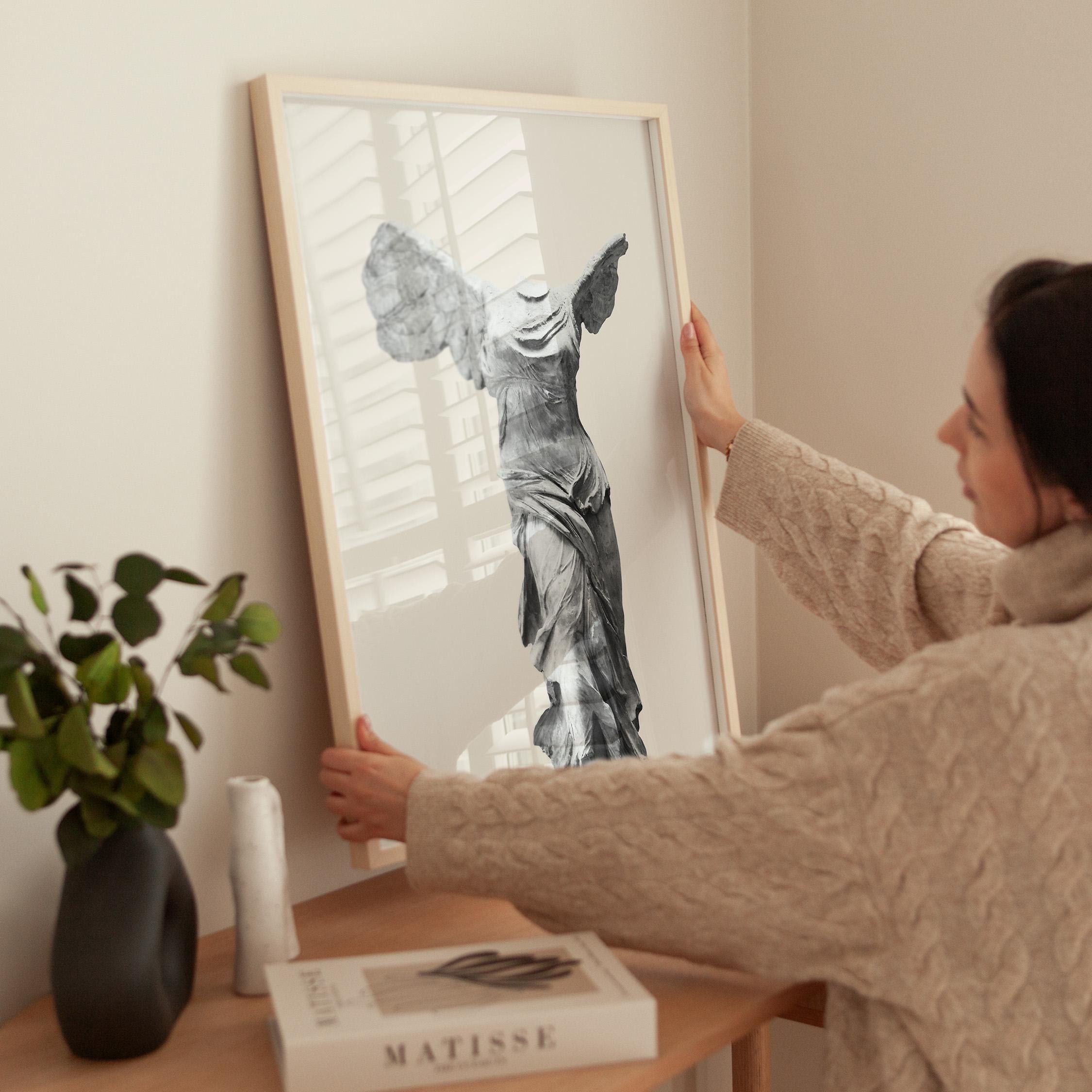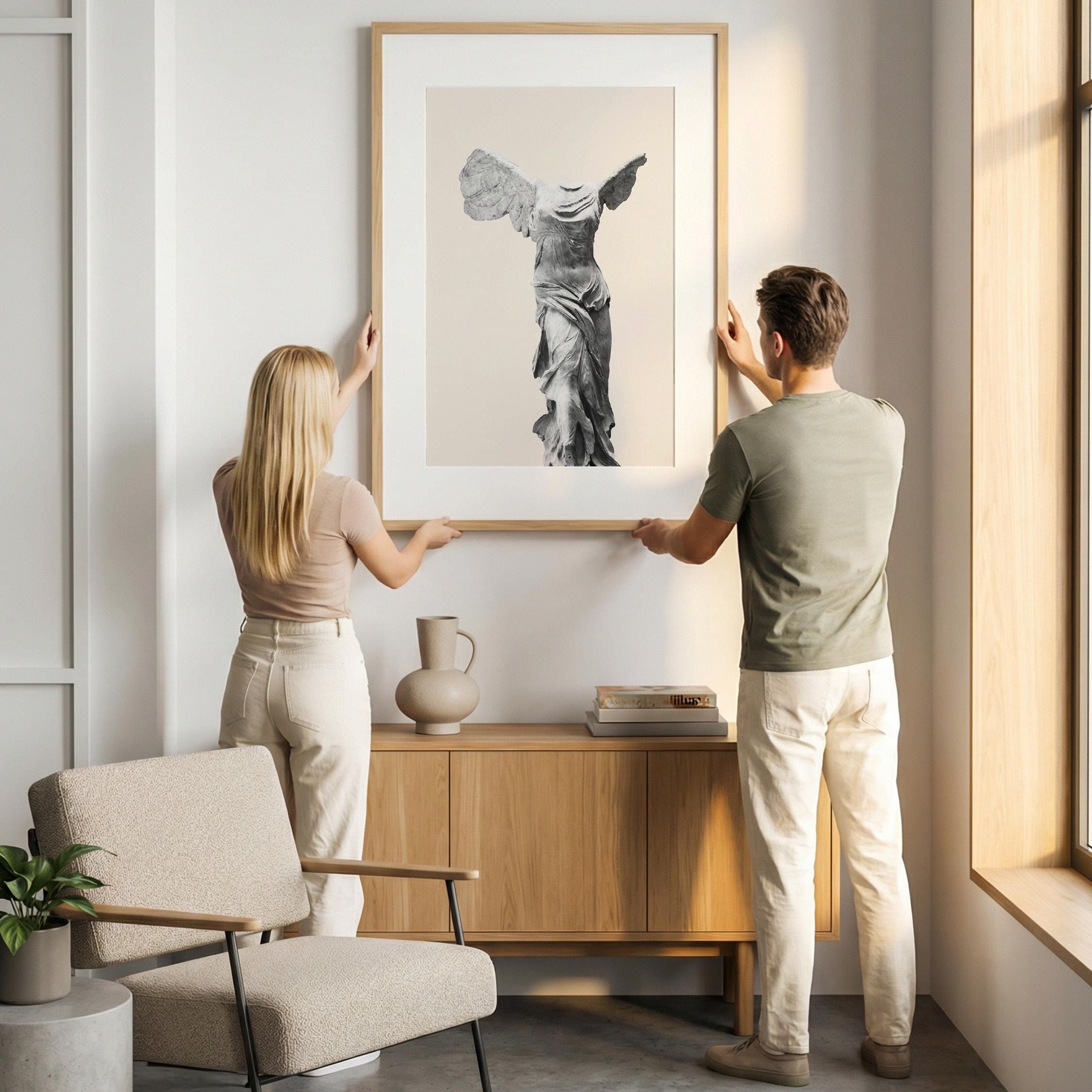 Bring museum elegance home with this iconic Winged Victory sculpture print on a soft neutral background. Perfect for lovers of classical art, history enthusiasts, and those seeking refined decor for living rooms, home offices, or entryways. This timeless Greek statue art adds sophistication and cultural depth to any space with its graceful, sculptural beauty.