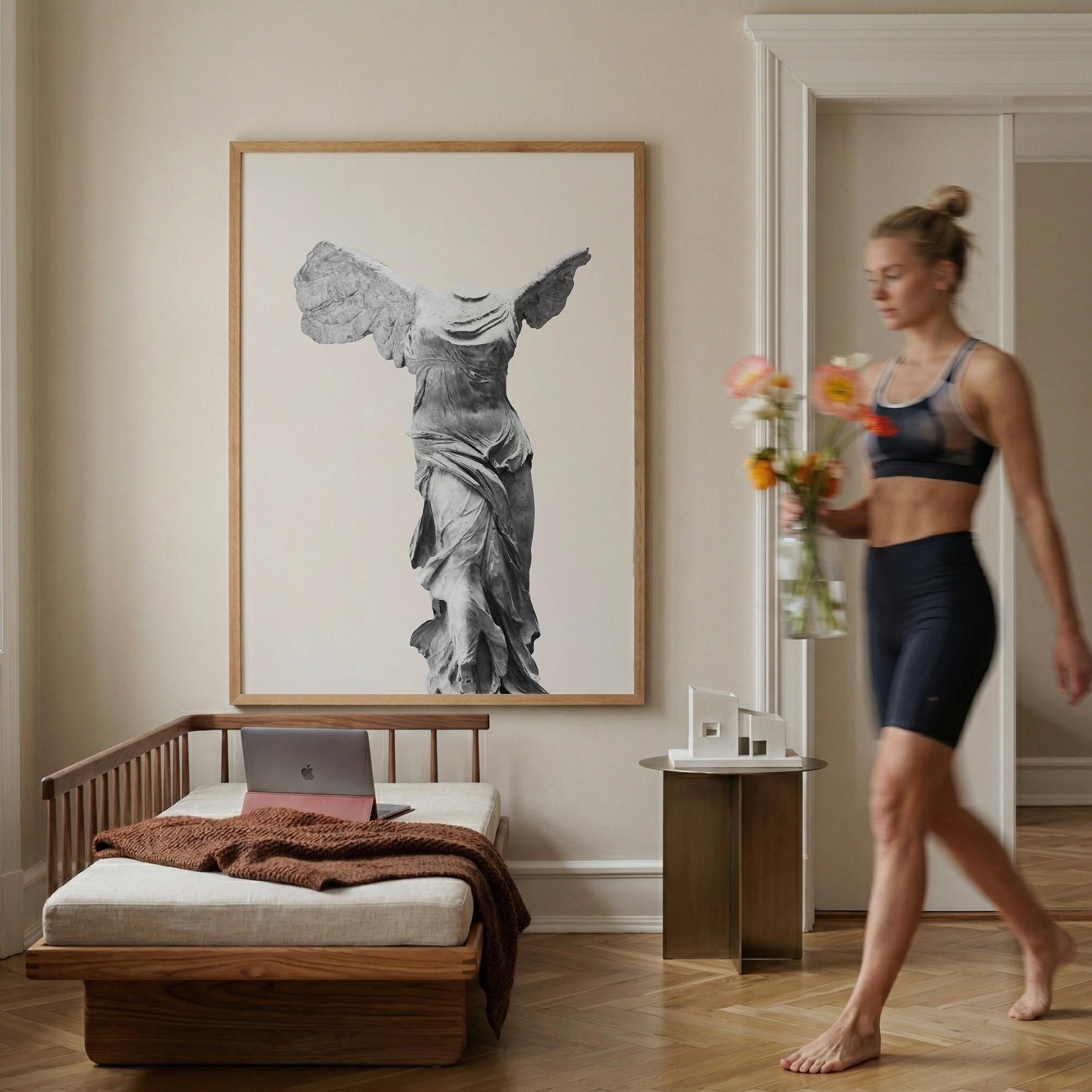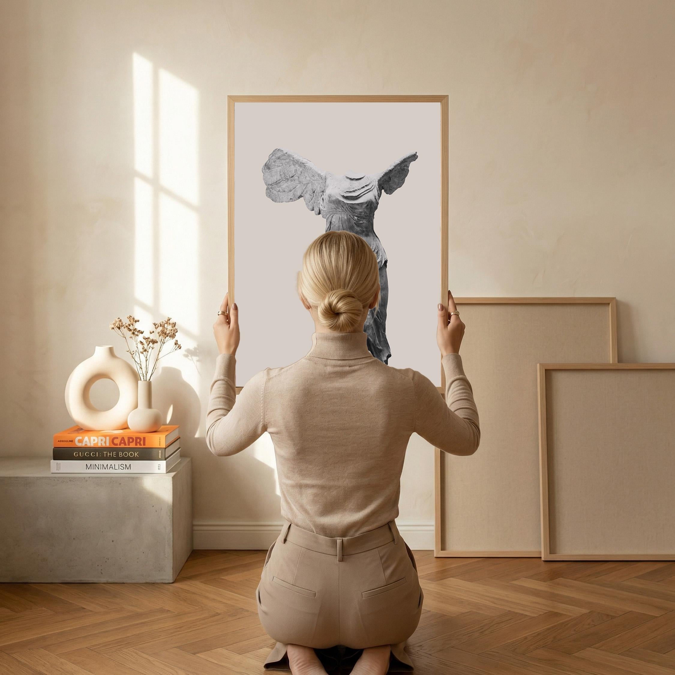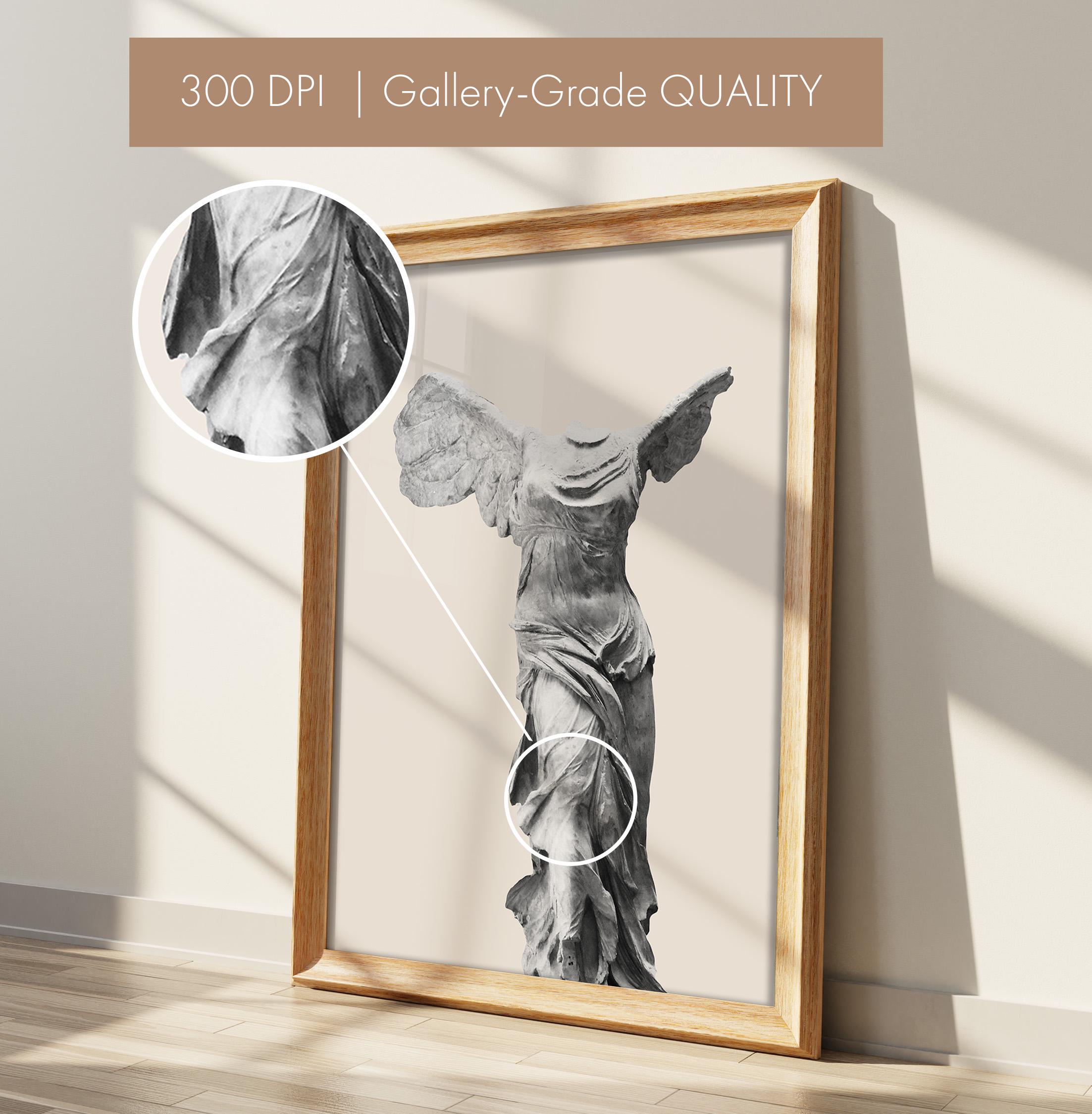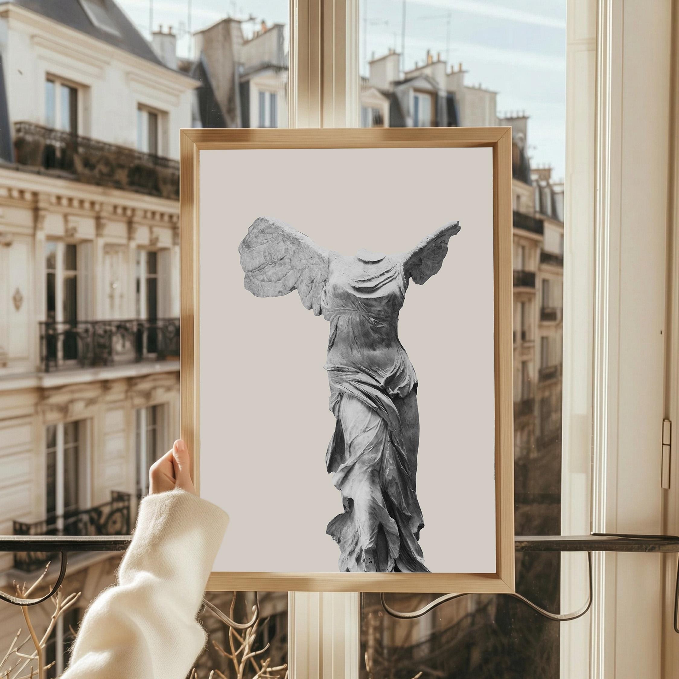 Bring museum elegance home with this iconic Winged Victory sculpture print on a soft neutral background. Perfect for lovers of classical art, history enthusiasts, and those seeking refined decor for living rooms, home offices, or entryways. This timeless Greek statue art adds sophistication and cultural depth to any space with its graceful, sculptural beauty.