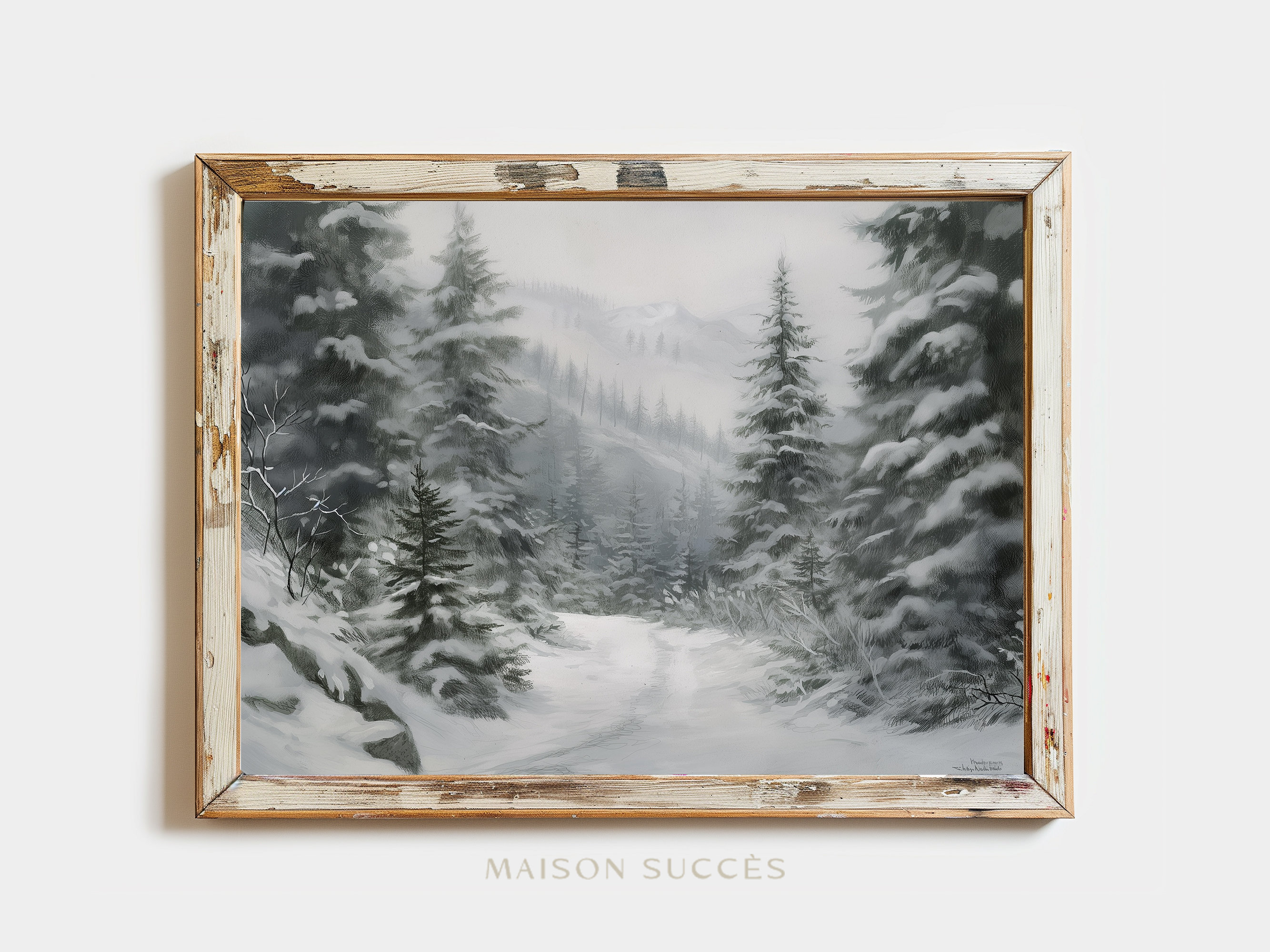 ▶ Embrace the cozy charm of the season with 'Winter Forest Digital Art Print', a serene portrayal of a vintage winter landscape in soft green hues. This printable wall art is a treasure for those who delight in farmhouse decor, infusing a sense of calm winter elegance into any living space. Ideal for creating a festive farmhouse Christmas atmosphere or adding a touch of timeless beauty to your vintage home decor, this piece harmoniously blends the tranquility of neutral-toned artwork with the rustic essence of cottage country. Transform your living room decor into a winter haven with this digital print, where the nostalgia of vintage prints meets the tranquility of forest painting.