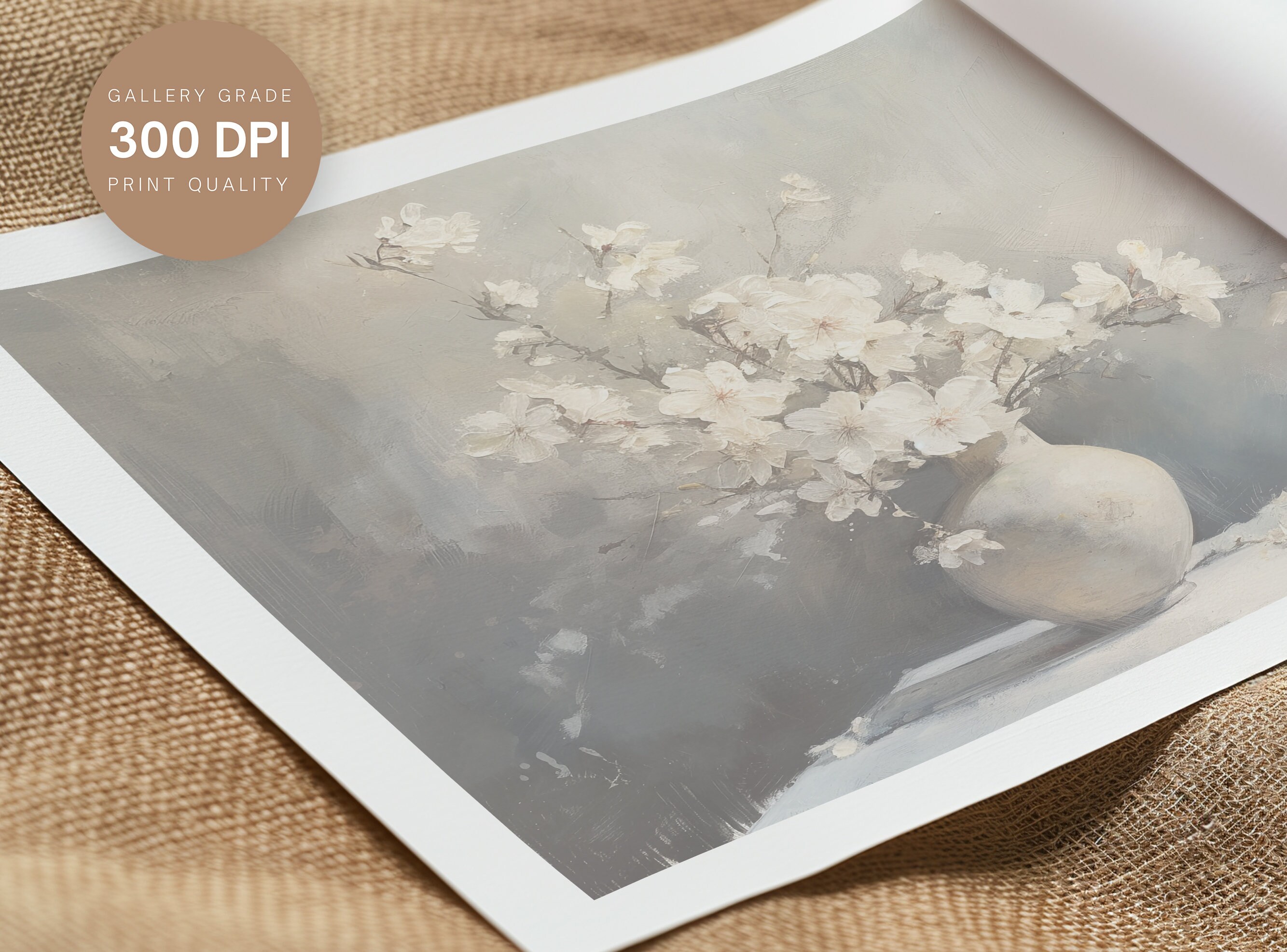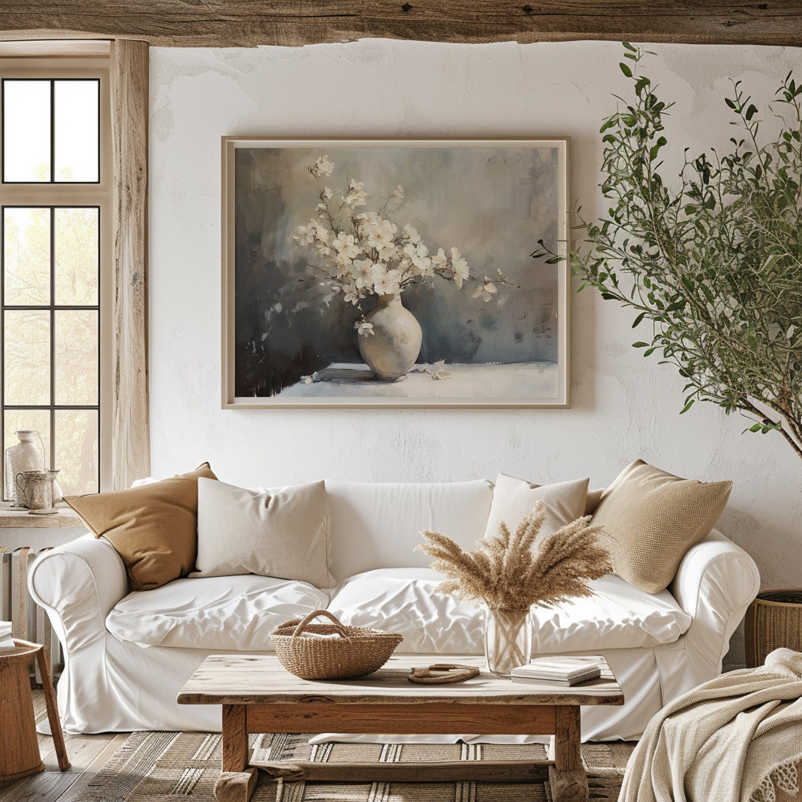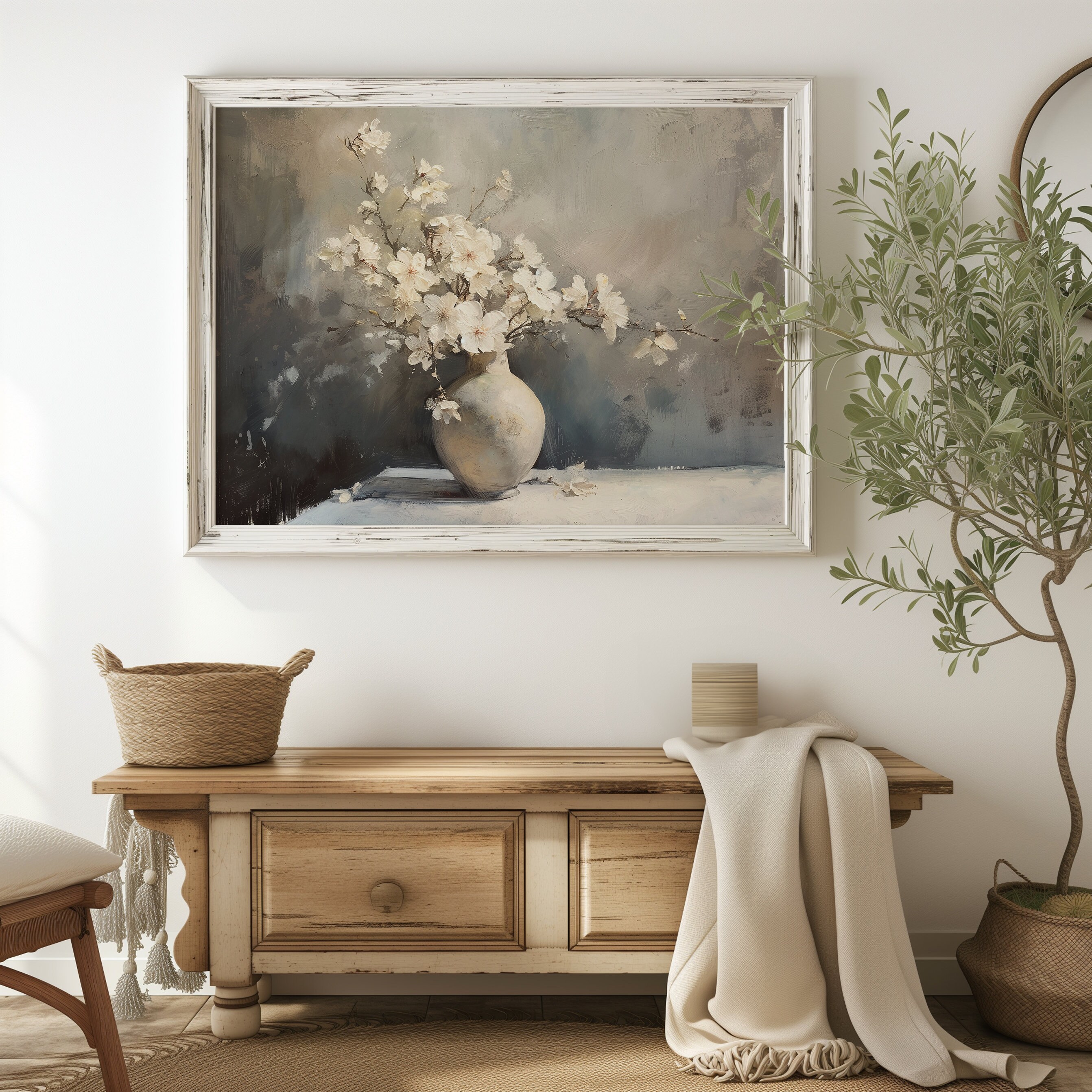 Beautify your home with this Vintage White Blossoms Wall Art Printable. Perfect for farmhouse or modern decor, this digital download captures the soft elegance of an oil painting in tranquil muted tones. Instantly download and print for a swift decor upgrade in your living room or any space craving a touch of nature's calm.