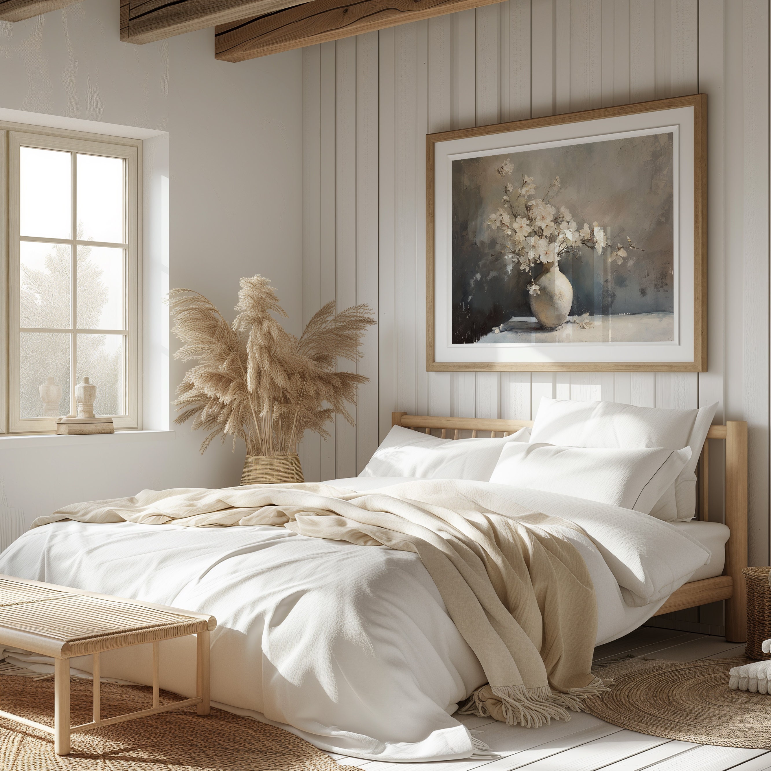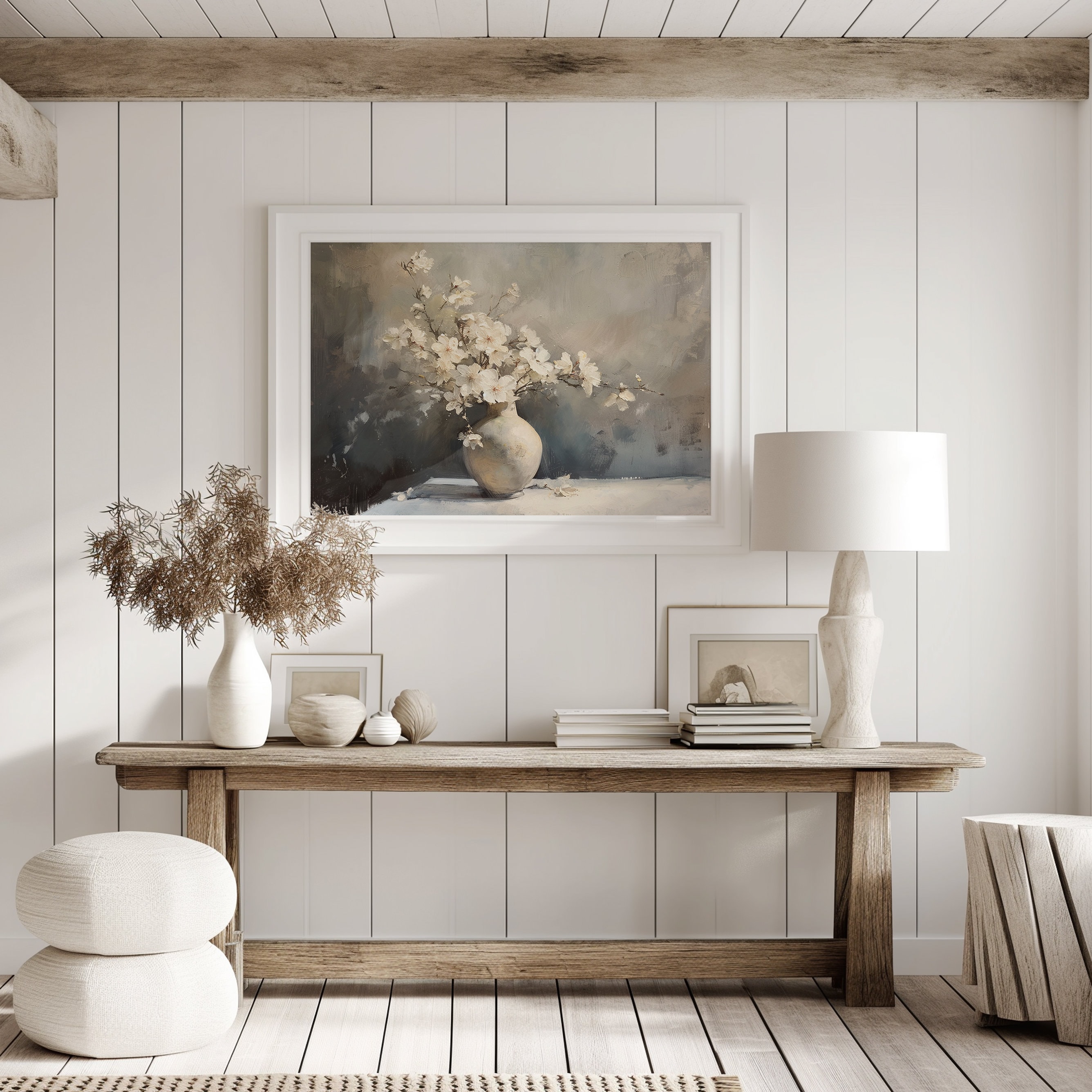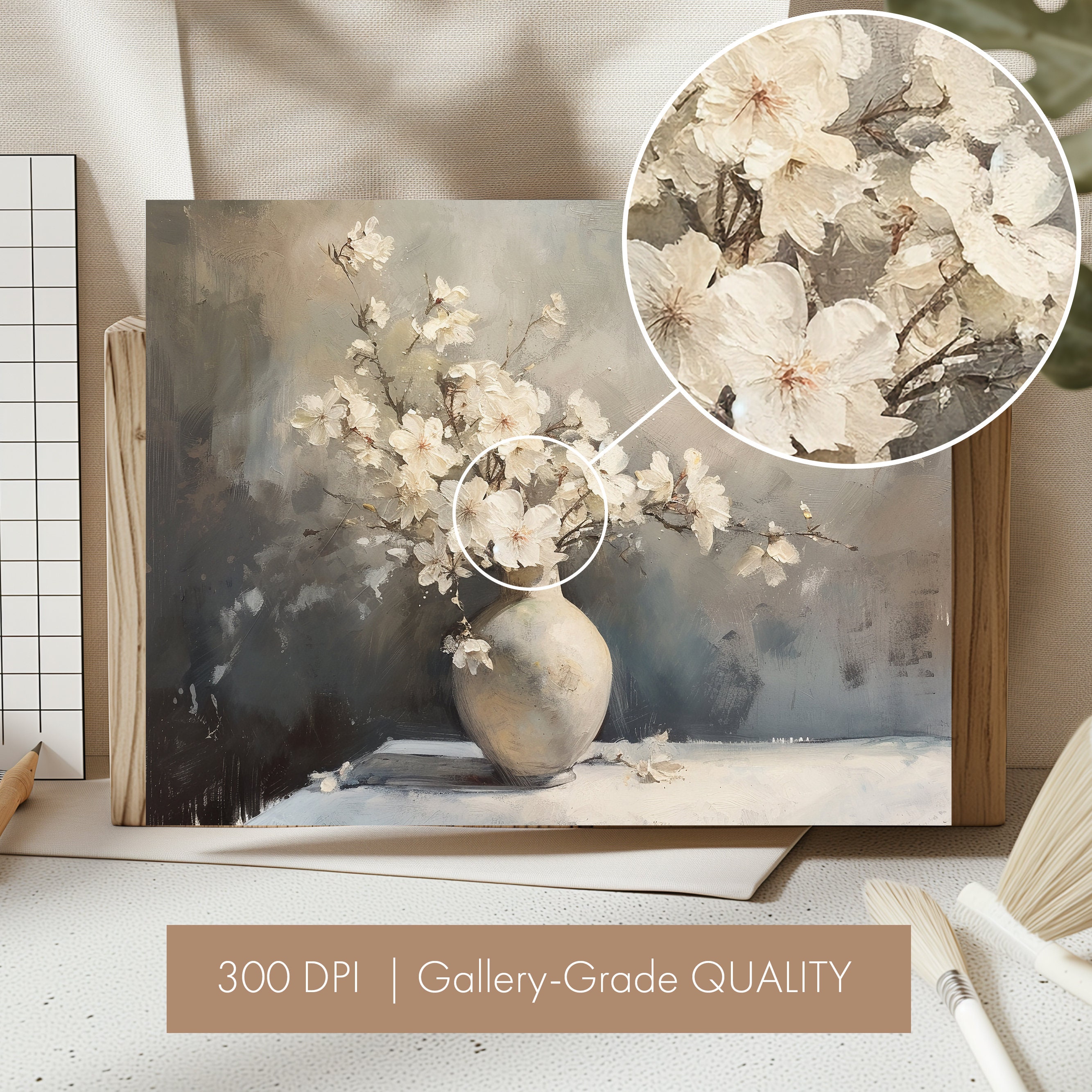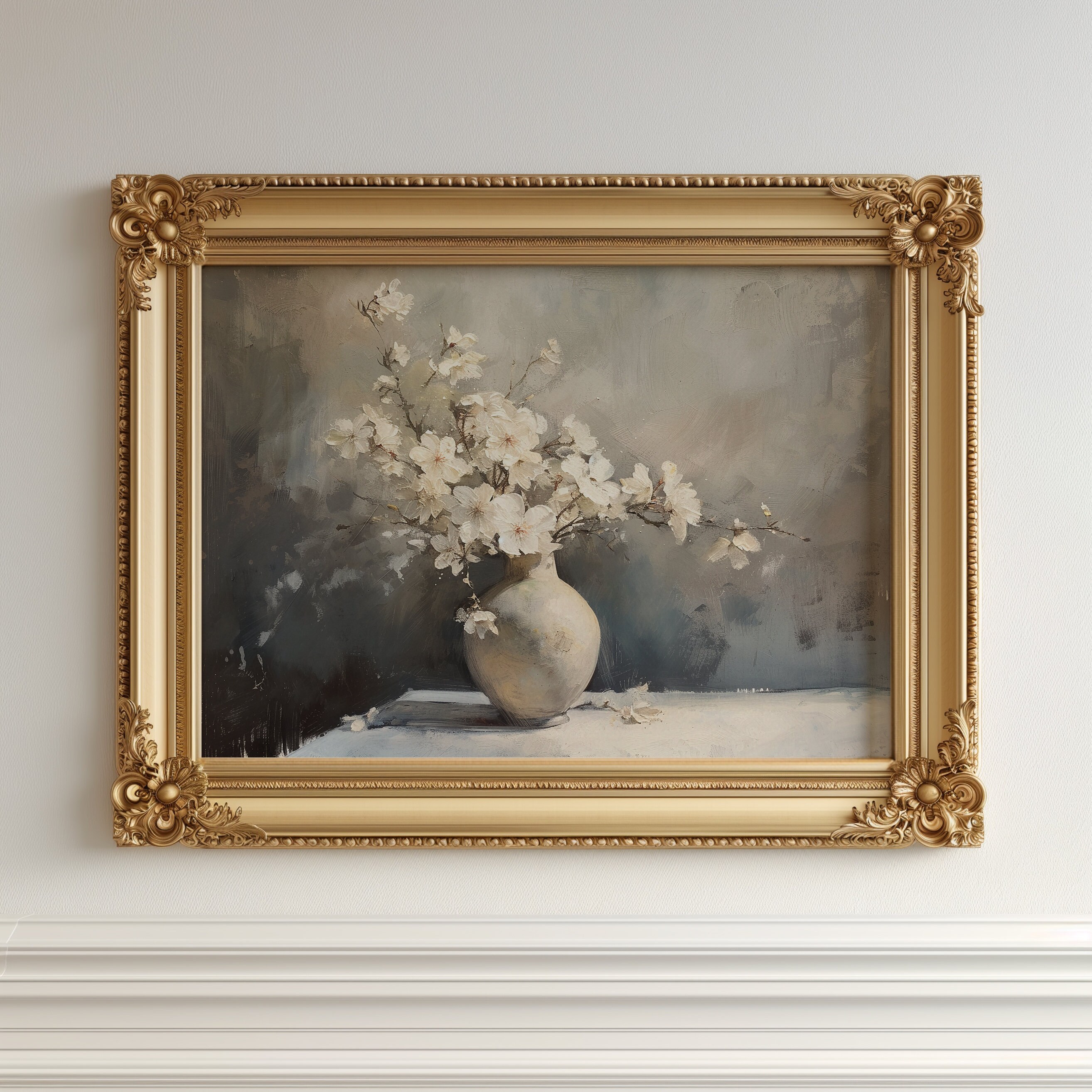 Beautify your home with this Vintage White Blossoms Wall Art Printable. Perfect for farmhouse or modern decor, this digital download captures the soft elegance of an oil painting in tranquil muted tones. Instantly download and print for a swift decor upgrade in your living room or any space craving a touch of nature's calm.