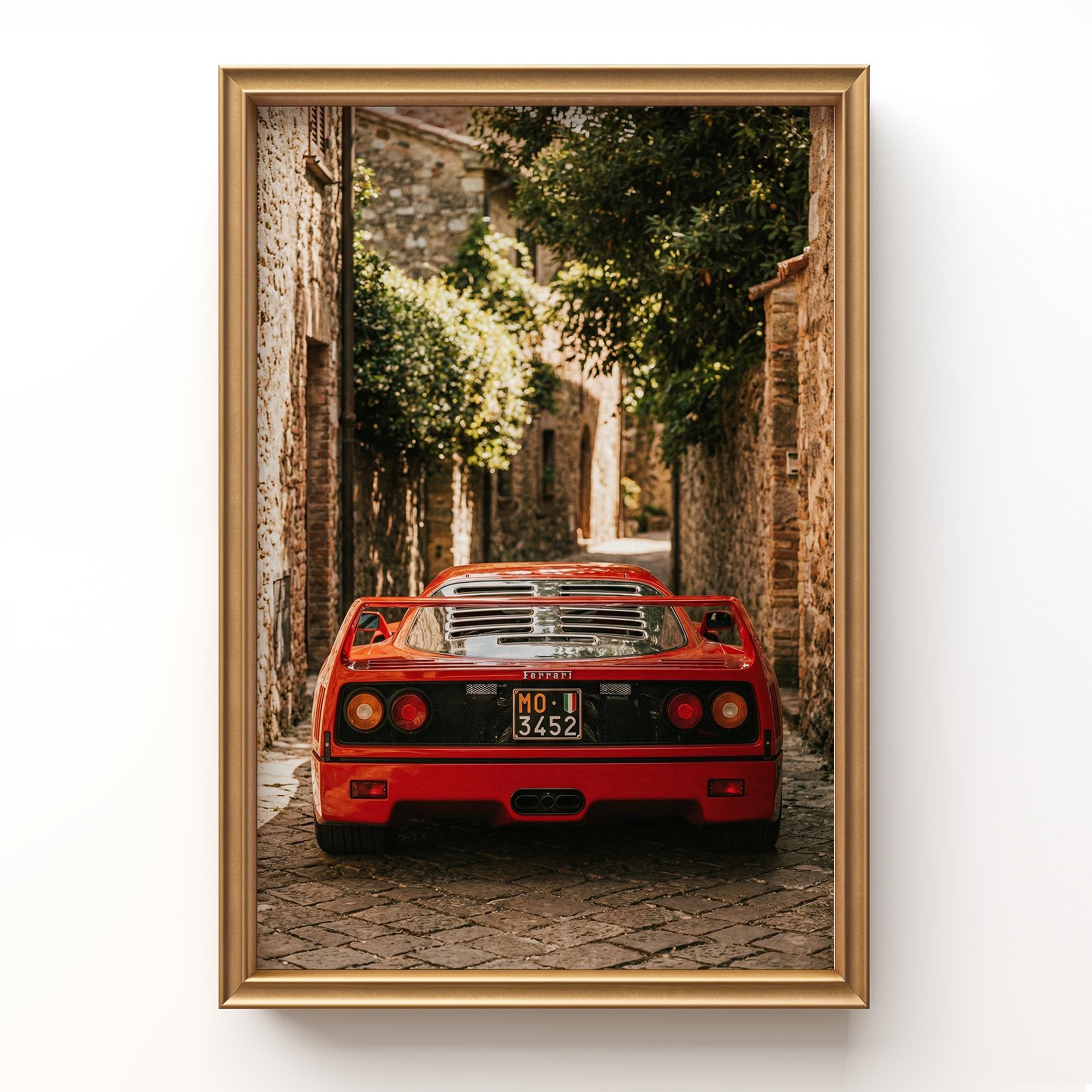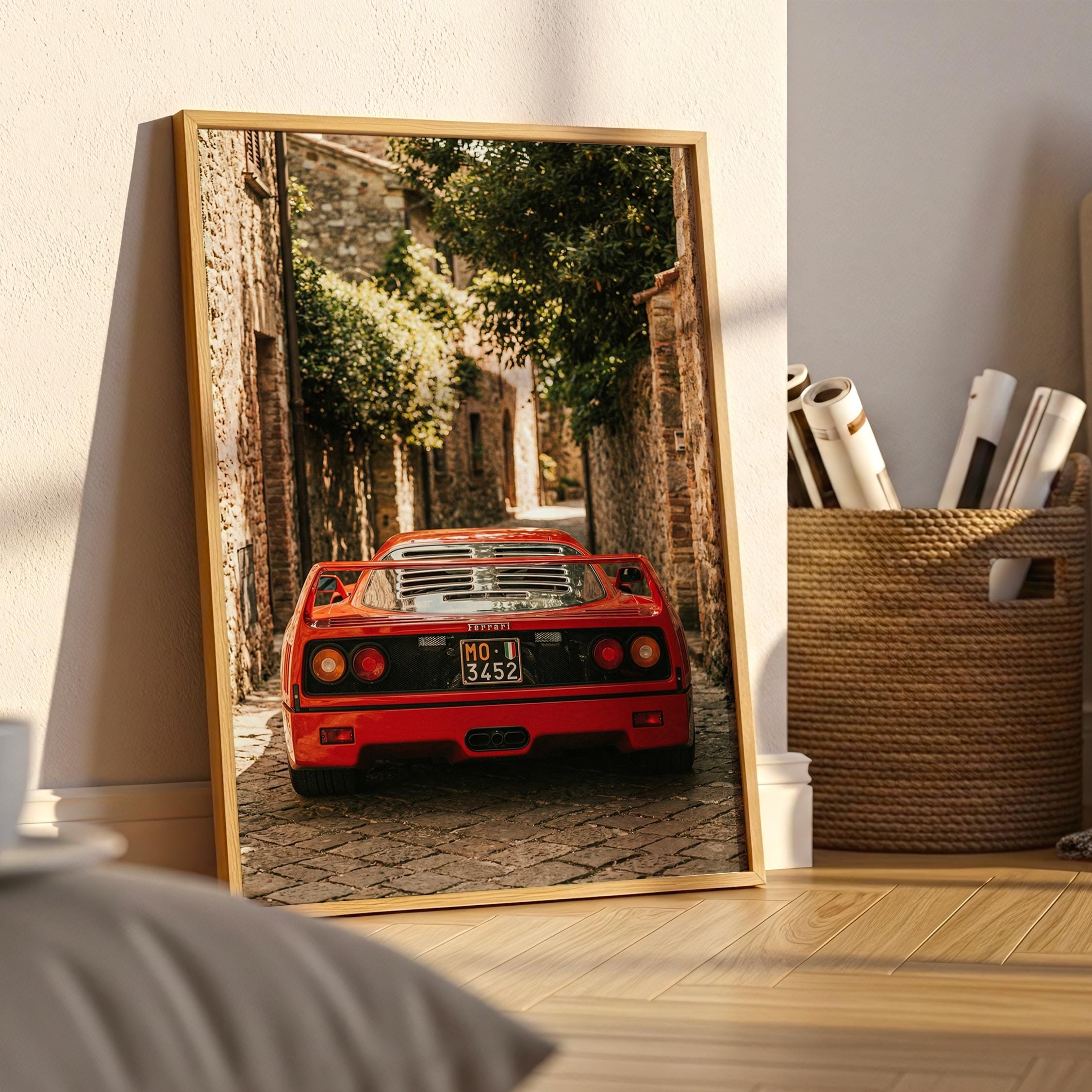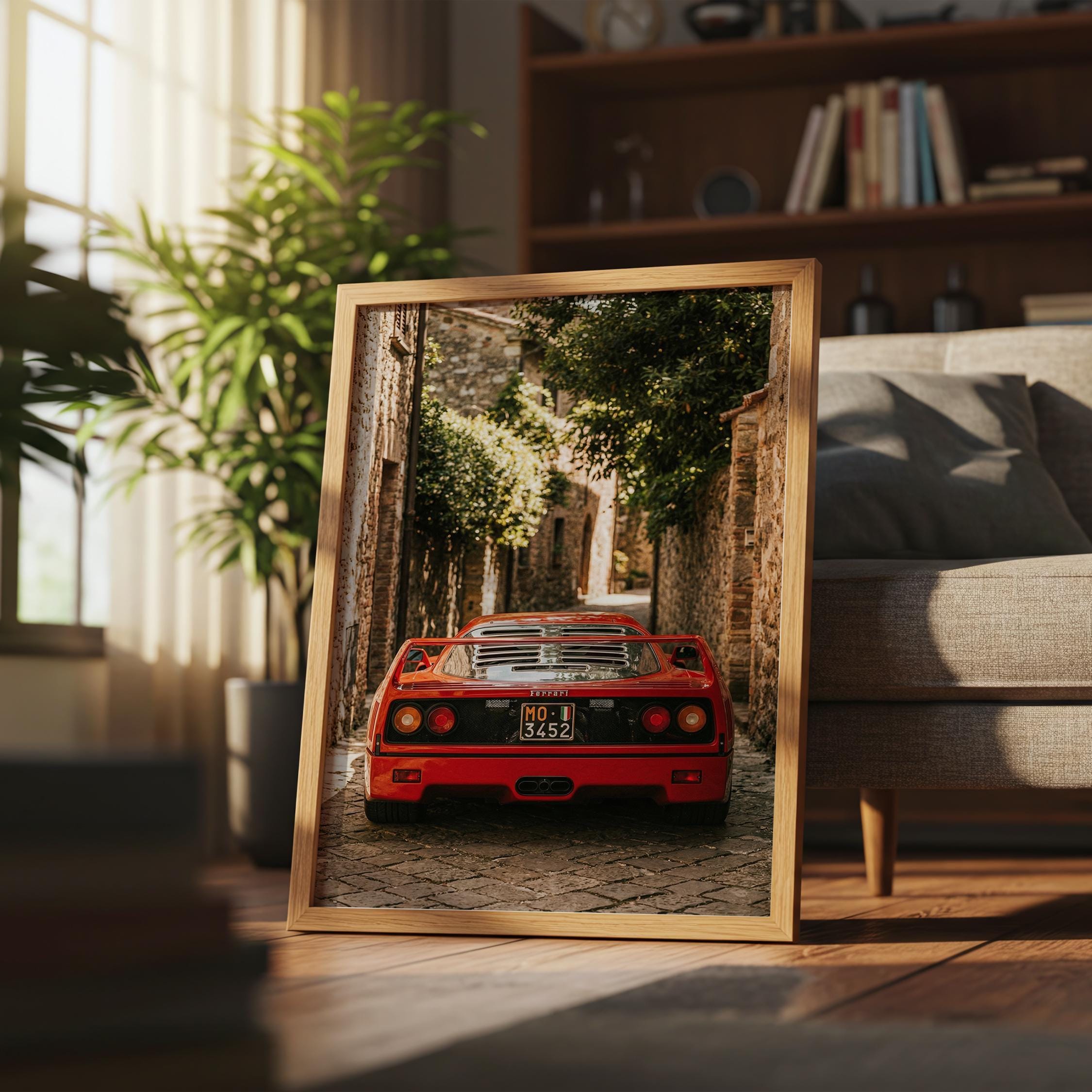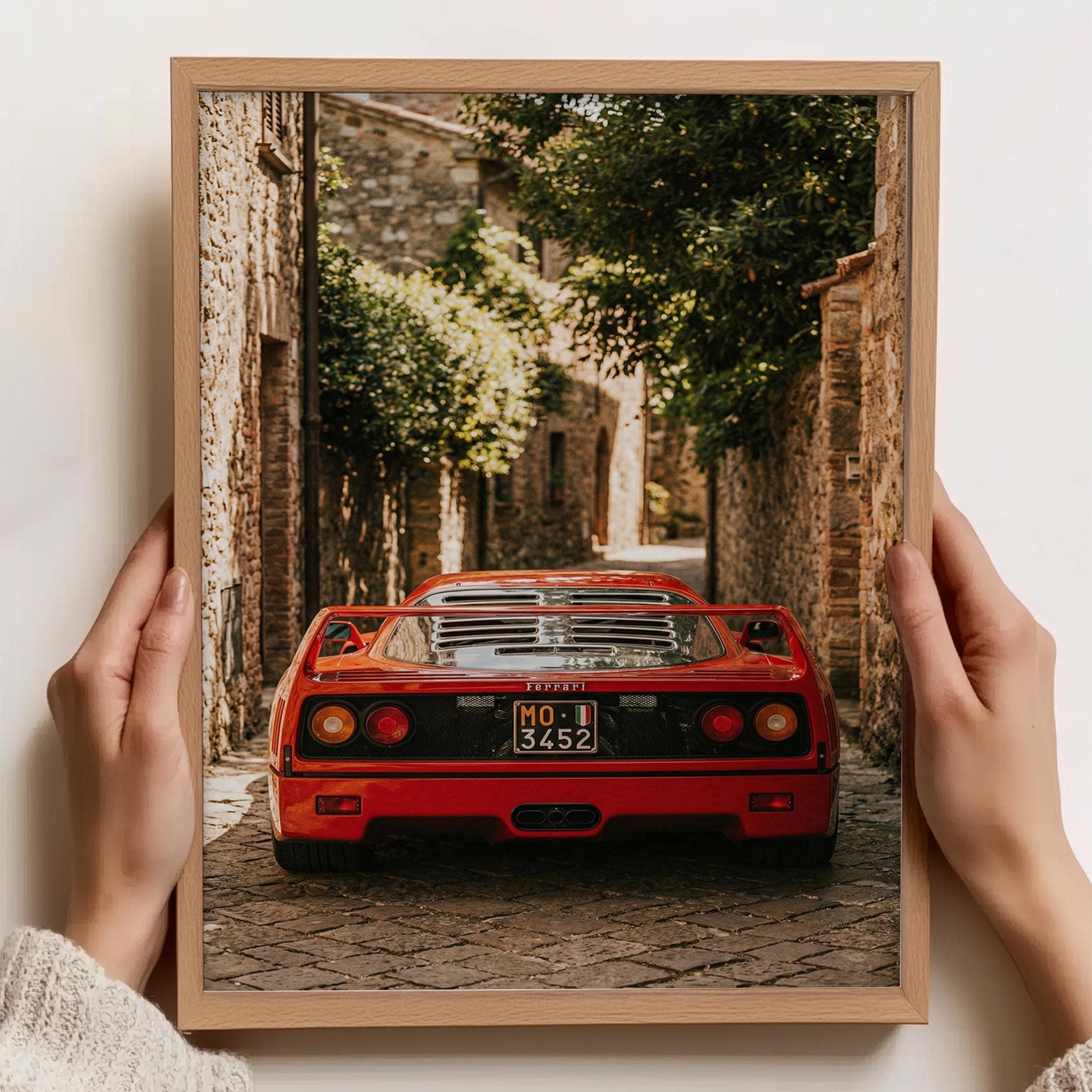 Bring motorsport passion to your space with this high-resolution supercar wall art, showcasing the unmistakable rear view of a classic Ferrari F40 in a rustic Italian alley. This car photography piece makes a striking vertical wall art addition to living rooms, offices, garages, and man caves, delivering garage wall decor with bold color and retro car poster vibes. The timeless look of this supercar poster makes it perfect for anyone who loves classic cars and the best supercars. If you’re searching for an auto enthusiast gift, a vintage Ferrari gift, or exclusive Ferrari F40 gift art, this print brings supercar printable art right into your home or workspace.