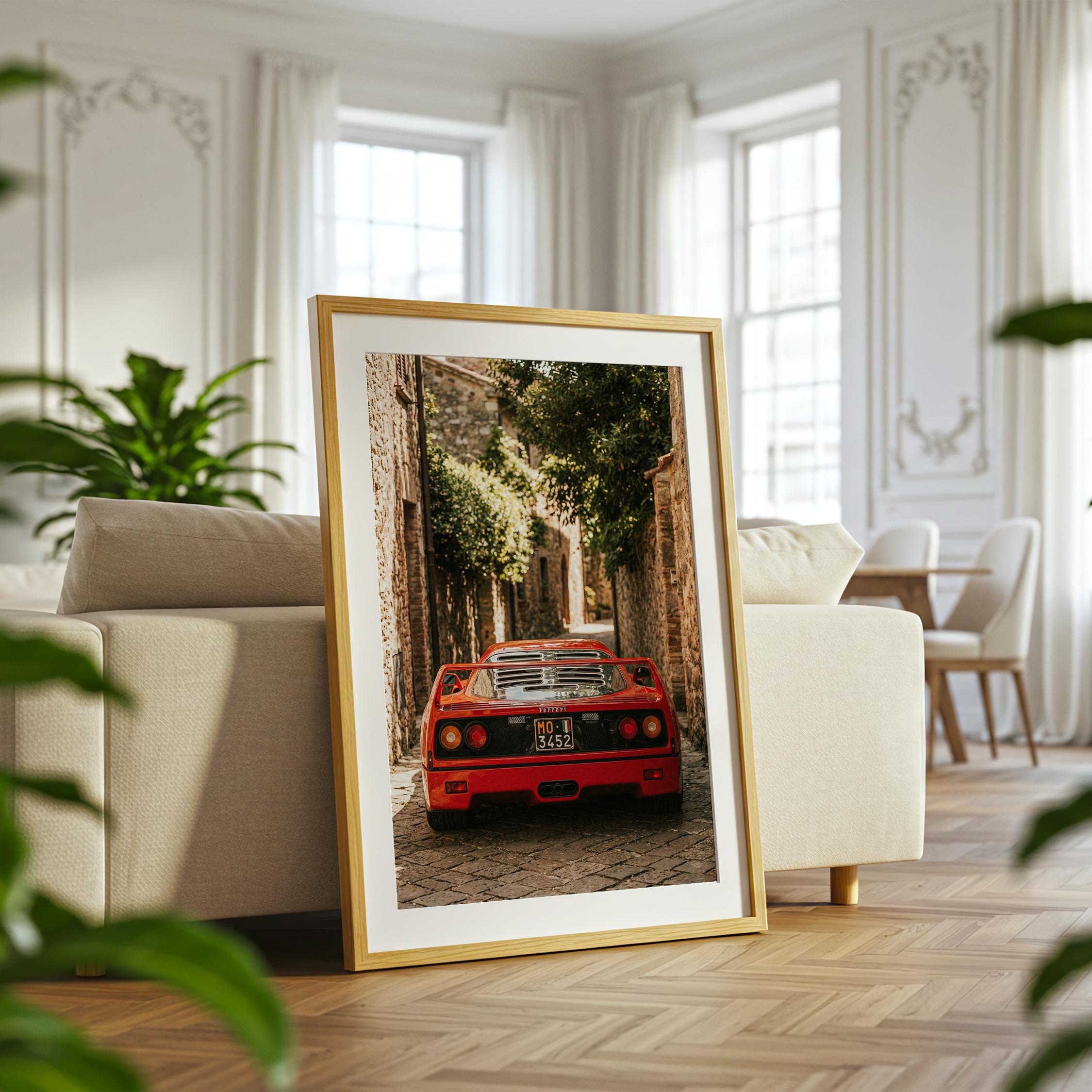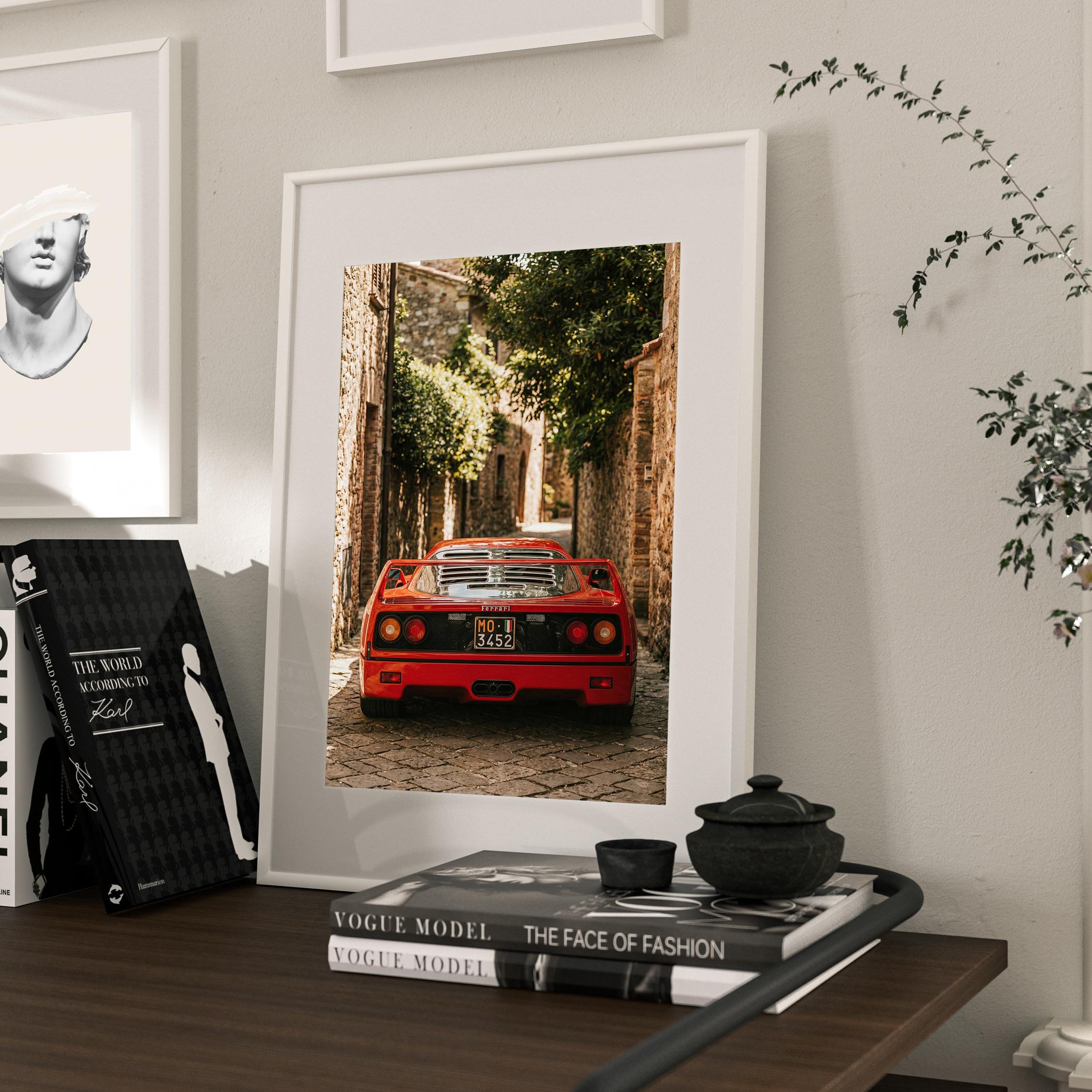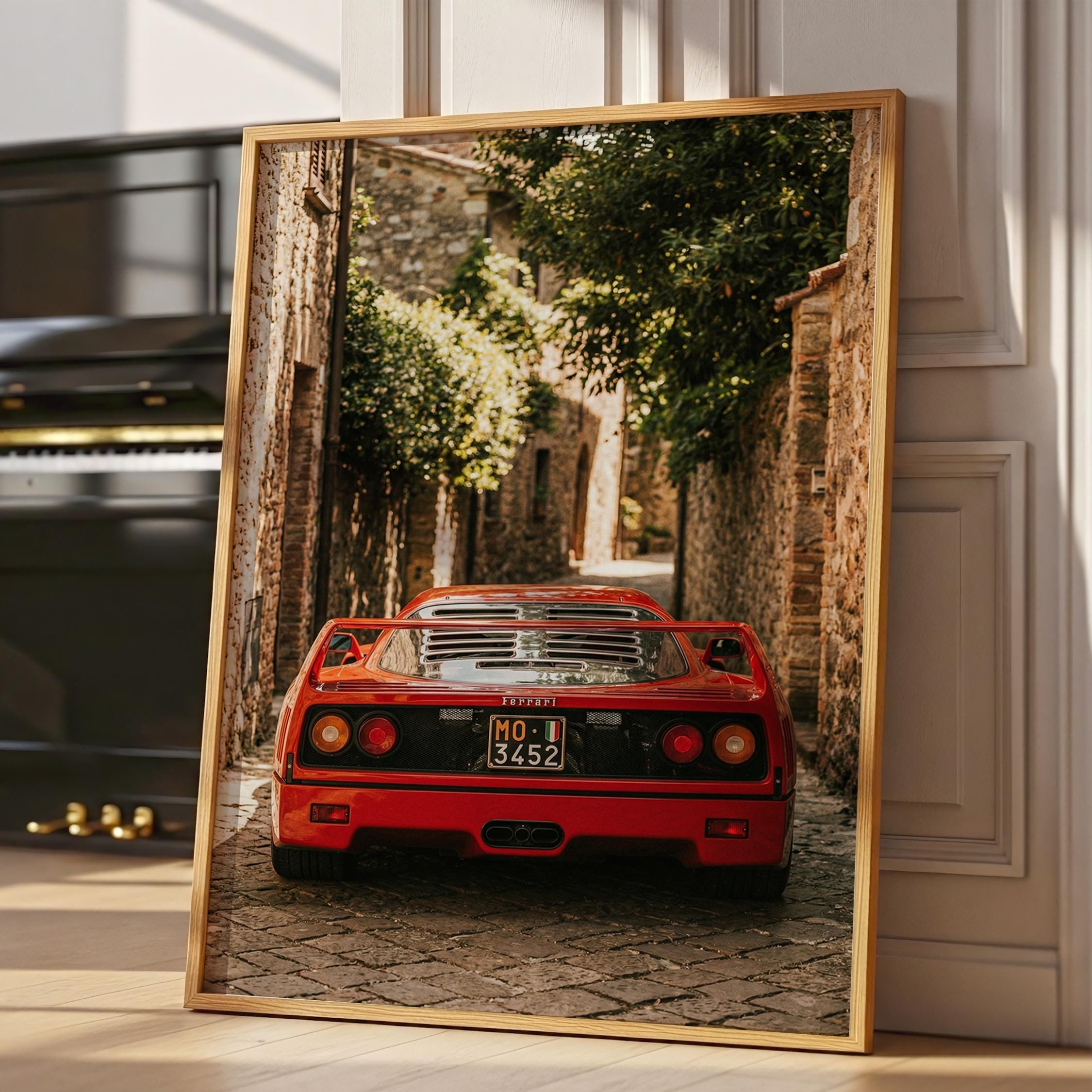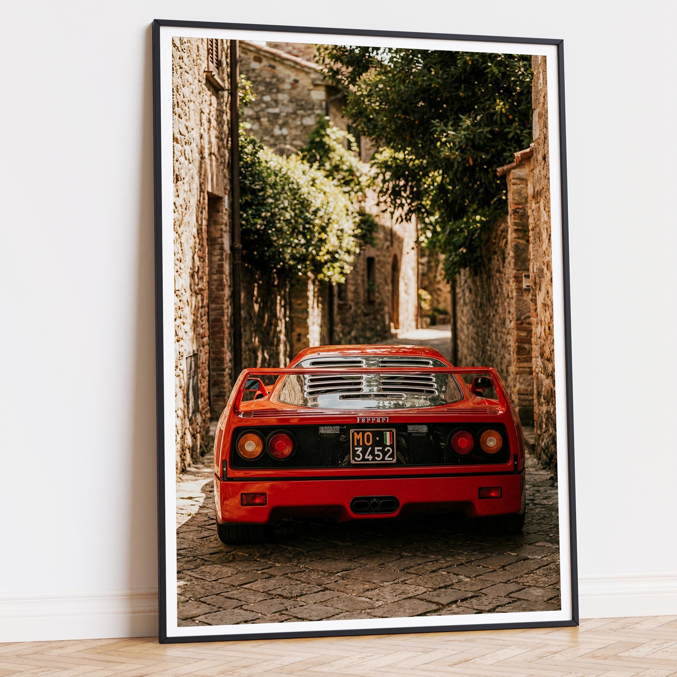 Bring motorsport passion to your space with this high-resolution supercar wall art, showcasing the unmistakable rear view of a classic Ferrari F40 in a rustic Italian alley. This car photography piece makes a striking vertical wall art addition to living rooms, offices, garages, and man caves, delivering garage wall decor with bold color and retro car poster vibes. The timeless look of this supercar poster makes it perfect for anyone who loves classic cars and the best supercars. If you’re searching for an auto enthusiast gift, a vintage Ferrari gift, or exclusive Ferrari F40 gift art, this print brings supercar printable art right into your home or workspace.