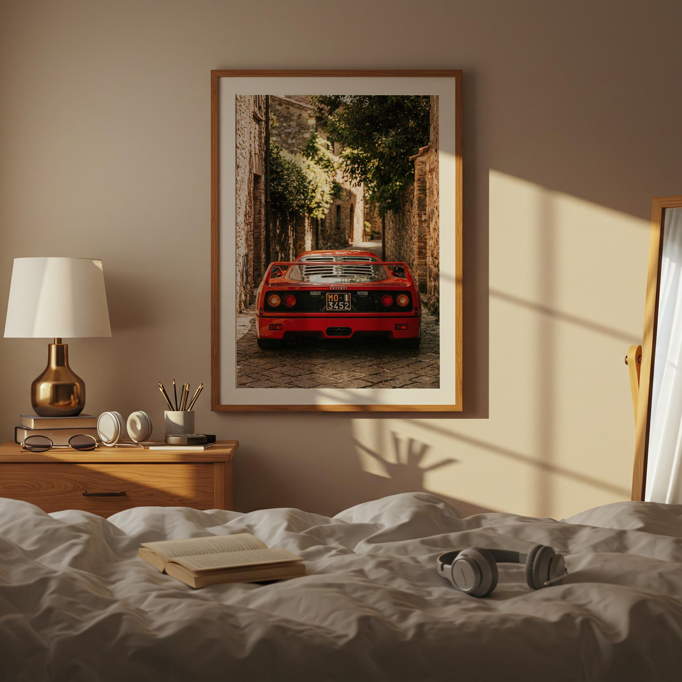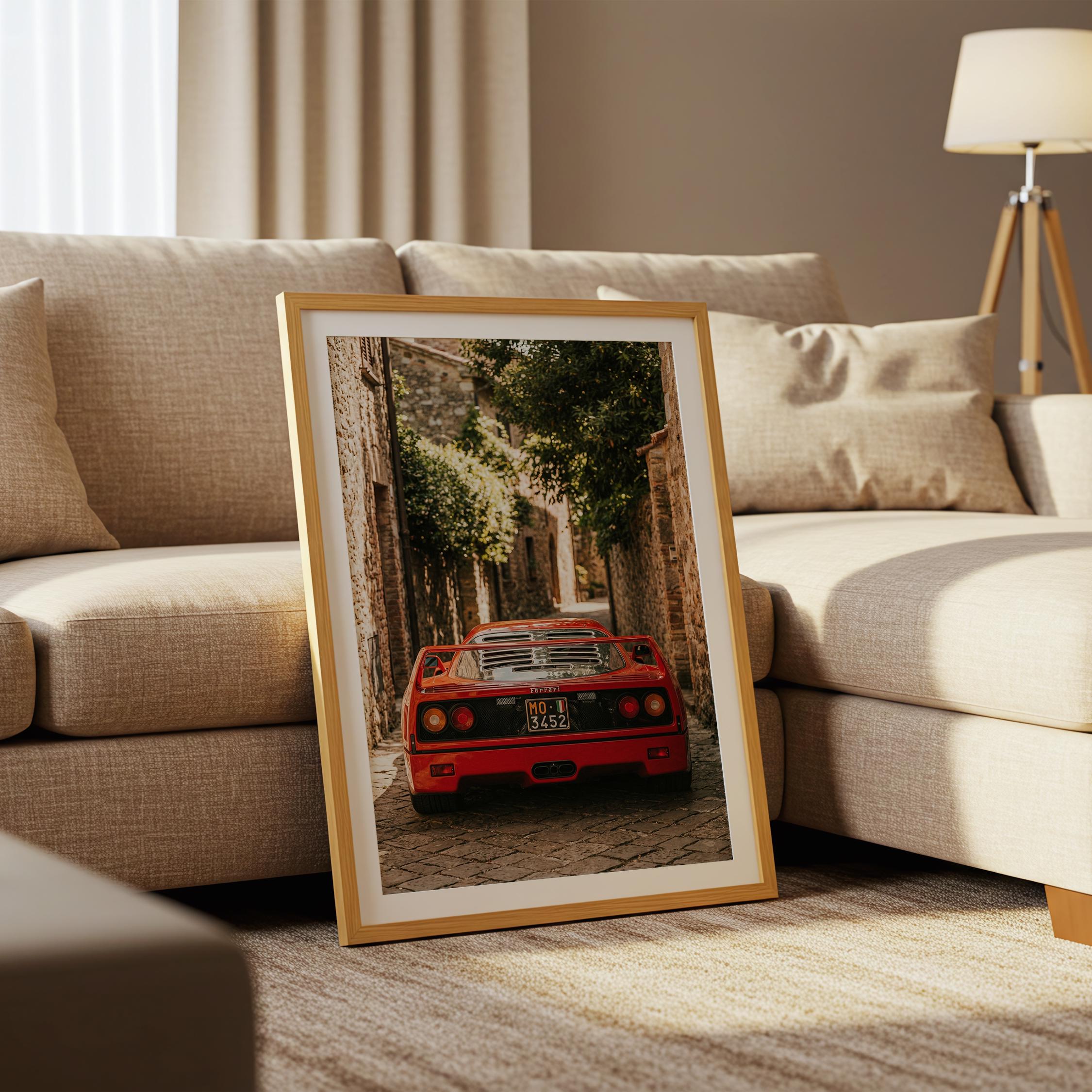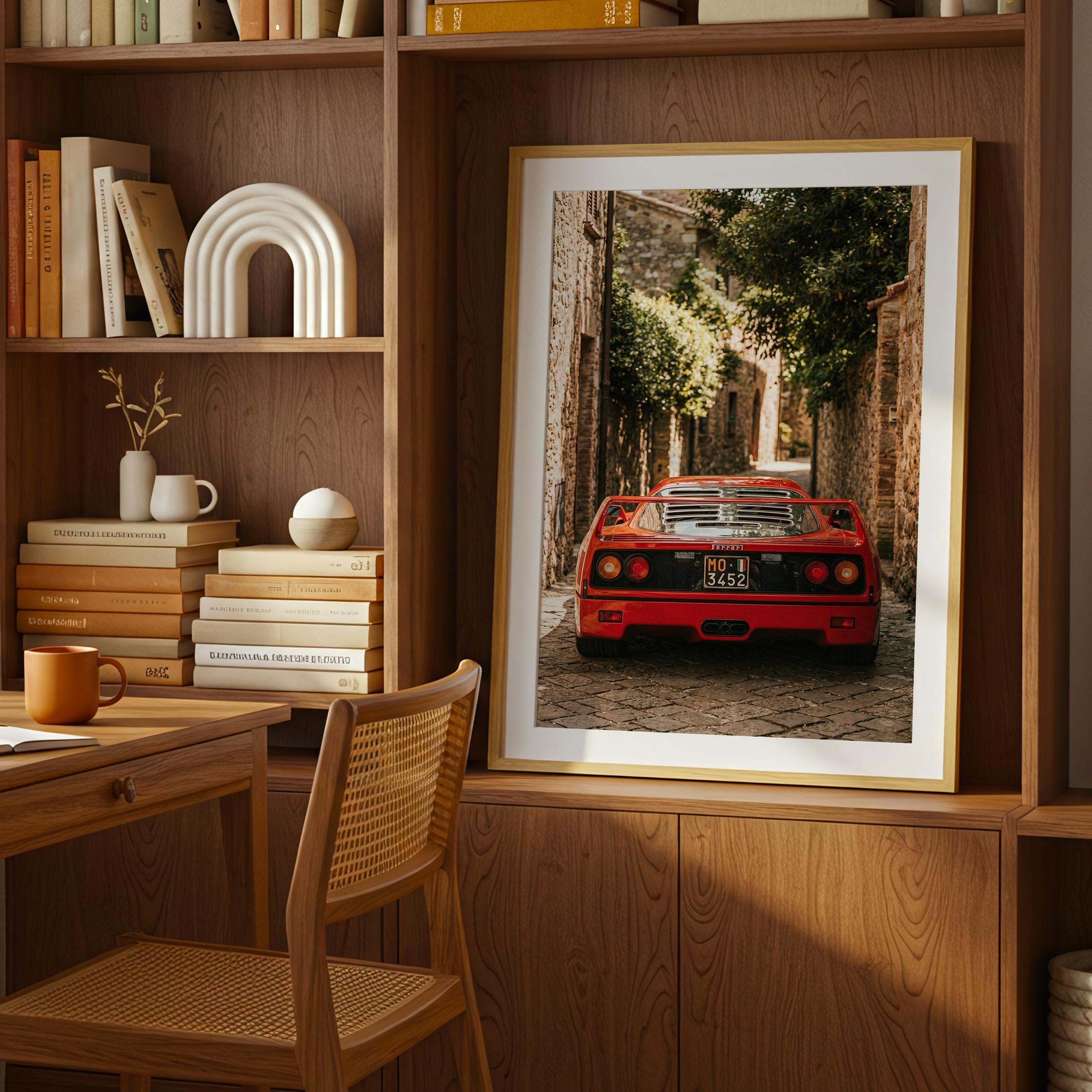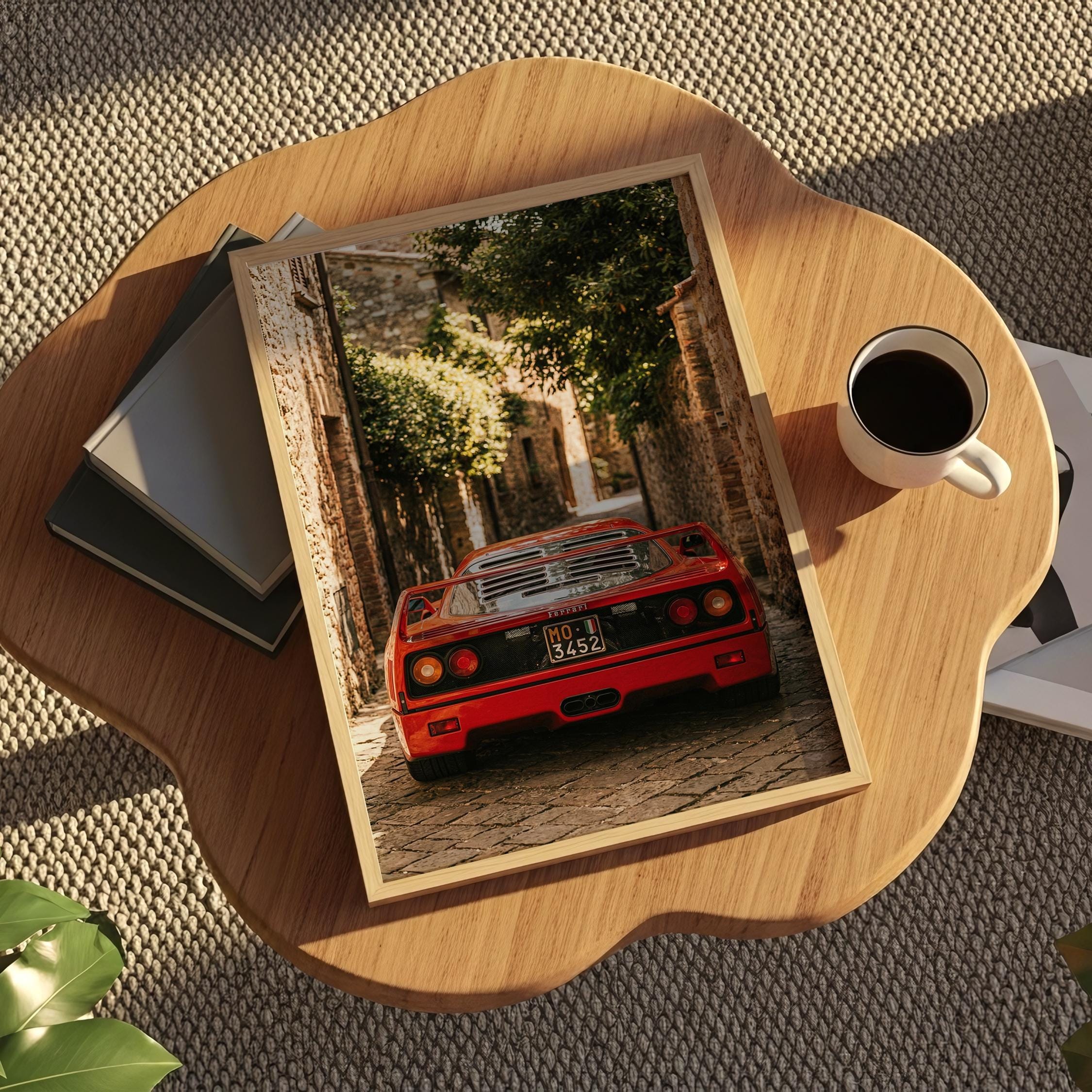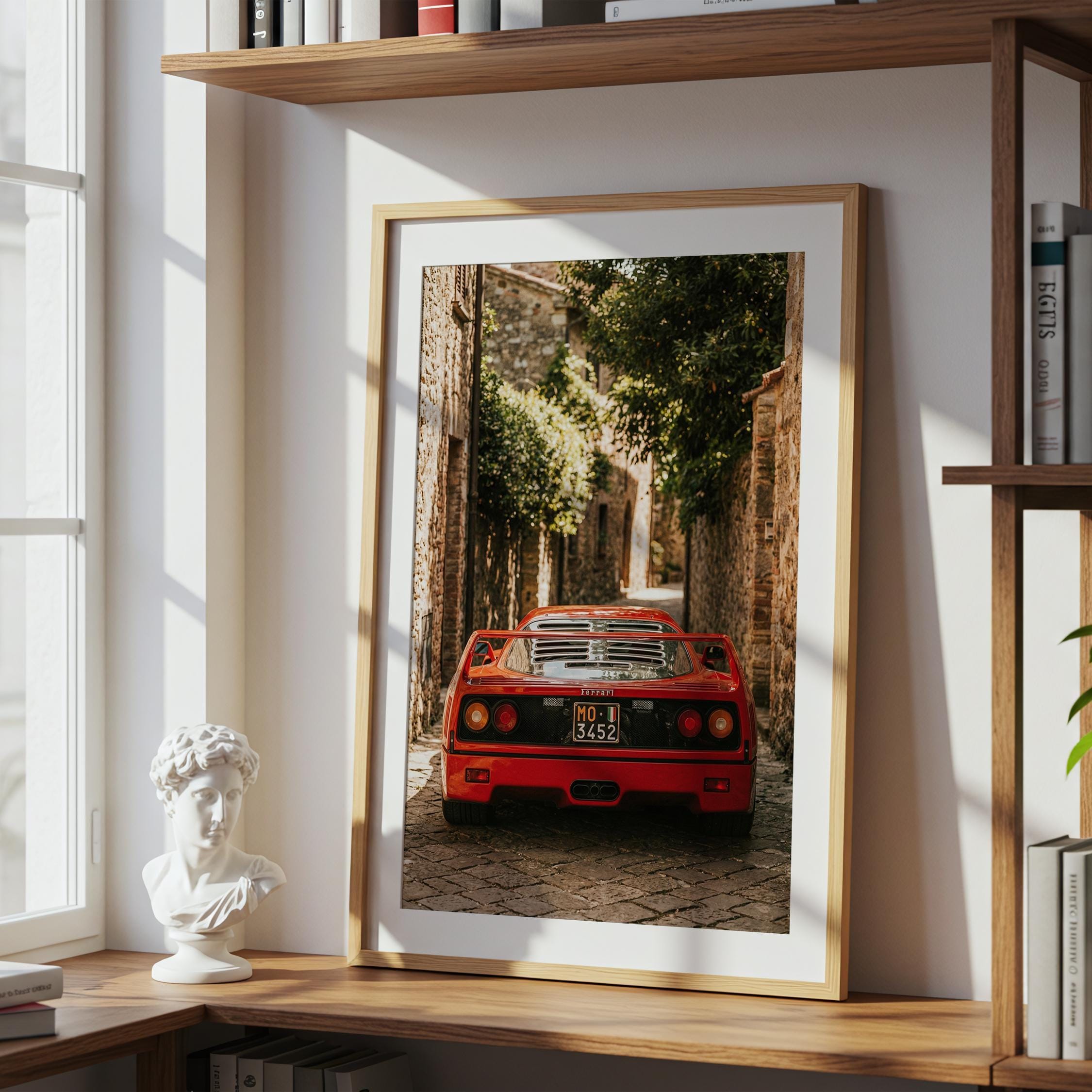 Bring motorsport passion to your space with this high-resolution supercar wall art, showcasing the unmistakable rear view of a classic Ferrari F40 in a rustic Italian alley. This car photography piece makes a striking vertical wall art addition to living rooms, offices, garages, and man caves, delivering garage wall decor with bold color and retro car poster vibes. The timeless look of this supercar poster makes it perfect for anyone who loves classic cars and the best supercars. If you’re searching for an auto enthusiast gift, a vintage Ferrari gift, or exclusive Ferrari F40 gift art, this print brings supercar printable art right into your home or workspace.
