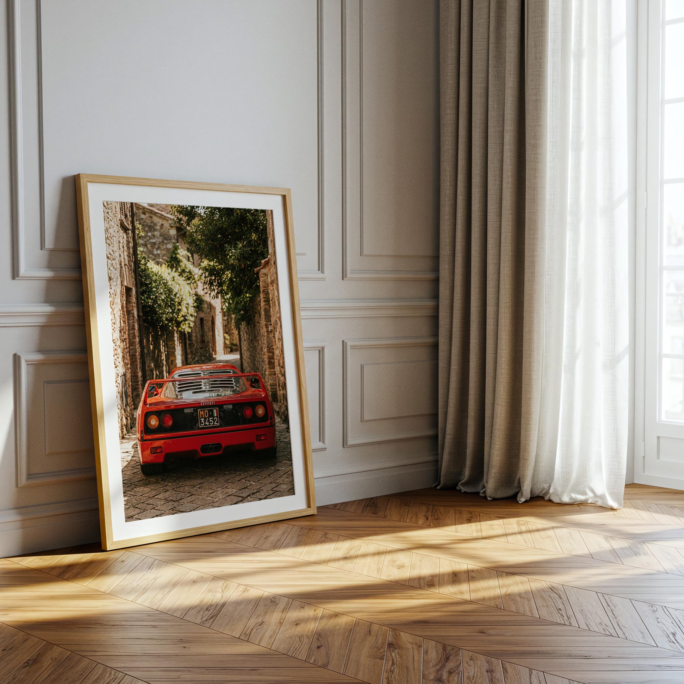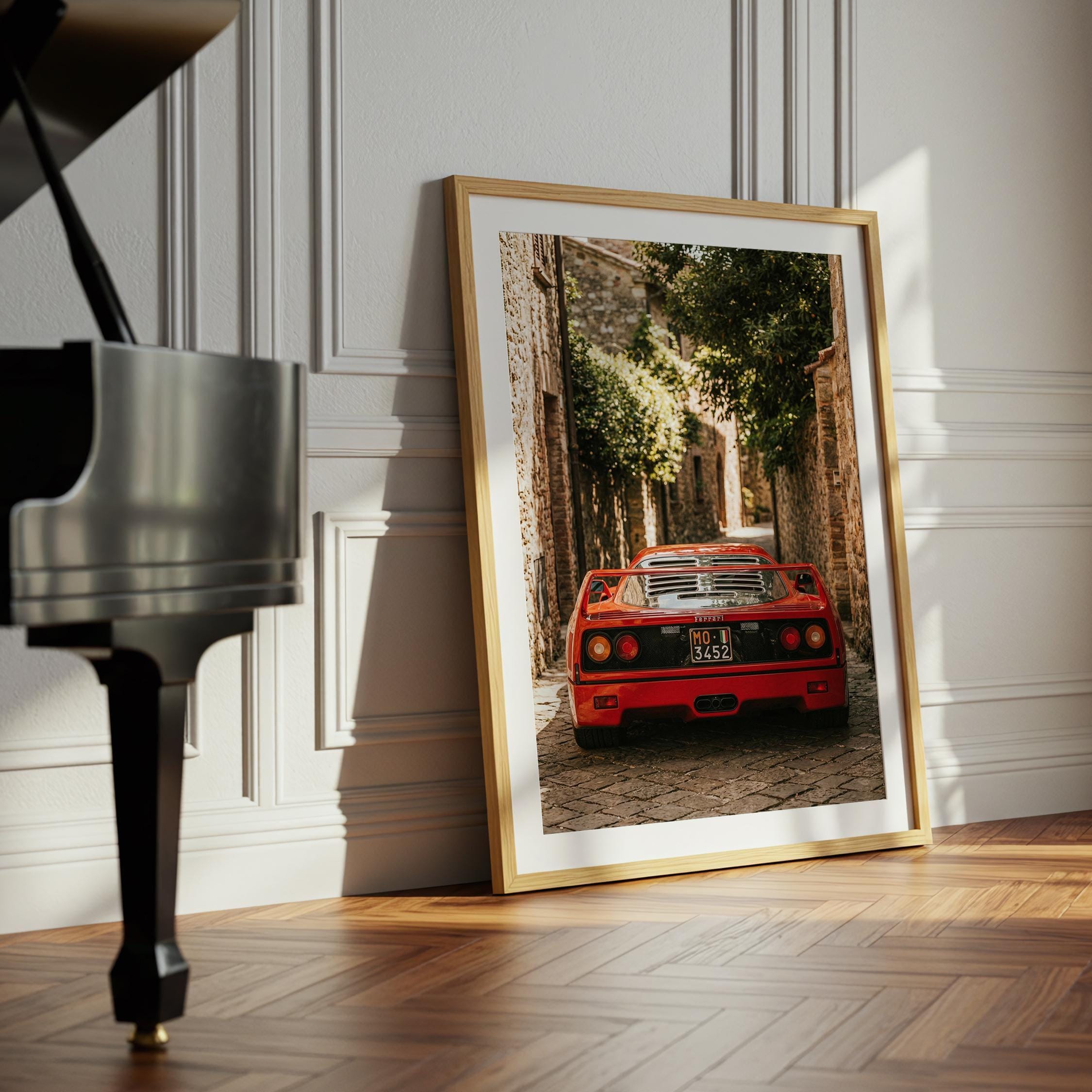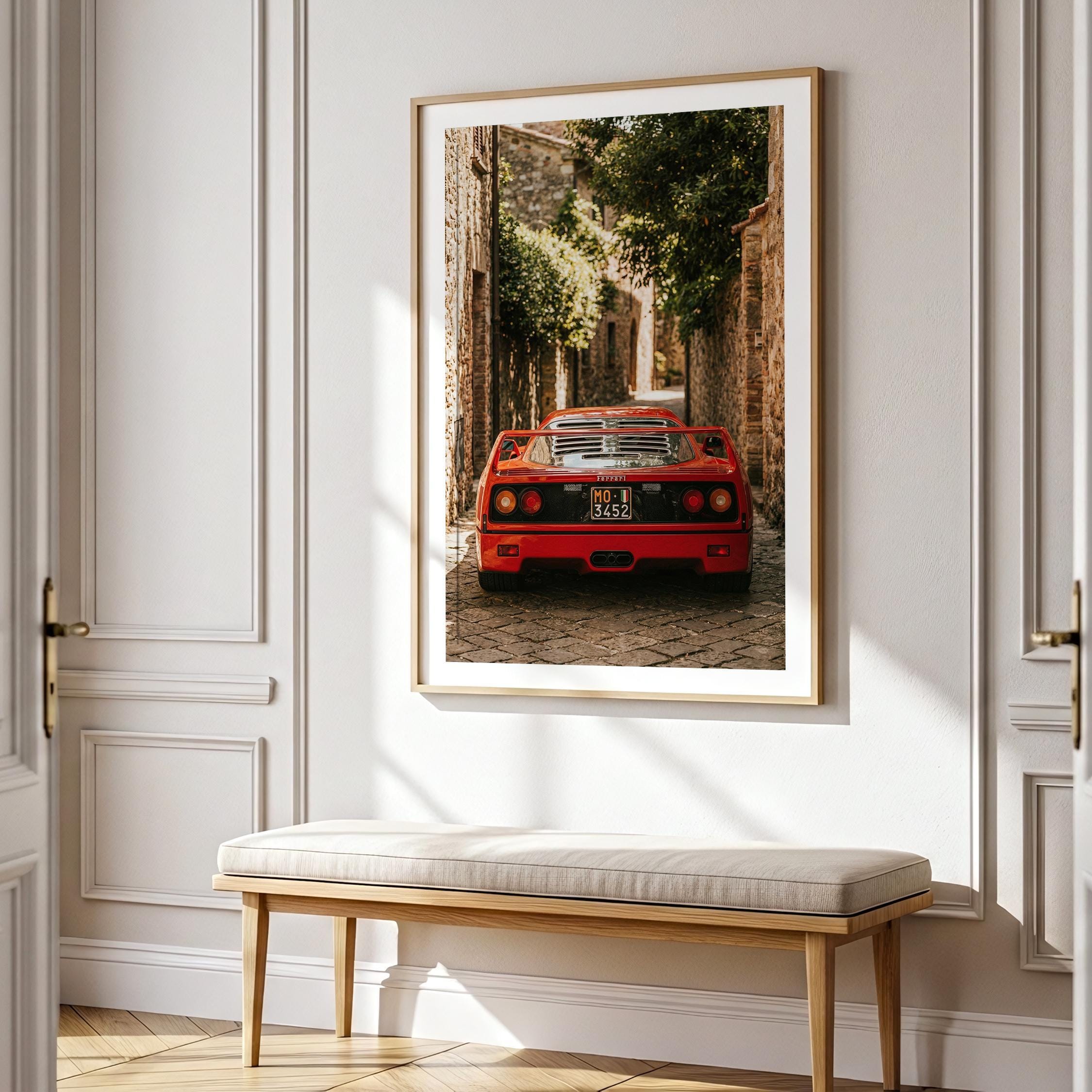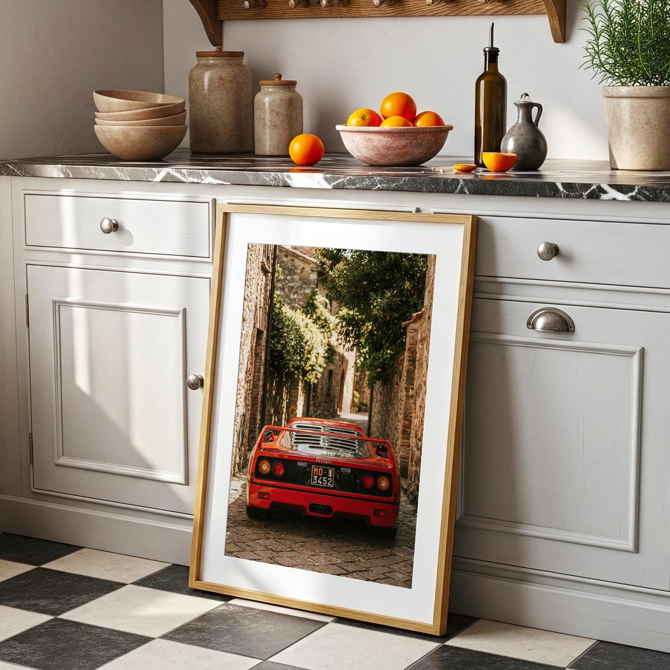 Bring motorsport passion to your space with this high-resolution supercar wall art, showcasing the unmistakable rear view of a classic Ferrari F40 in a rustic Italian alley. This car photography piece makes a striking vertical wall art addition to living rooms, offices, garages, and man caves, delivering garage wall decor with bold color and retro car poster vibes. The timeless look of this supercar poster makes it perfect for anyone who loves classic cars and the best supercars. If you’re searching for an auto enthusiast gift, a vintage Ferrari gift, or exclusive Ferrari F40 gift art, this print brings supercar printable art right into your home or workspace.
