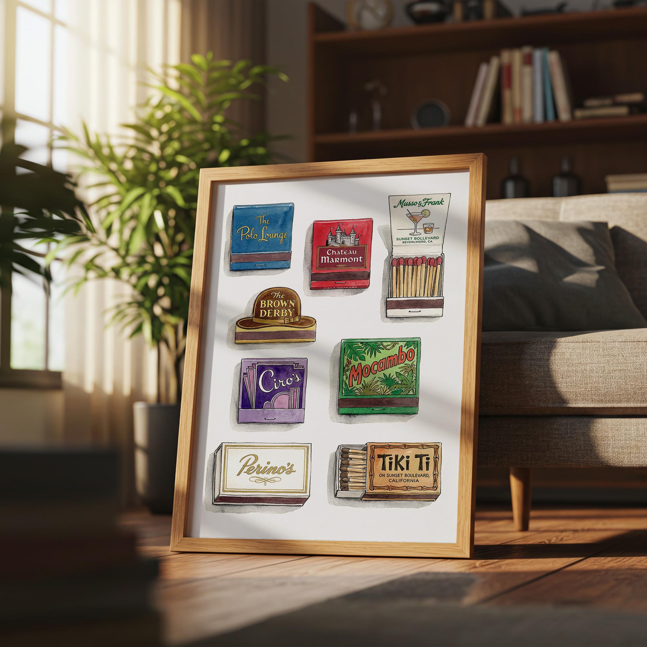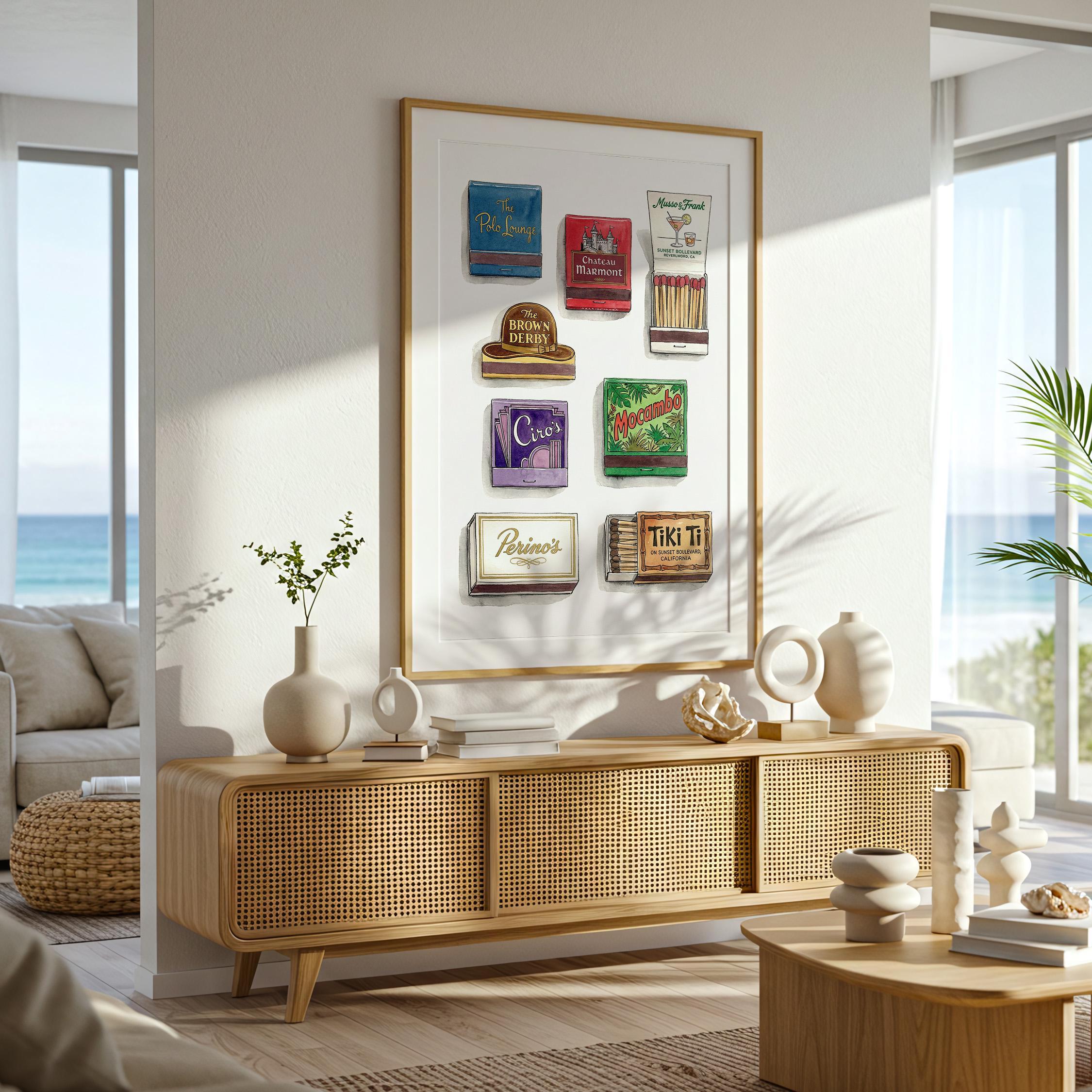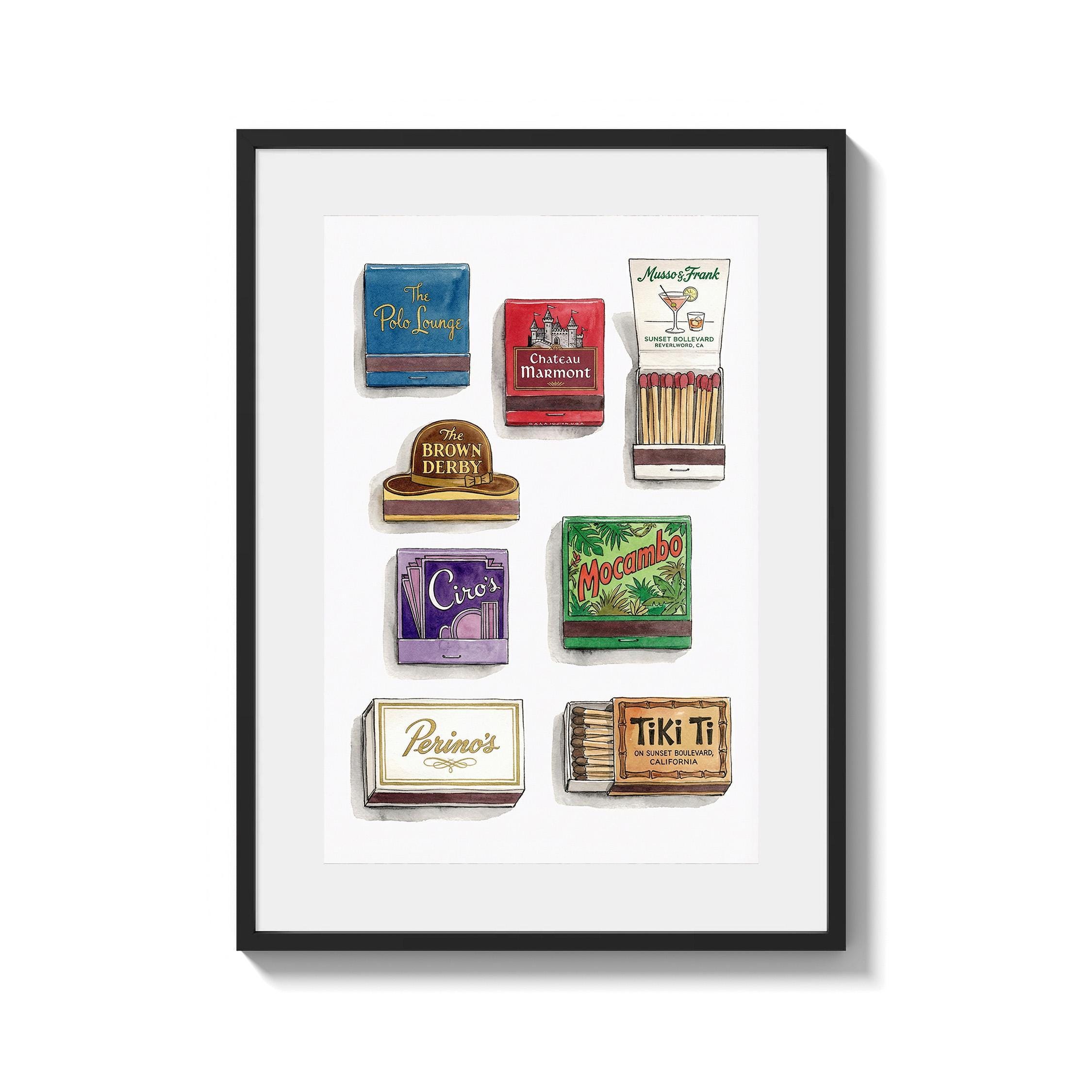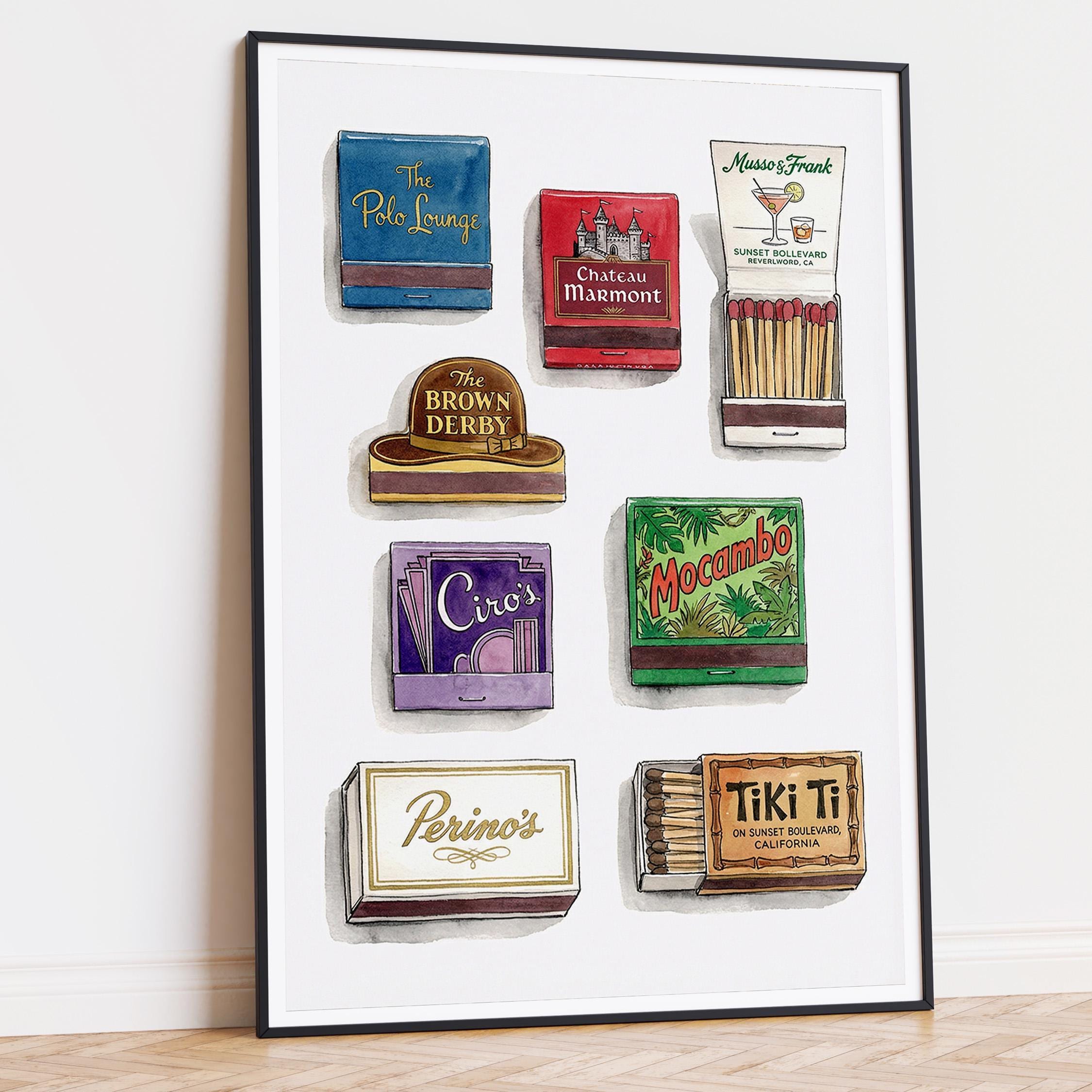 Bring mid century decor to your space with this printable wall art, inspired by a curated retro style matchbook collection. This matchbook poster showcases whimsical matchbooks and unique matchbox art, with designs drawn from classic bars and restaurants like the legendary Chateau Marmont. Perfect as tiki bar decor, kitchen art, or lounge accent, each large matches print brings vintage matchbook nostalgia and colorful character to every wall.