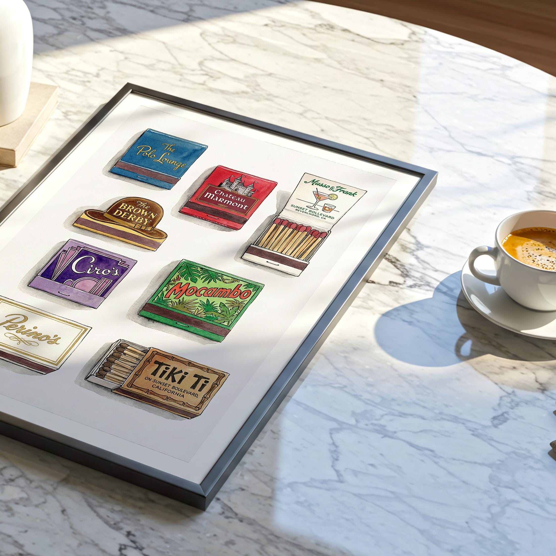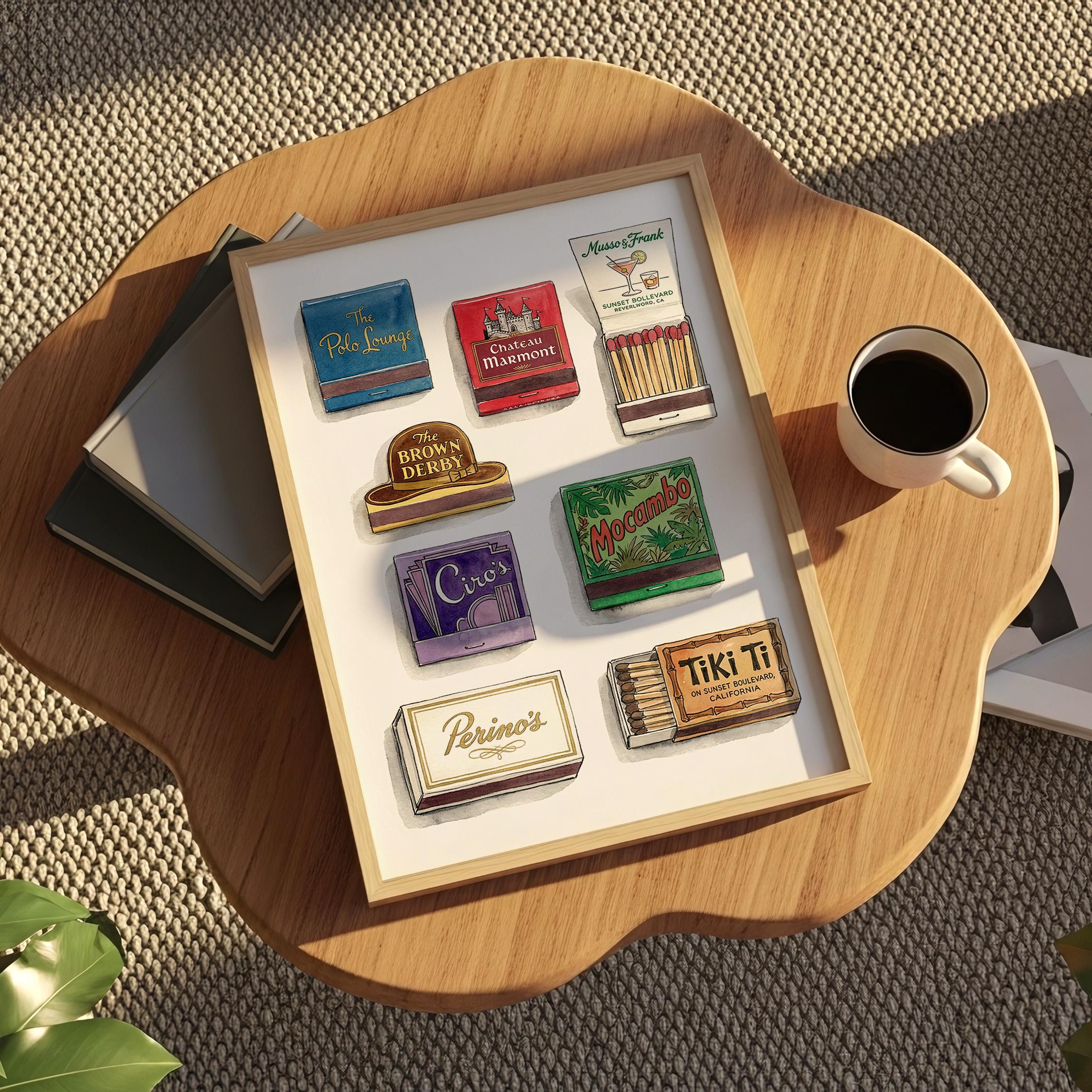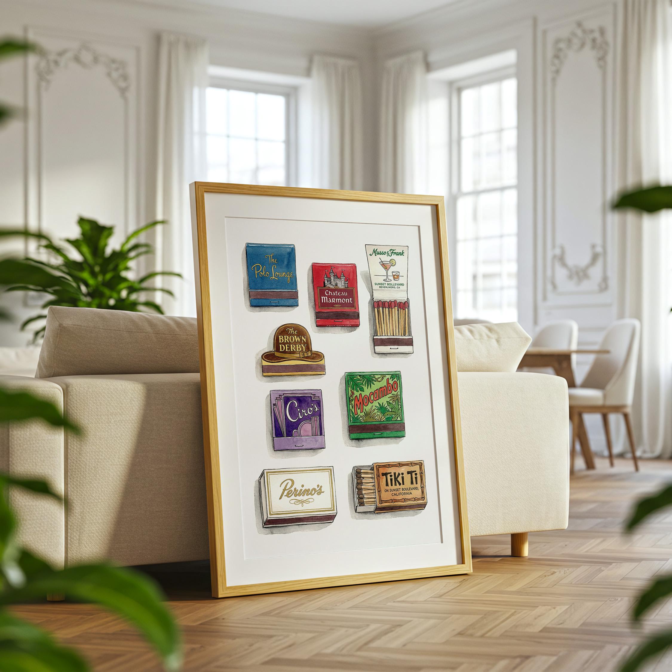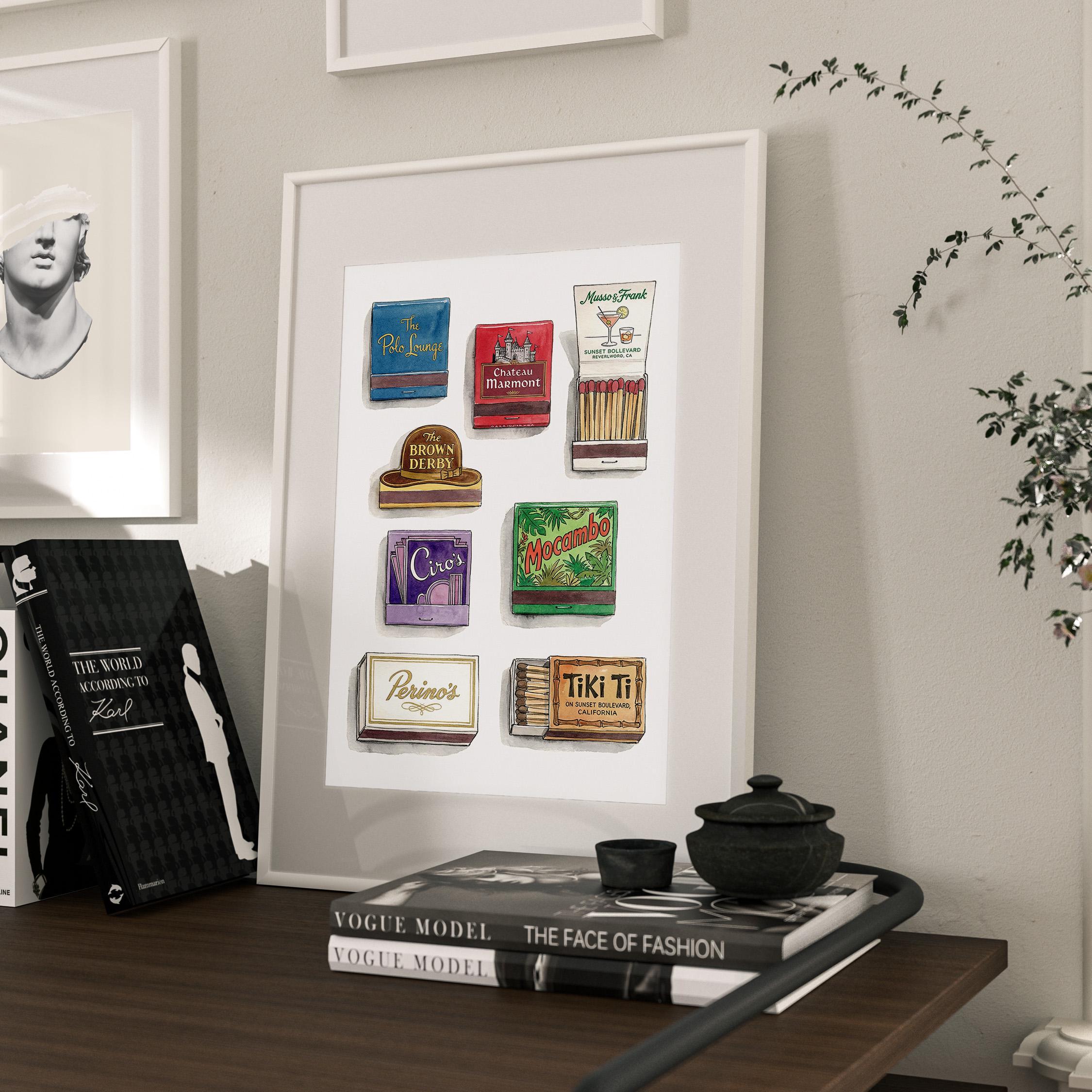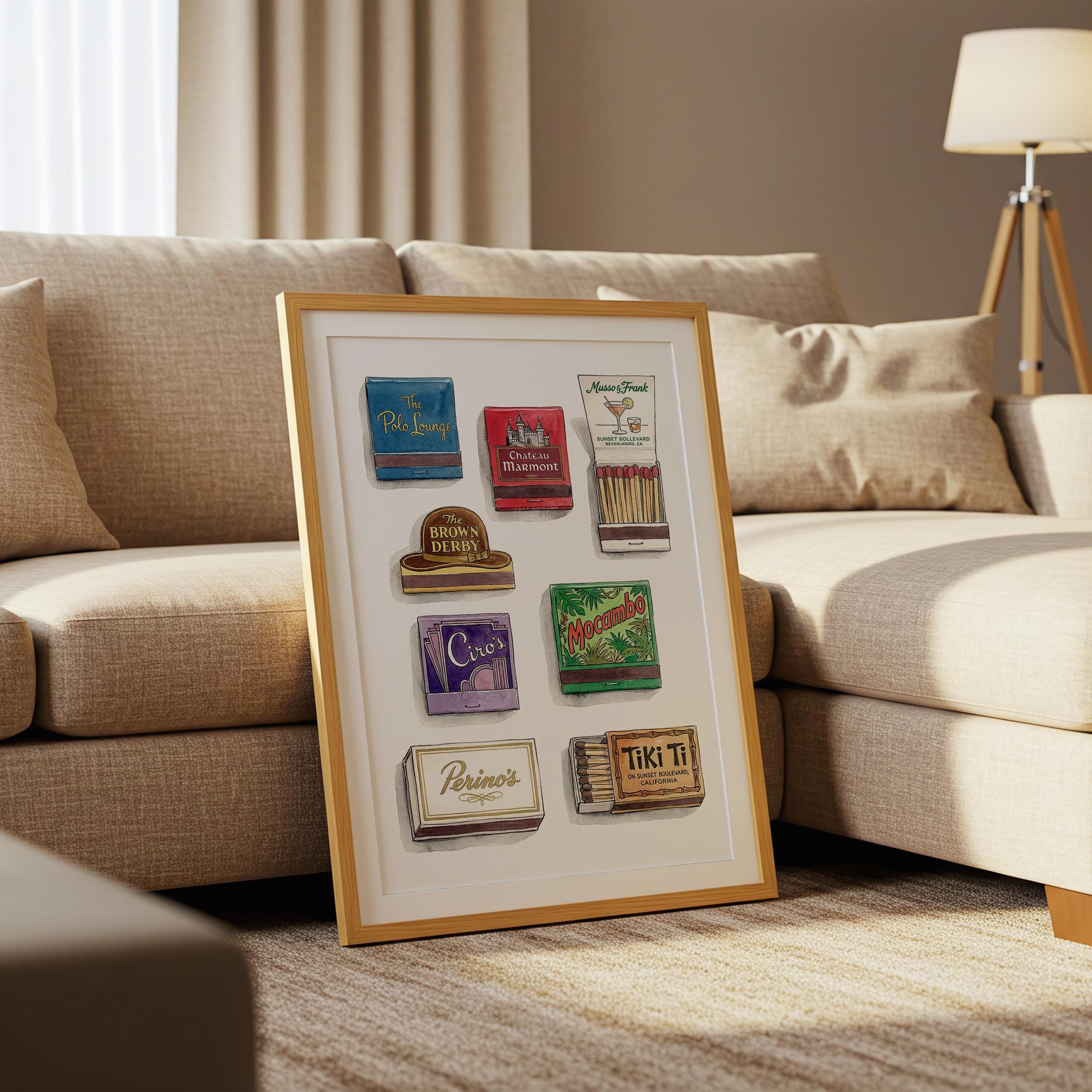 Bring mid century decor to your space with this printable wall art, inspired by a curated retro style matchbook collection. This matchbook poster showcases whimsical matchbooks and unique matchbox art, with designs drawn from classic bars and restaurants like the legendary Chateau Marmont. Perfect as tiki bar decor, kitchen art, or lounge accent, each large matches print brings vintage matchbook nostalgia and colorful character to every wall.