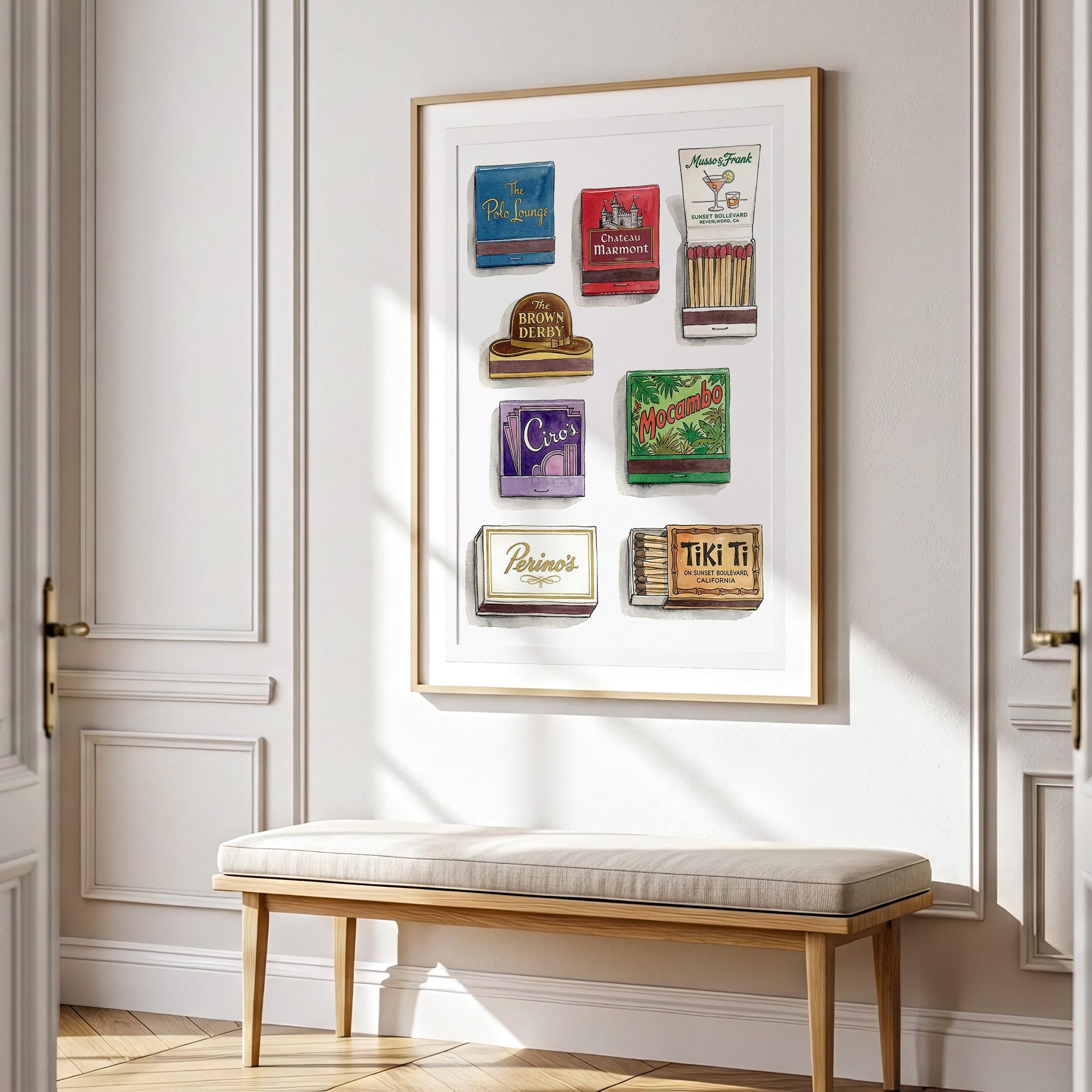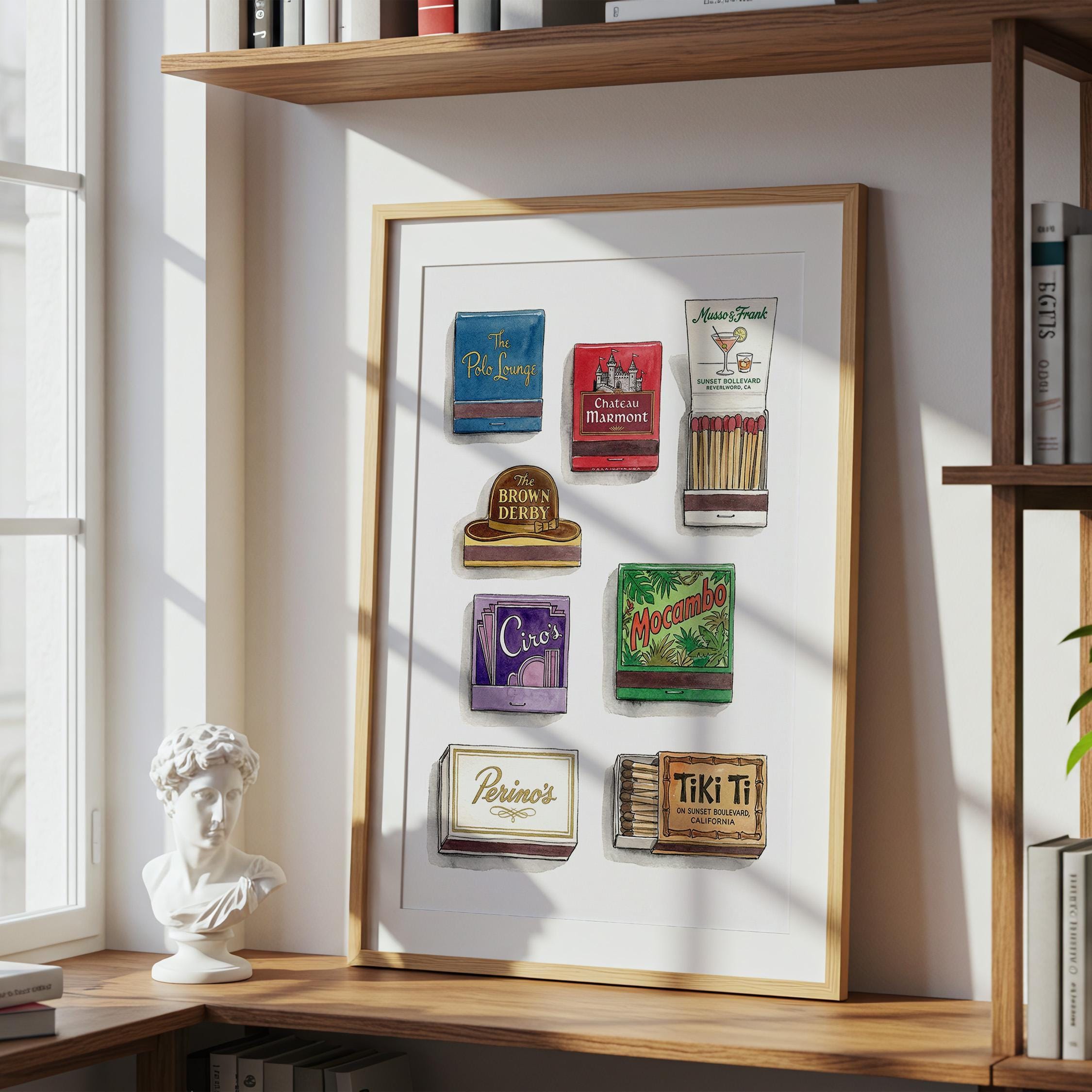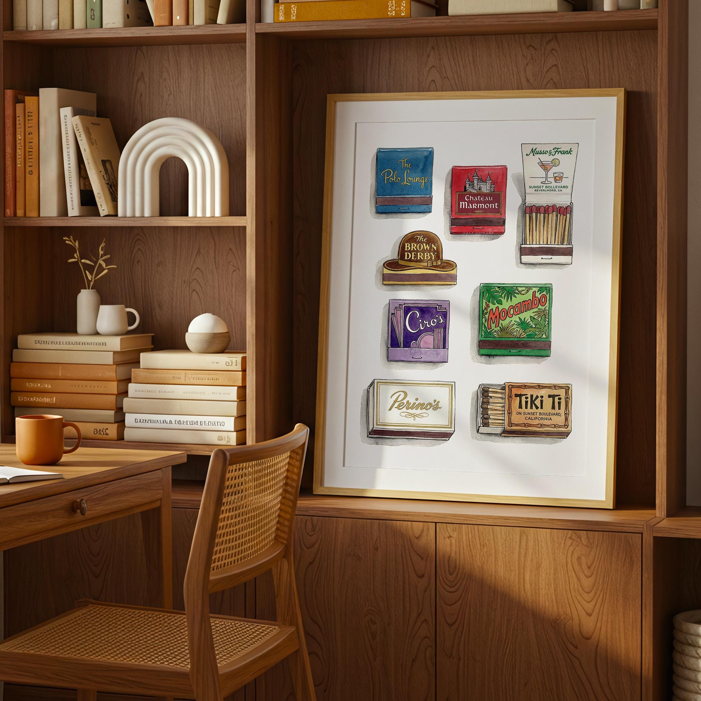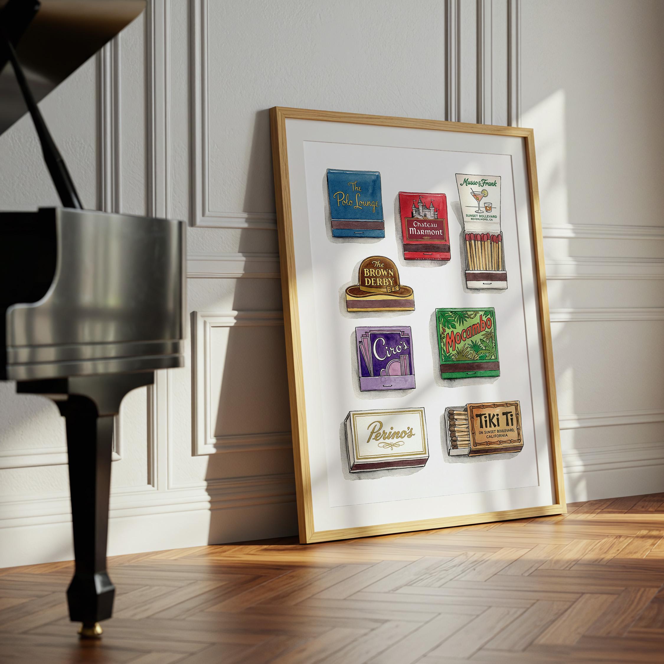 Bring mid century decor to your space with this printable wall art, inspired by a curated retro style matchbook collection. This matchbook poster showcases whimsical matchbooks and unique matchbox art, with designs drawn from classic bars and restaurants like the legendary Chateau Marmont. Perfect as tiki bar decor, kitchen art, or lounge accent, each large matches print brings vintage matchbook nostalgia and colorful character to every wall.