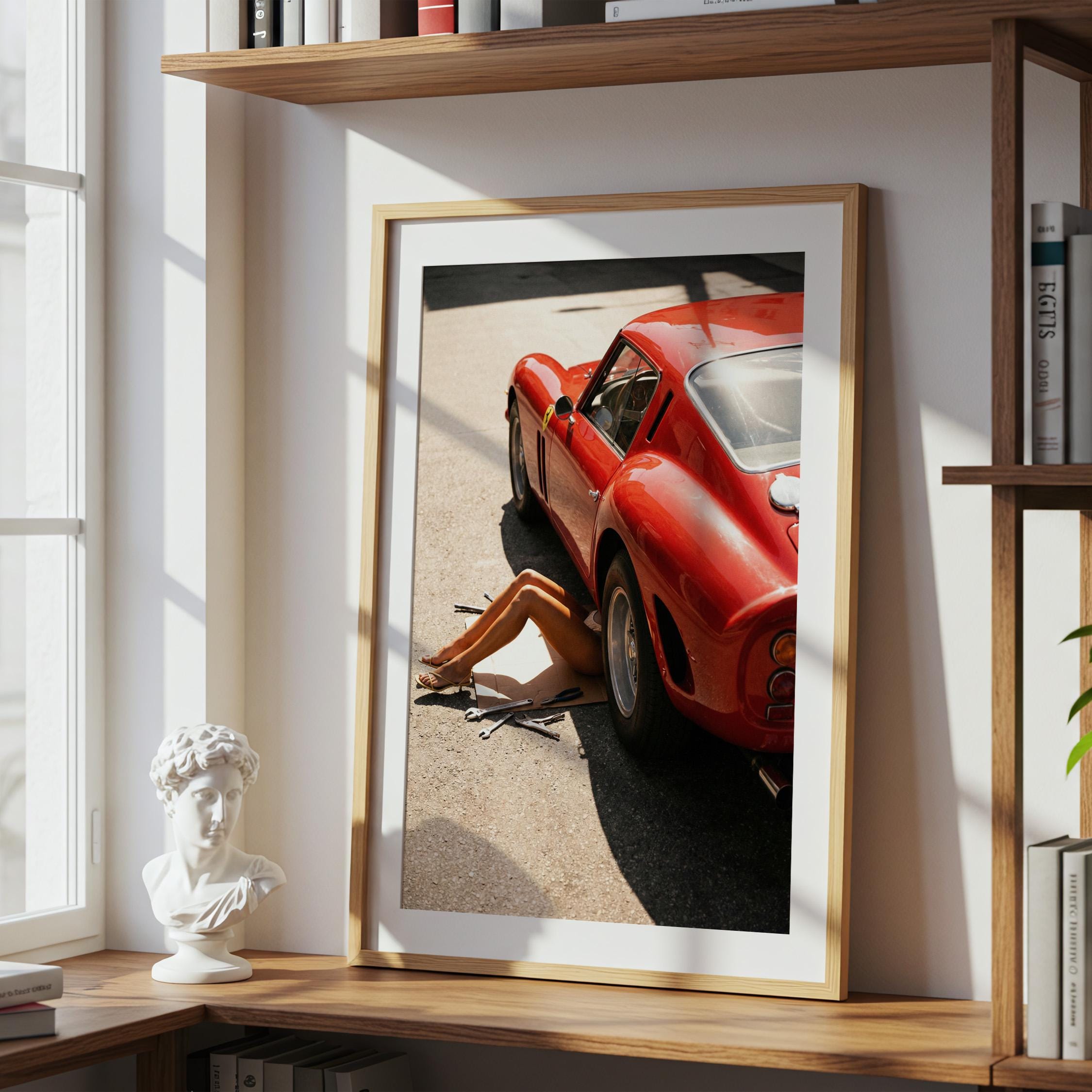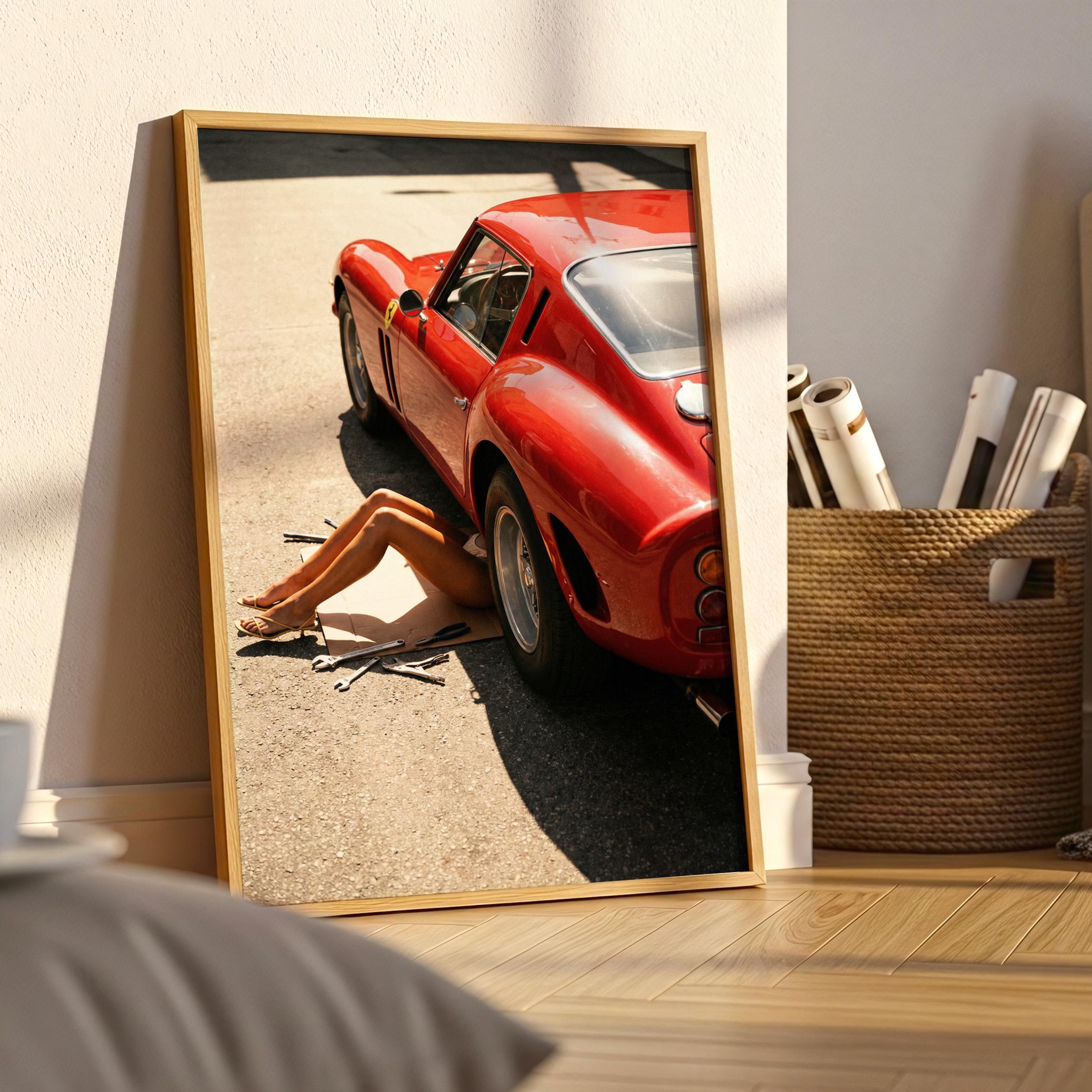 Bring a cinematic garage vibe to your space with this printable wall art featuring a retro Ferrari 250 GTO car in warm, sunlit tones. Styled like an editorial photograph, it blends vintage auto culture with relaxed summer minimalism—perfect for living rooms, dorms, offices, studios, or a man cave gallery wall.