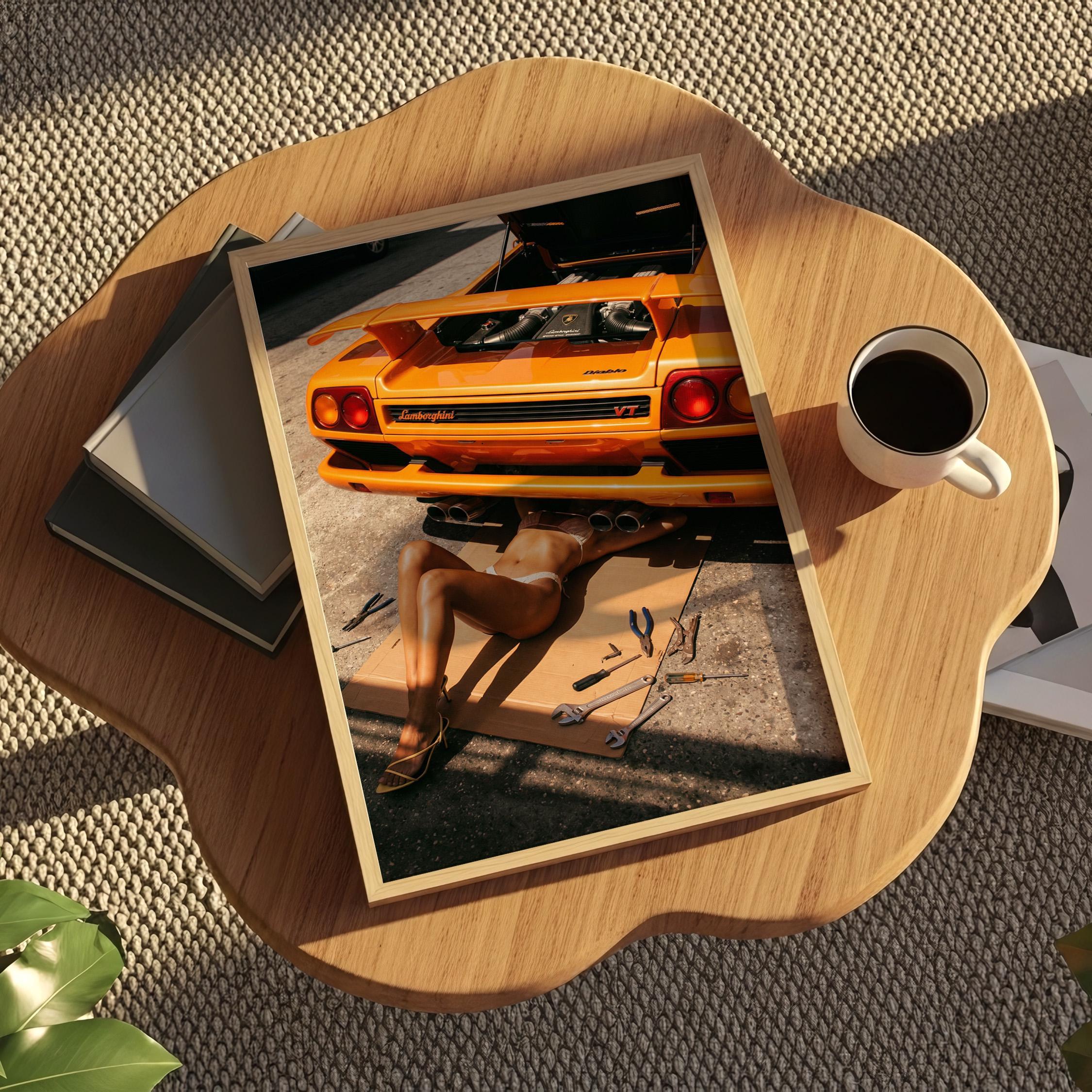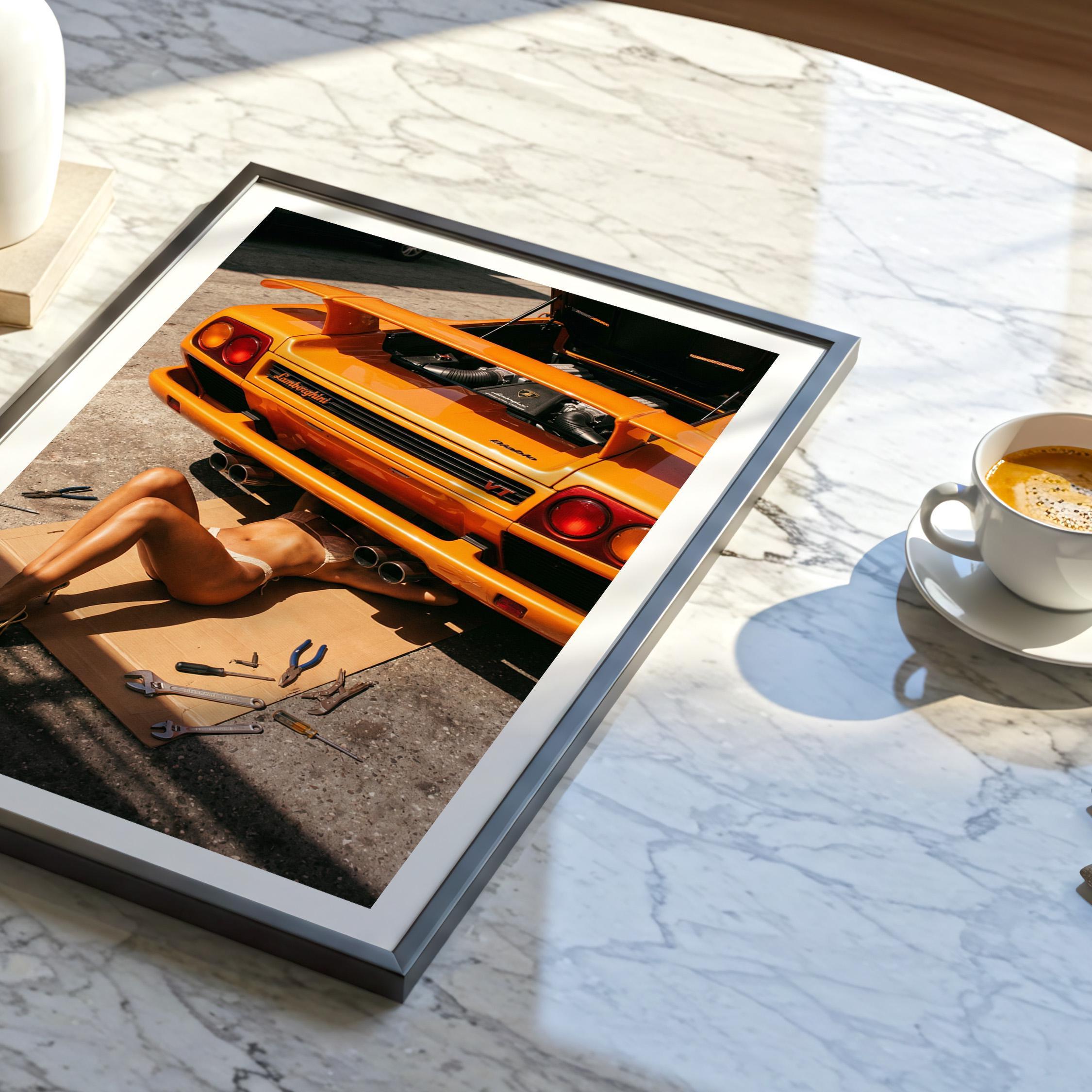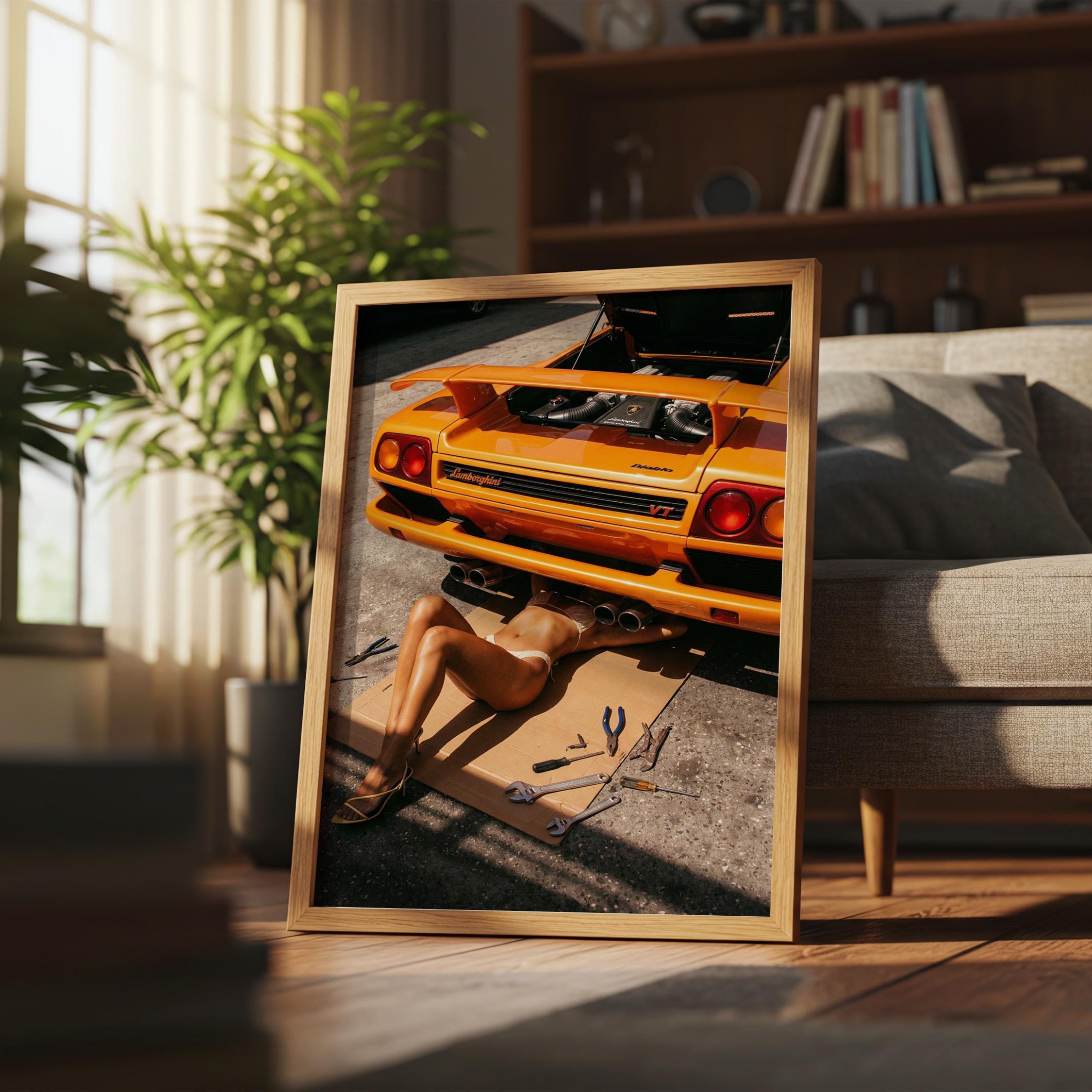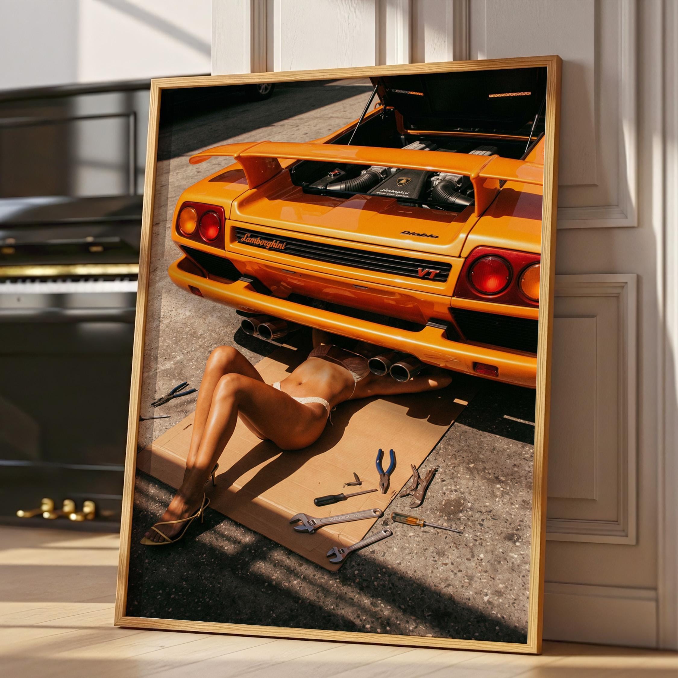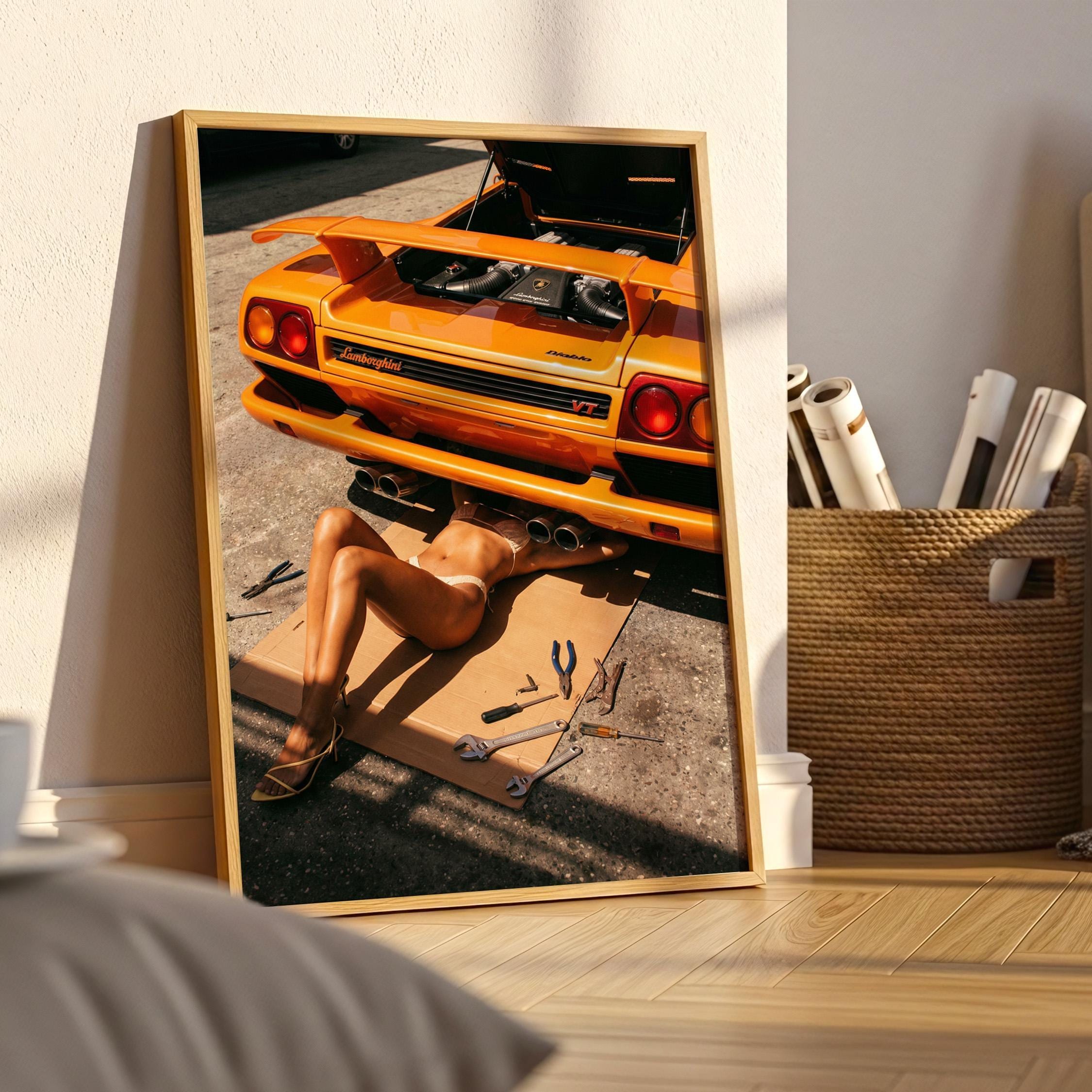 Bring a cinematic garage vibe to your space with this printable wall art featuring an exotic Lamborghini Diablo VT in warm, sunlit tones. Styled to capture the spirit of classic car culture, this sports car print channels the look of an editorial photograph with an effortless blend of vintage autos and relaxed summer minimalism. Whether you're searching for unique man cave decor or a standout piece for your living room, office, dorm, or studio, this poster showcases car guy gift inspiration at its best. If you appreciate a Lamborghini Countach or dream of an orange lambo, this piece fits right in alongside Porsche 911, 300 SL, and other classic car icons. It also makes a thoughtful choice for classic car lovers, fans of Porsche wall art, and those seeking Porsche gifts or Ferrari wall decor.