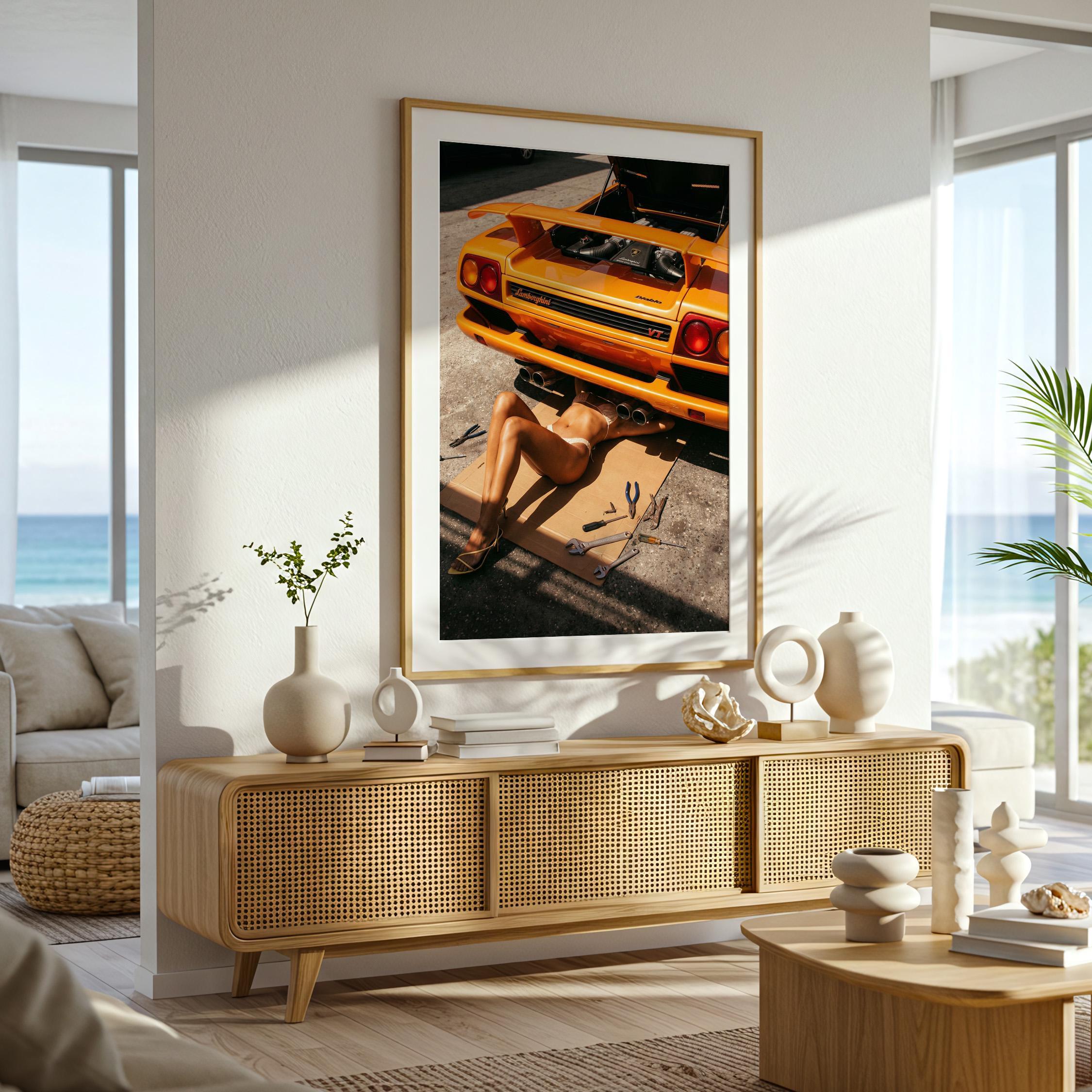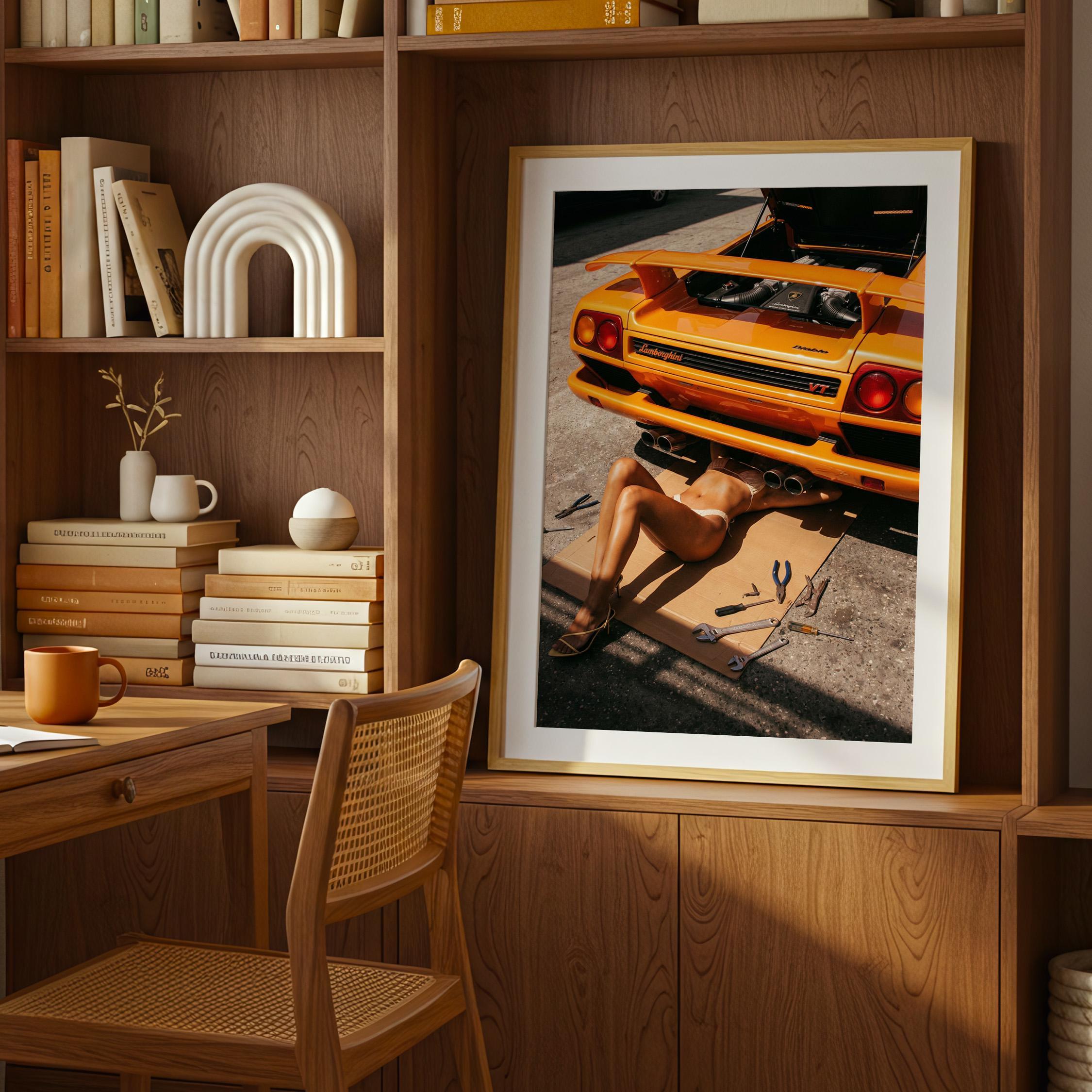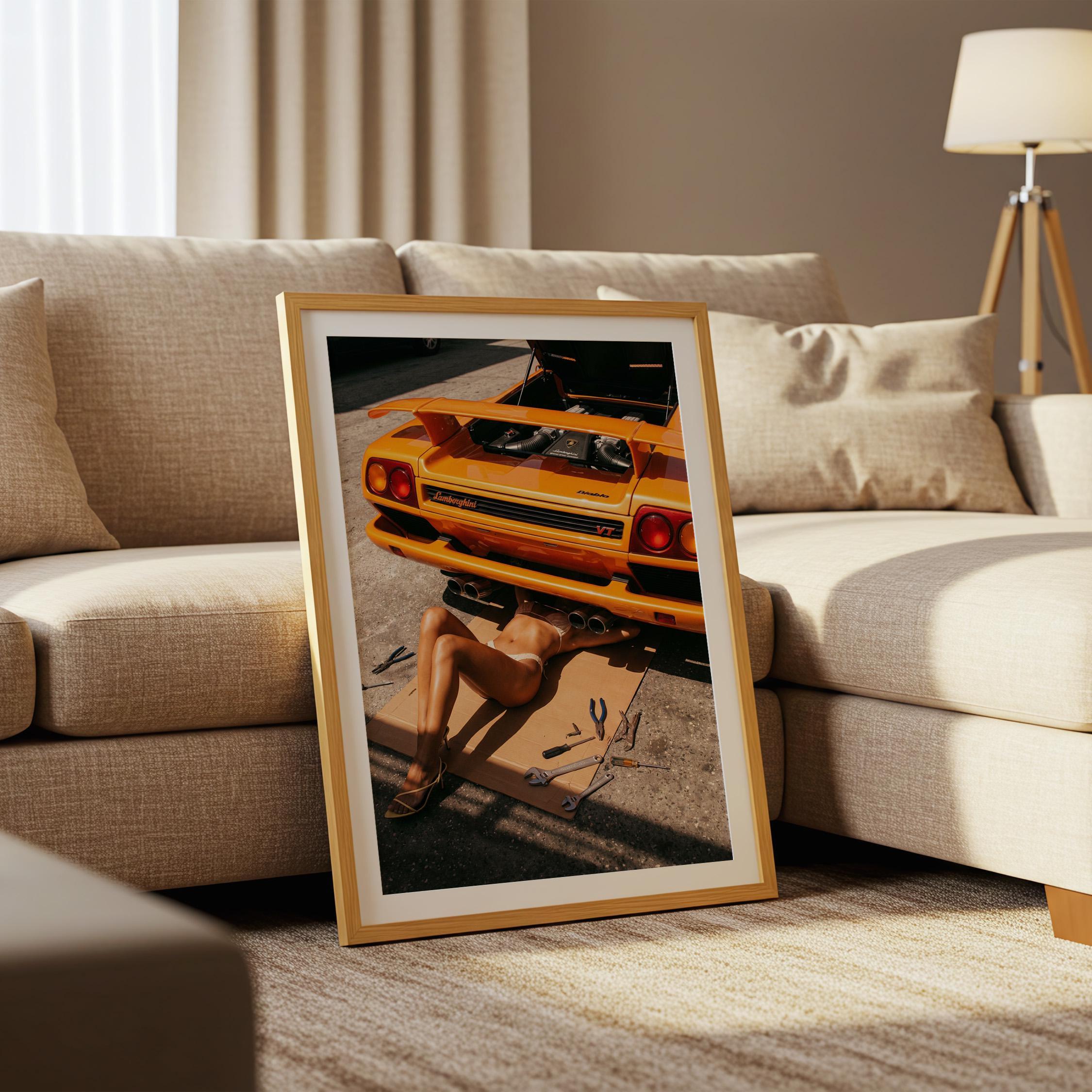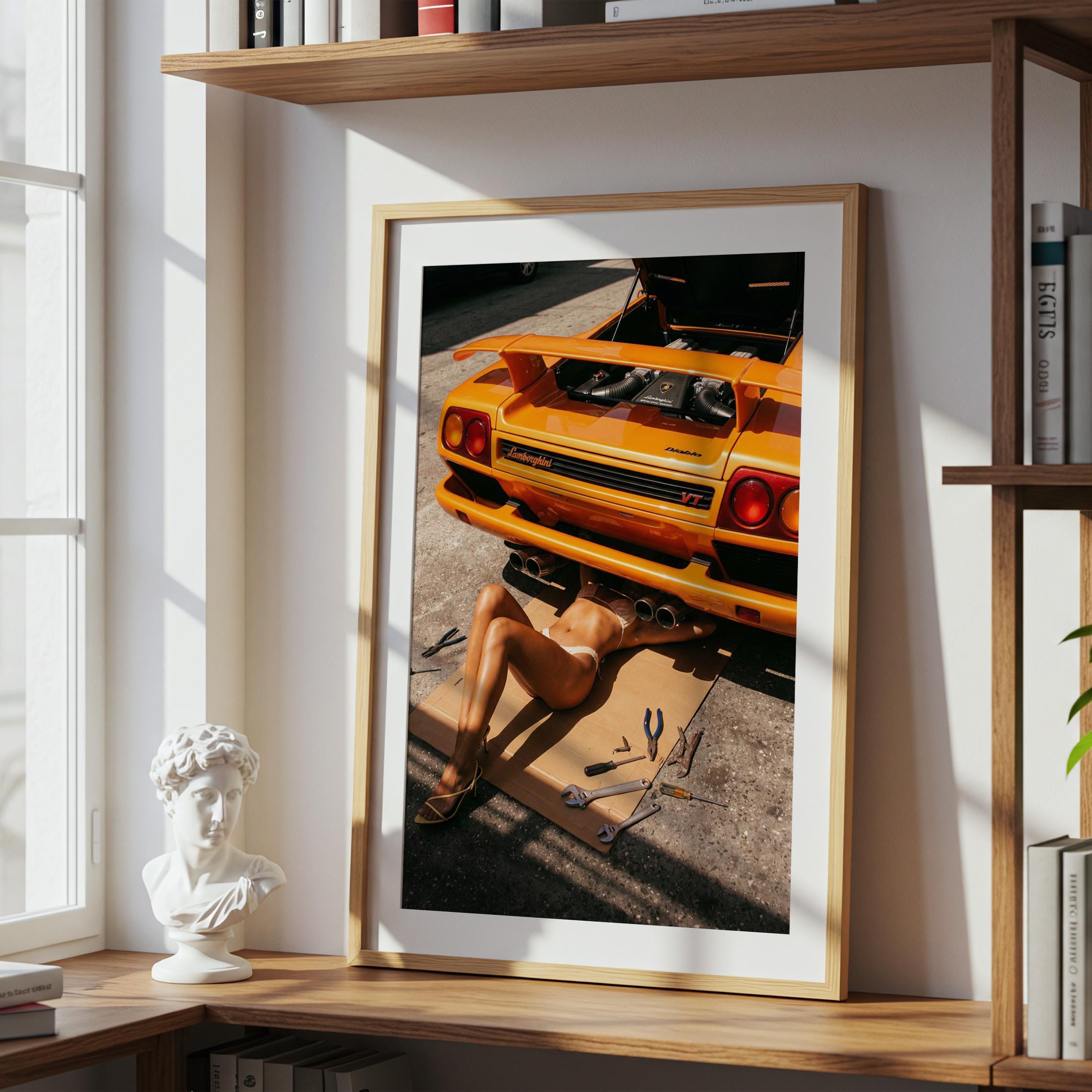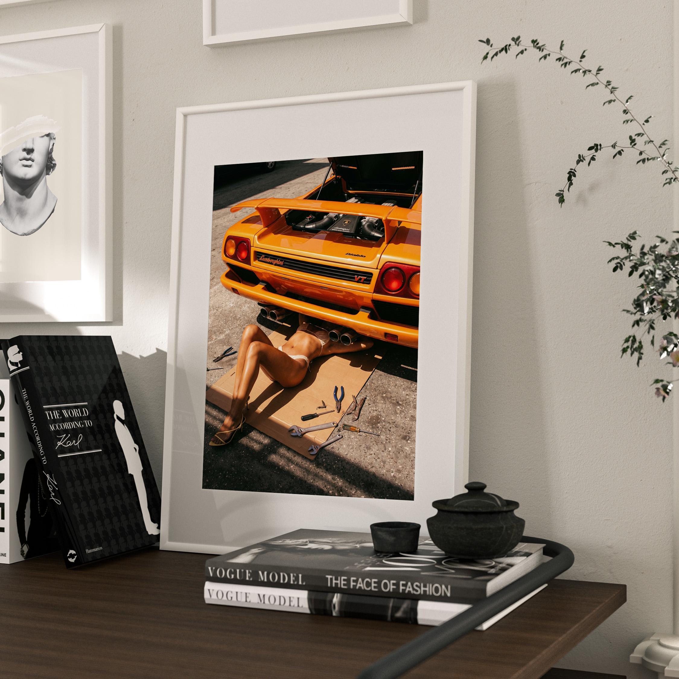 Bring a cinematic garage vibe to your space with this printable wall art featuring an exotic Lamborghini Diablo VT in warm, sunlit tones. Styled to capture the spirit of classic car culture, this sports car print channels the look of an editorial photograph with an effortless blend of vintage autos and relaxed summer minimalism. Whether you're searching for unique man cave decor or a standout piece for your living room, office, dorm, or studio, this poster showcases car guy gift inspiration at its best. If you appreciate a Lamborghini Countach or dream of an orange lambo, this piece fits right in alongside Porsche 911, 300 SL, and other classic car icons. It also makes a thoughtful choice for classic car lovers, fans of Porsche wall art, and those seeking Porsche gifts or Ferrari wall decor.