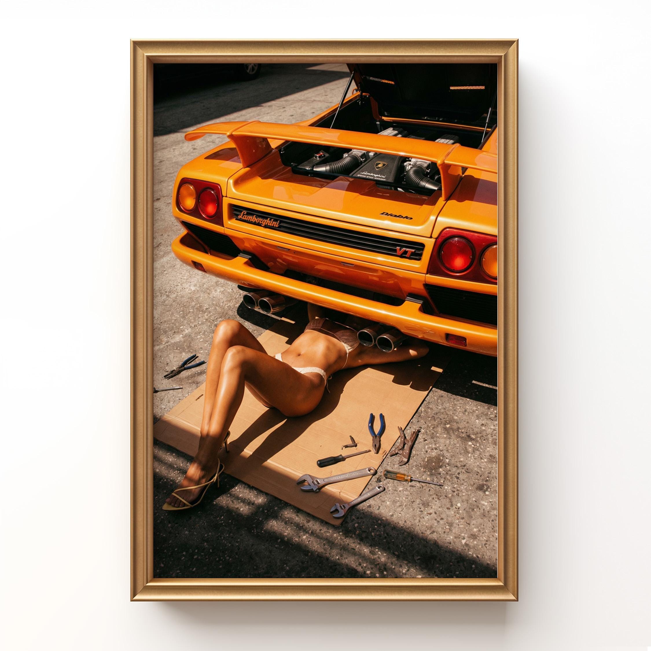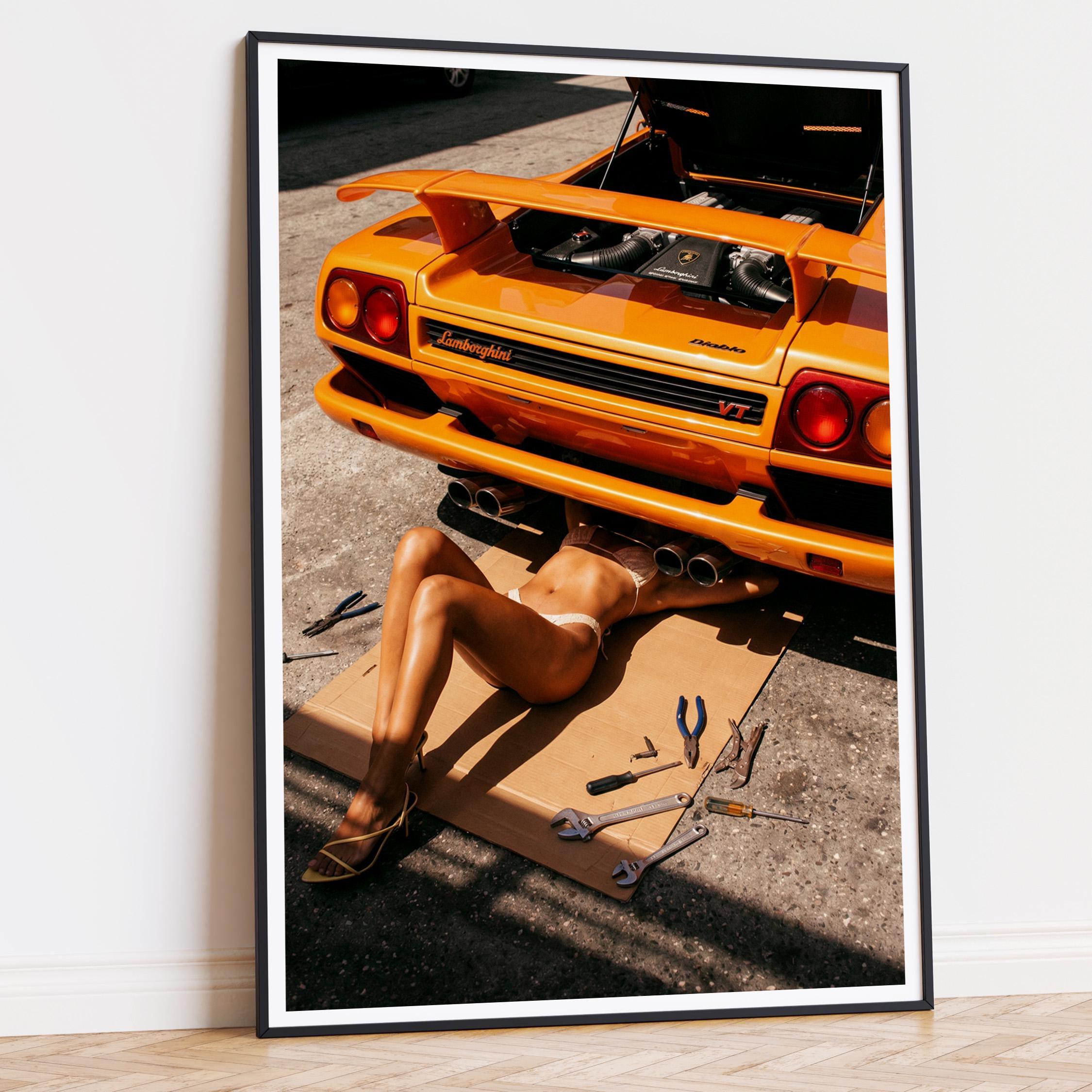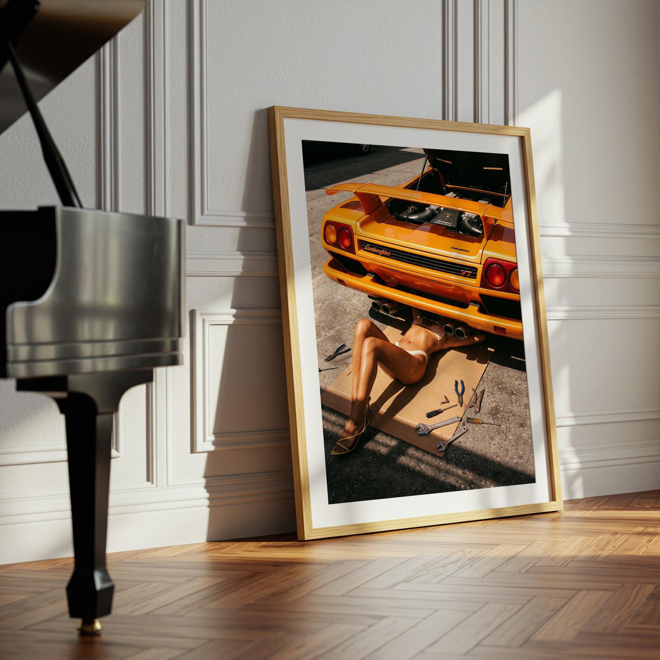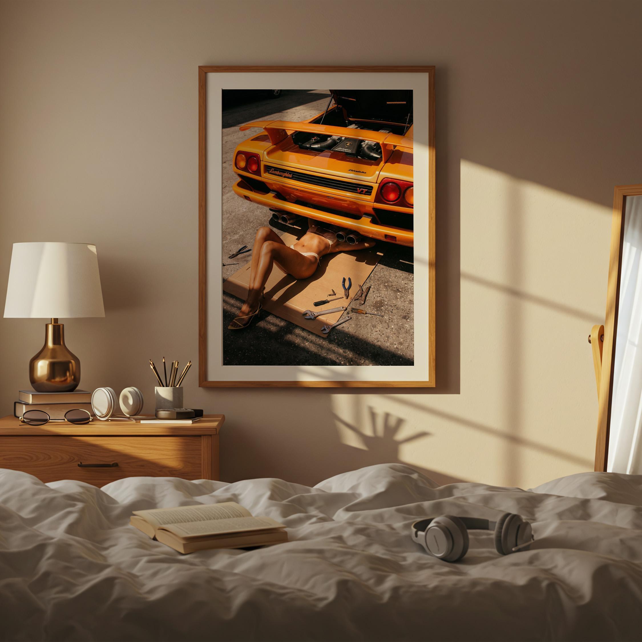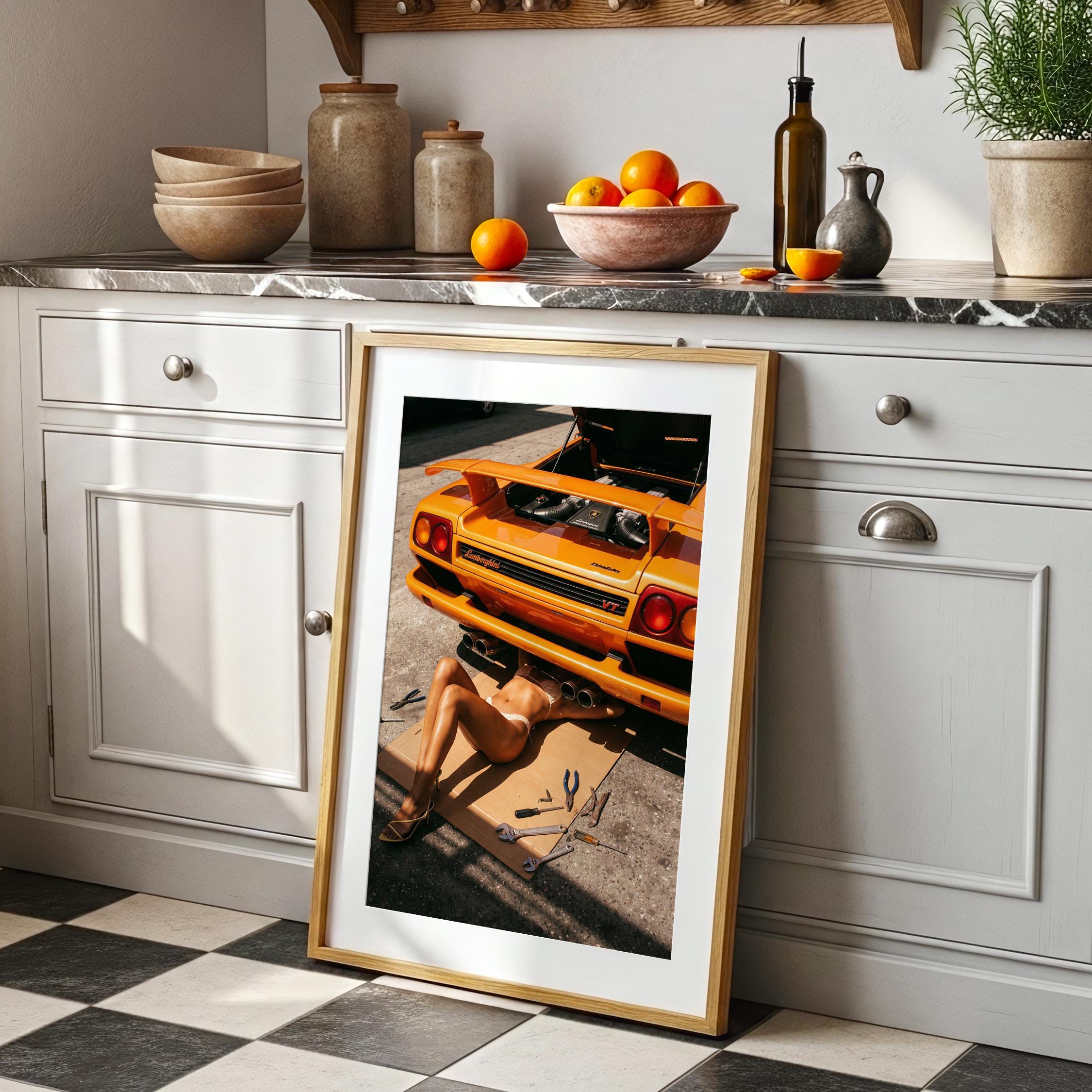 Bring a cinematic garage vibe to your space with this printable wall art featuring an exotic Lamborghini Diablo VT in warm, sunlit tones. Styled to capture the spirit of classic car culture, this sports car print channels the look of an editorial photograph with an effortless blend of vintage autos and relaxed summer minimalism. Whether you're searching for unique man cave decor or a standout piece for your living room, office, dorm, or studio, this poster showcases car guy gift inspiration at its best. If you appreciate a Lamborghini Countach or dream of an orange lambo, this piece fits right in alongside Porsche 911, 300 SL, and other classic car icons. It also makes a thoughtful choice for classic car lovers, fans of Porsche wall art, and those seeking Porsche gifts or Ferrari wall decor.