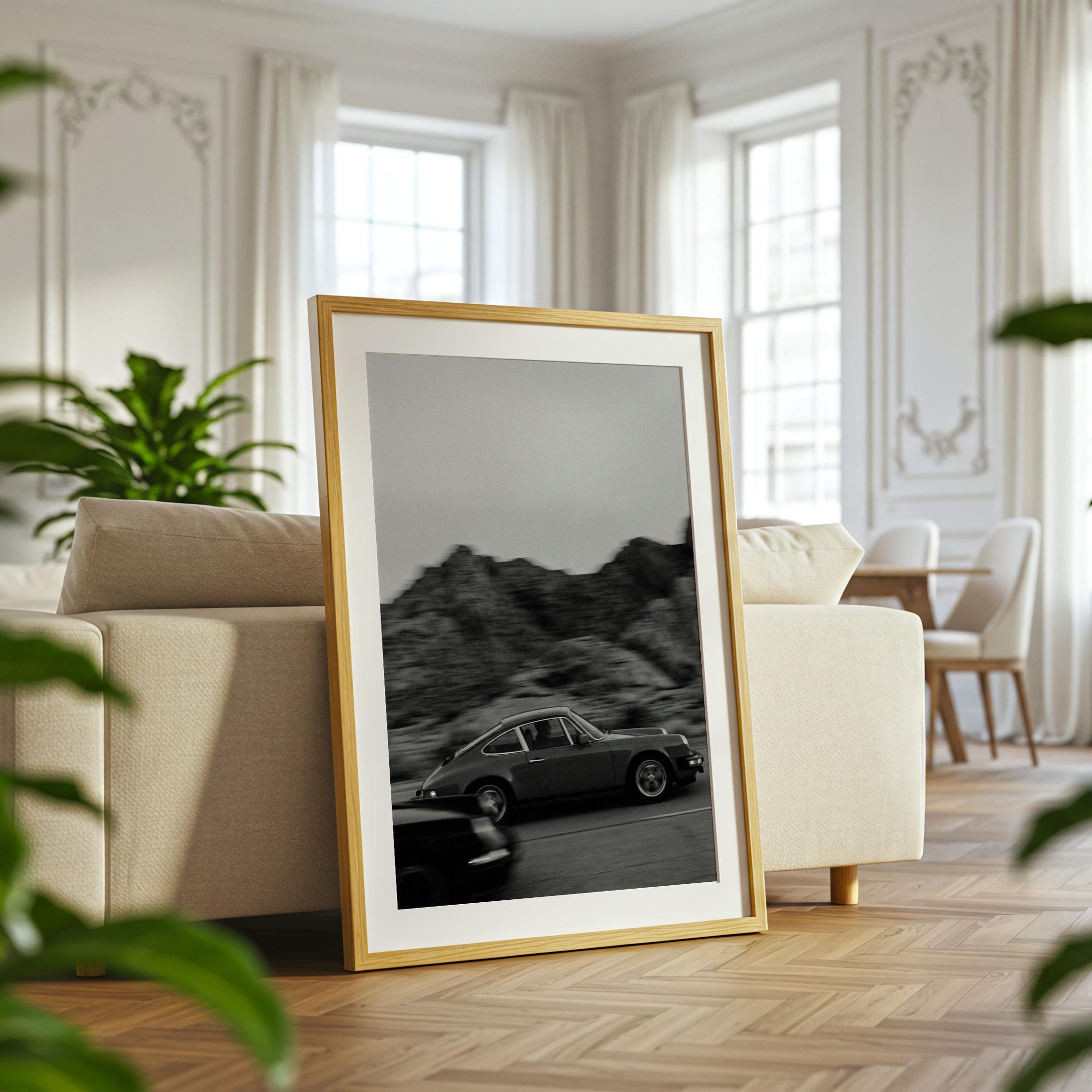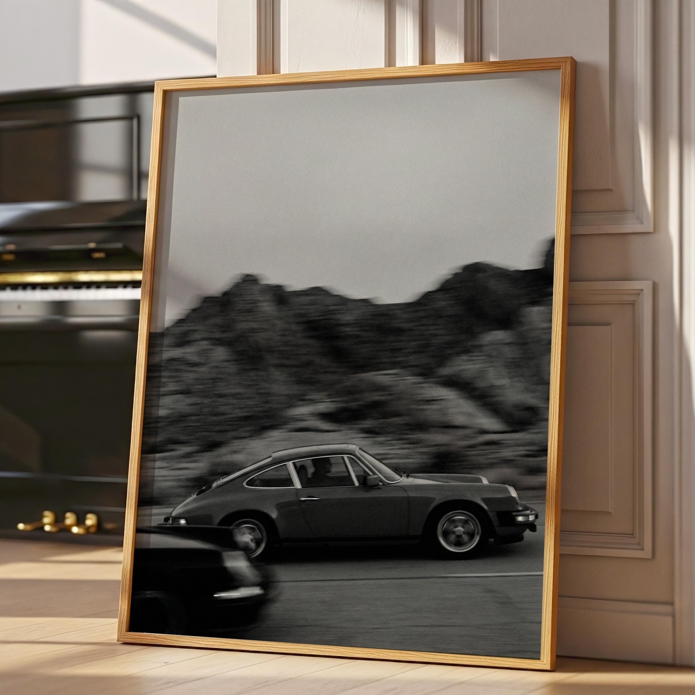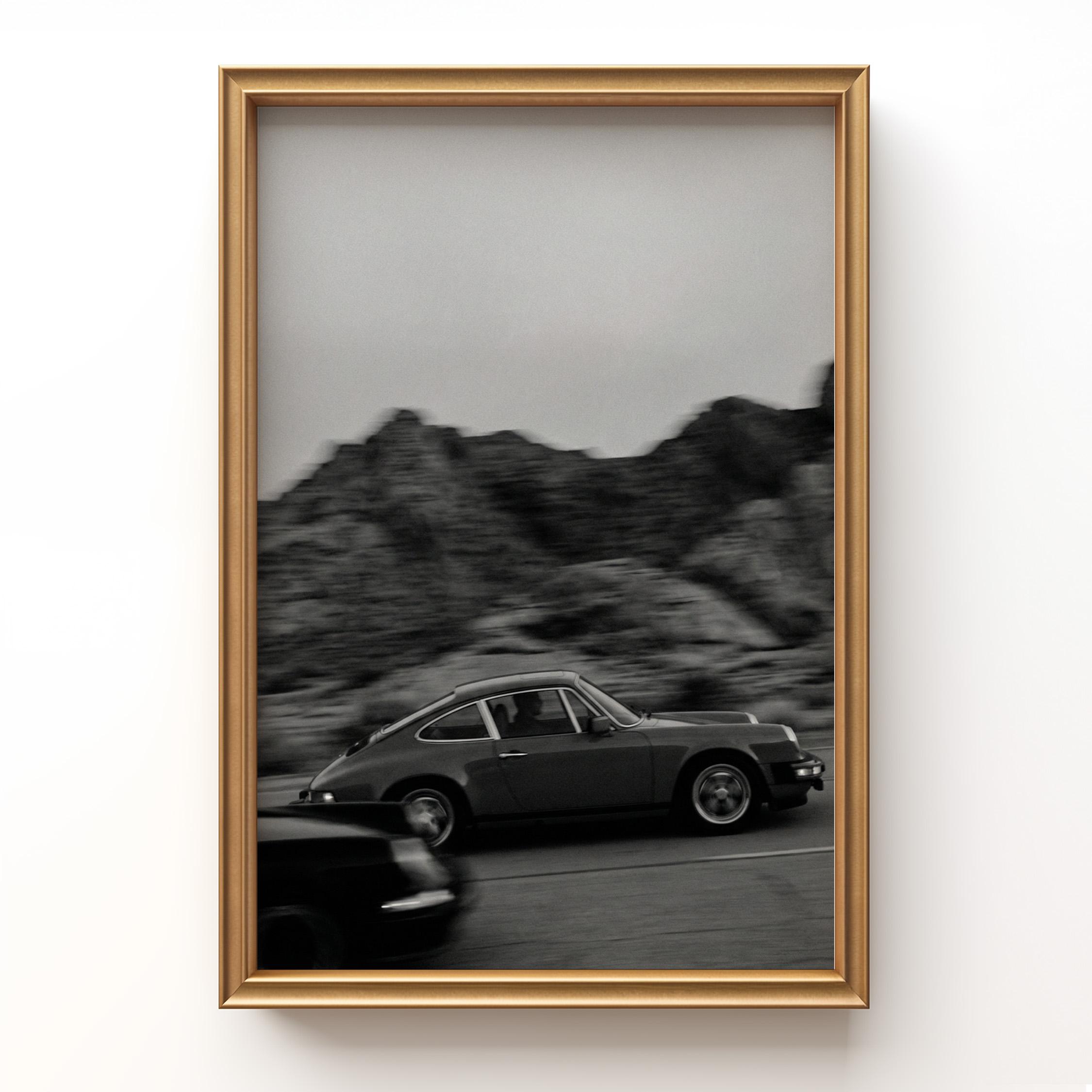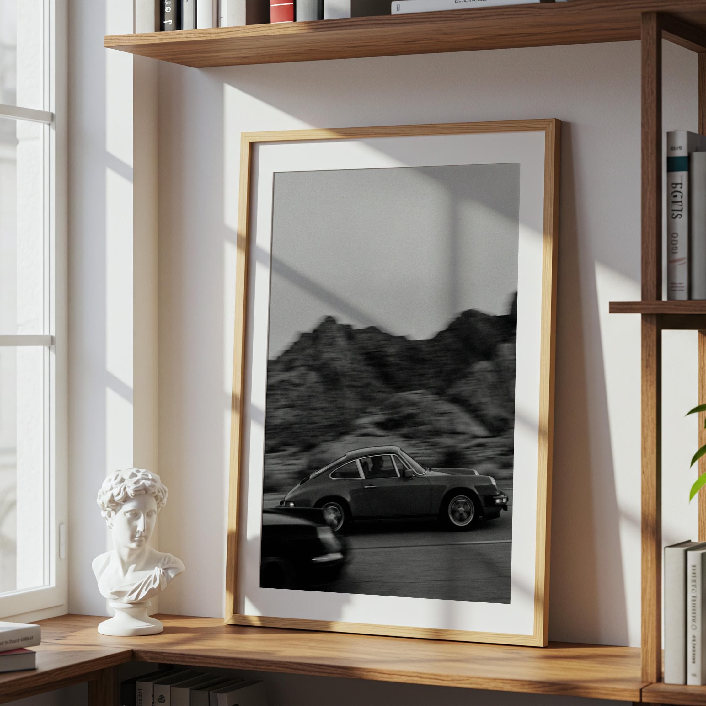 Bring timeless motoring style to your space with this black and white fine art print featuring a classic Porsche 911 racing on a desert canyon road. Perfect for living rooms, offices, garages, and man caves, and a thoughtful gift for car enthusiasts and photographers alike.