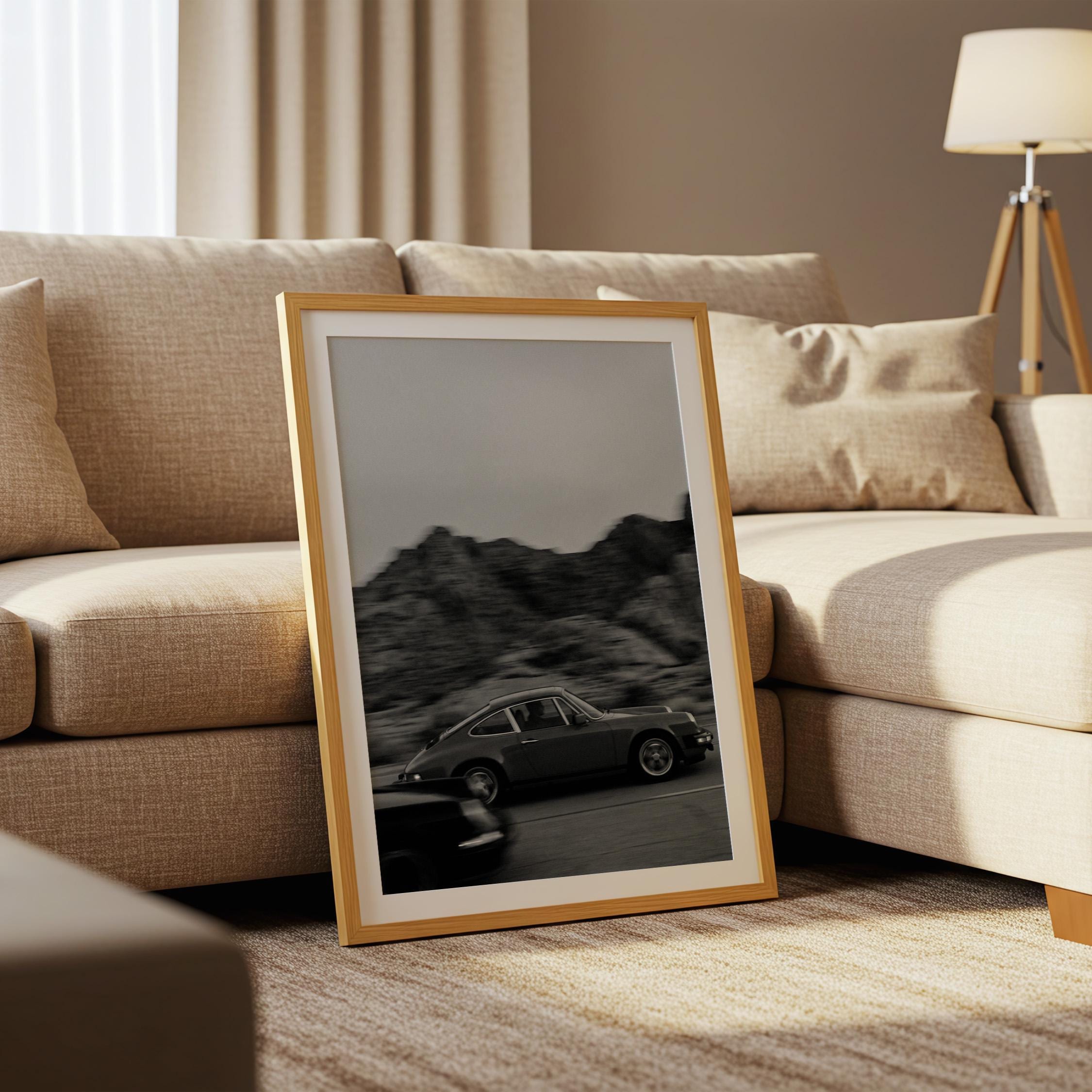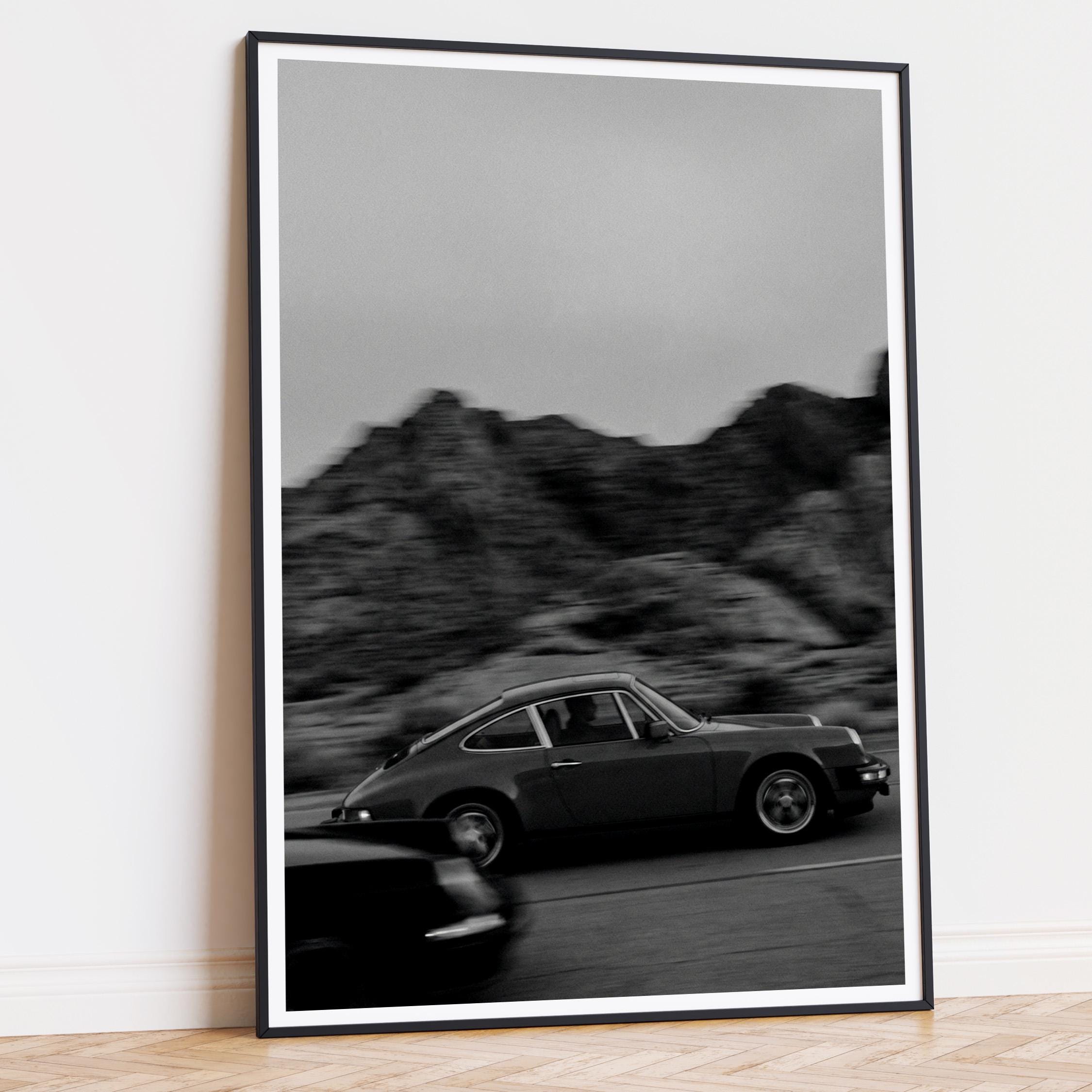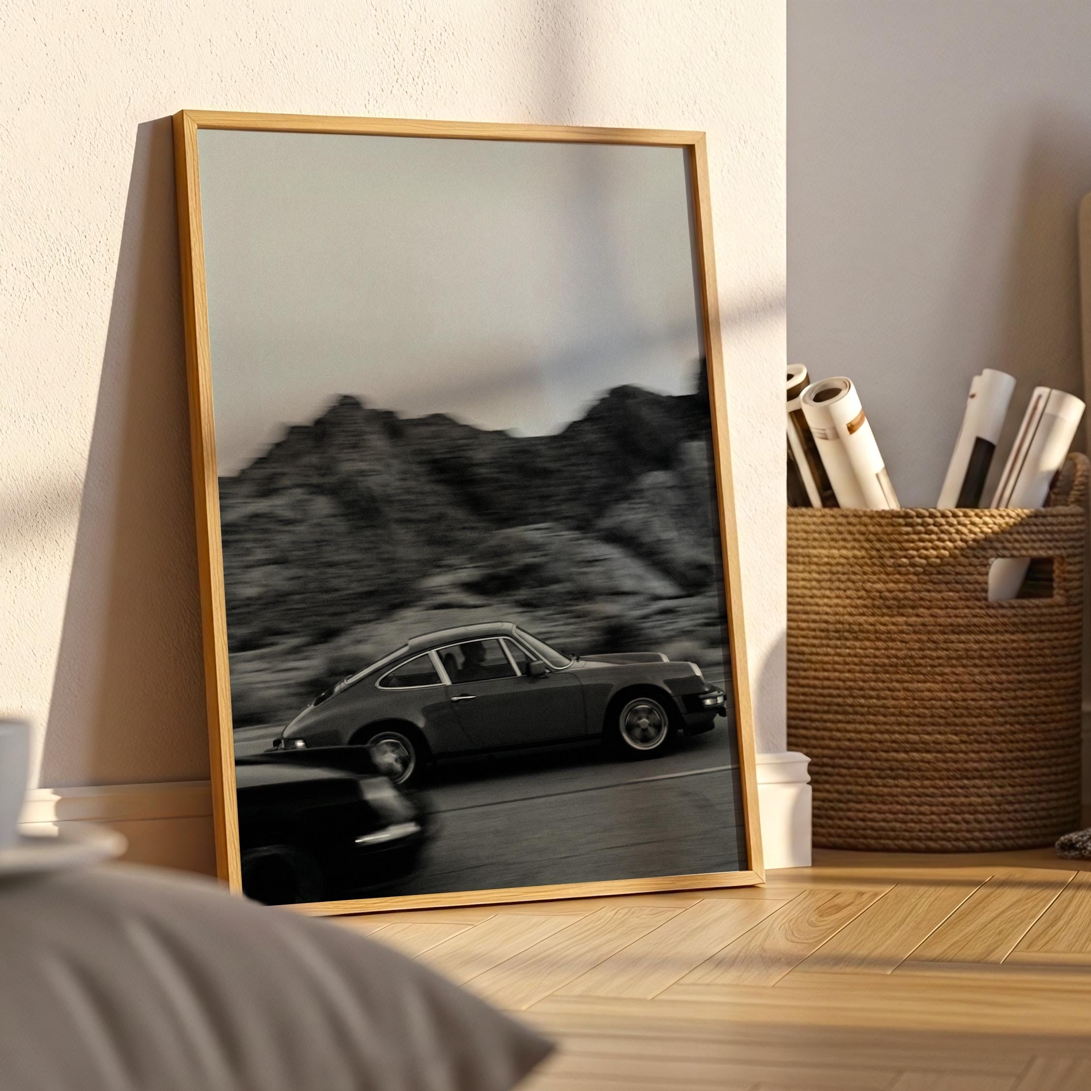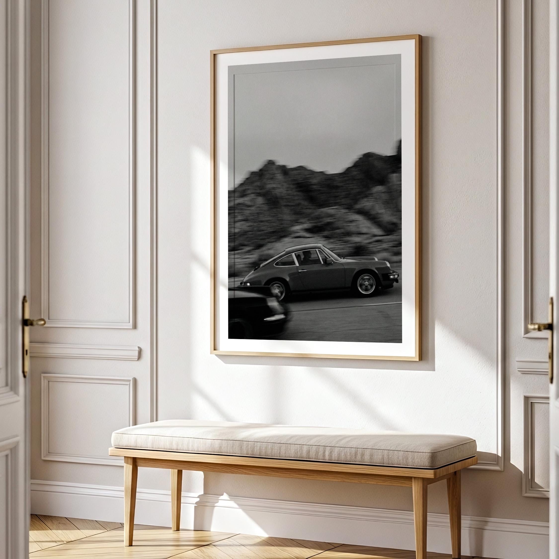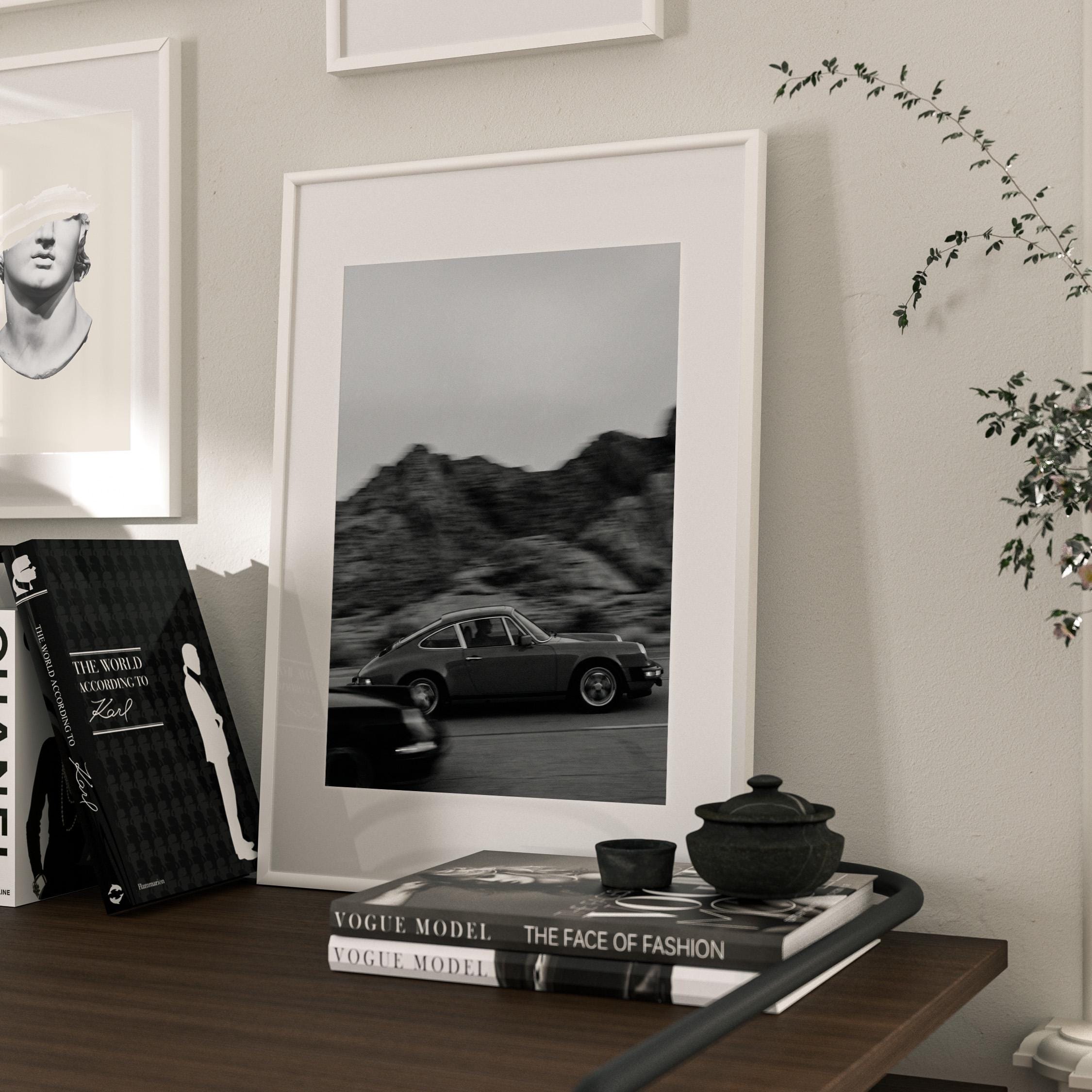 Bring timeless motoring style to your space with this black and white fine art print featuring a classic Porsche 911 racing on a desert canyon road. Perfect for living rooms, offices, garages, and man caves, and a thoughtful gift for car enthusiasts and photographers alike.