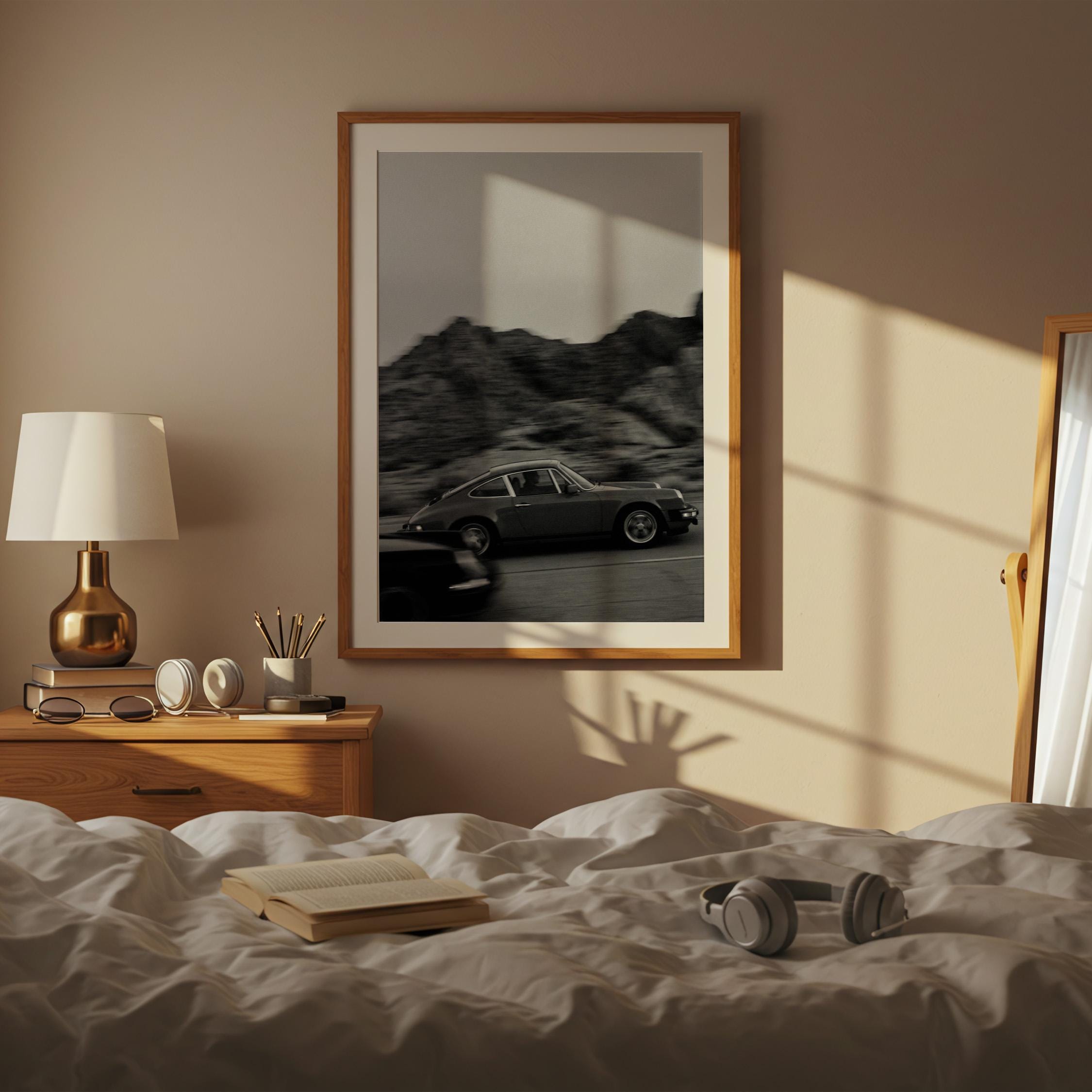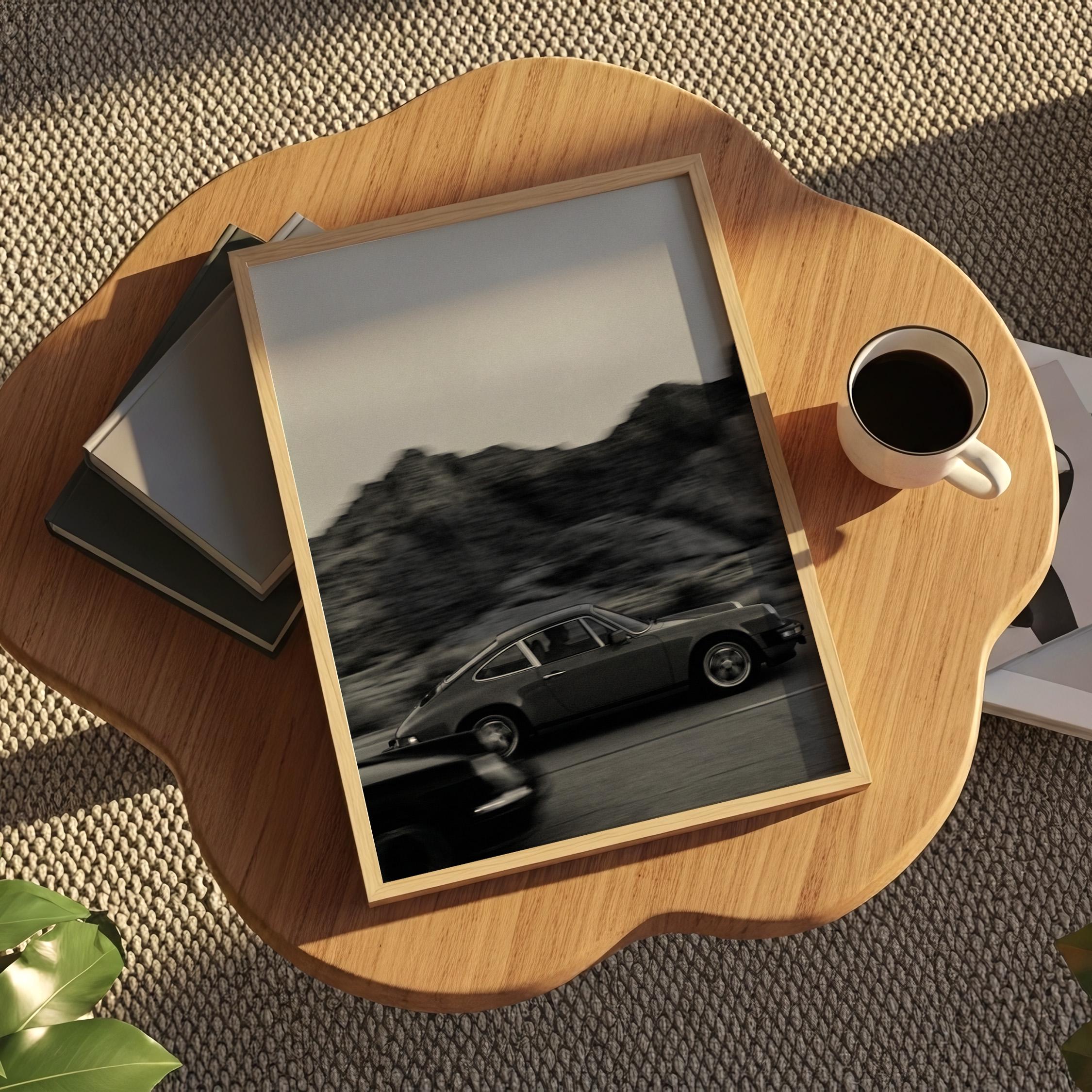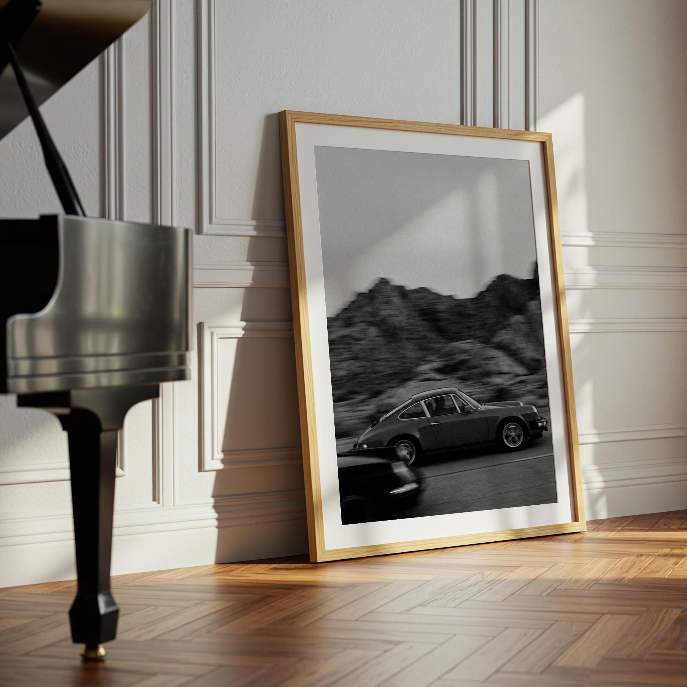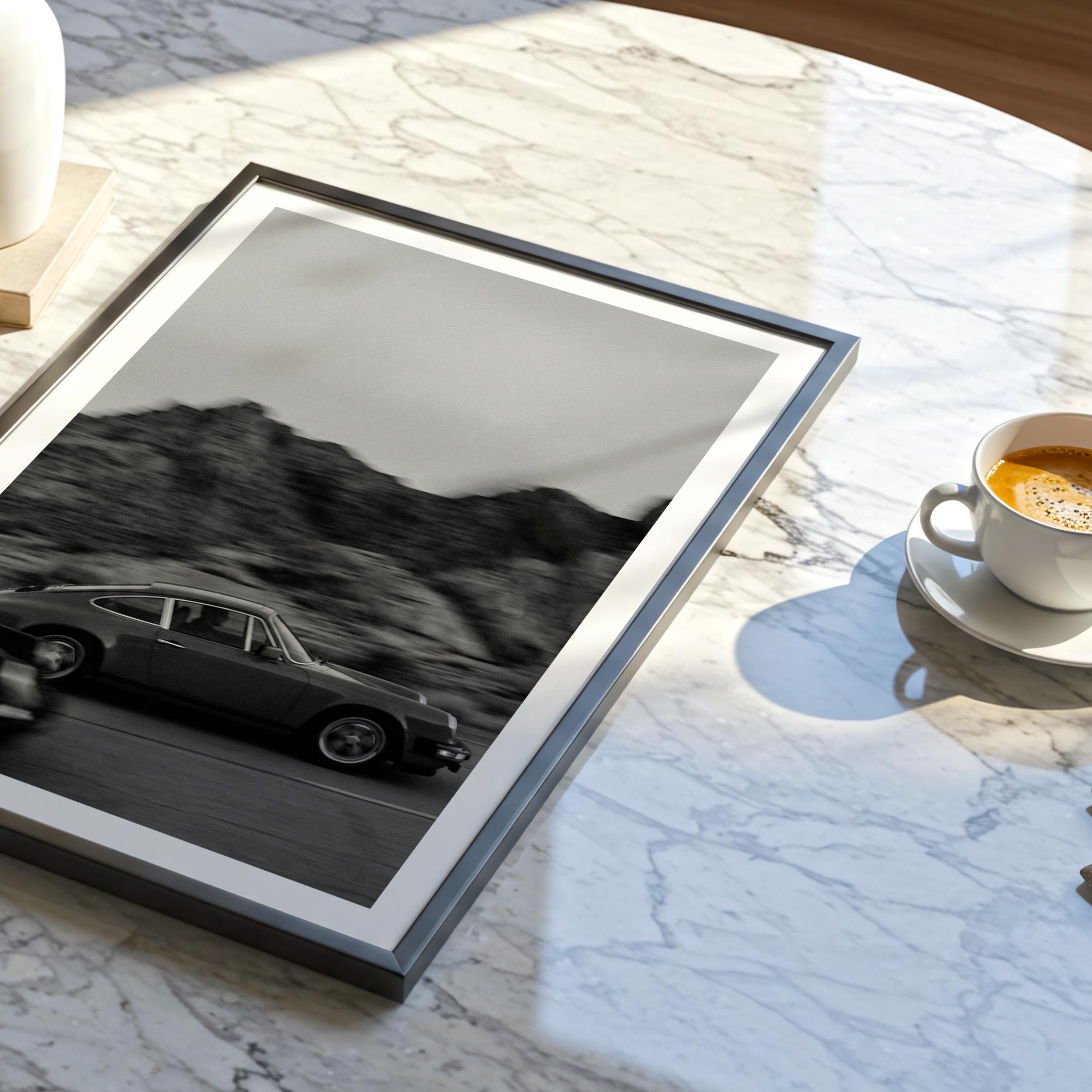Bring timeless motoring style to your space with this black and white fine art print featuring a classic Porsche 911 racing on a desert canyon road. Perfect for living rooms, offices, garages, and man caves, and a thoughtful gift for car enthusiasts and photographers alike.