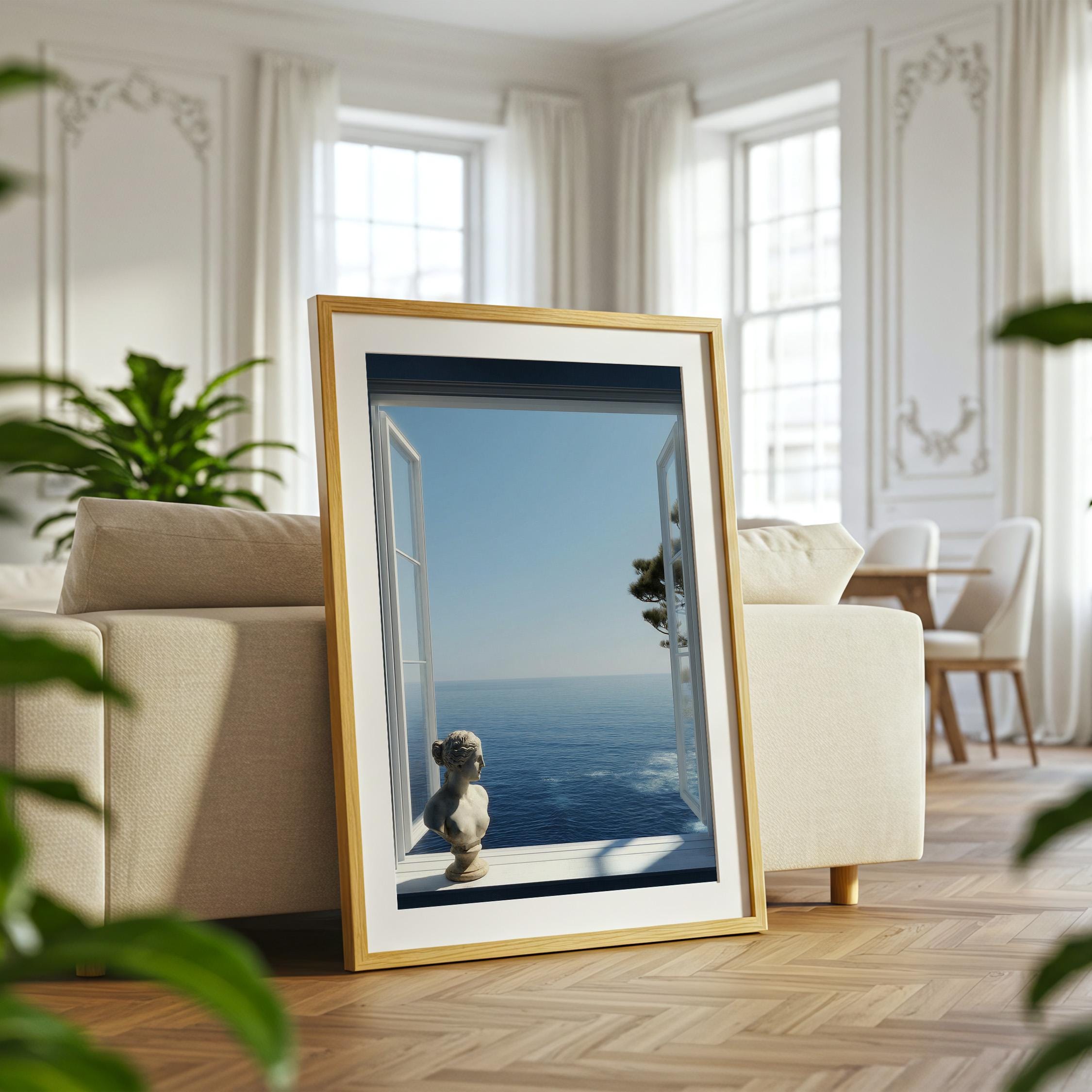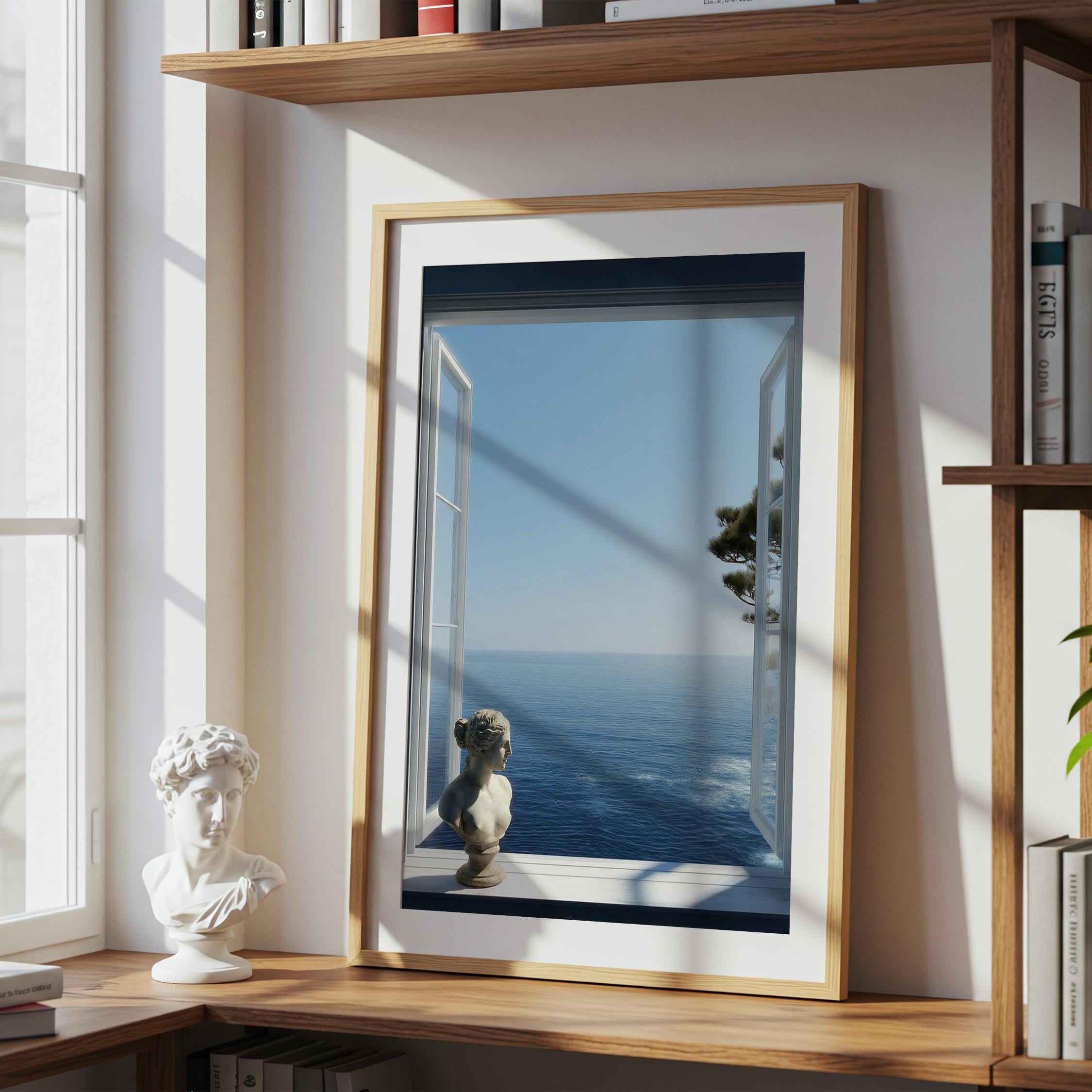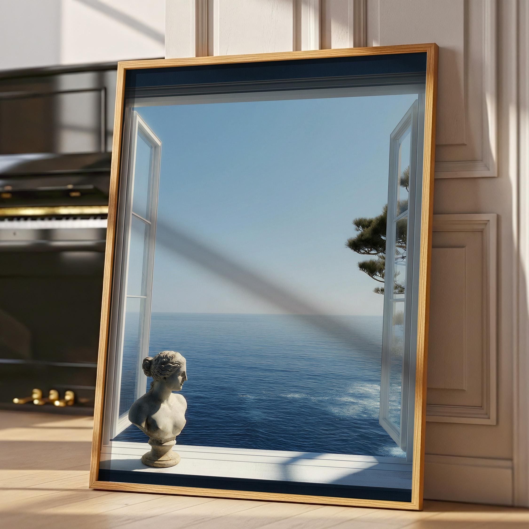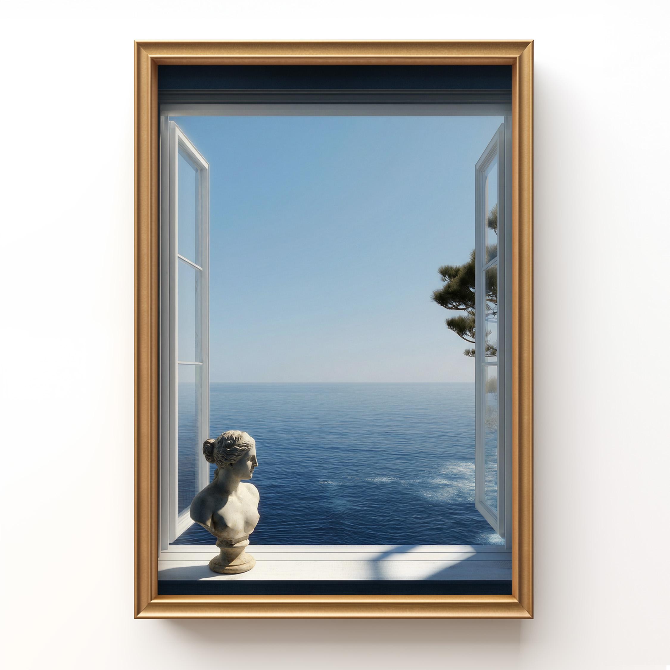 Transform your space with a serene Mediterranean escape. This high-resolution printable art features an open window framing the deep blue Amalfi Coast sea with a subtle classical statue in the foreground—perfect for coastal, minimalist, or modern interiors.
