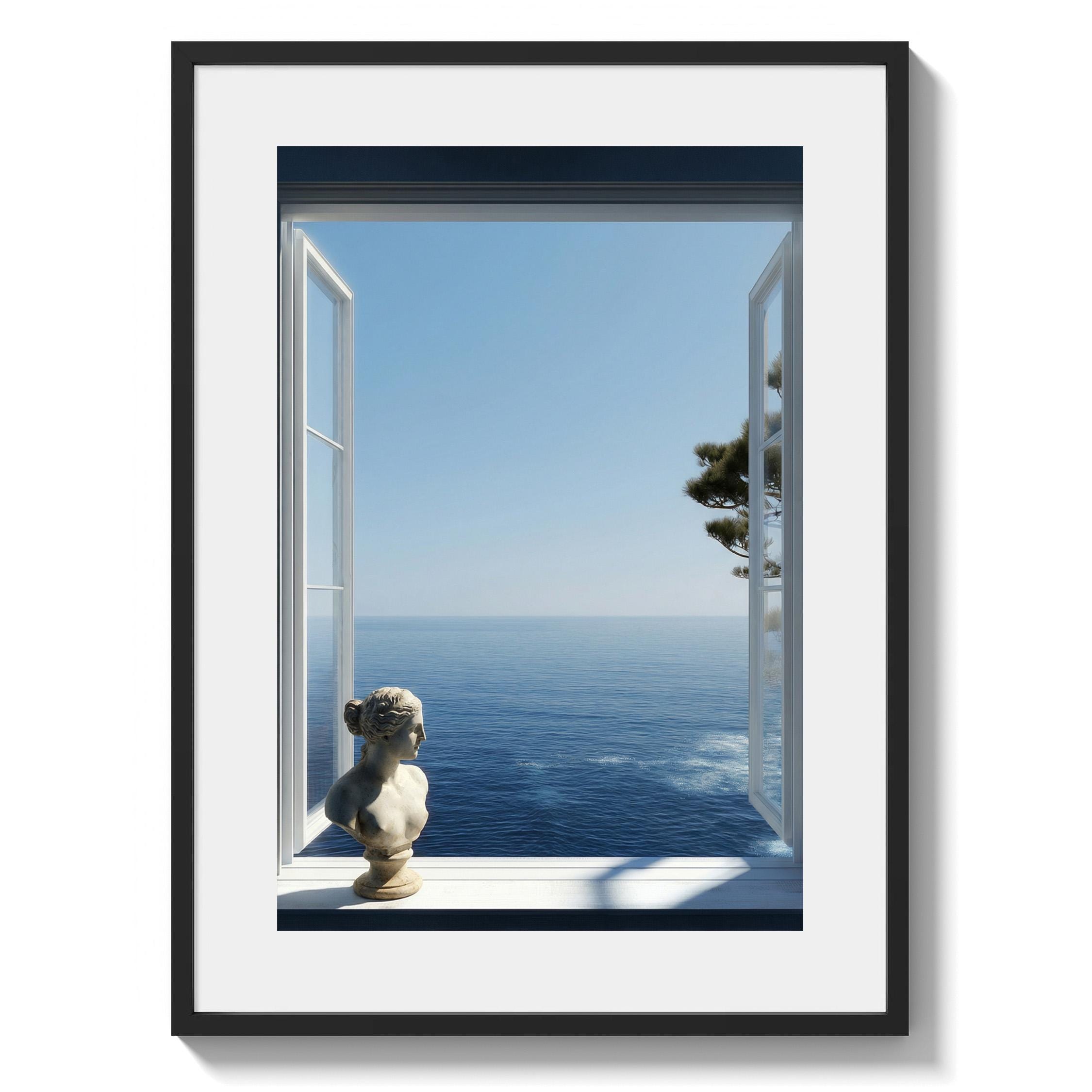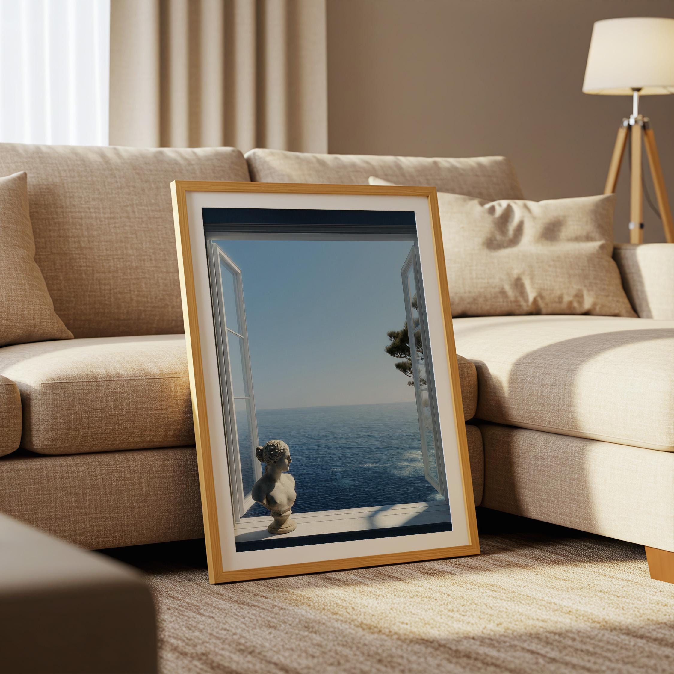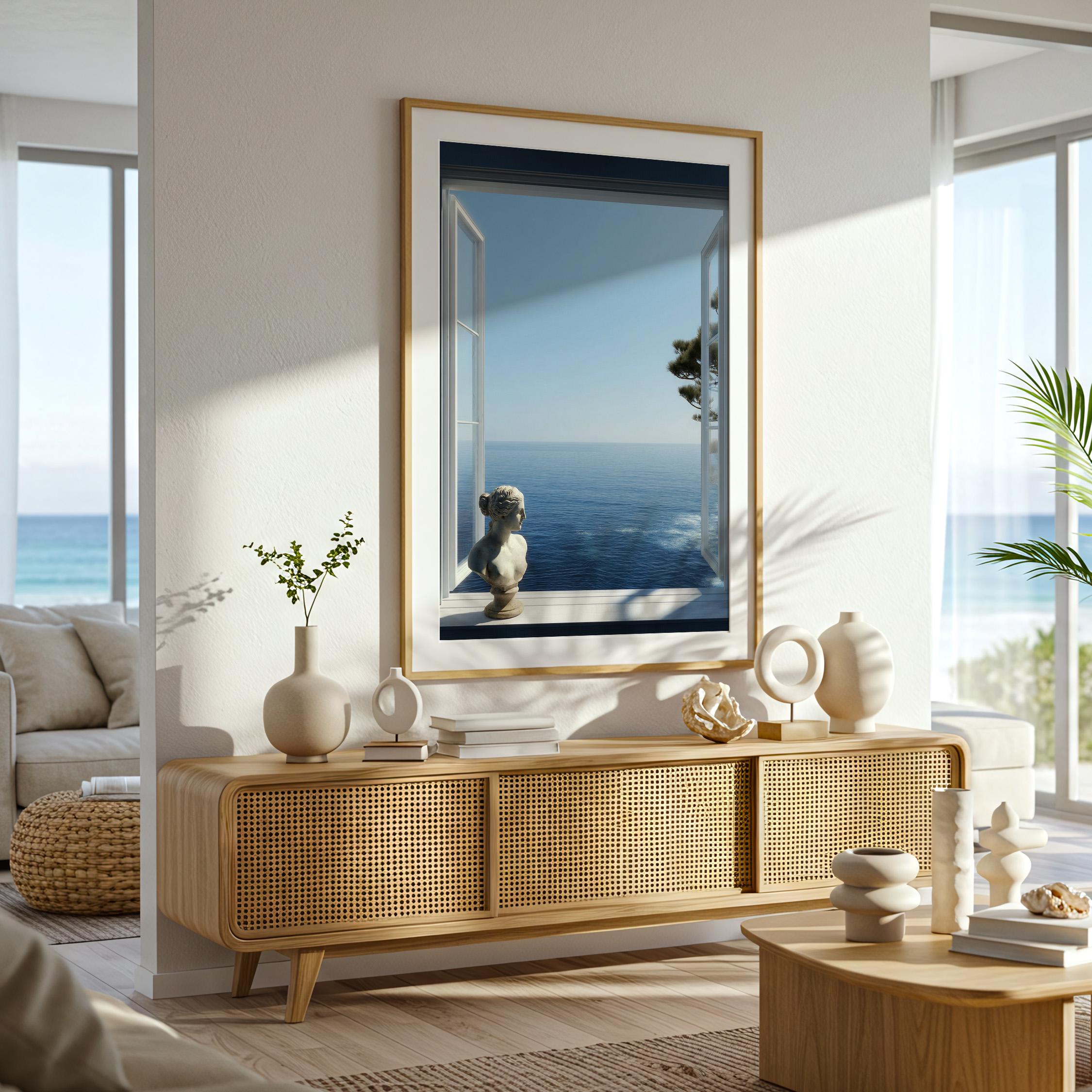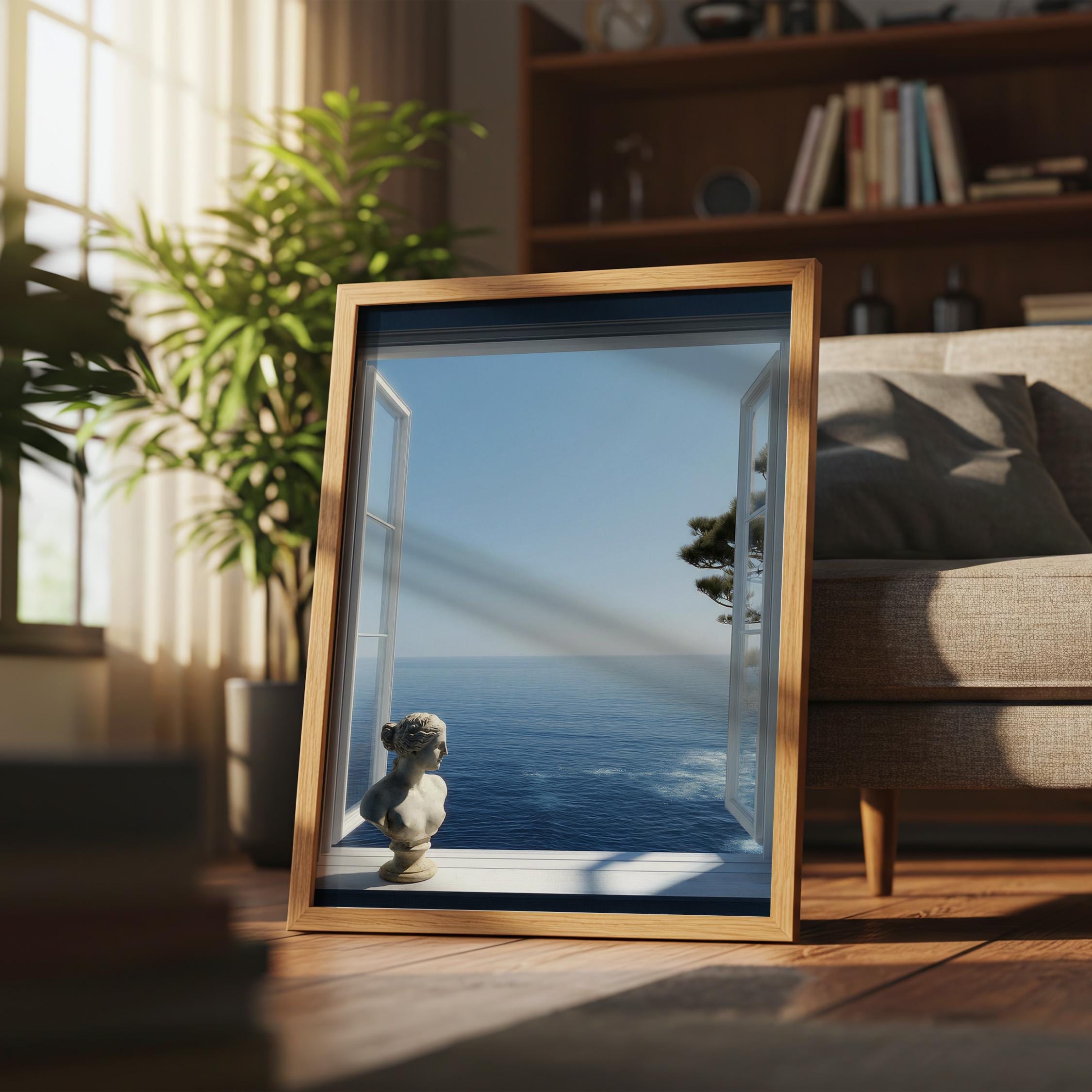 Transform your space with a serene Mediterranean escape. This high-resolution printable art features an open window framing the deep blue Amalfi Coast sea with a subtle classical statue in the foreground—perfect for coastal, minimalist, or modern interiors.