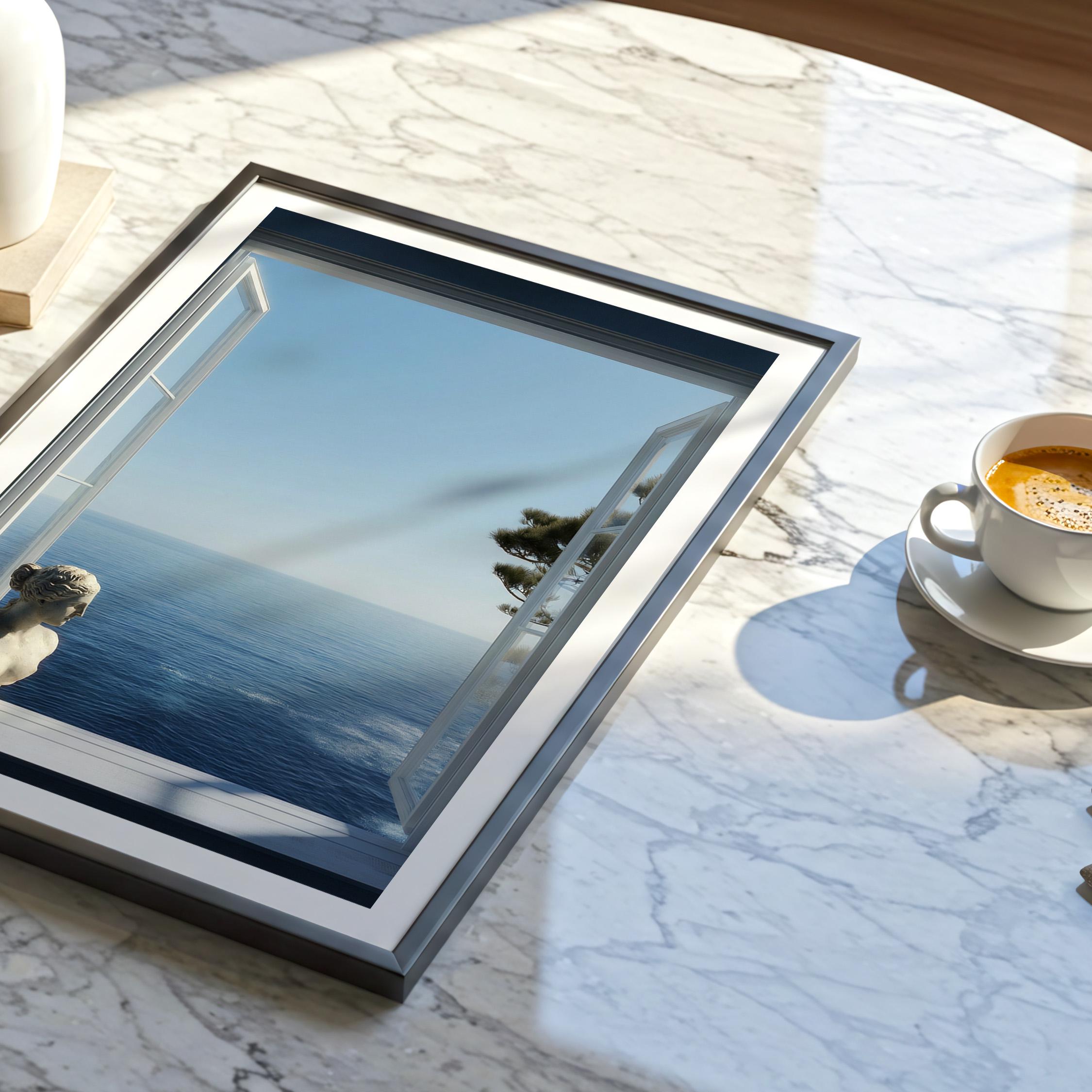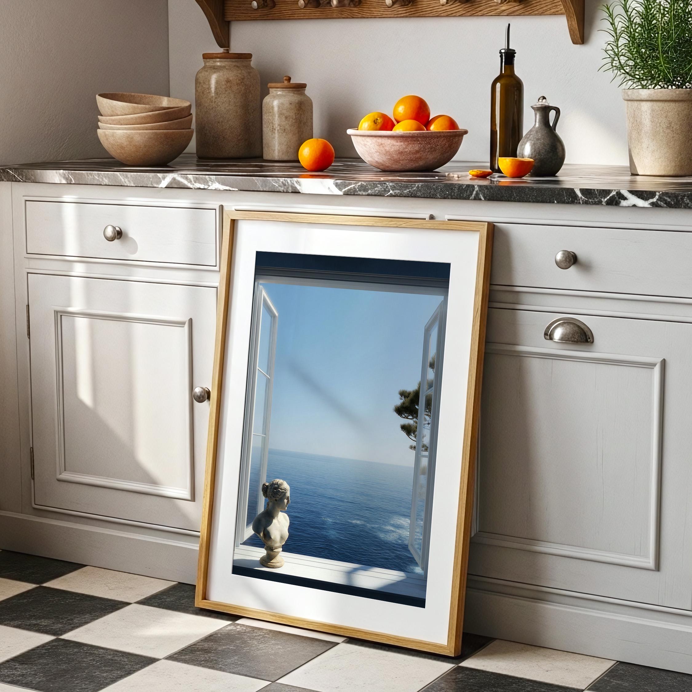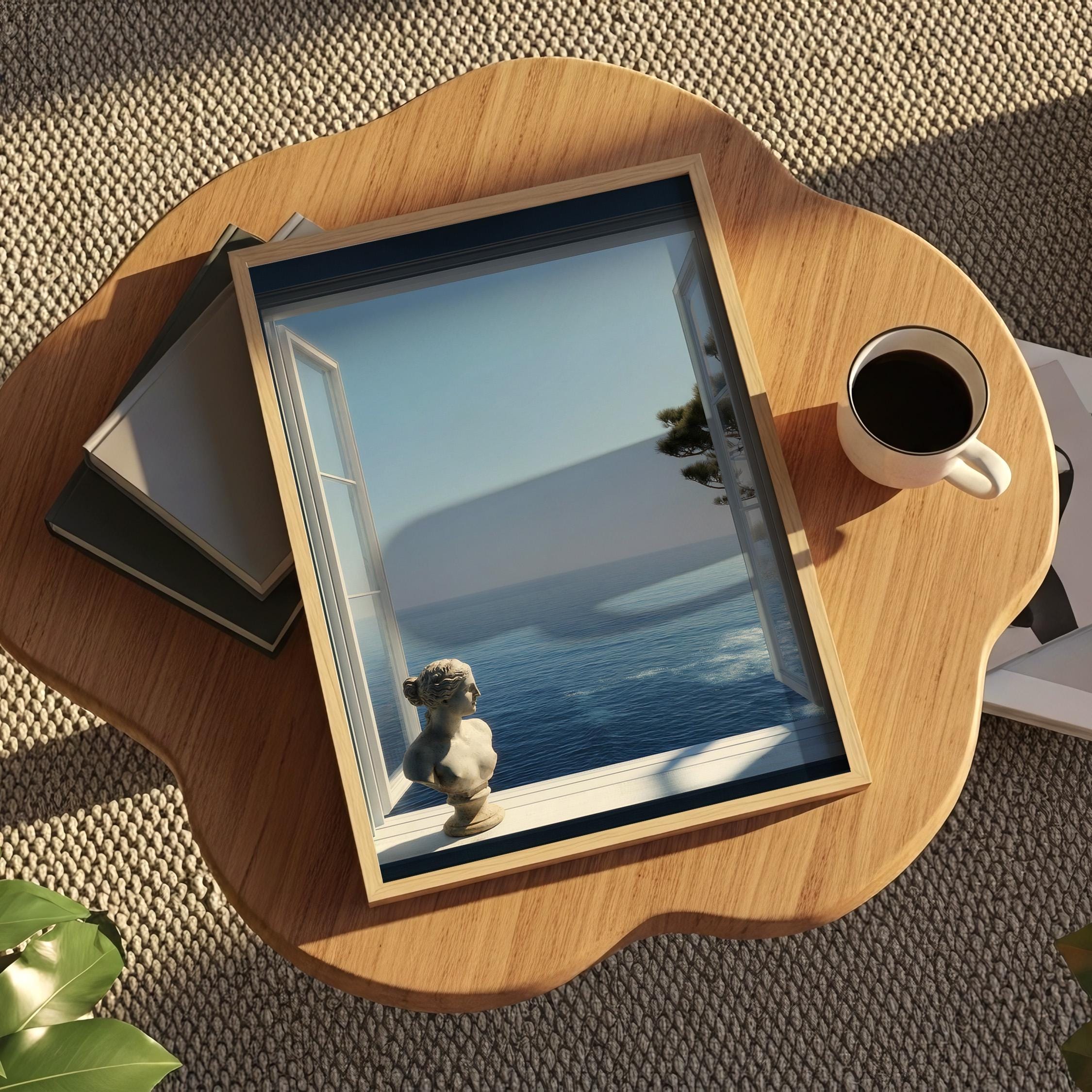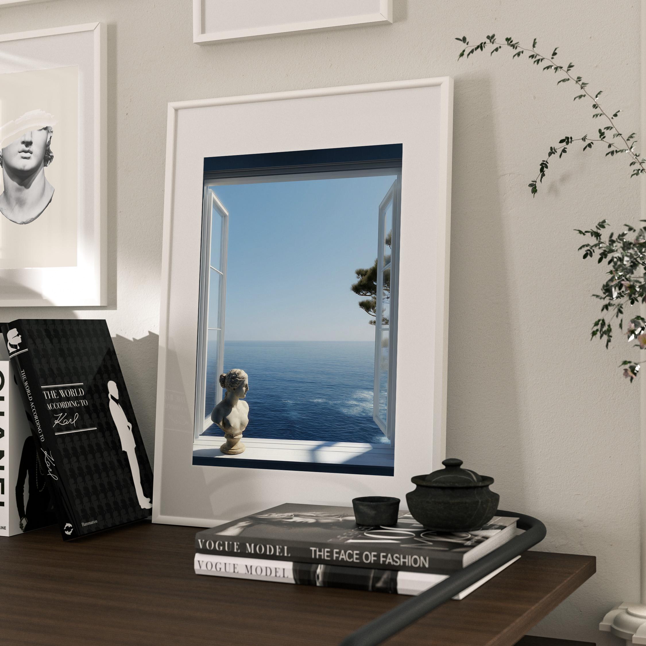 Transform your space with a serene Mediterranean escape. This high-resolution printable art features an open window framing the deep blue Amalfi Coast sea with a subtle classical statue in the foreground—perfect for coastal, minimalist, or modern interiors.