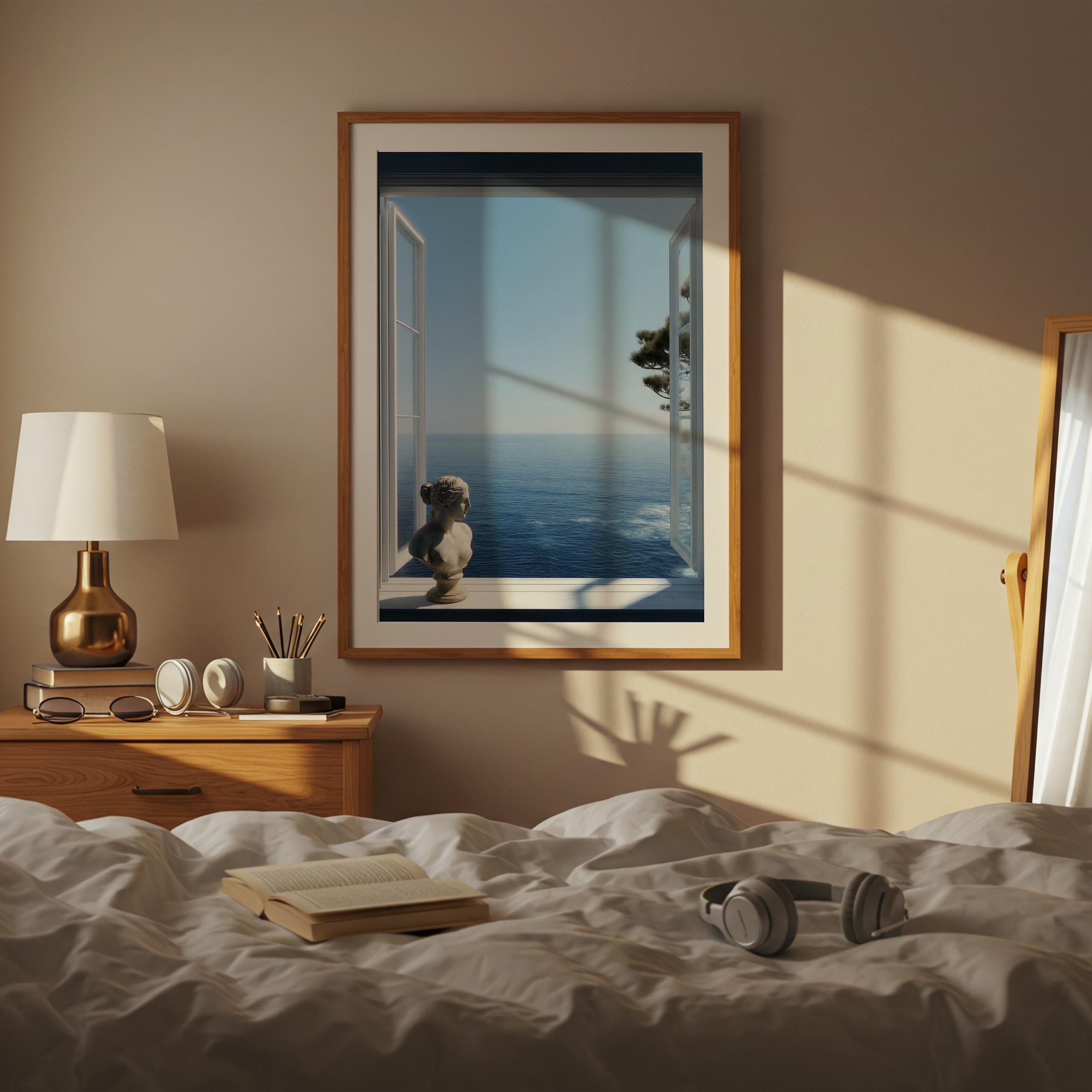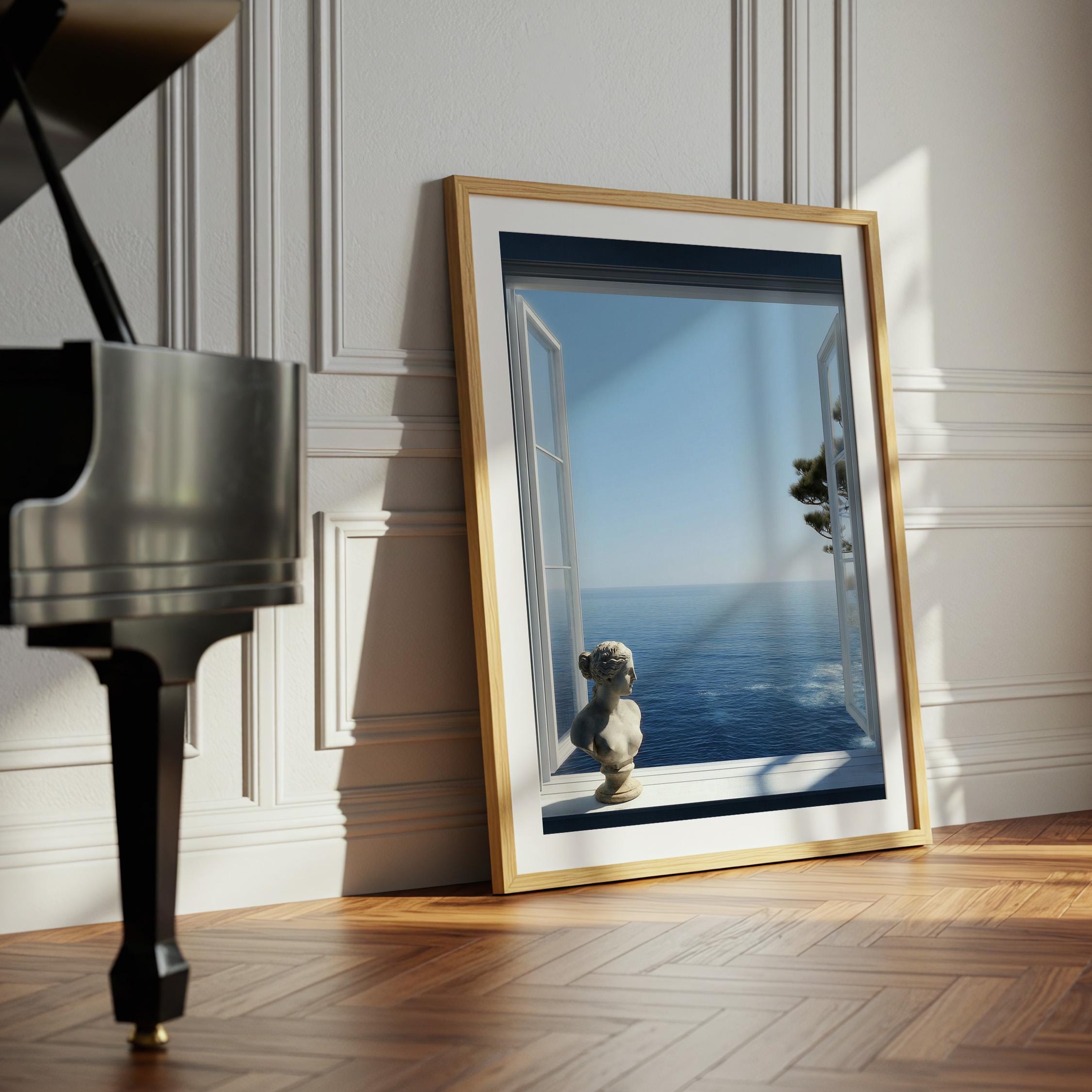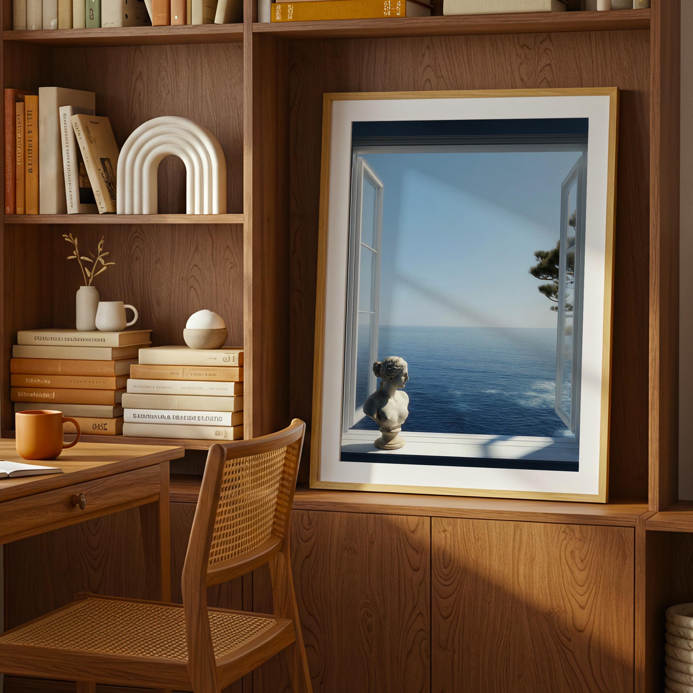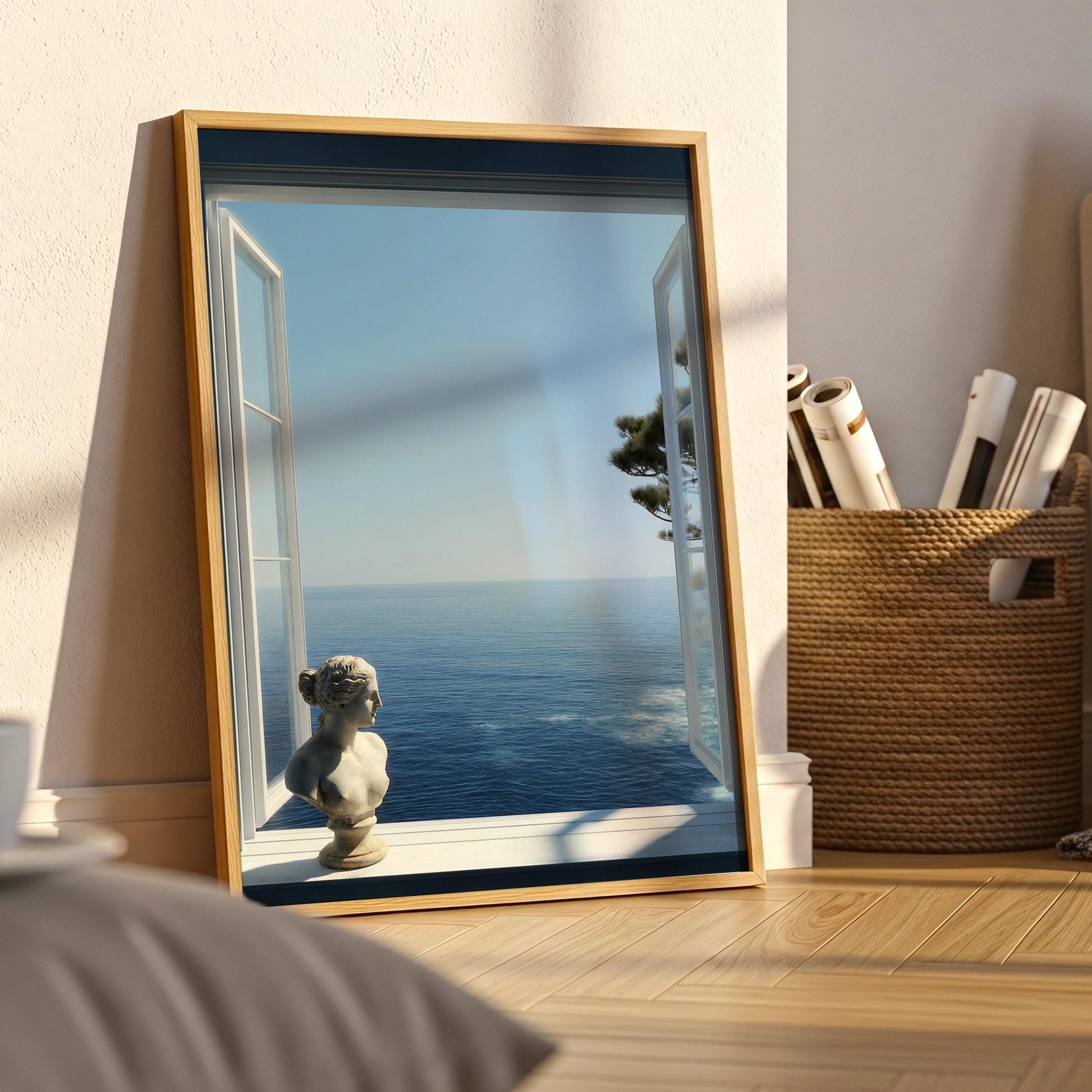 Transform your space with a serene Mediterranean escape. This high-resolution printable art features an open window framing the deep blue Amalfi Coast sea with a subtle classical statue in the foreground—perfect for coastal, minimalist, or modern interiors.