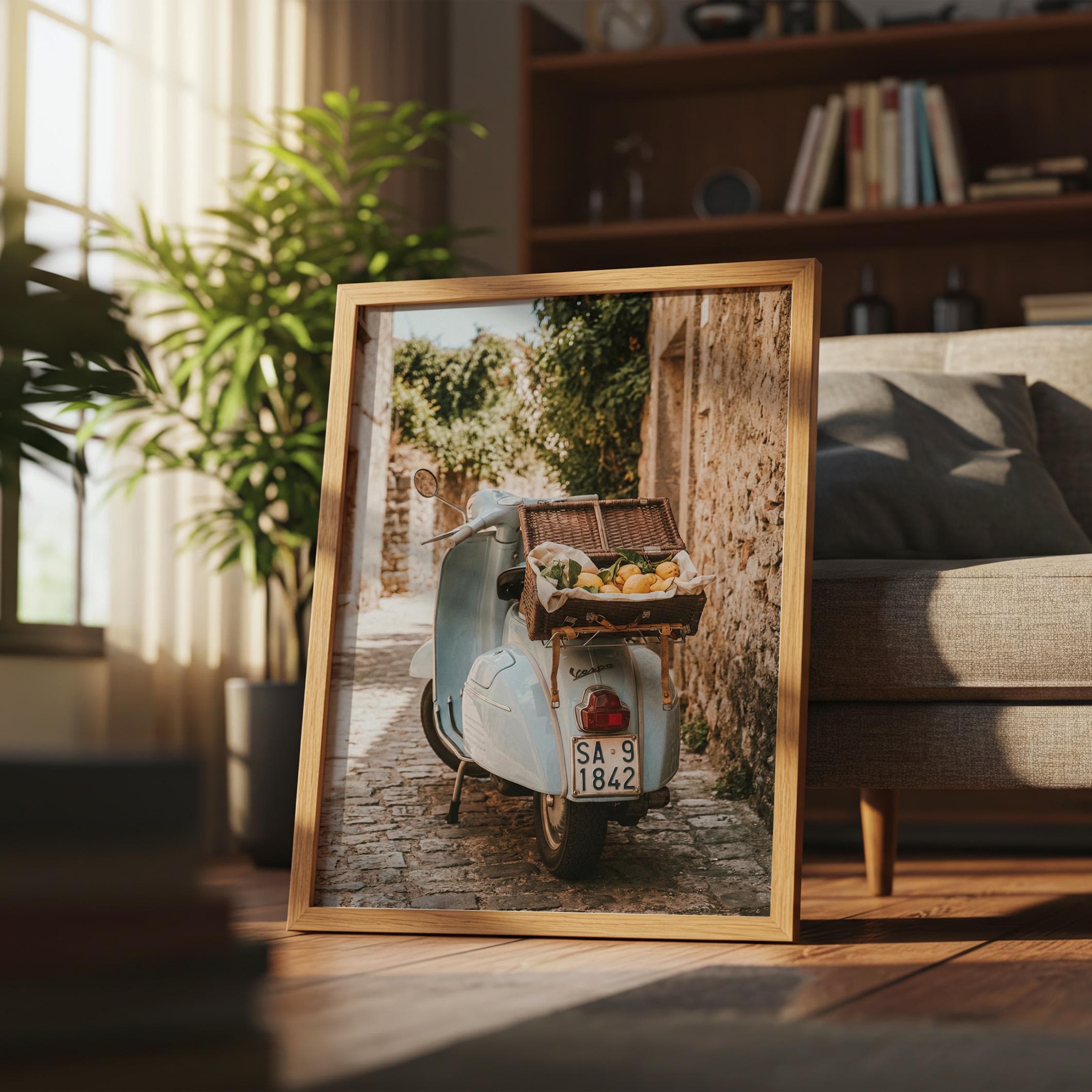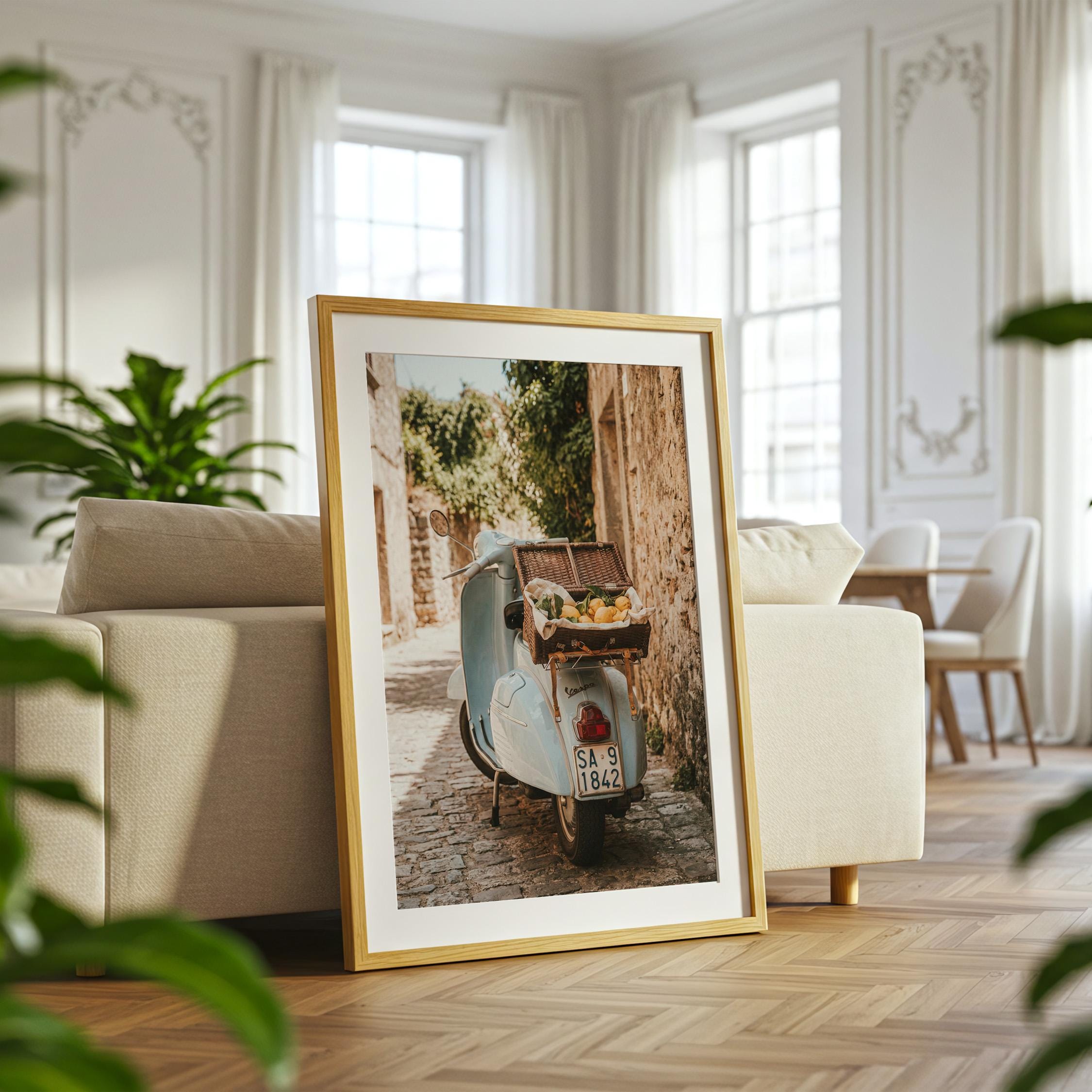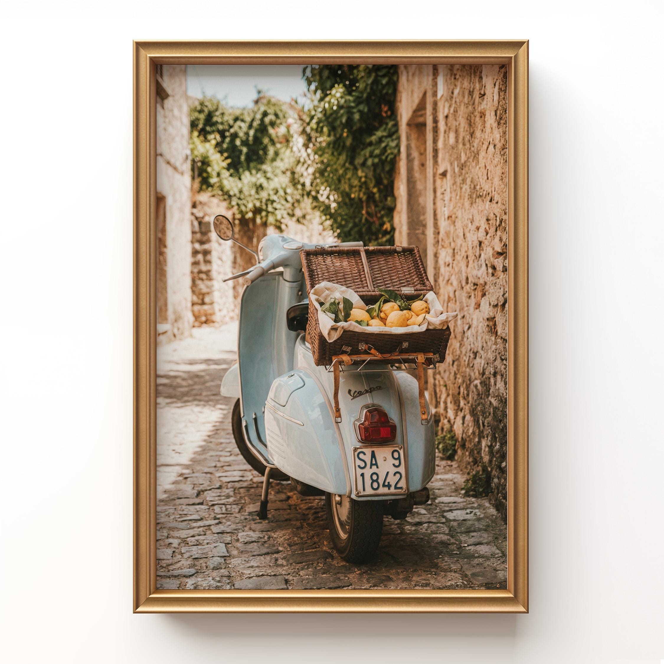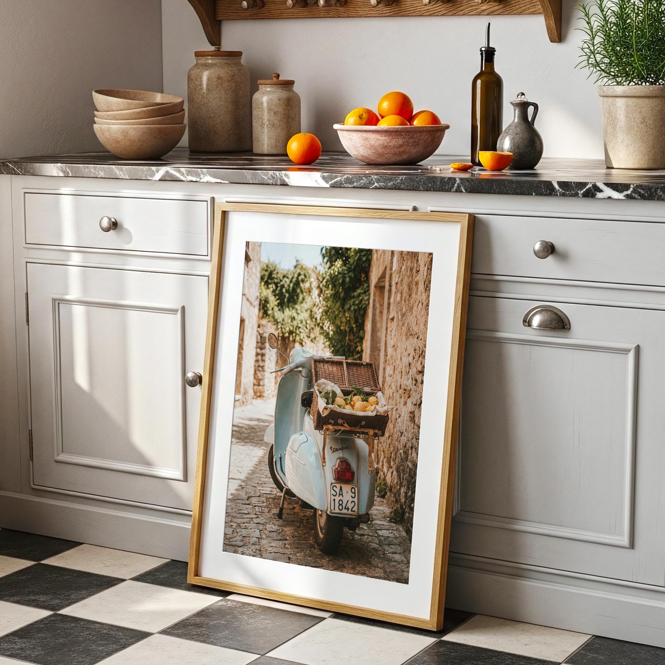 Bring home la dolce vita with this printable wall art featuring a vintage light-blue scooter carrying a wicker basket of fresh lemons along a sunlit stone lane on Italy’s Amalfi Coast. Perfect for Mediterranean kitchen decor, rustic farmhouse styling, or anyone dreaming of slow living and Italian summer vibes.