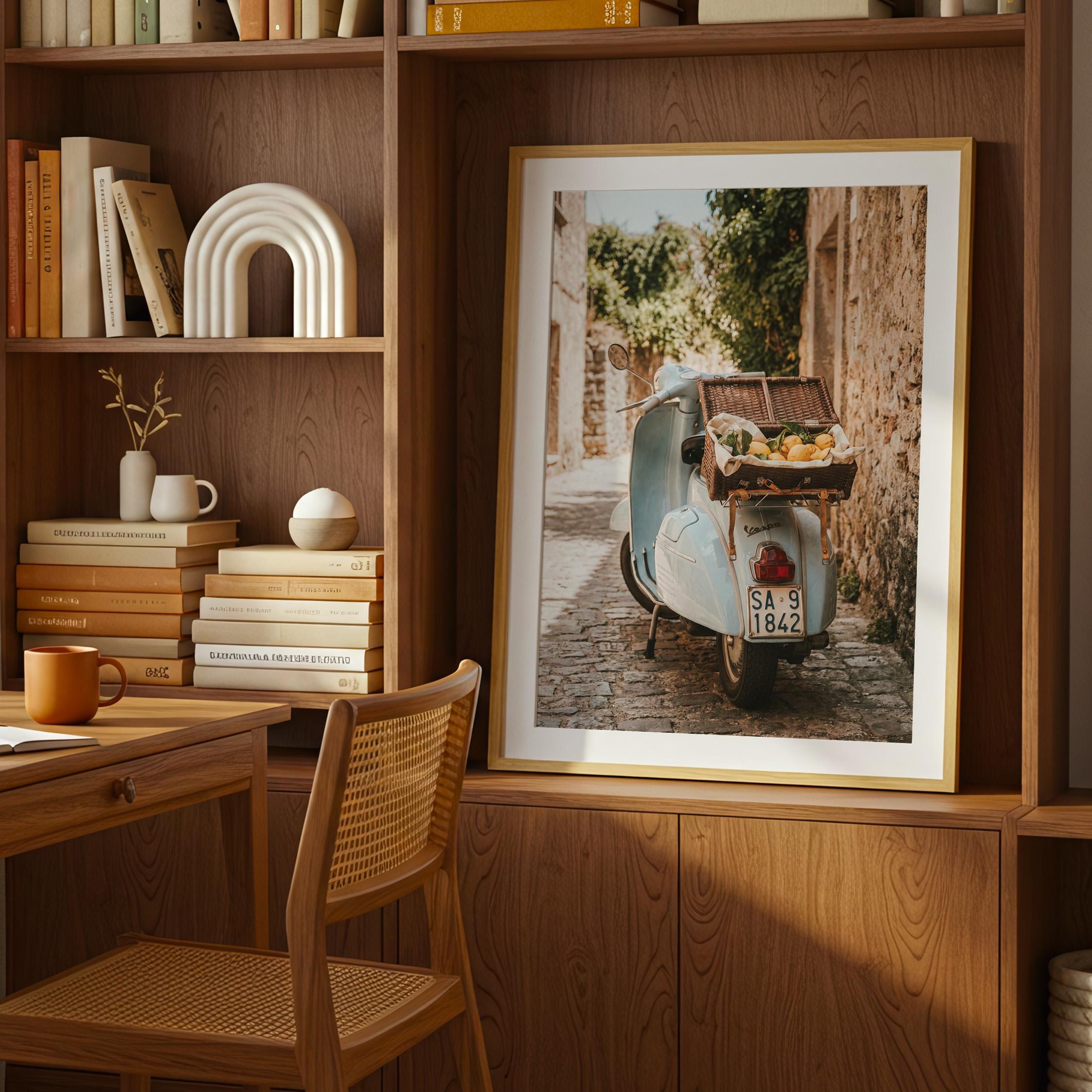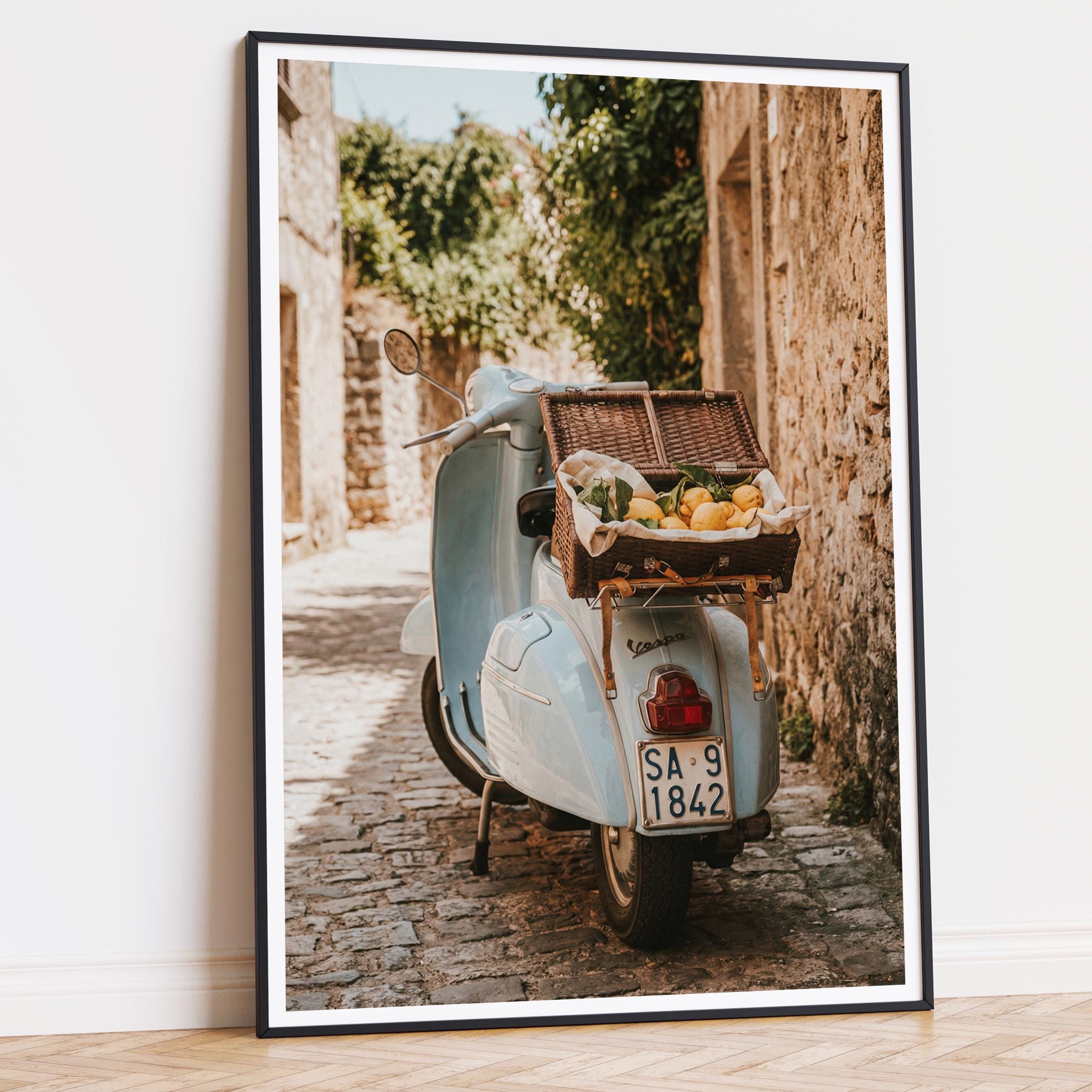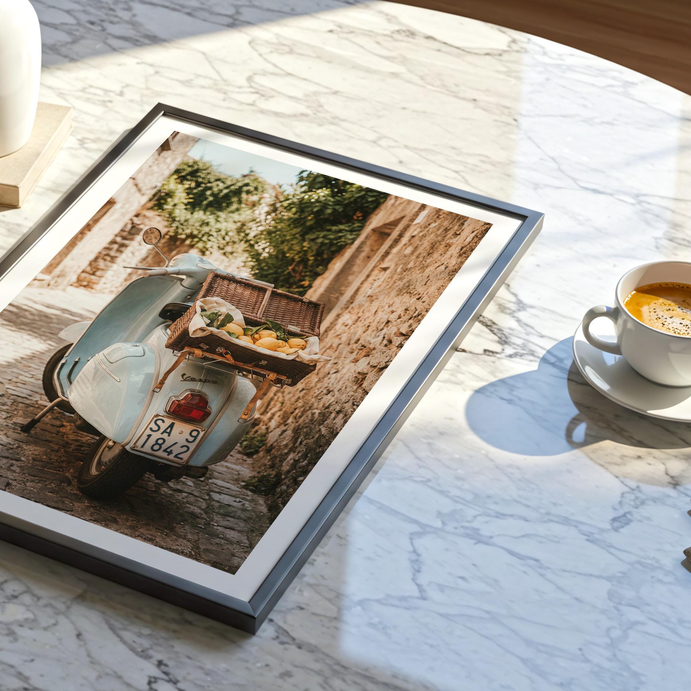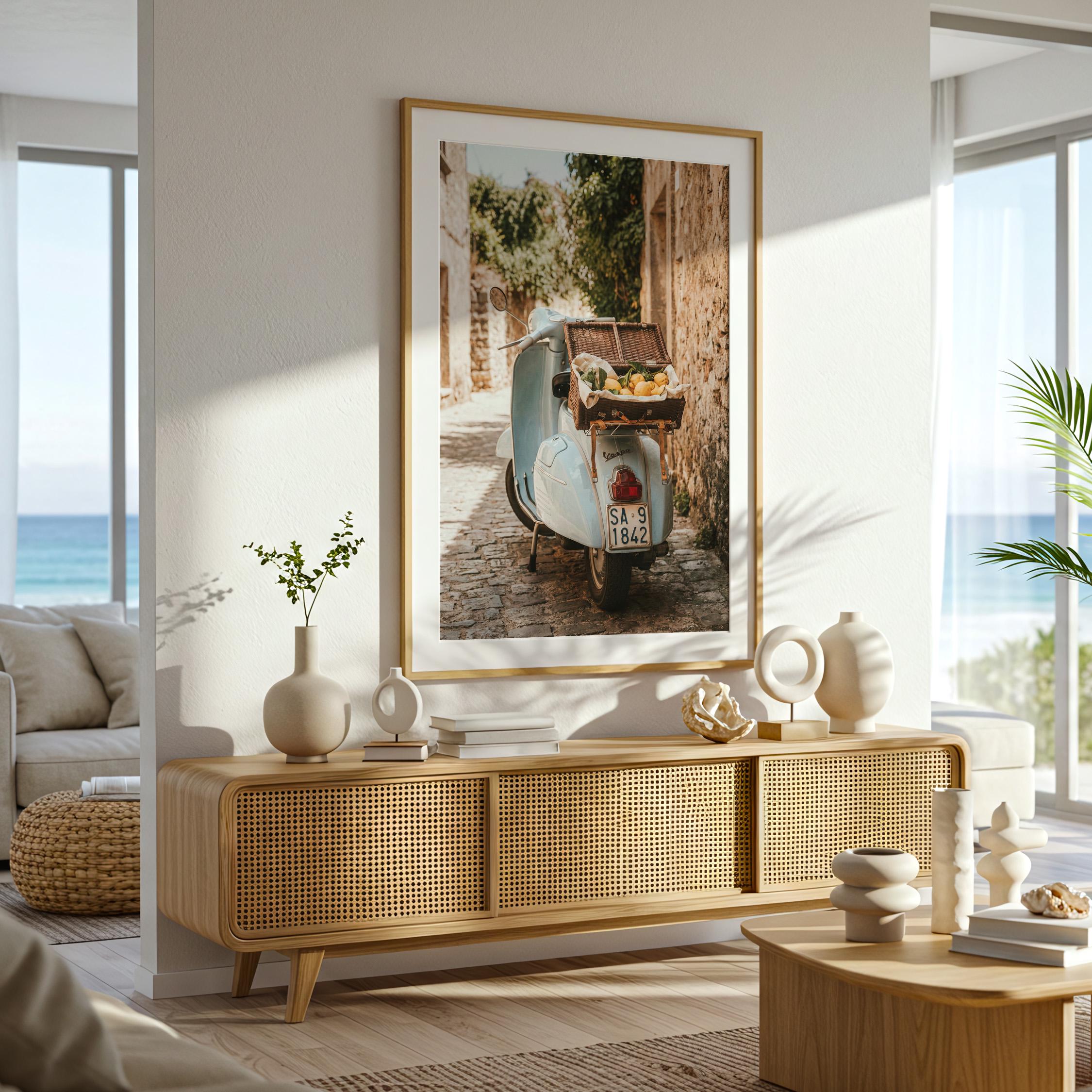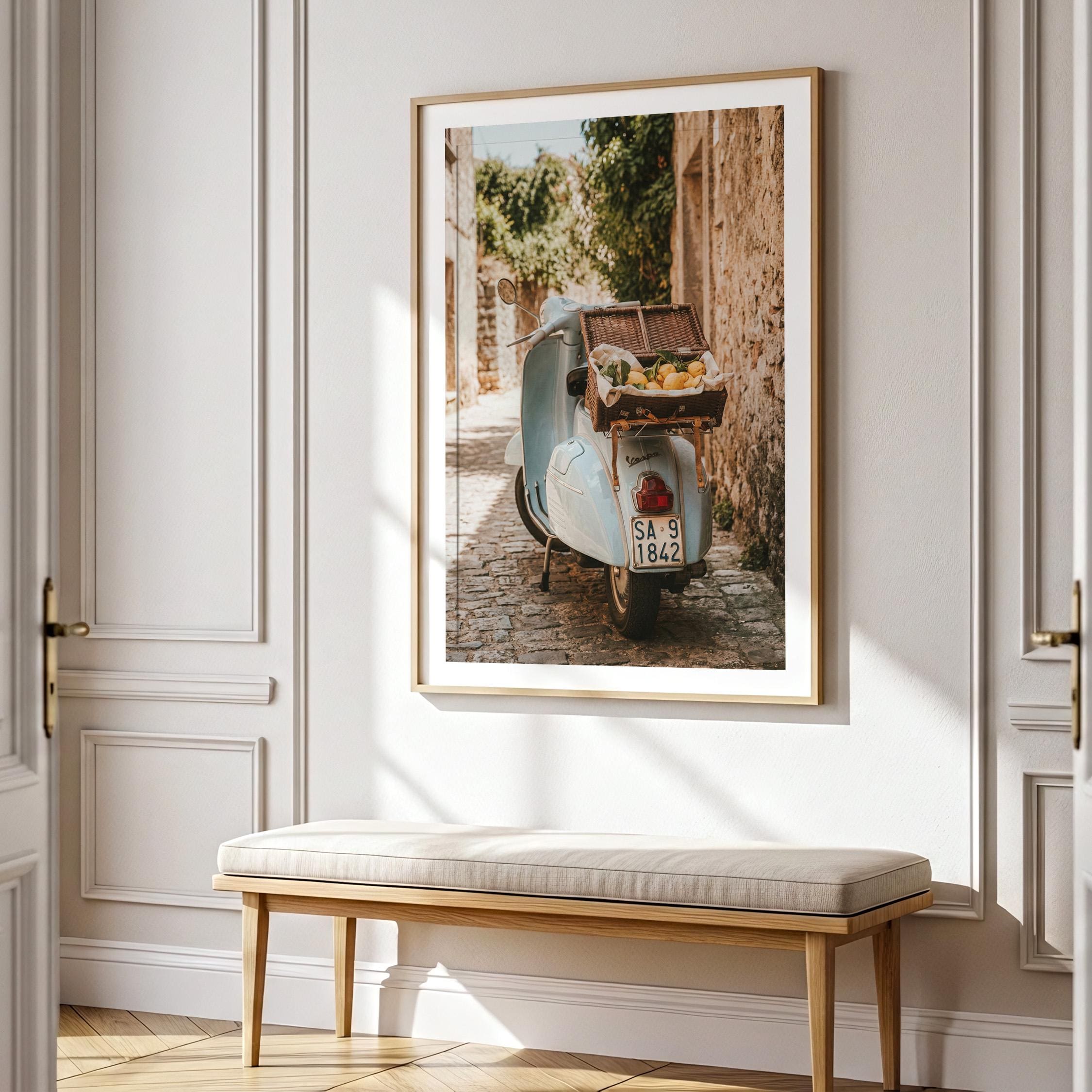 Bring home la dolce vita with this printable wall art featuring a vintage light-blue scooter carrying a wicker basket of fresh lemons along a sunlit stone lane on Italy’s Amalfi Coast. Perfect for Mediterranean kitchen decor, rustic farmhouse styling, or anyone dreaming of slow living and Italian summer vibes.