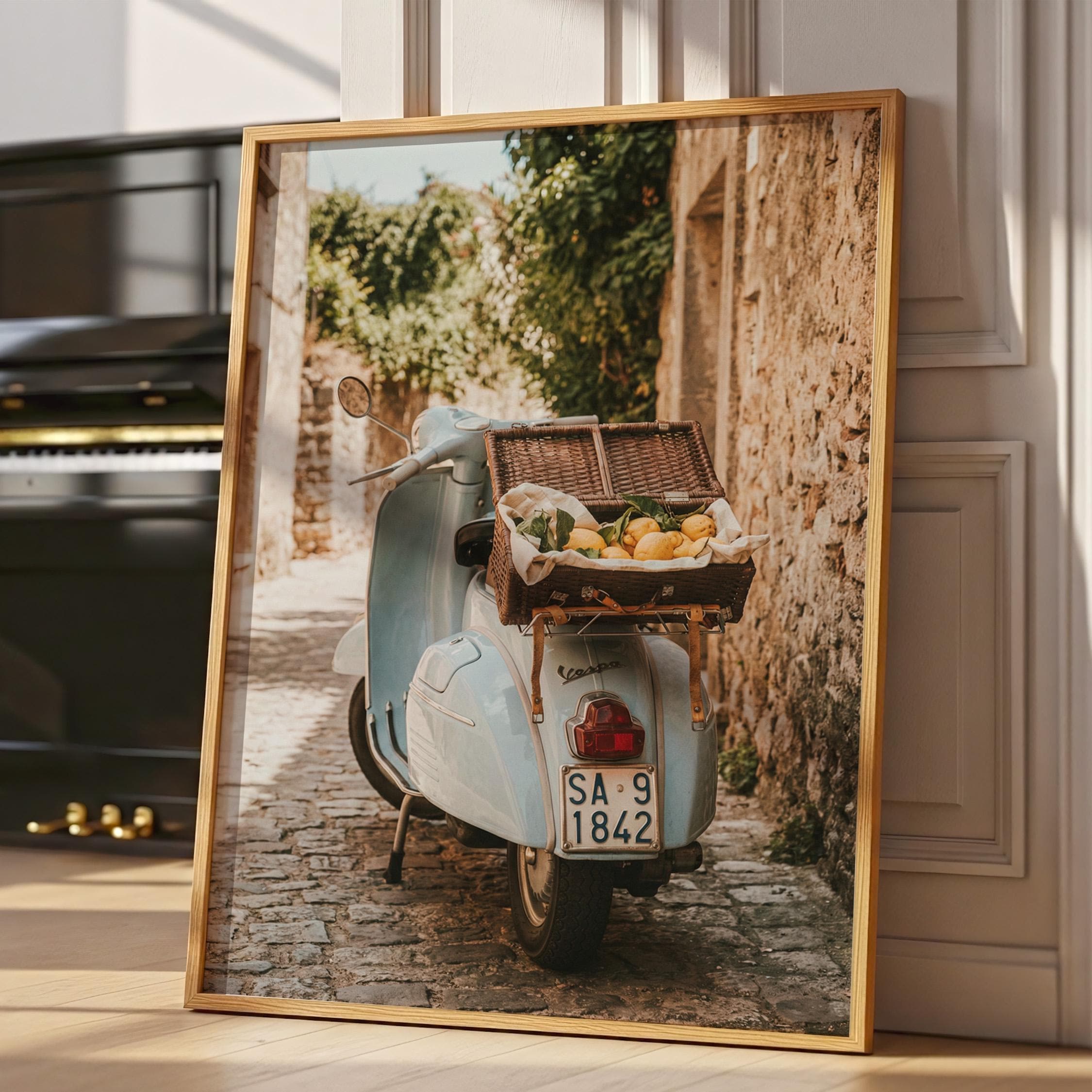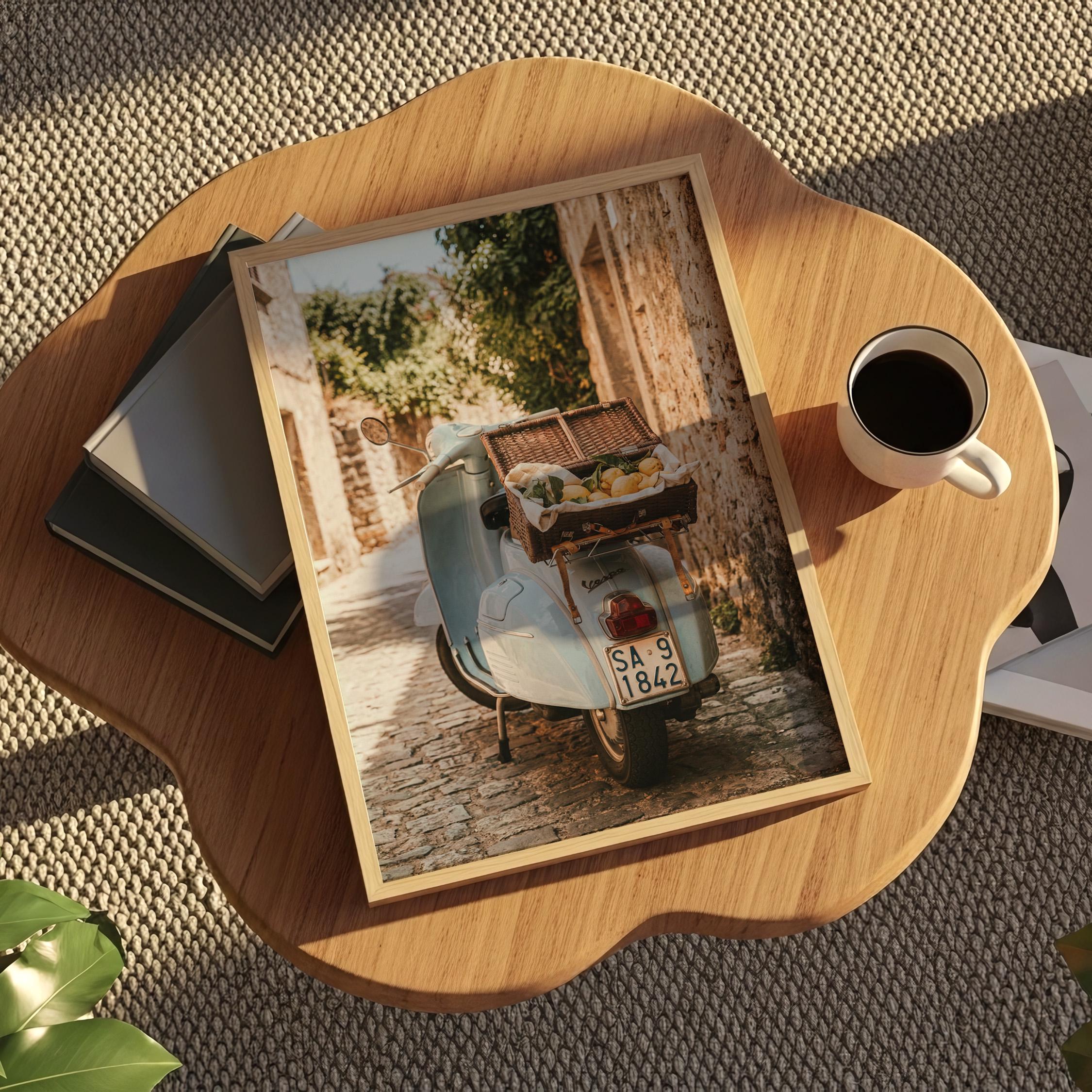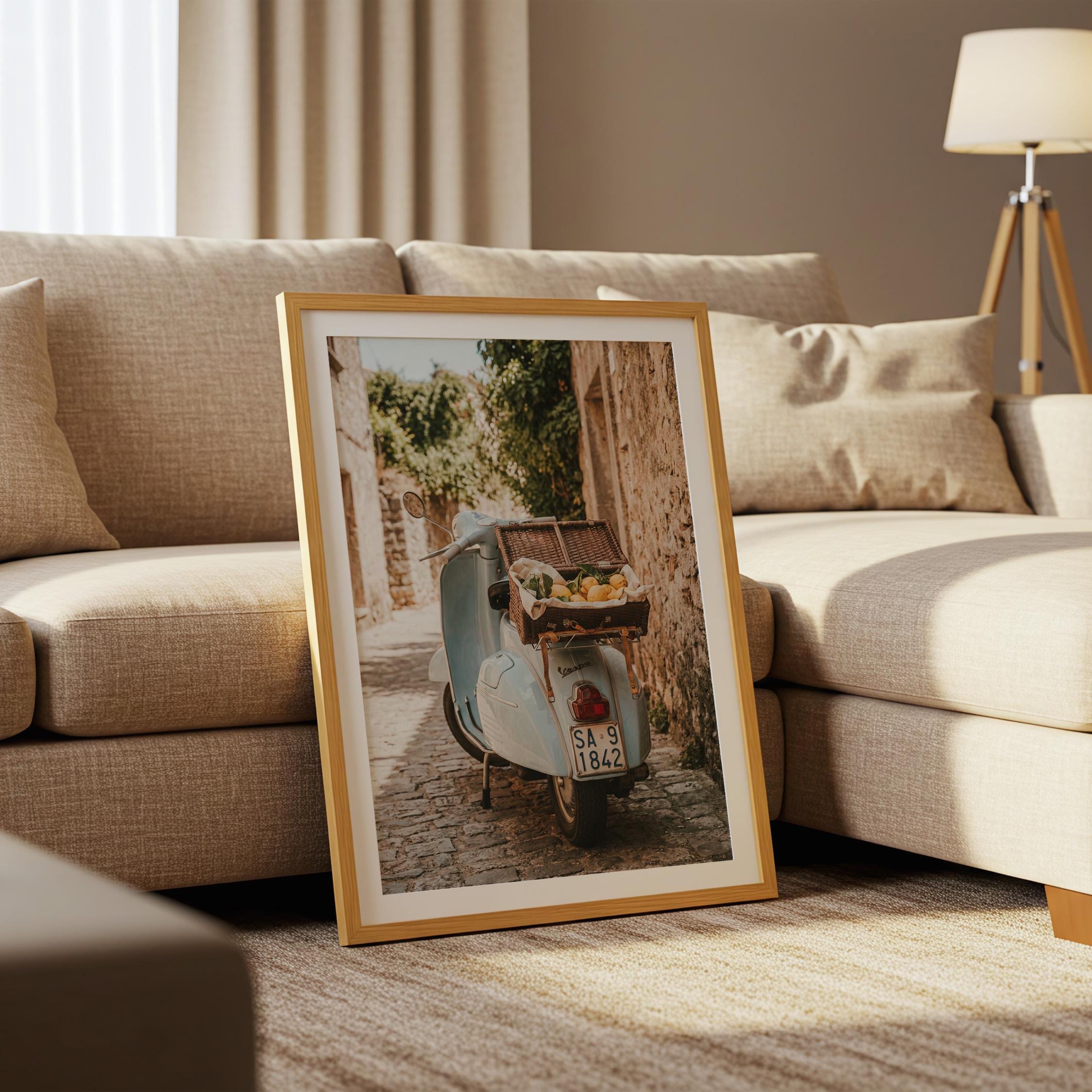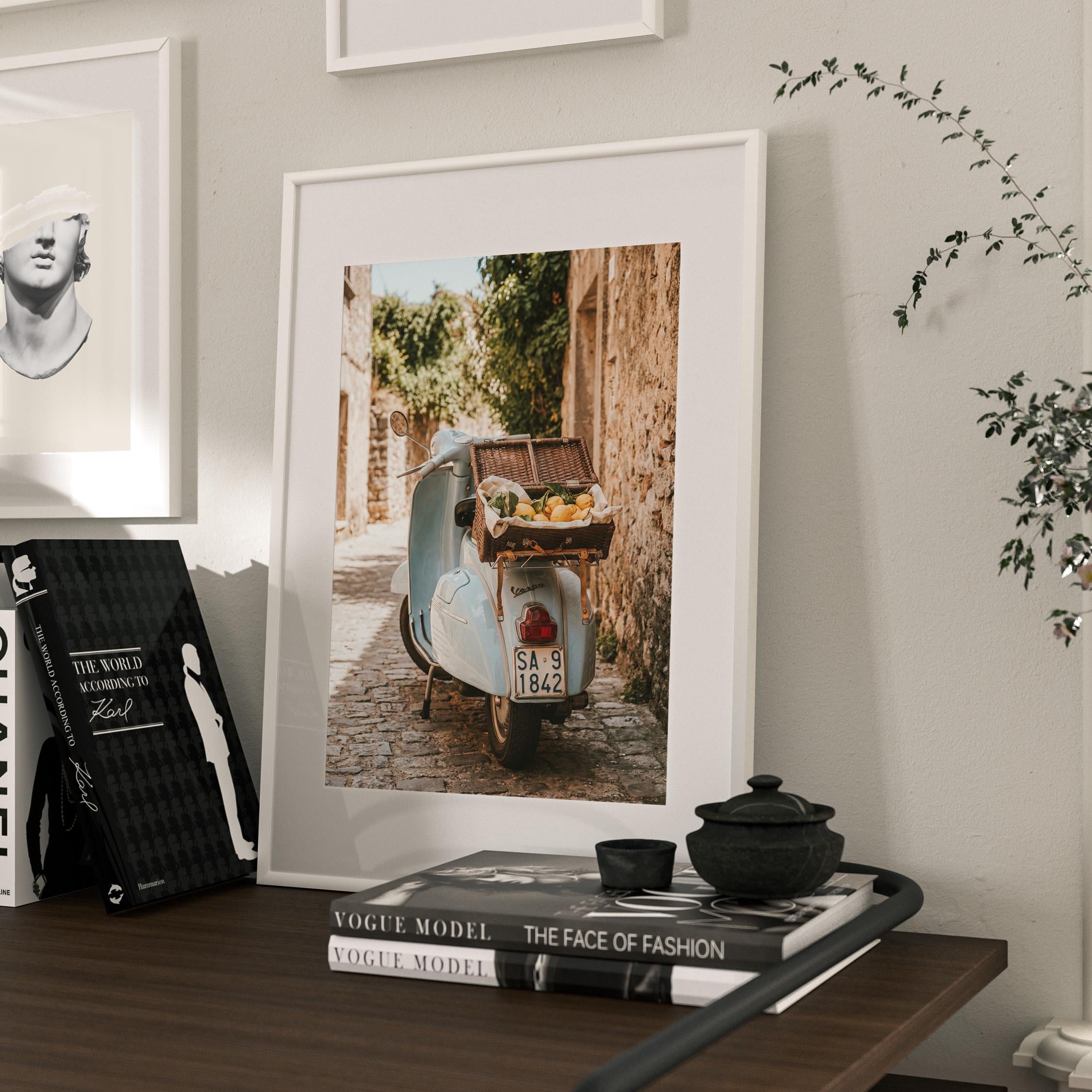 Bring home la dolce vita with this printable wall art featuring a vintage light-blue scooter carrying a wicker basket of fresh lemons along a sunlit stone lane on Italy’s Amalfi Coast. Perfect for Mediterranean kitchen decor, rustic farmhouse styling, or anyone dreaming of slow living and Italian summer vibes.