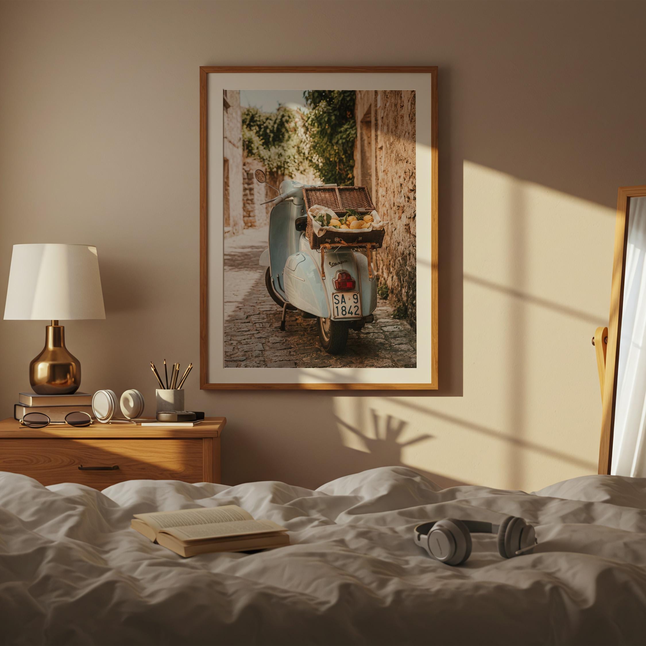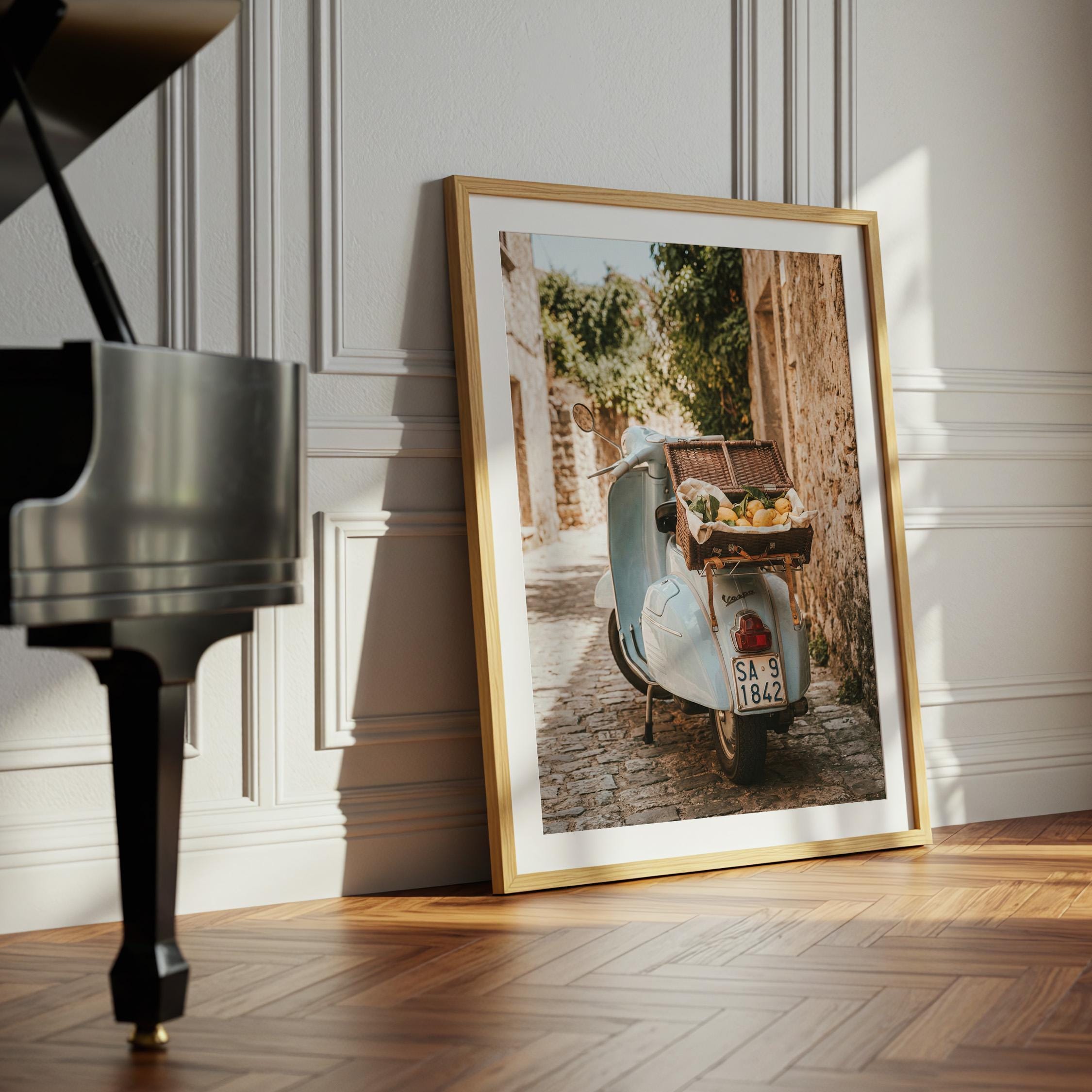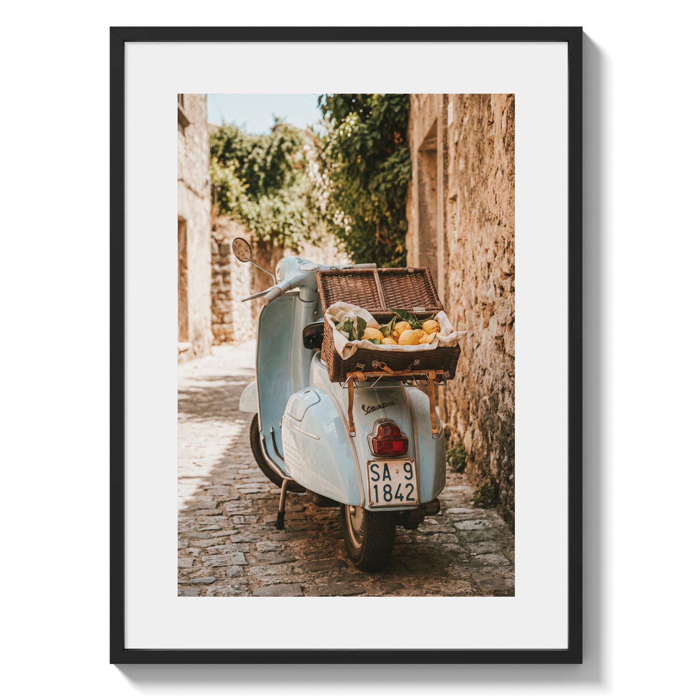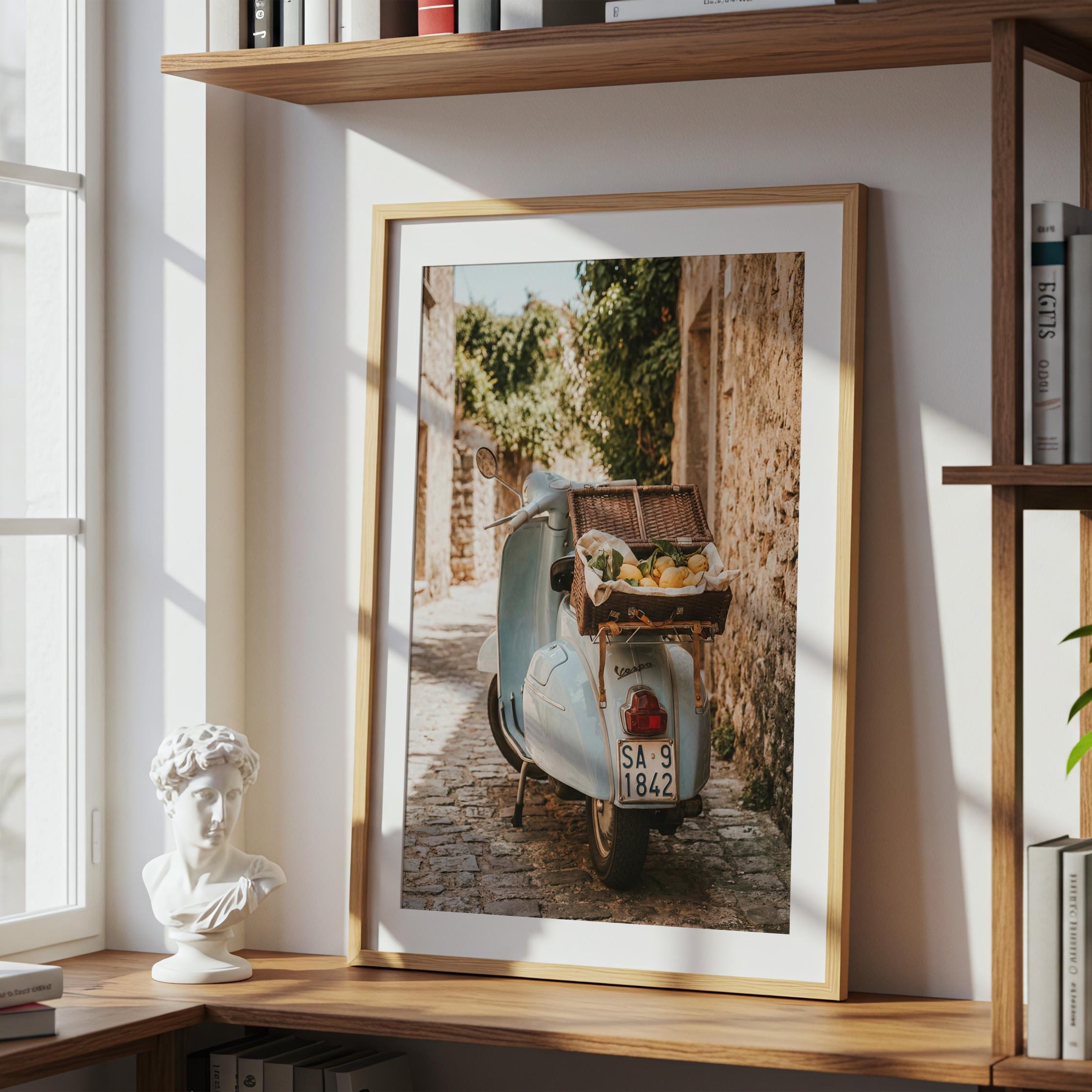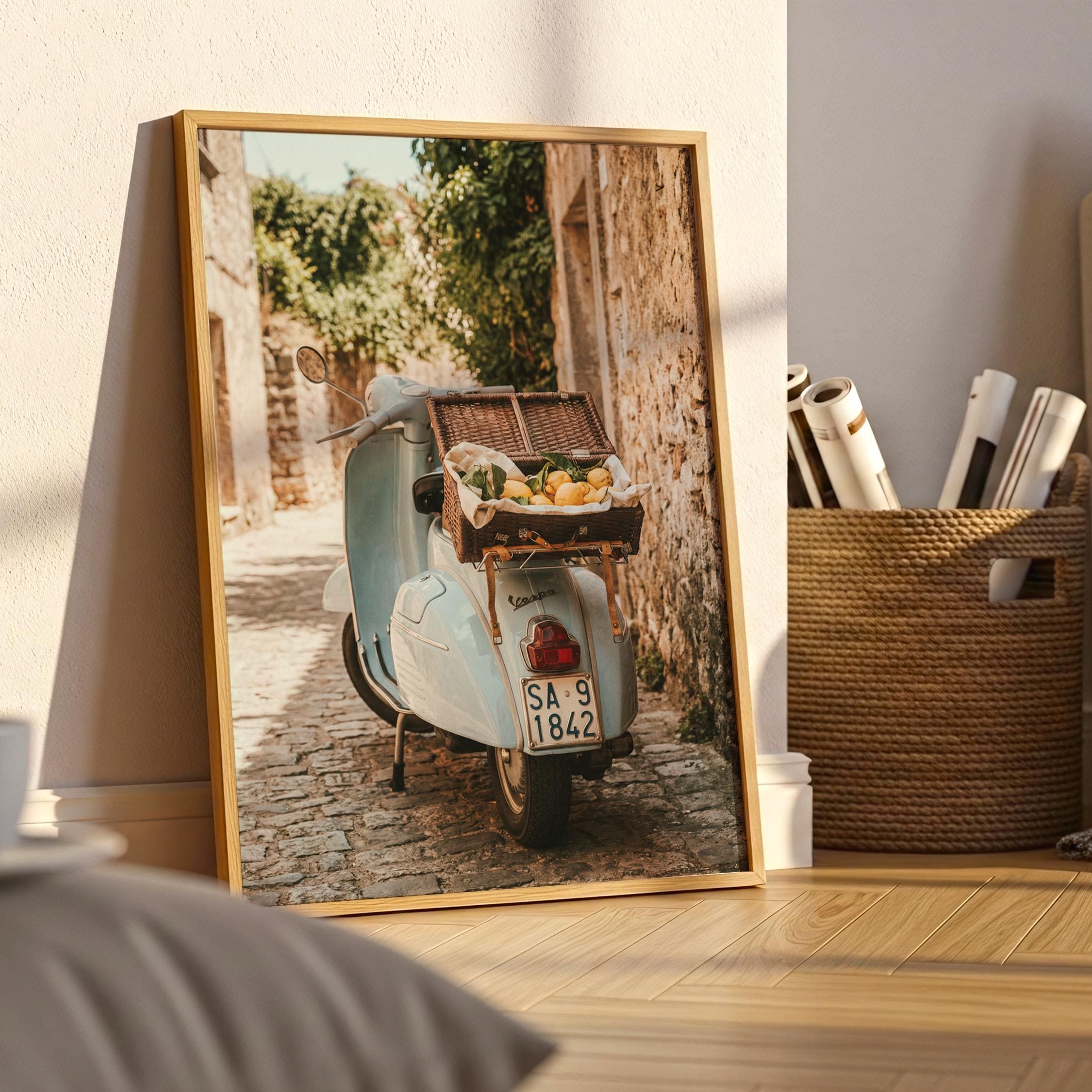 Bring home la dolce vita with this printable wall art featuring a vintage light-blue scooter carrying a wicker basket of fresh lemons along a sunlit stone lane on Italy’s Amalfi Coast. Perfect for Mediterranean kitchen decor, rustic farmhouse styling, or anyone dreaming of slow living and Italian summer vibes.