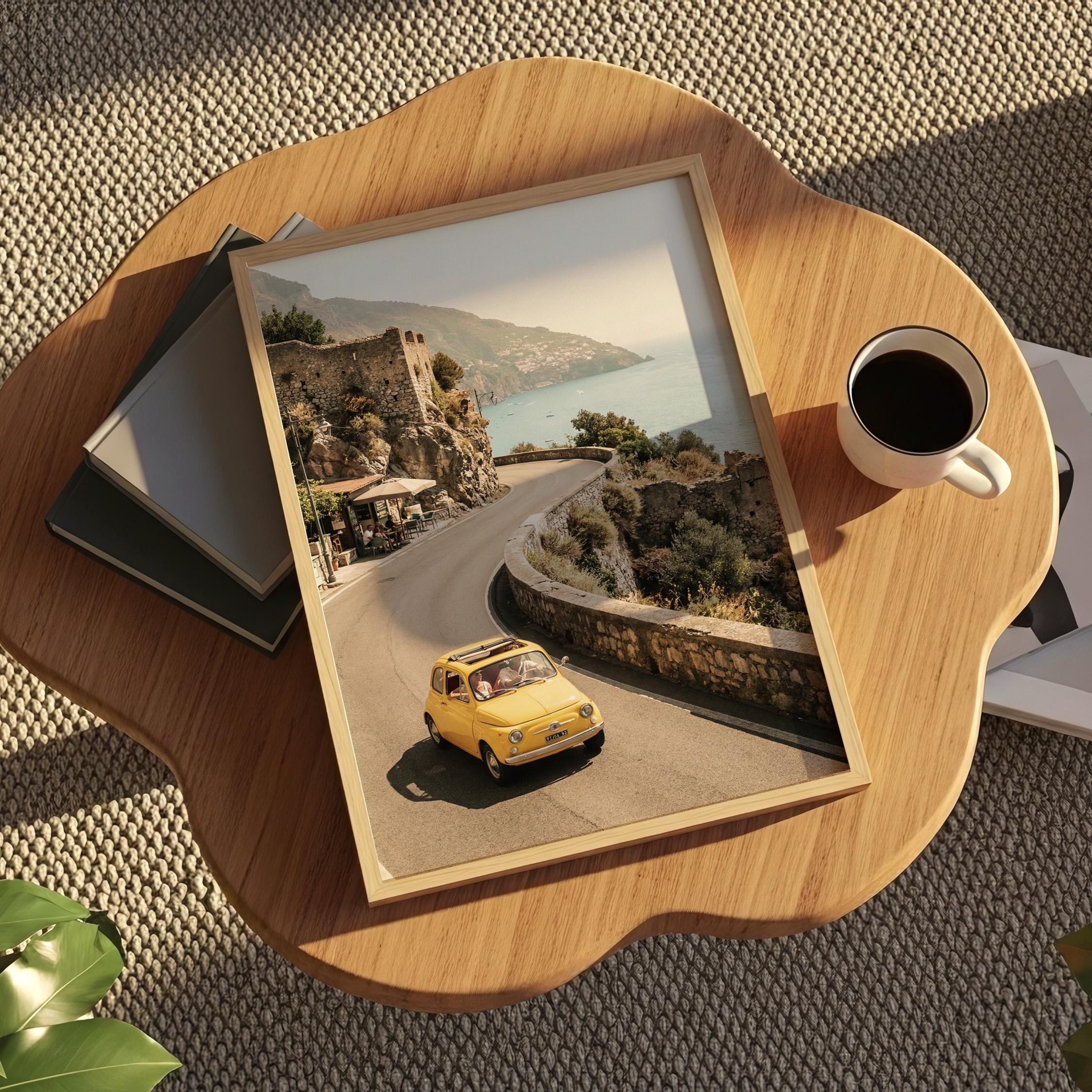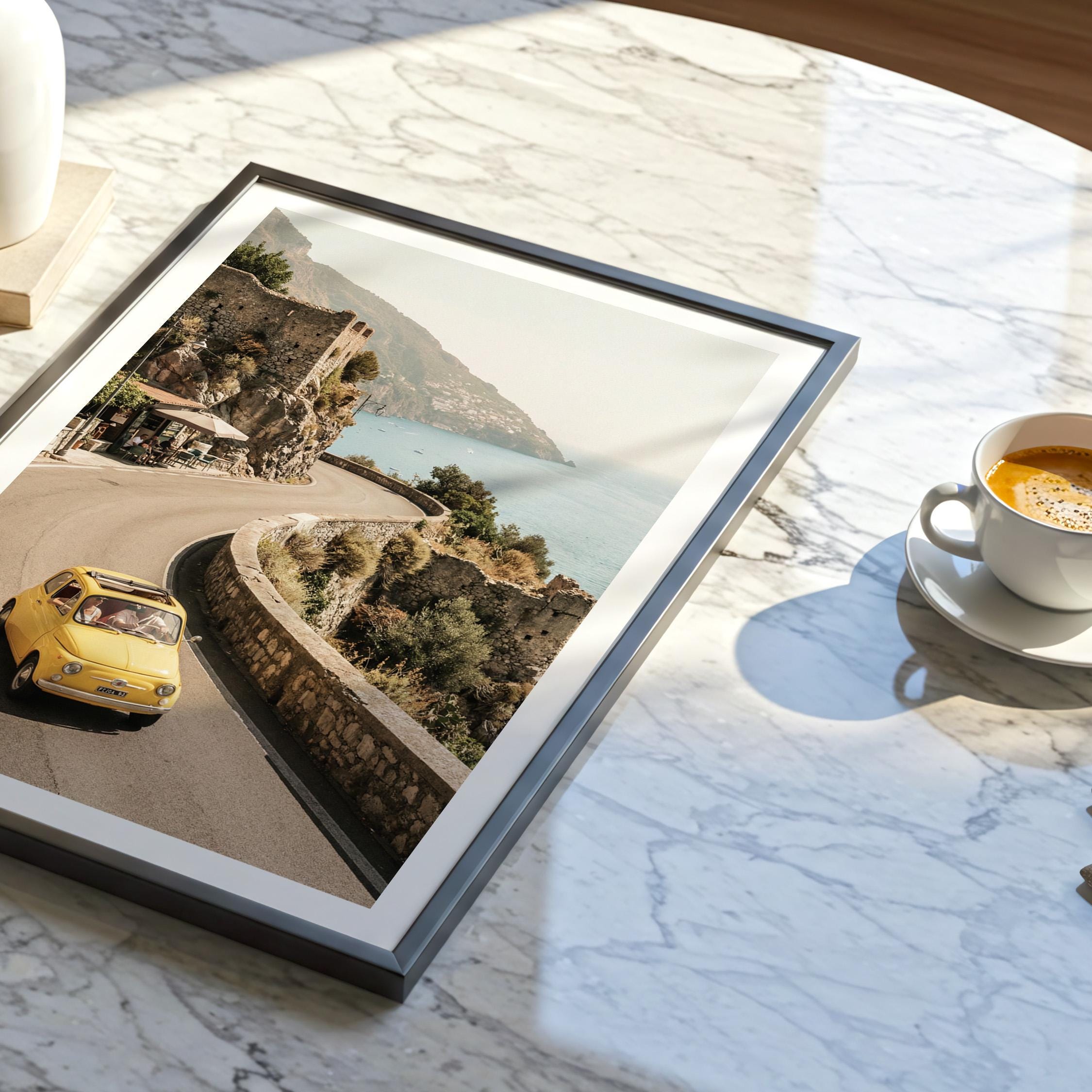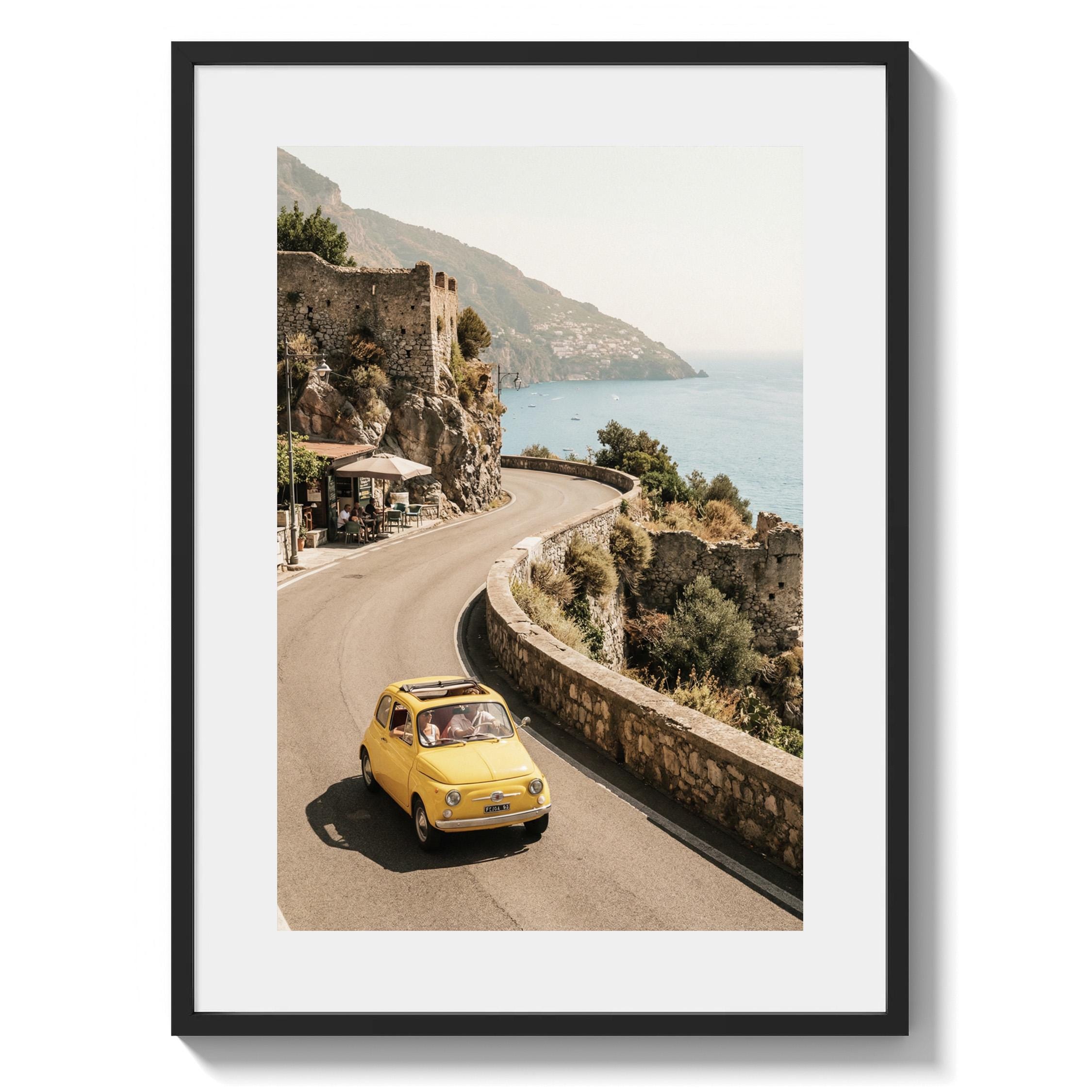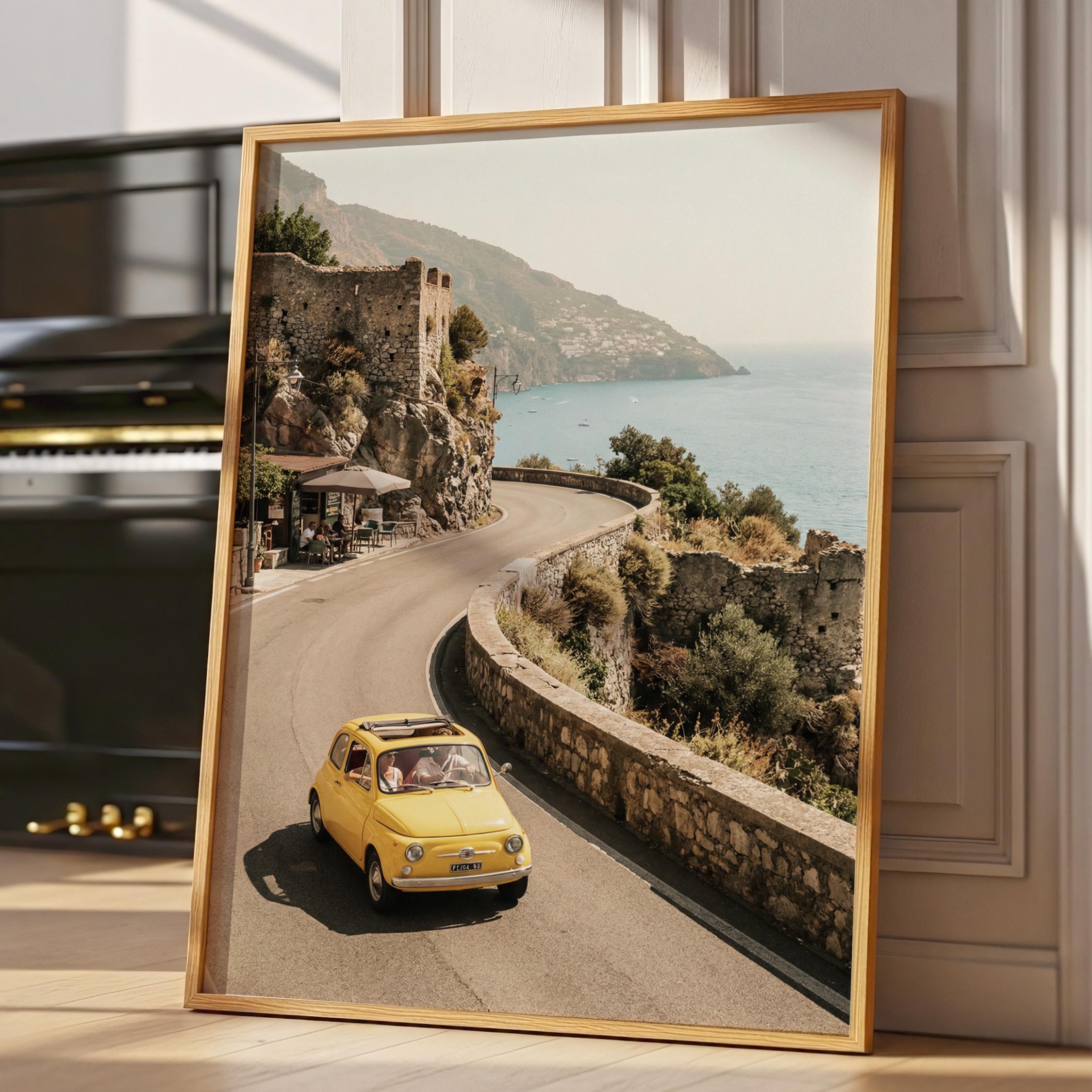 Bring the warmth of the Amalfi Coast into your space with this Italian summer wall art printable. Featuring a classic yellow Fiat 500 driving along a sunlit coastal road, this piece captures the feeling of slow travel, sea air, and Mediterranean freedom.