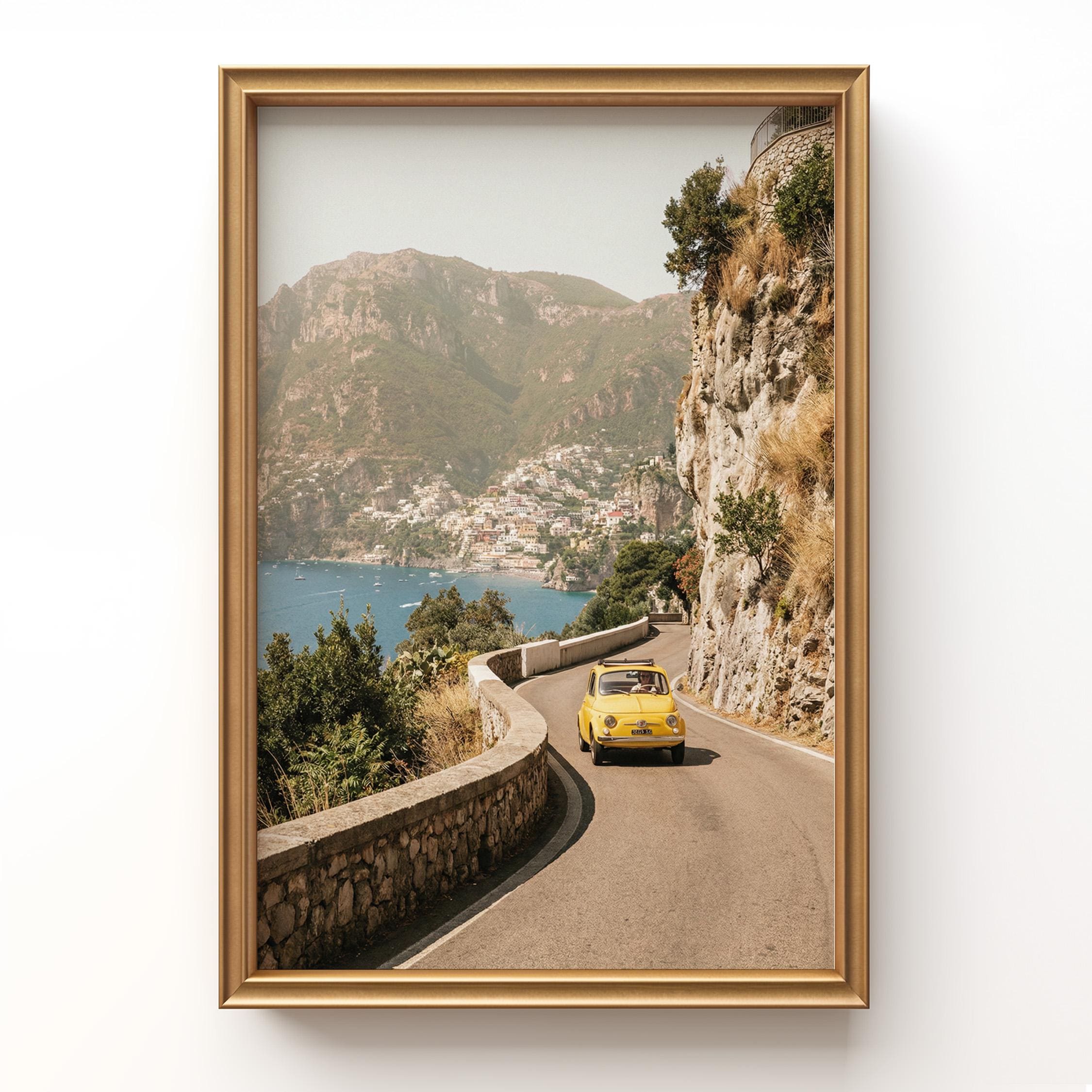 Capture the beauty of the Amalfi Coast with this Italian wall art printable featuring a classic yellow Fiat 500 driving along a dramatic coastal road. The winding cliffs, blue Mediterranean sea, and hillside village create a timeless Italy travel print full of warmth and movement.