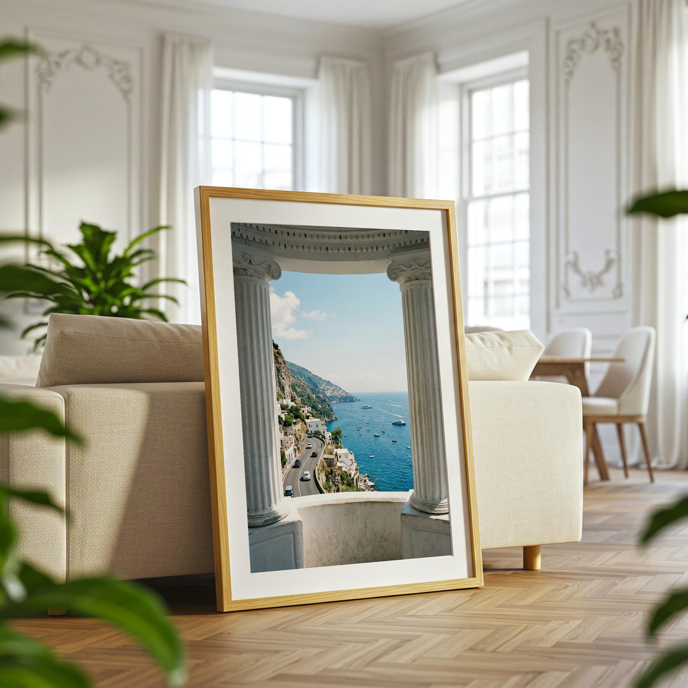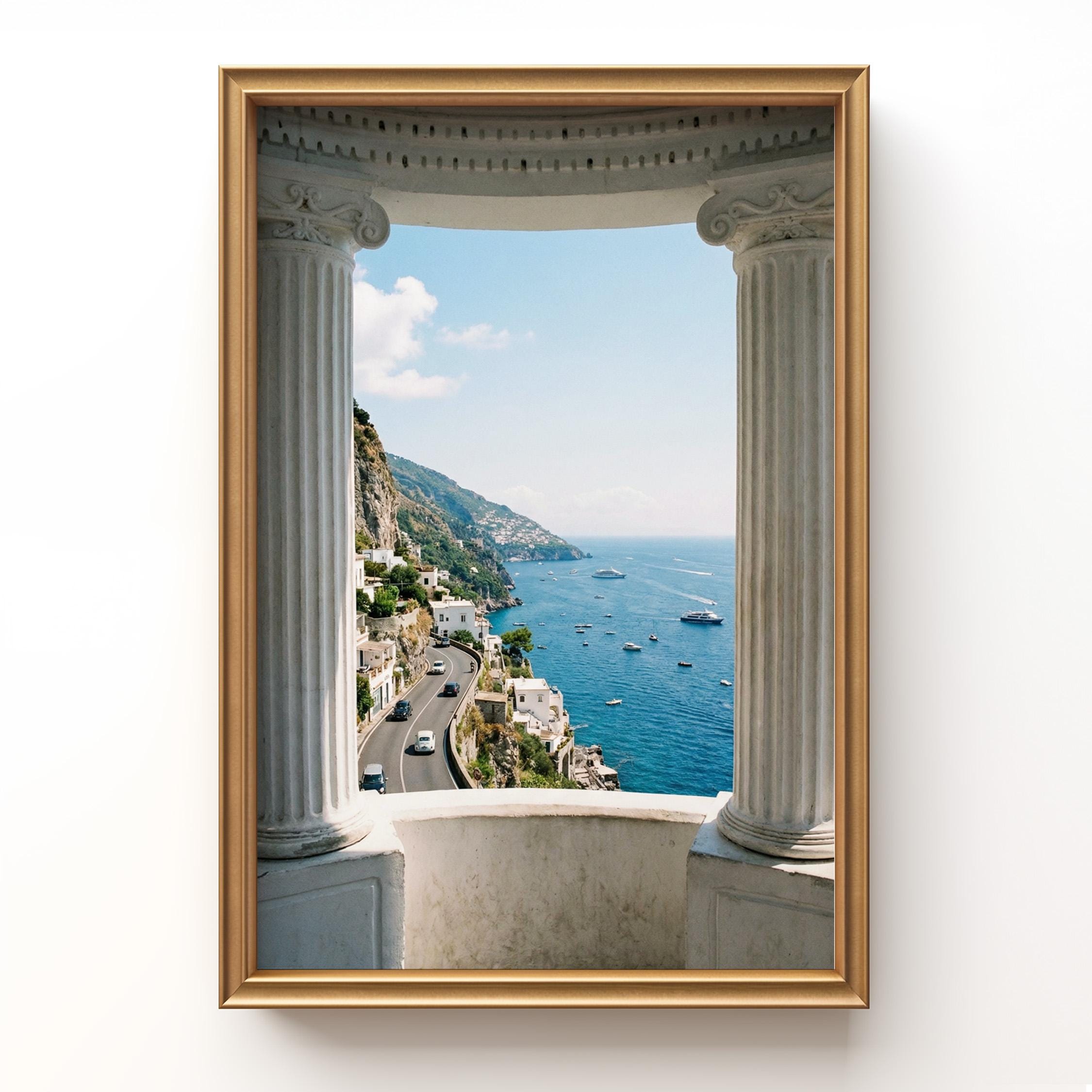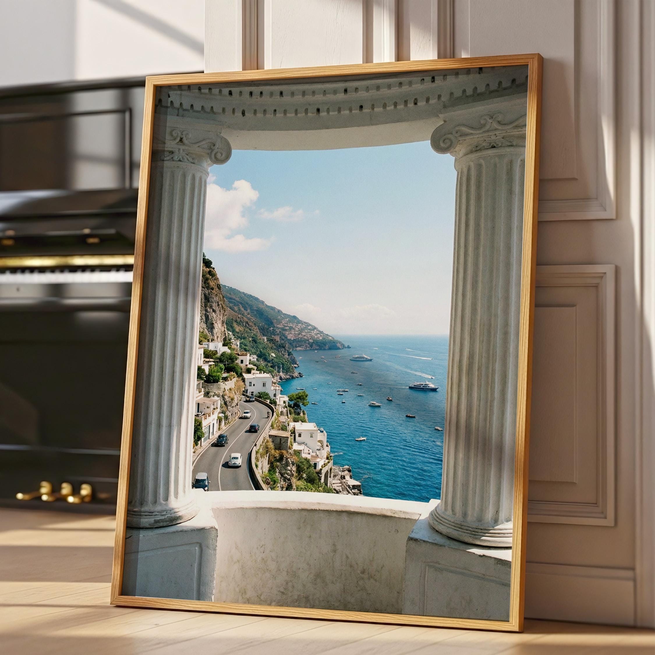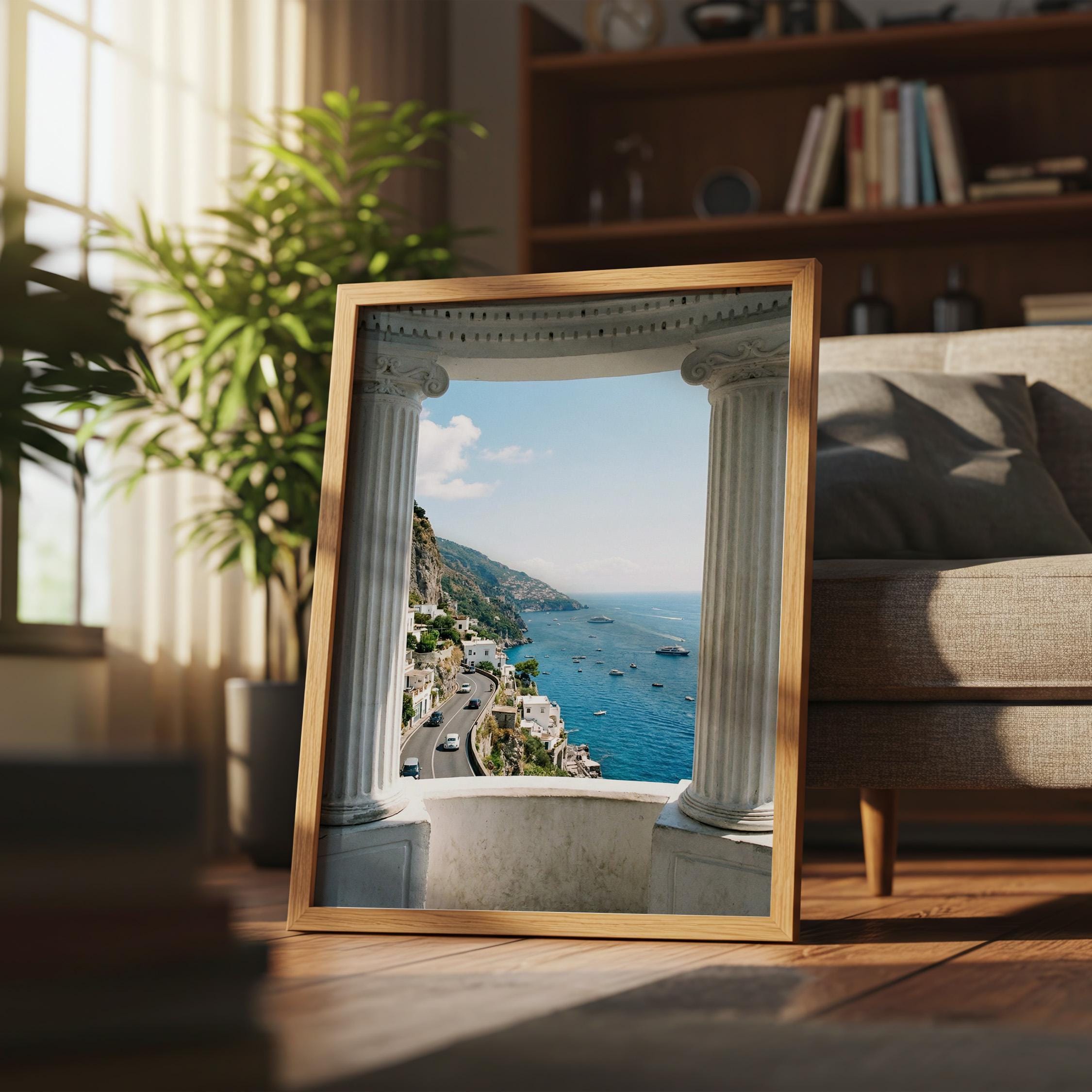 Experience the Amalfi Coast from a timeless architectural perspective. This Amalfi Coast wall art printable captures a sweeping Mediterranean coastal view framed by classical Italian columns, blending history, landscape, and sea into one serene composition.