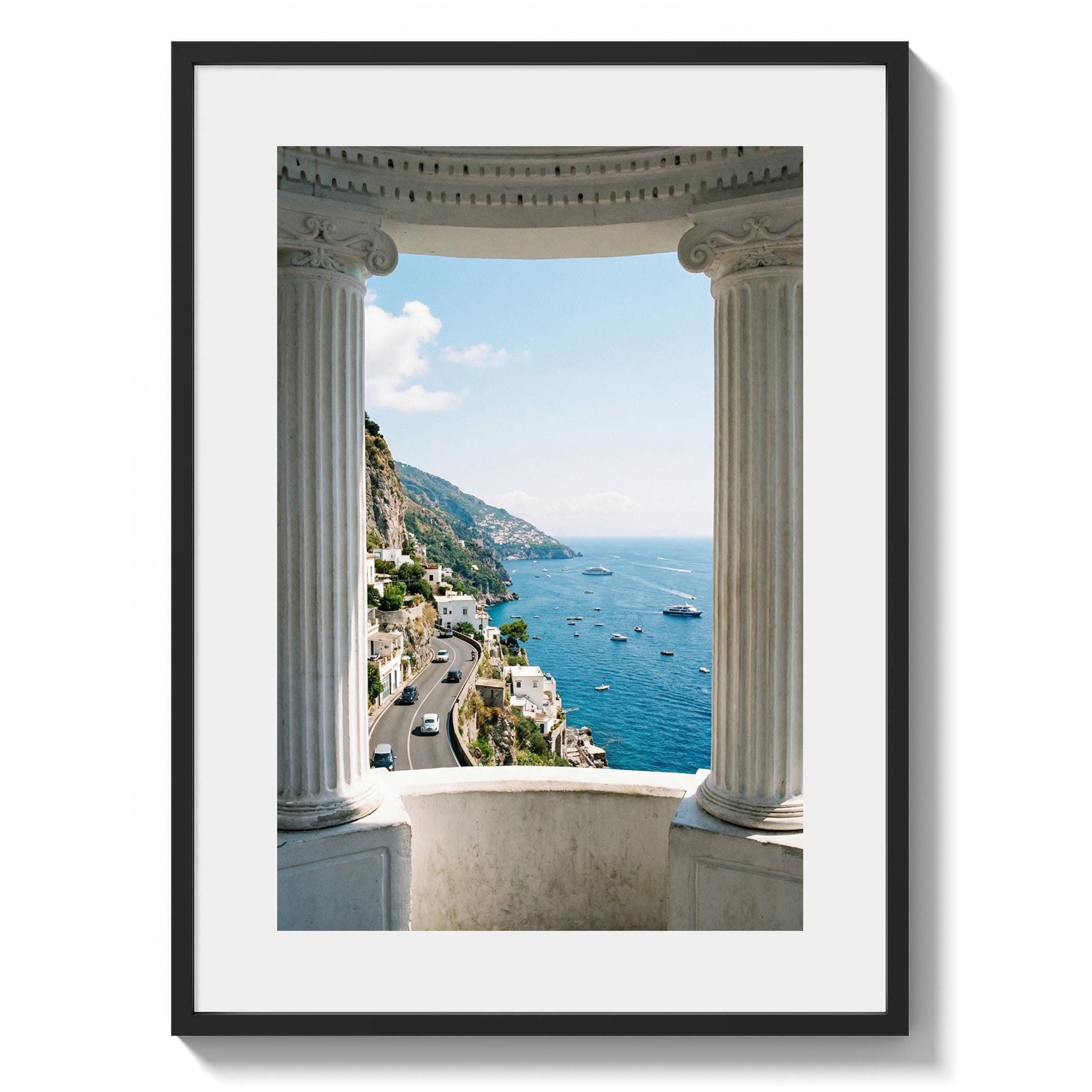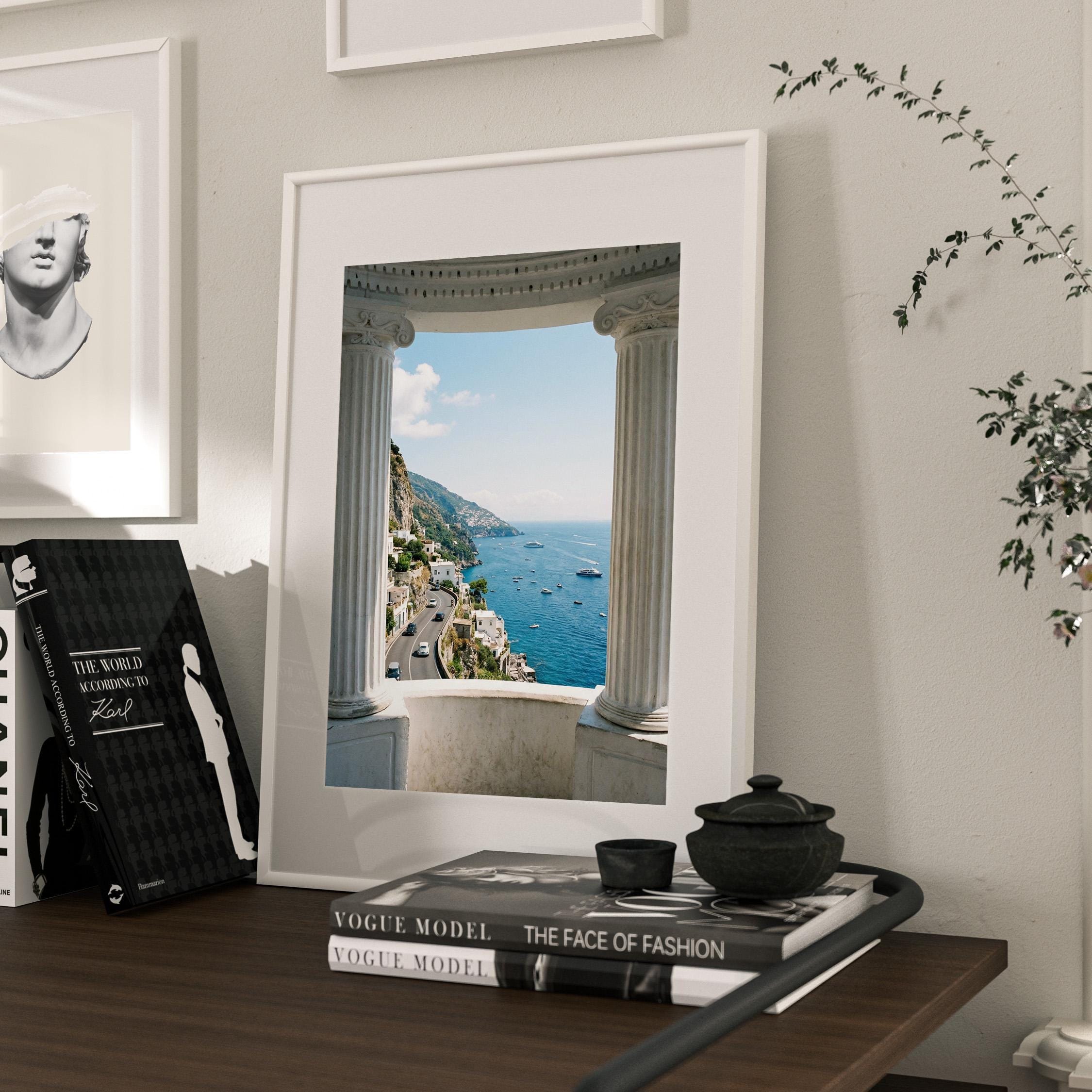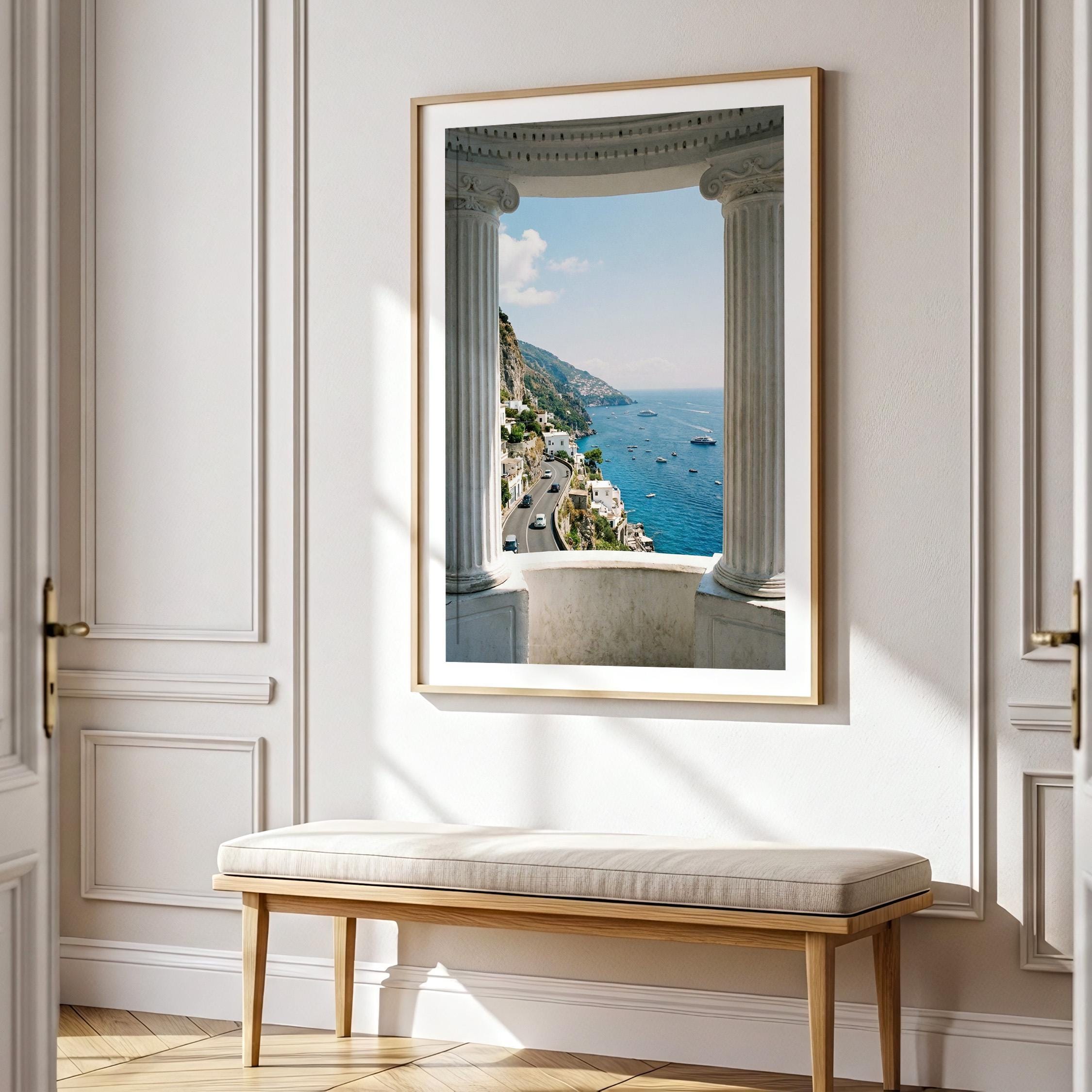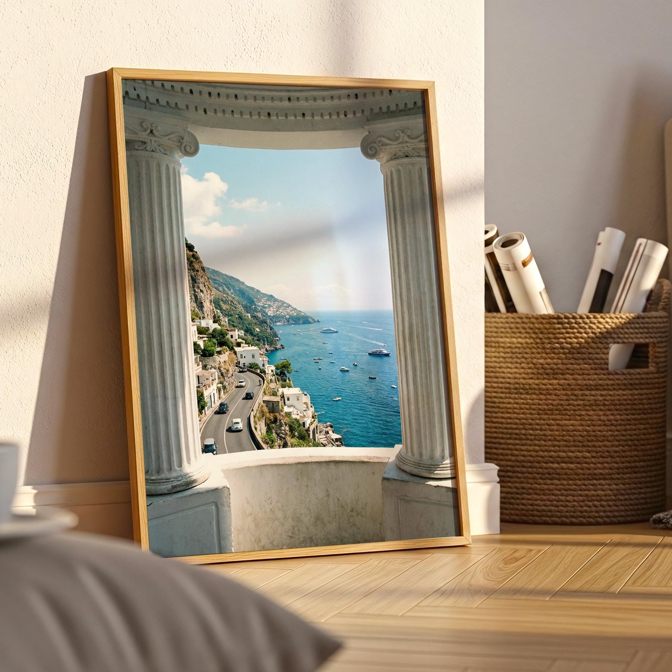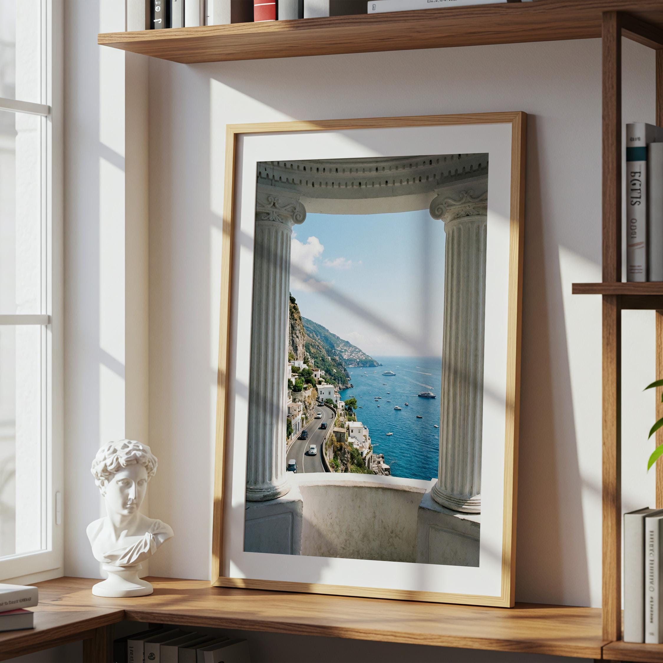 Experience the Amalfi Coast from a timeless architectural perspective. This Amalfi Coast wall art printable captures a sweeping Mediterranean coastal view framed by classical Italian columns, blending history, landscape, and sea into one serene composition.