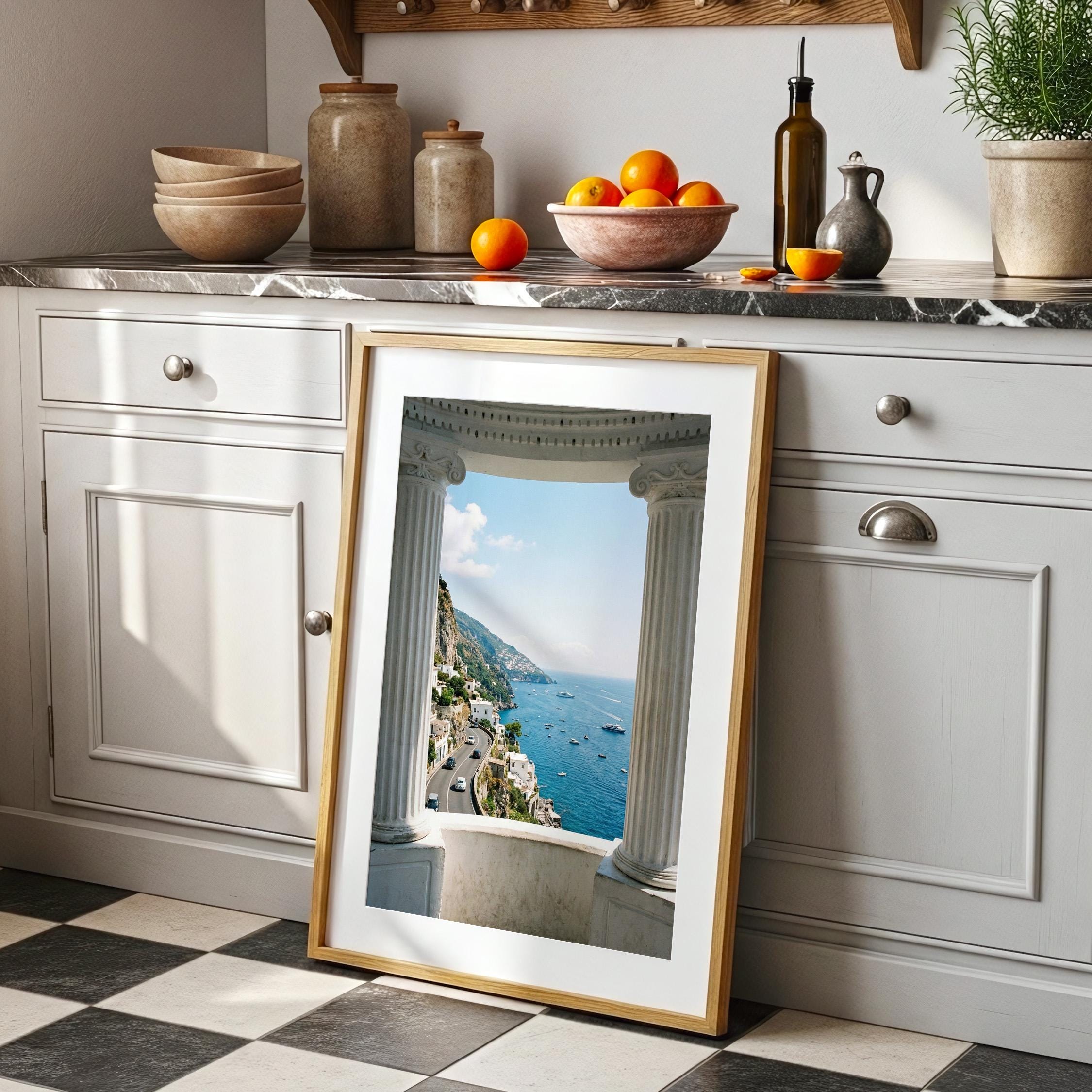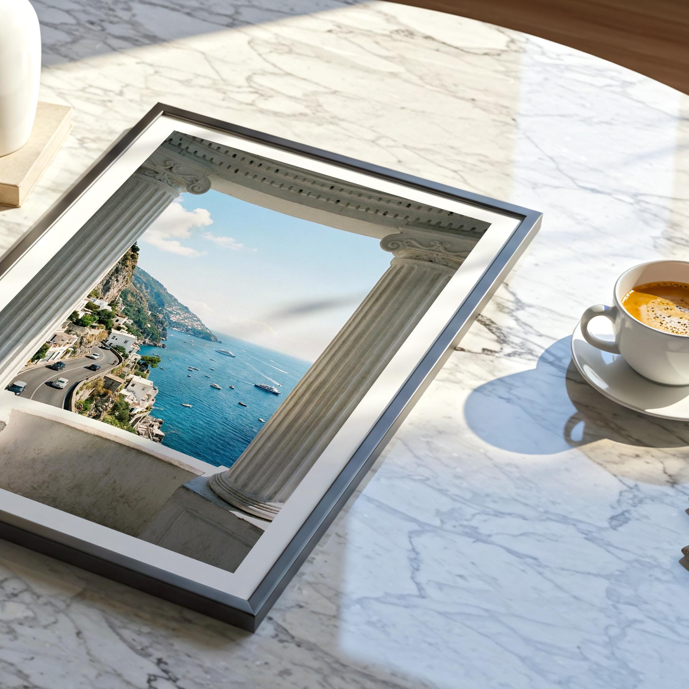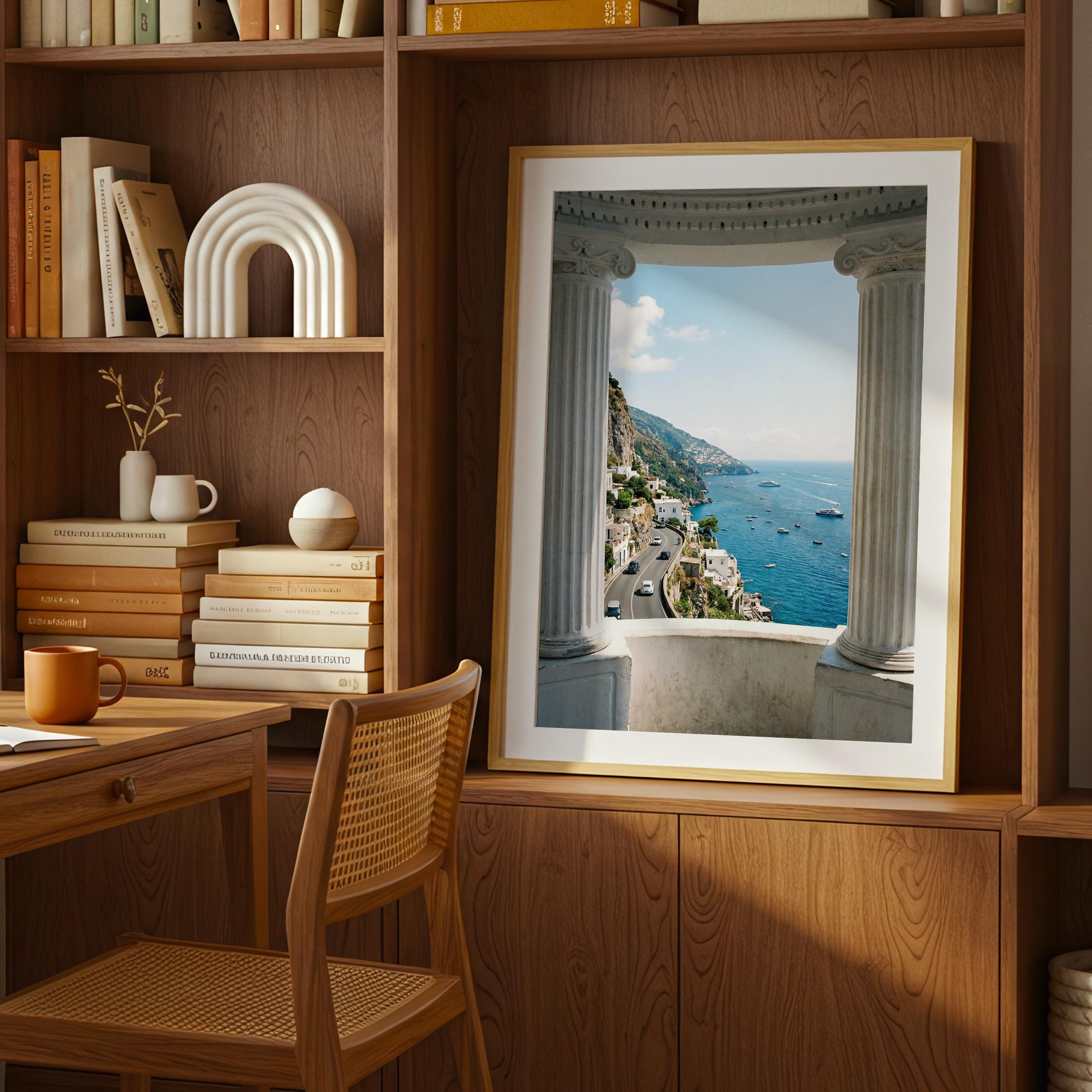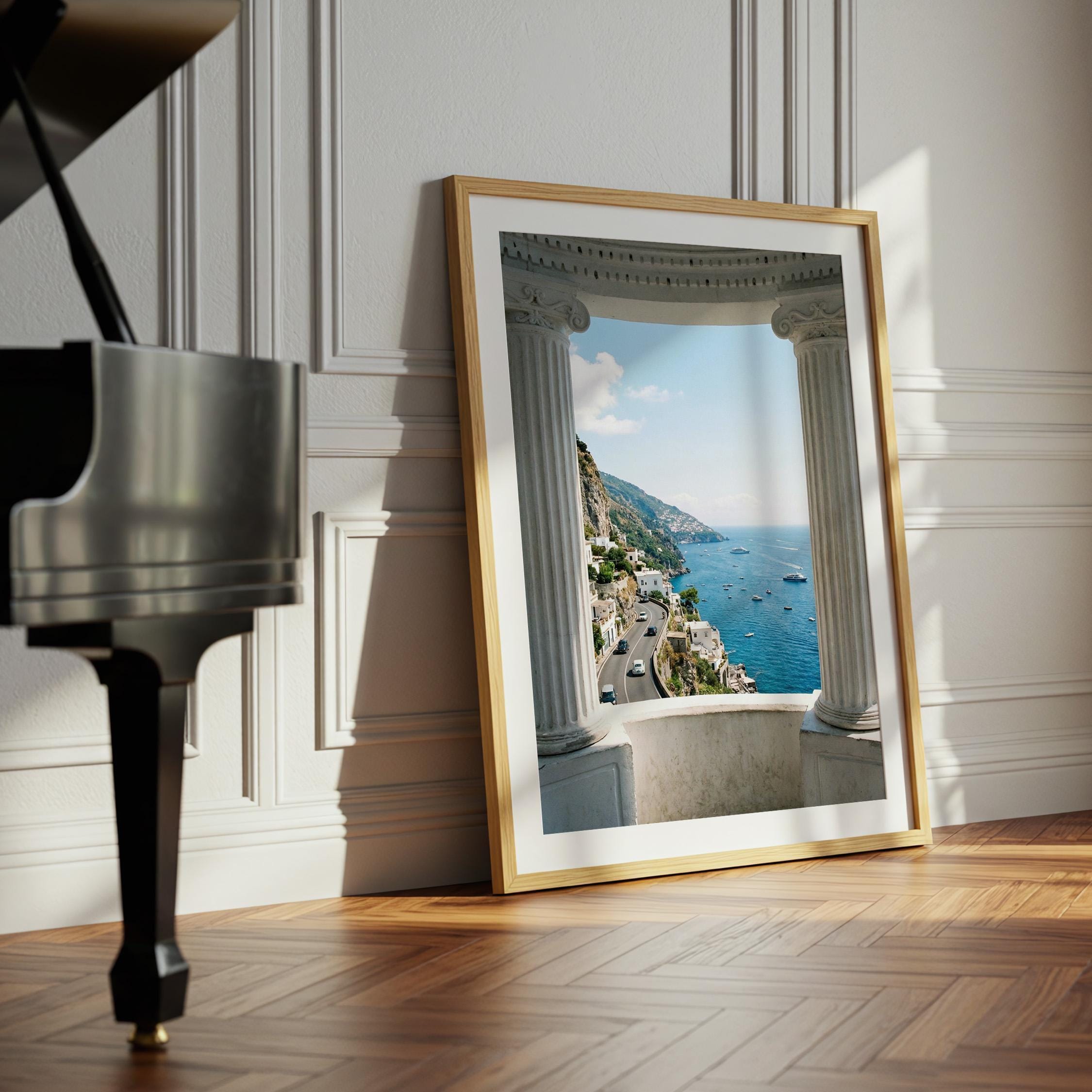 Experience the Amalfi Coast from a timeless architectural perspective. This Amalfi Coast wall art printable captures a sweeping Mediterranean coastal view framed by classical Italian columns, blending history, landscape, and sea into one serene composition.