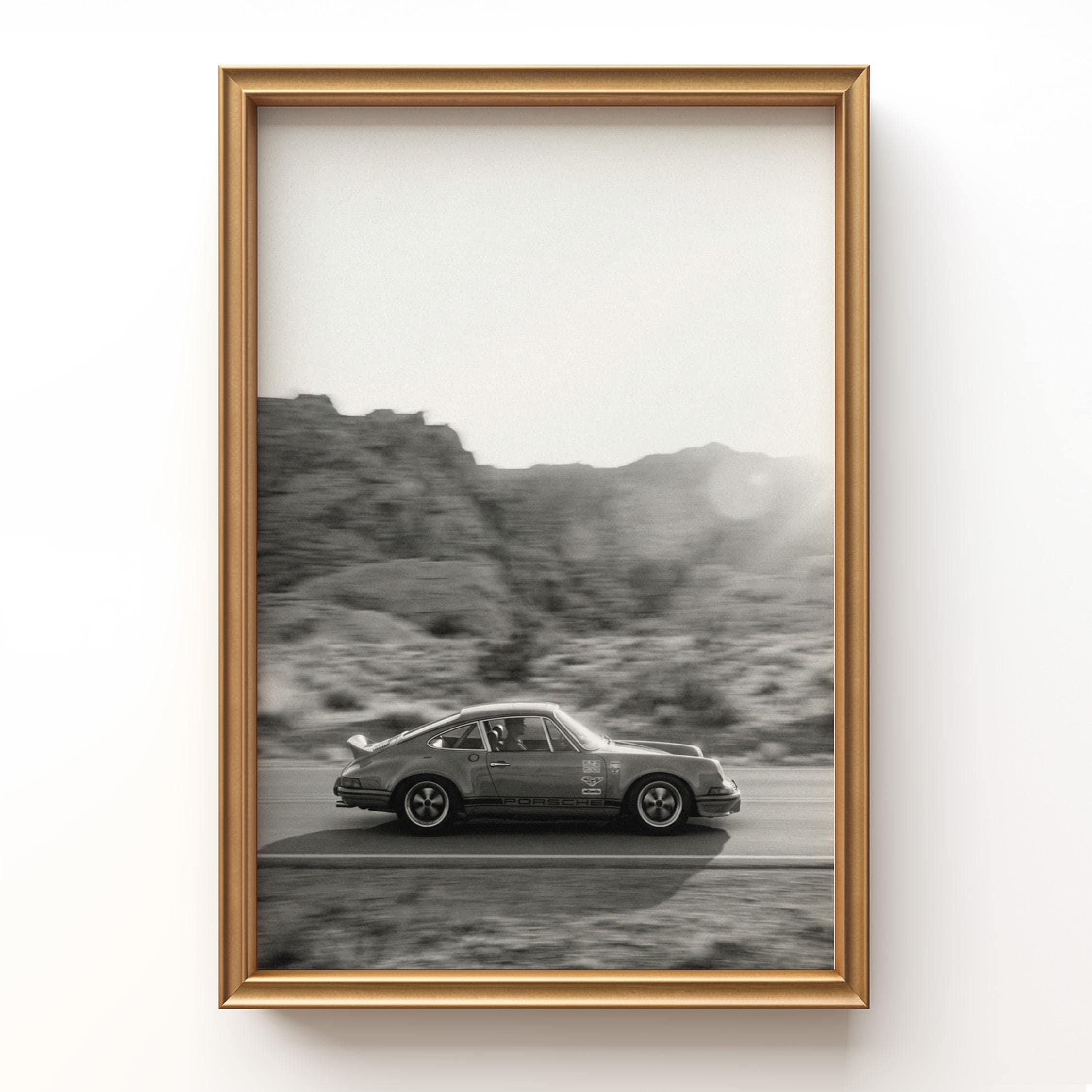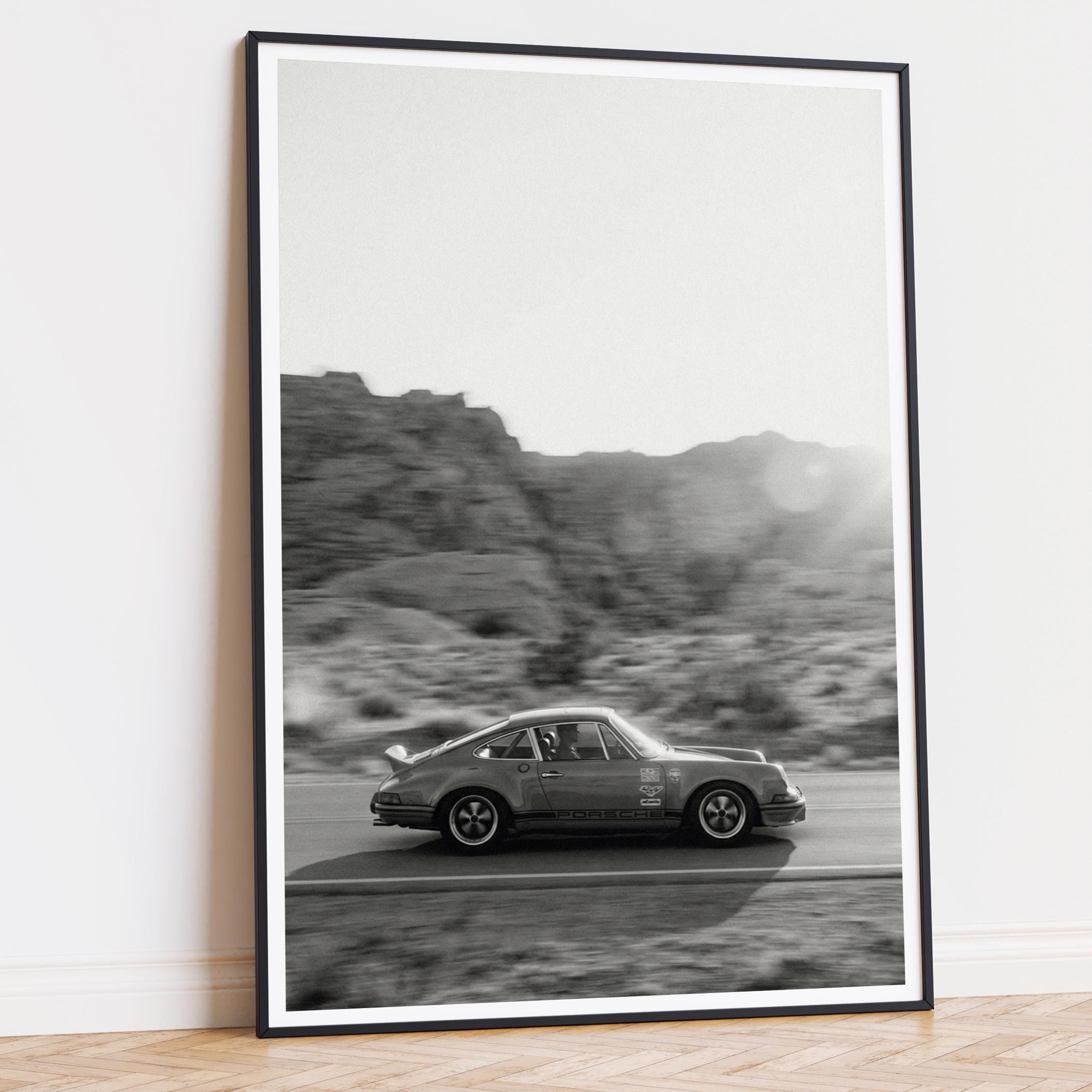 Celebrate an icon of the 1980s with this Porsche 911 wall art printable featuring the legendary Carrera 3.2 Coupe in striking black and white. Captured in motion against a raw desert backdrop, this print highlights the timeless lines and unmistakable presence of a classic Porsche.
