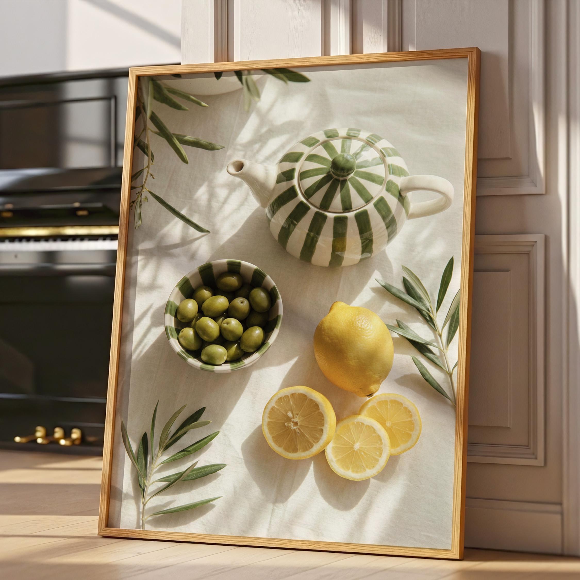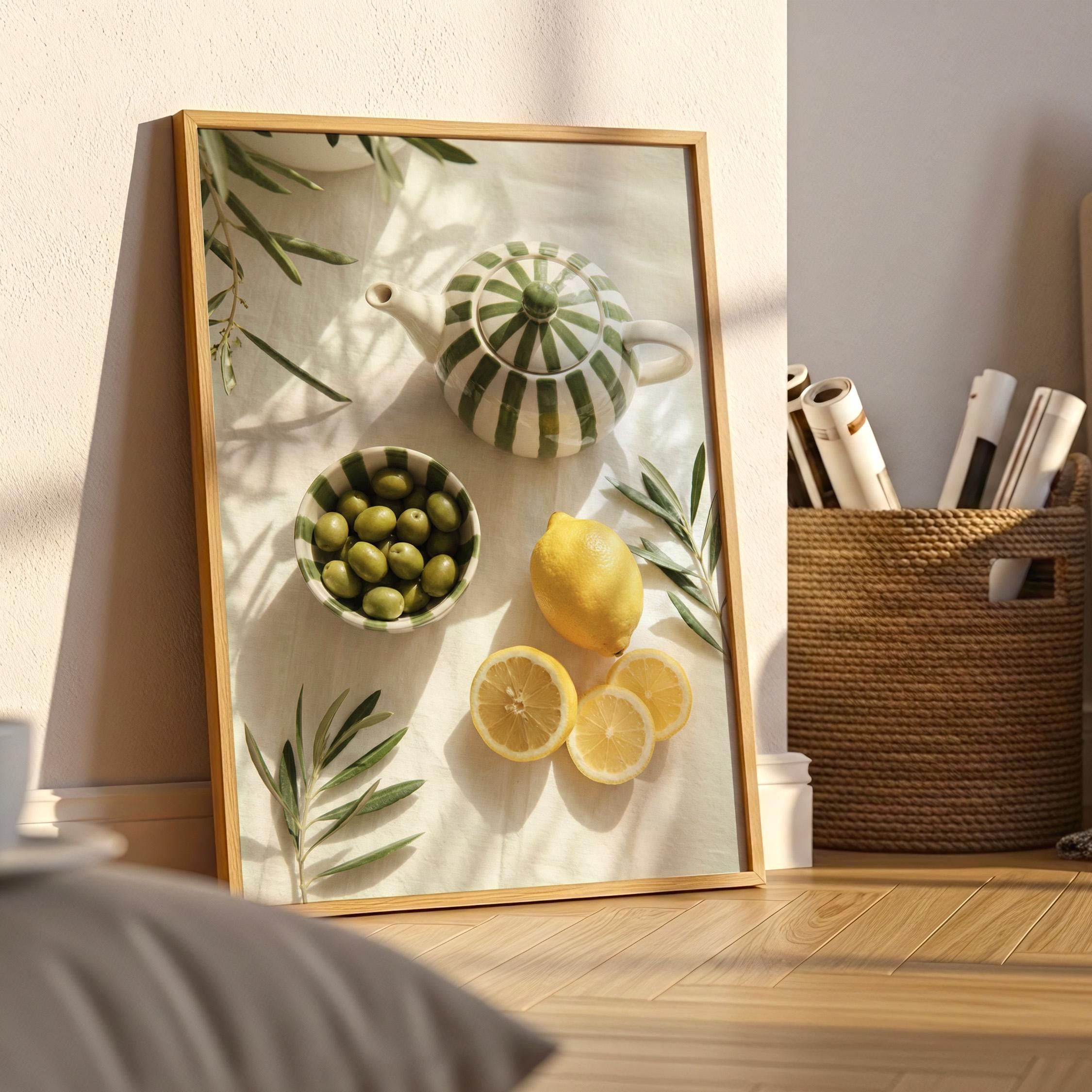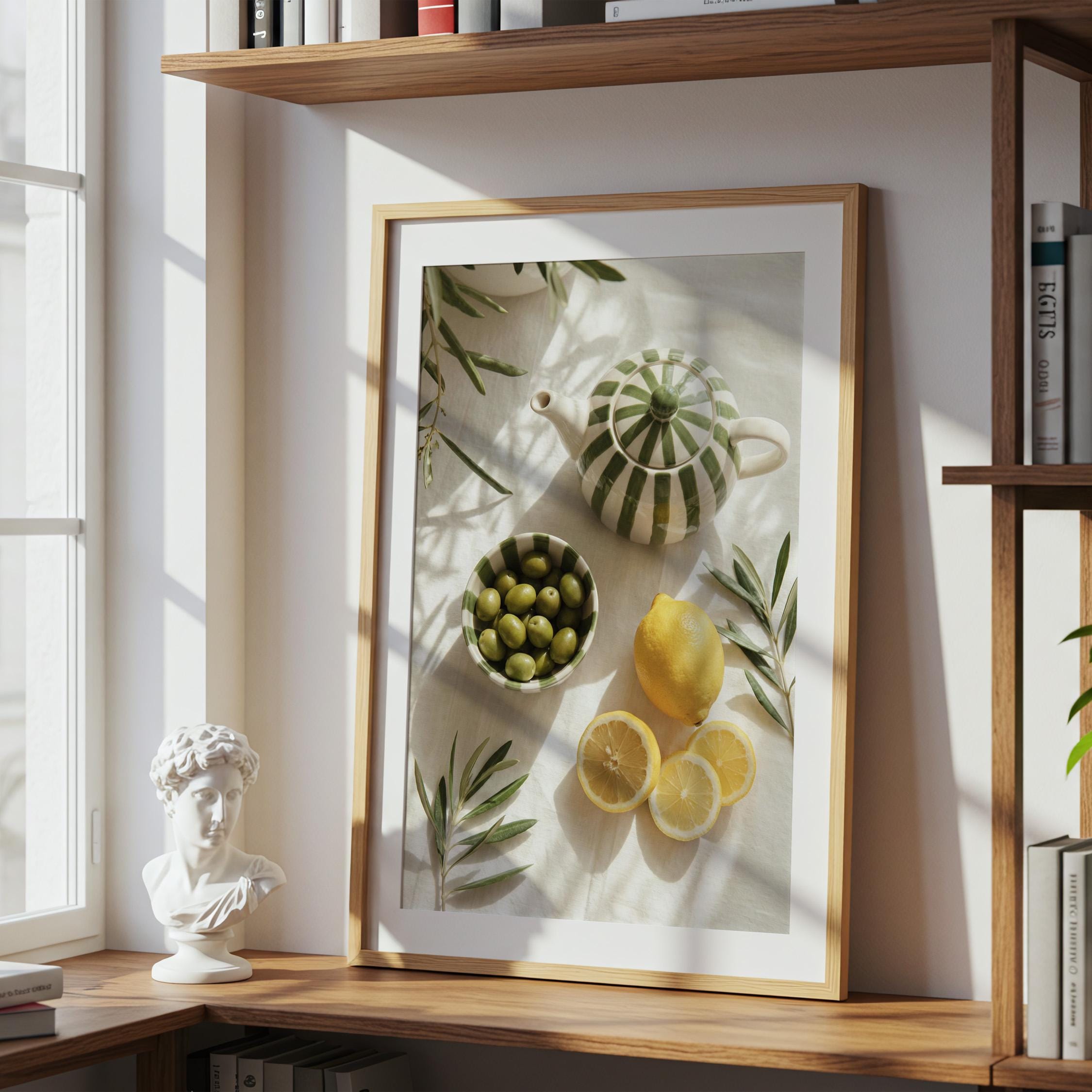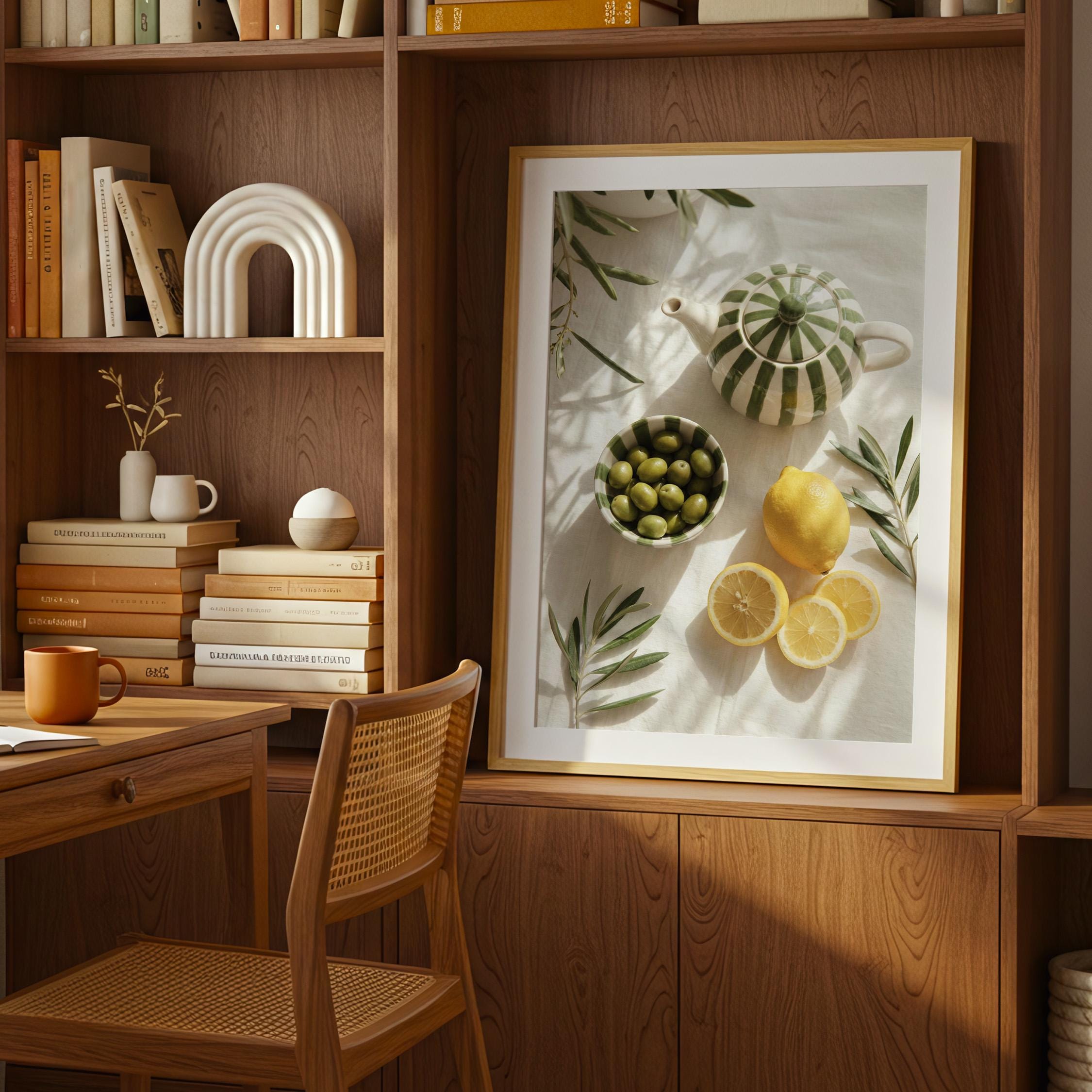 Inspired by southern European homes, this still life brings warmth and balance into your space. The natural tones of green and yellow work beautifully in kitchens, dining areas, or anywhere you want a subtle touch of Italian decor.