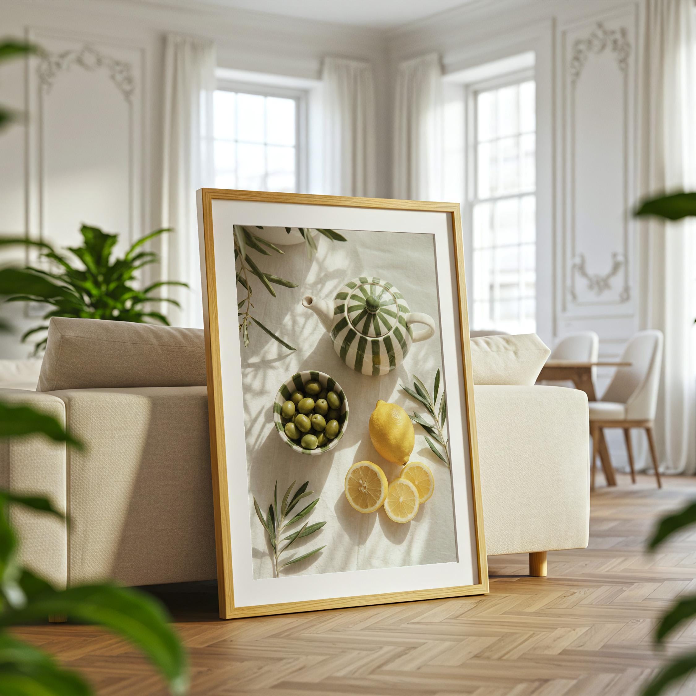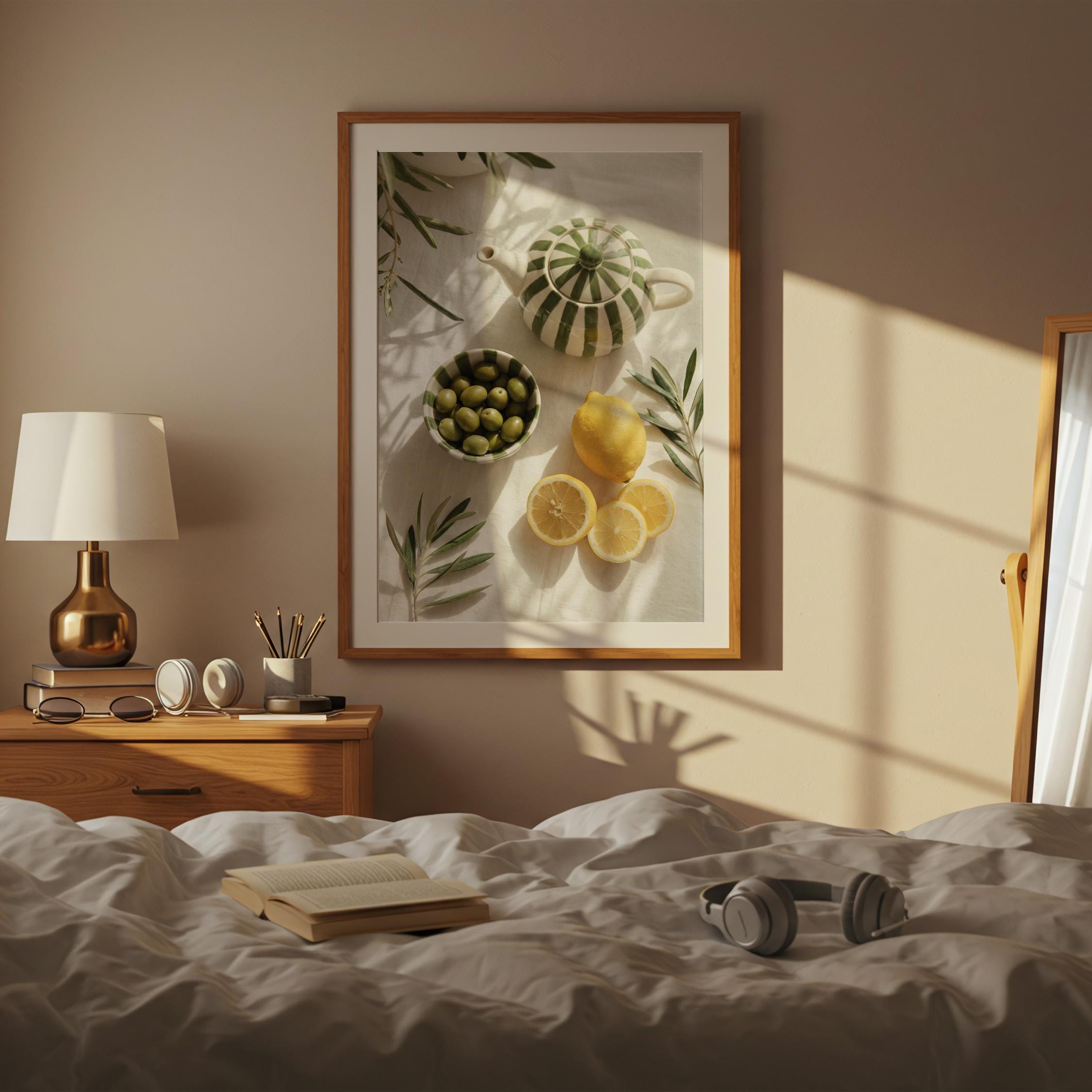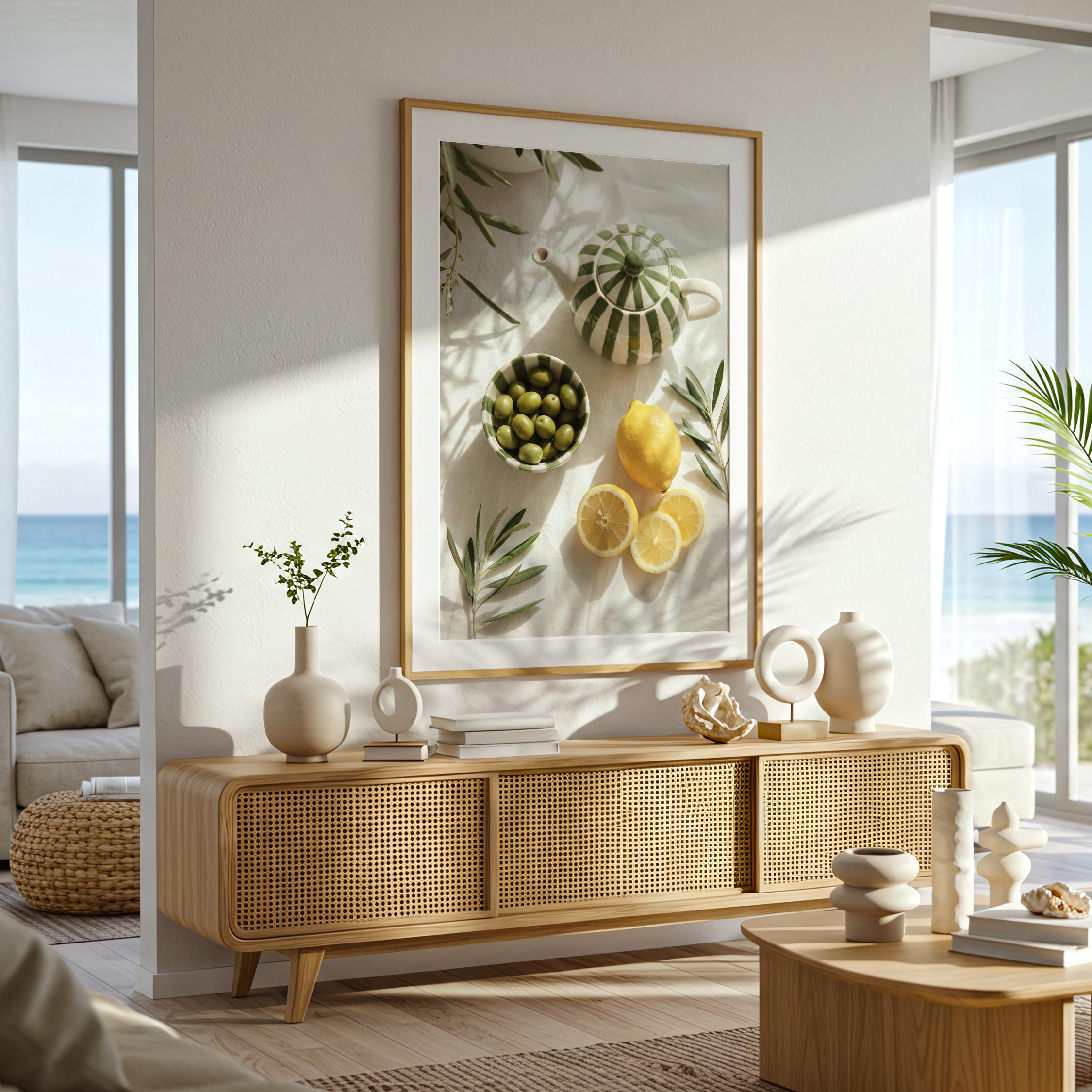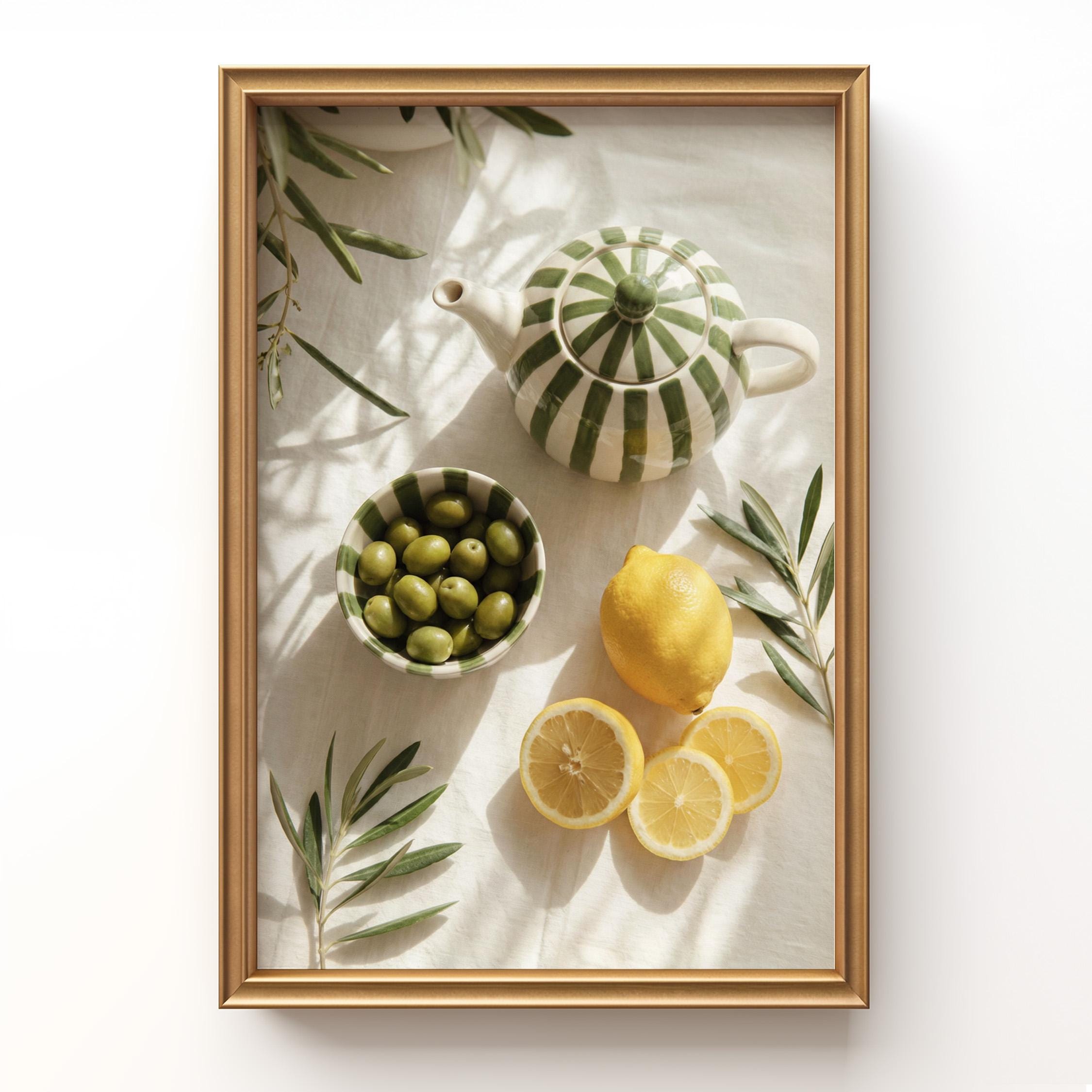 Inspired by southern European homes, this still life brings warmth and balance into your space. The natural tones of green and yellow work beautifully in kitchens, dining areas, or anywhere you want a subtle touch of Italian decor.