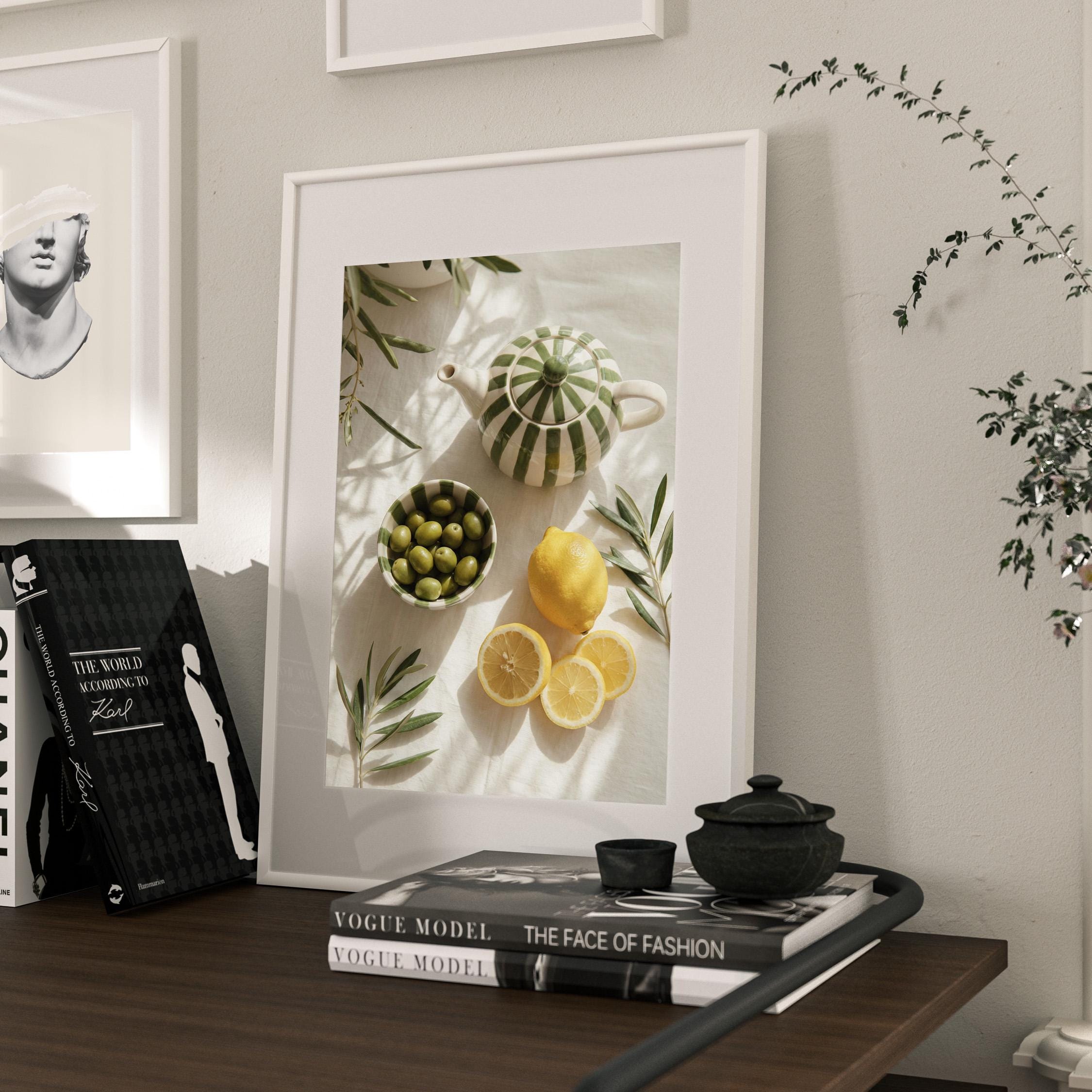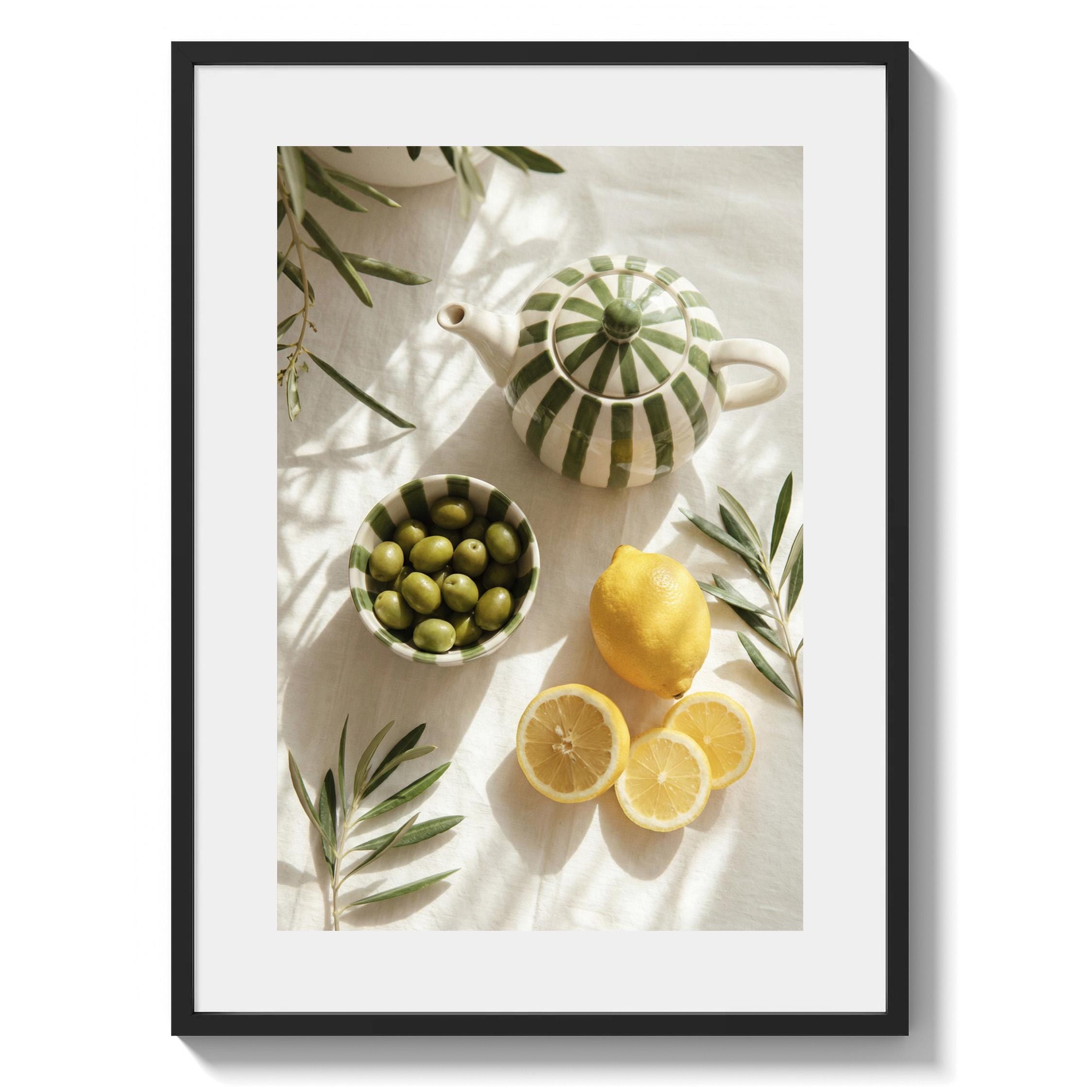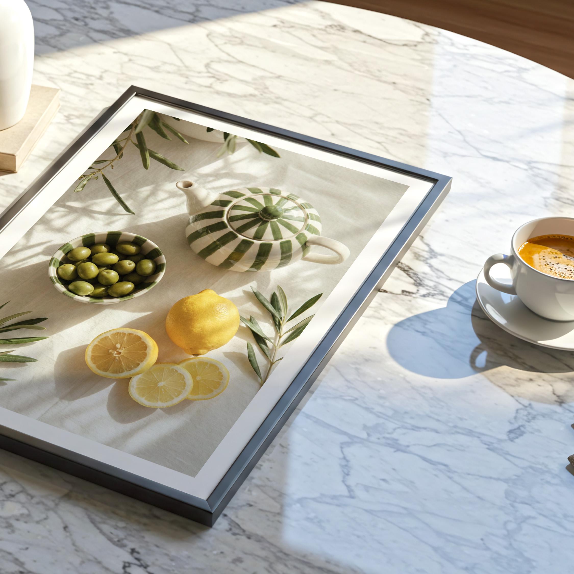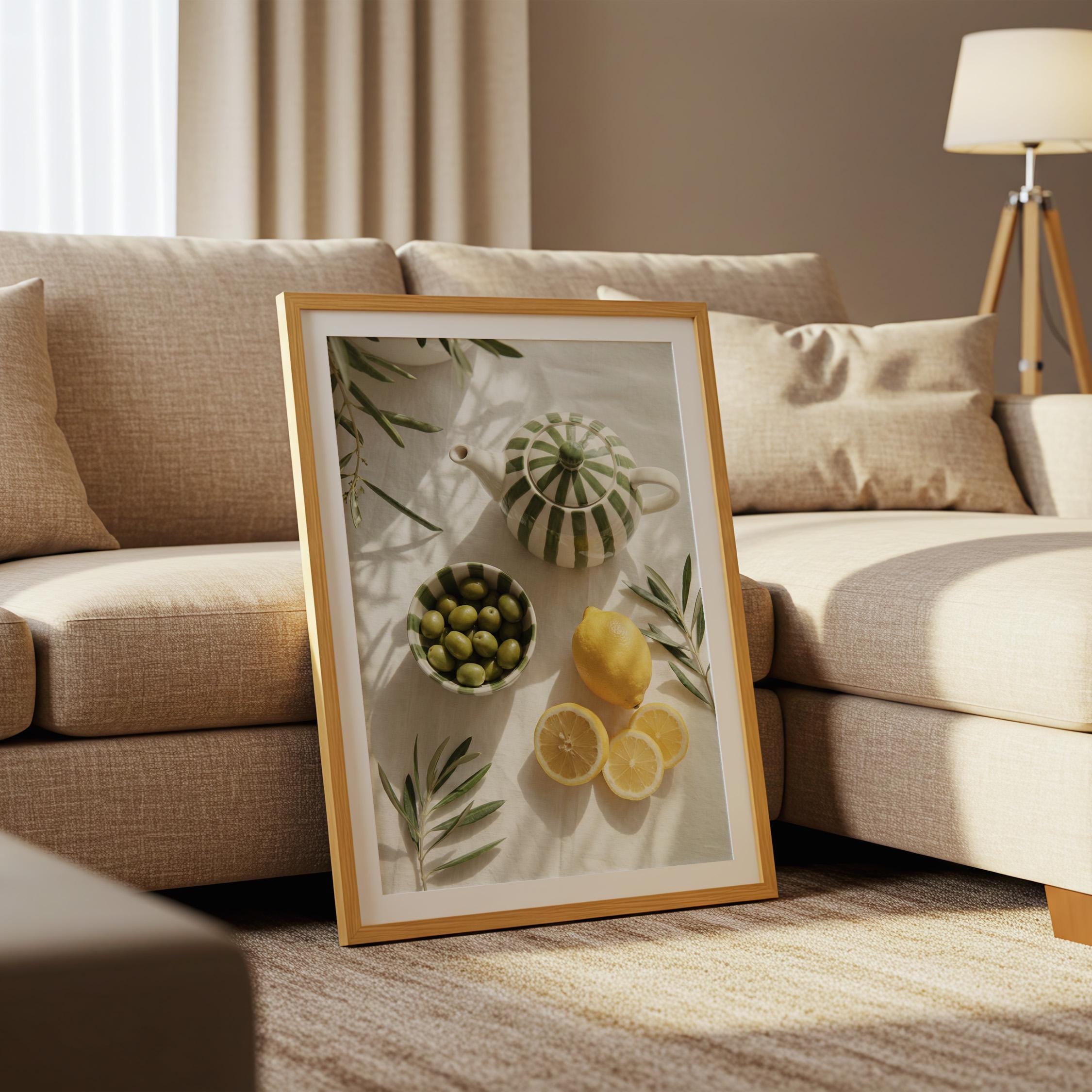 Inspired by southern European homes, this still life brings warmth and balance into your space. The natural tones of green and yellow work beautifully in kitchens, dining areas, or anywhere you want a subtle touch of Italian decor.