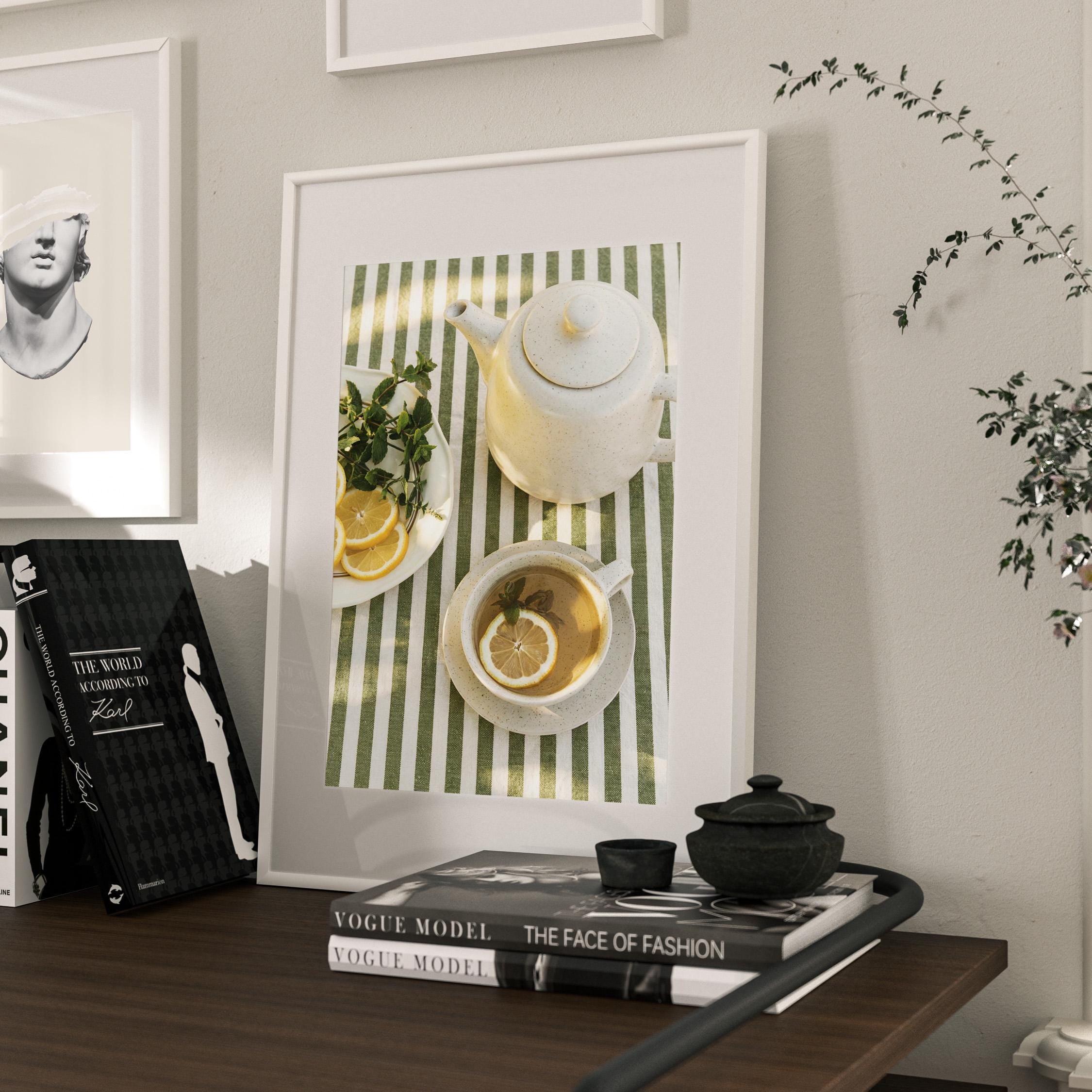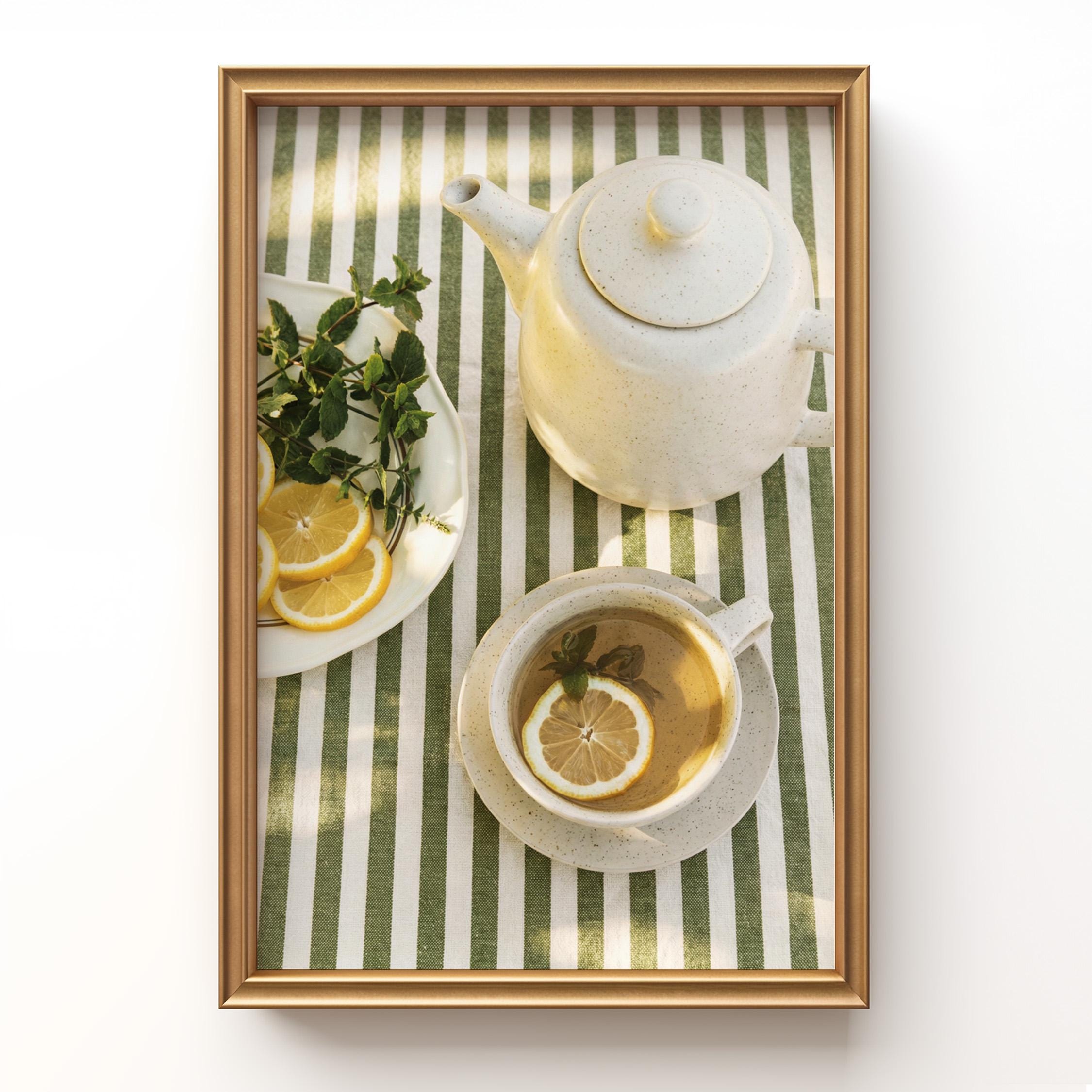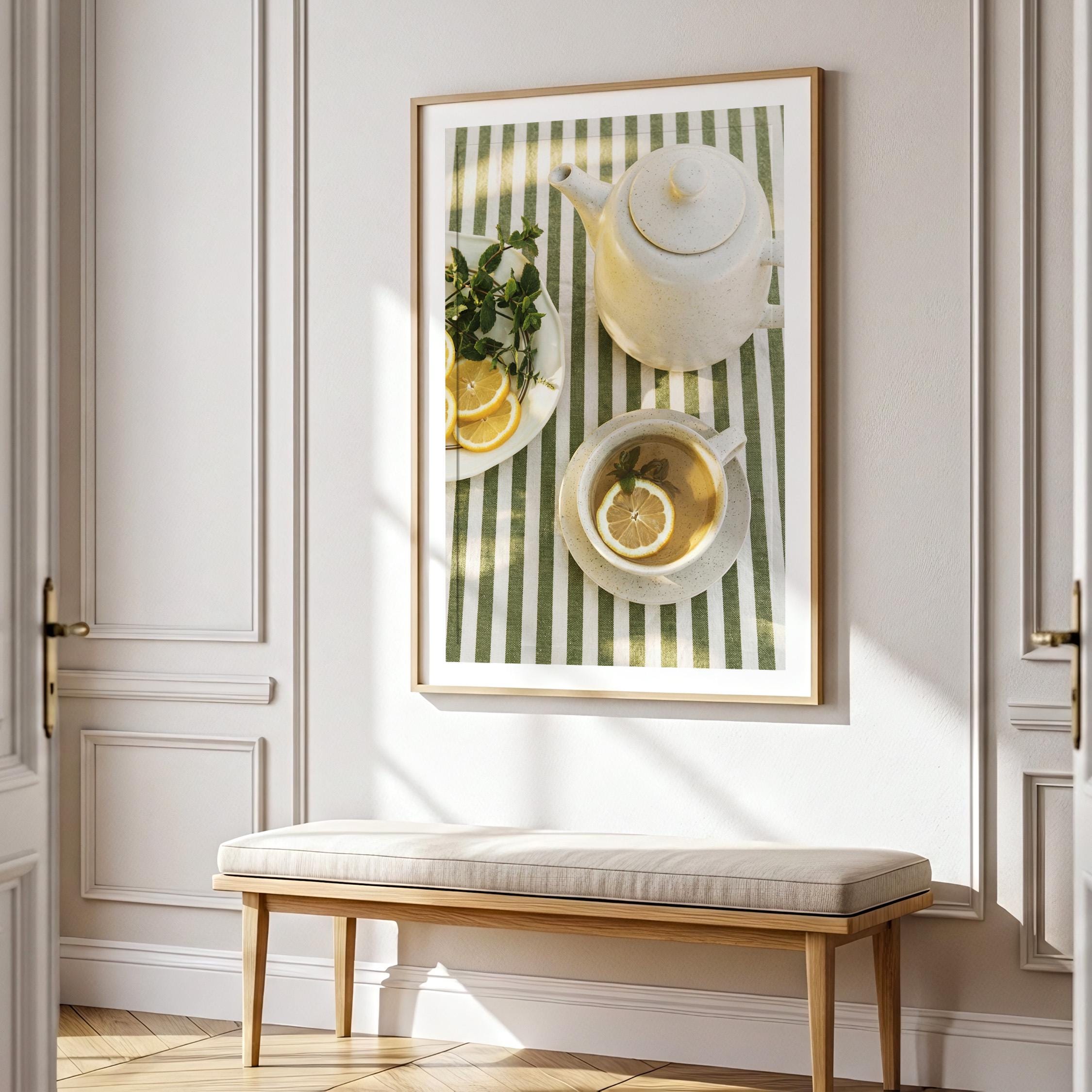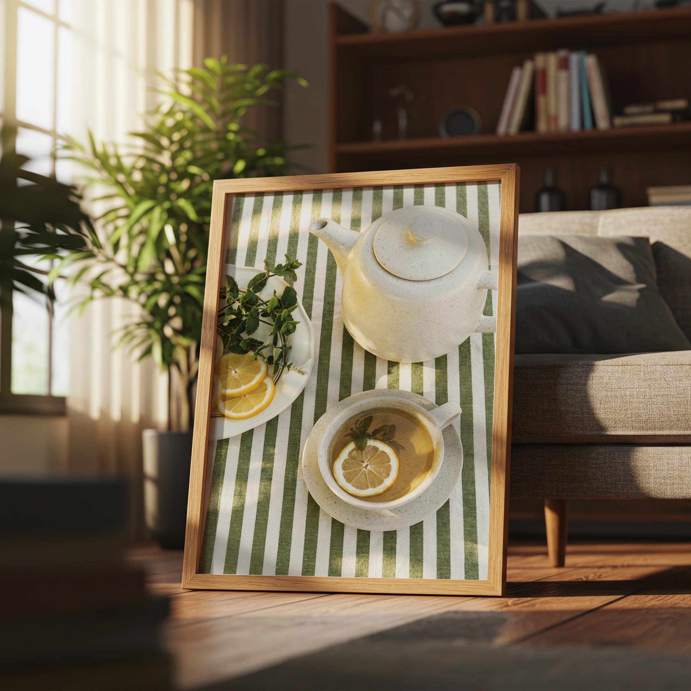 Perfect for anyone who loves tea rituals, light-filled interiors, or Mediterranean-inspired styling. The structured stripes add a graphic touch, while the lemon and mint keep it relaxed and inviting.