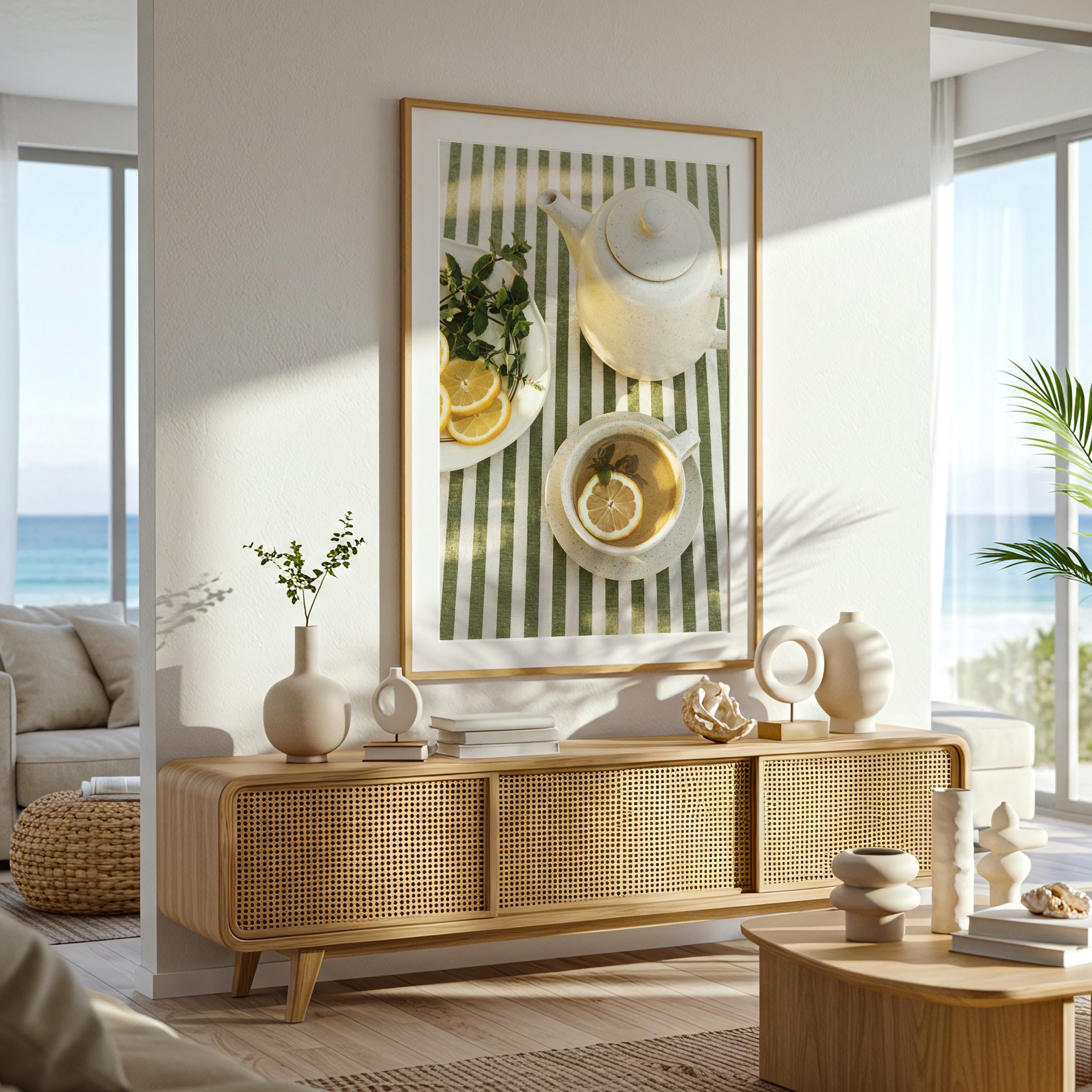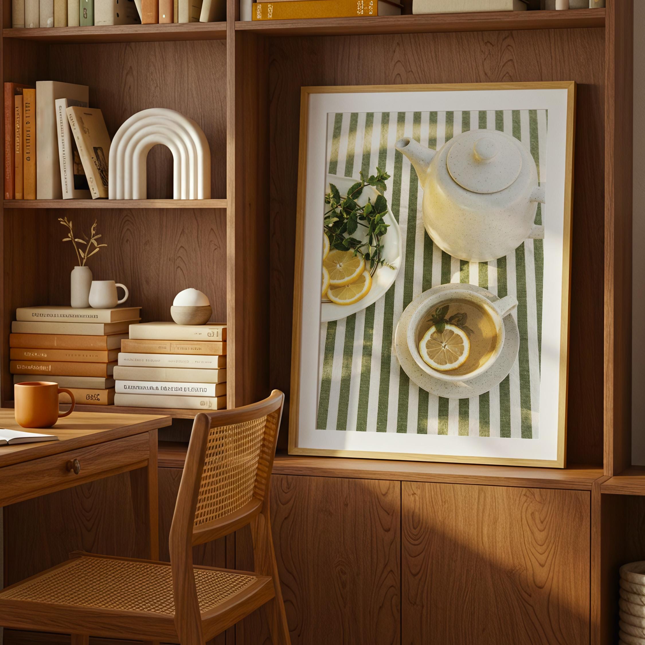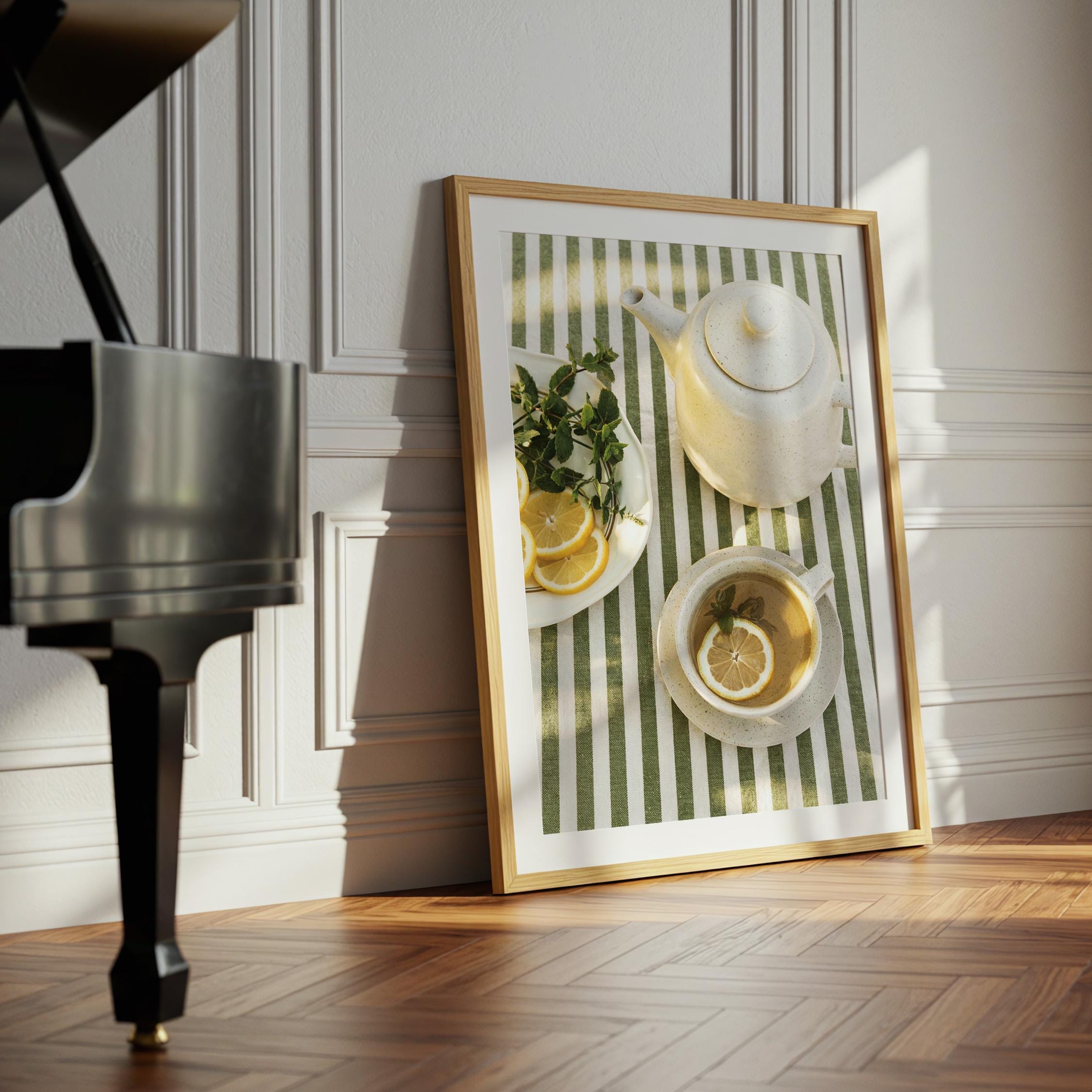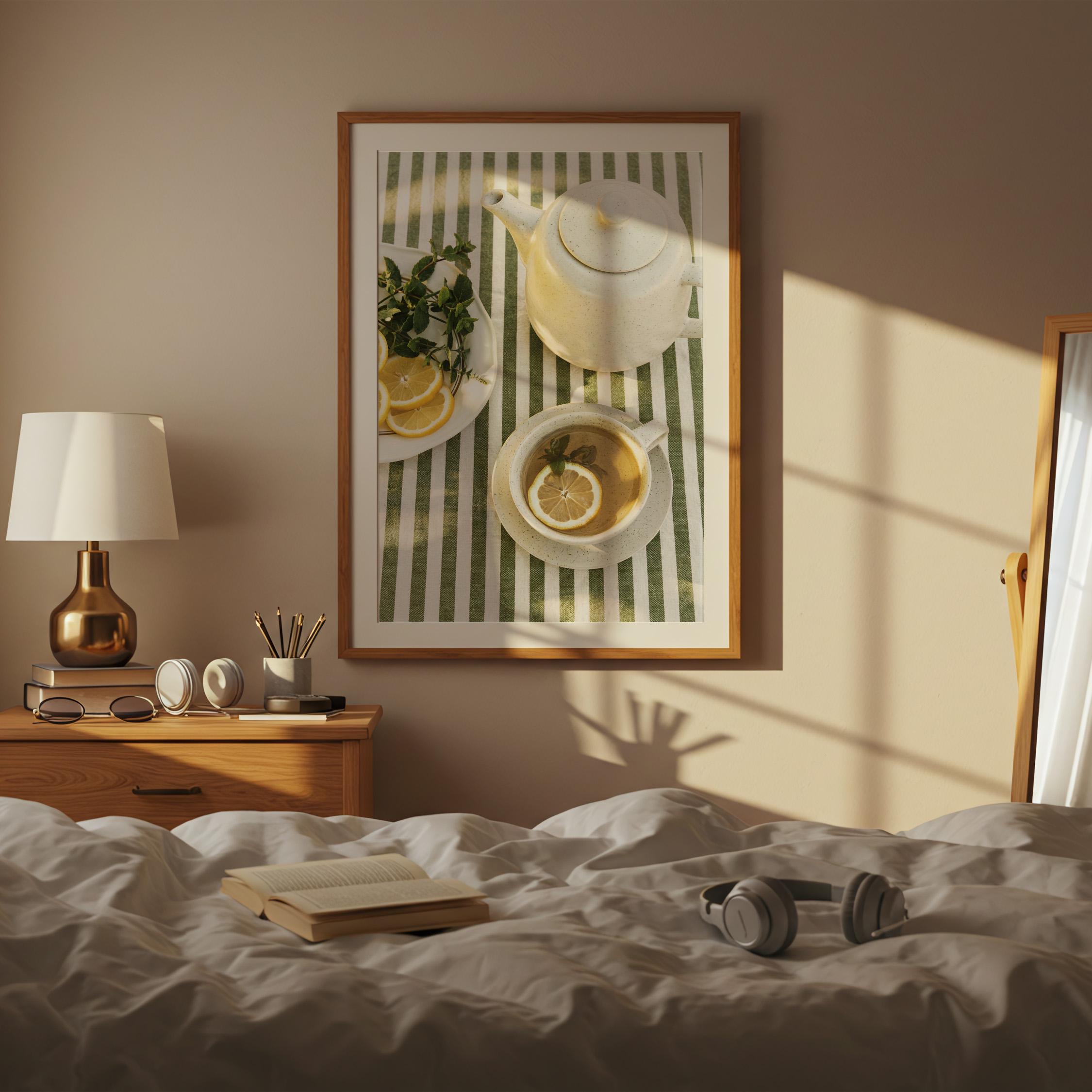 Perfect for anyone who loves tea rituals, light-filled interiors, or Mediterranean-inspired styling. The structured stripes add a graphic touch, while the lemon and mint keep it relaxed and inviting.