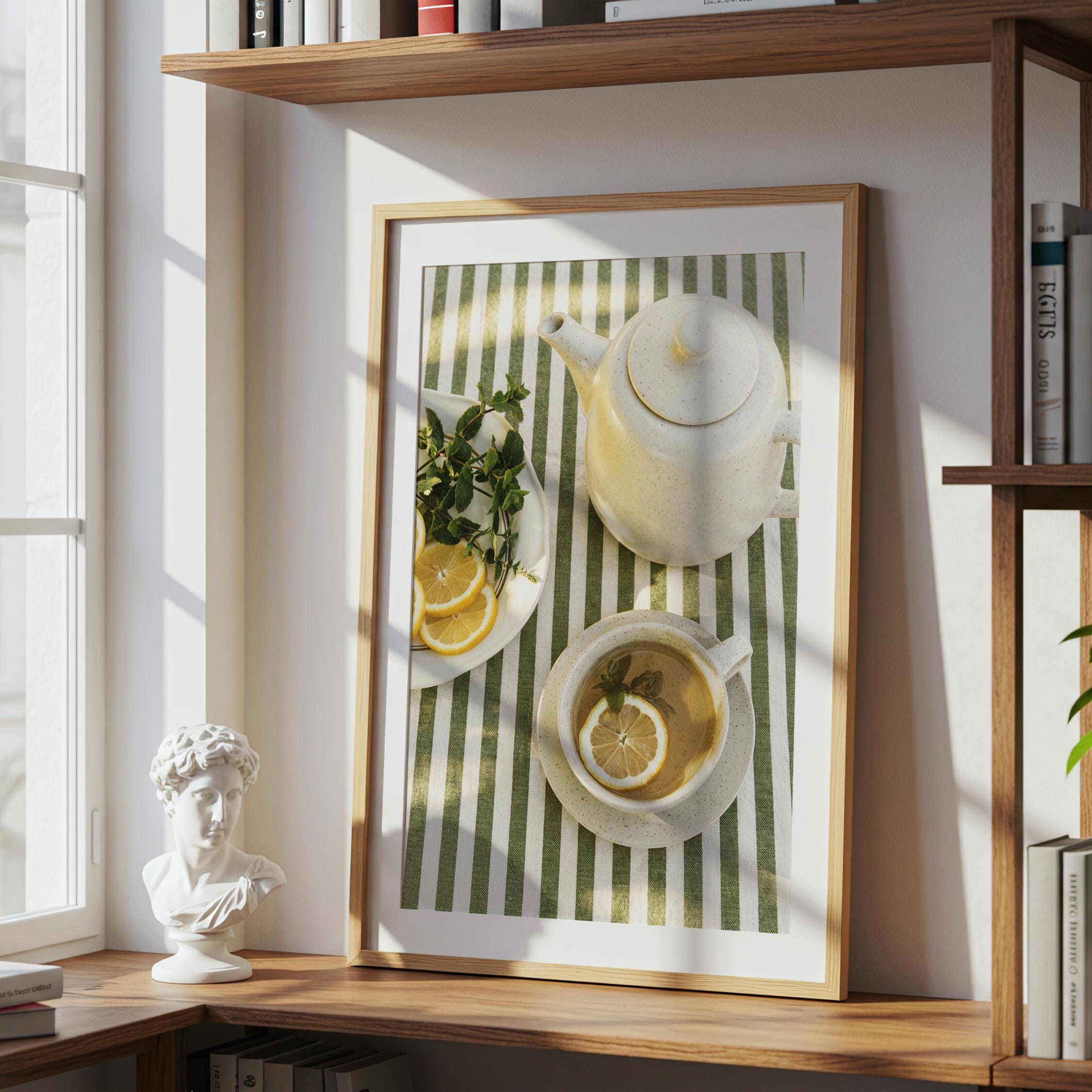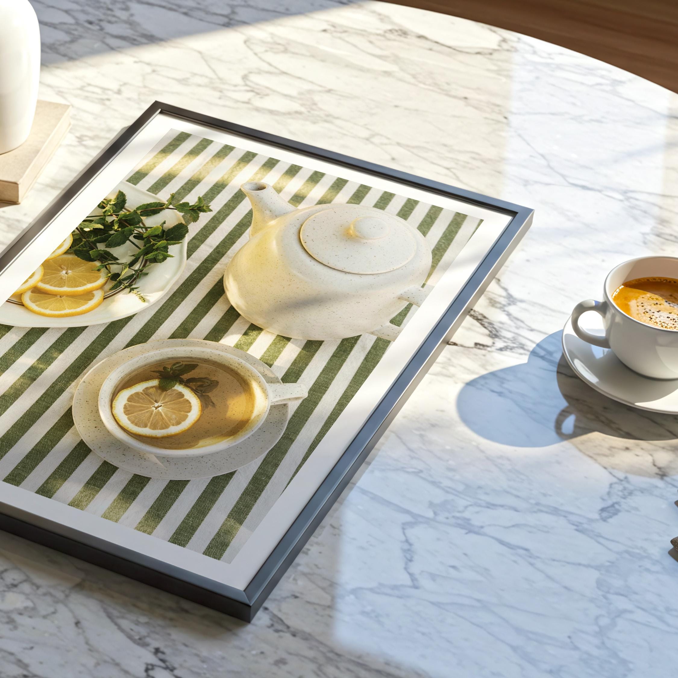 This printable wall art captures a simple tea moment arranged on a green striped tablecloth. The overhead composition feels calm and intentional, with warm sunlight creating gentle shadows across ceramic and linen.