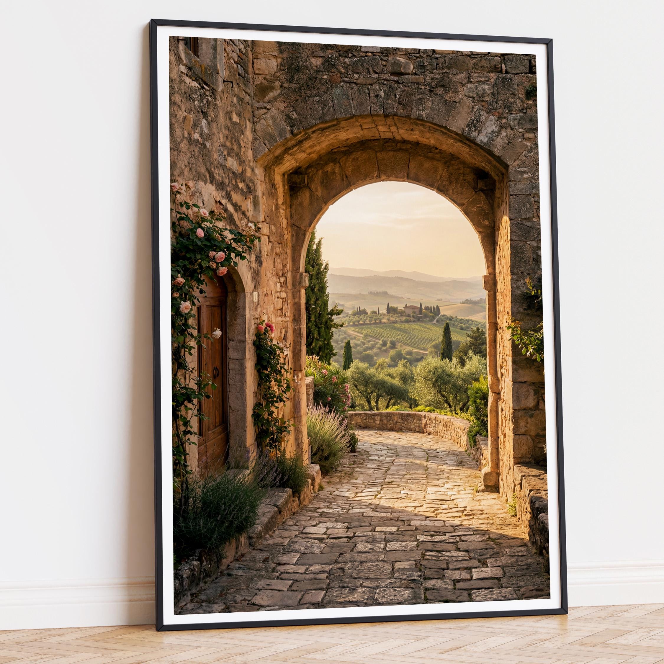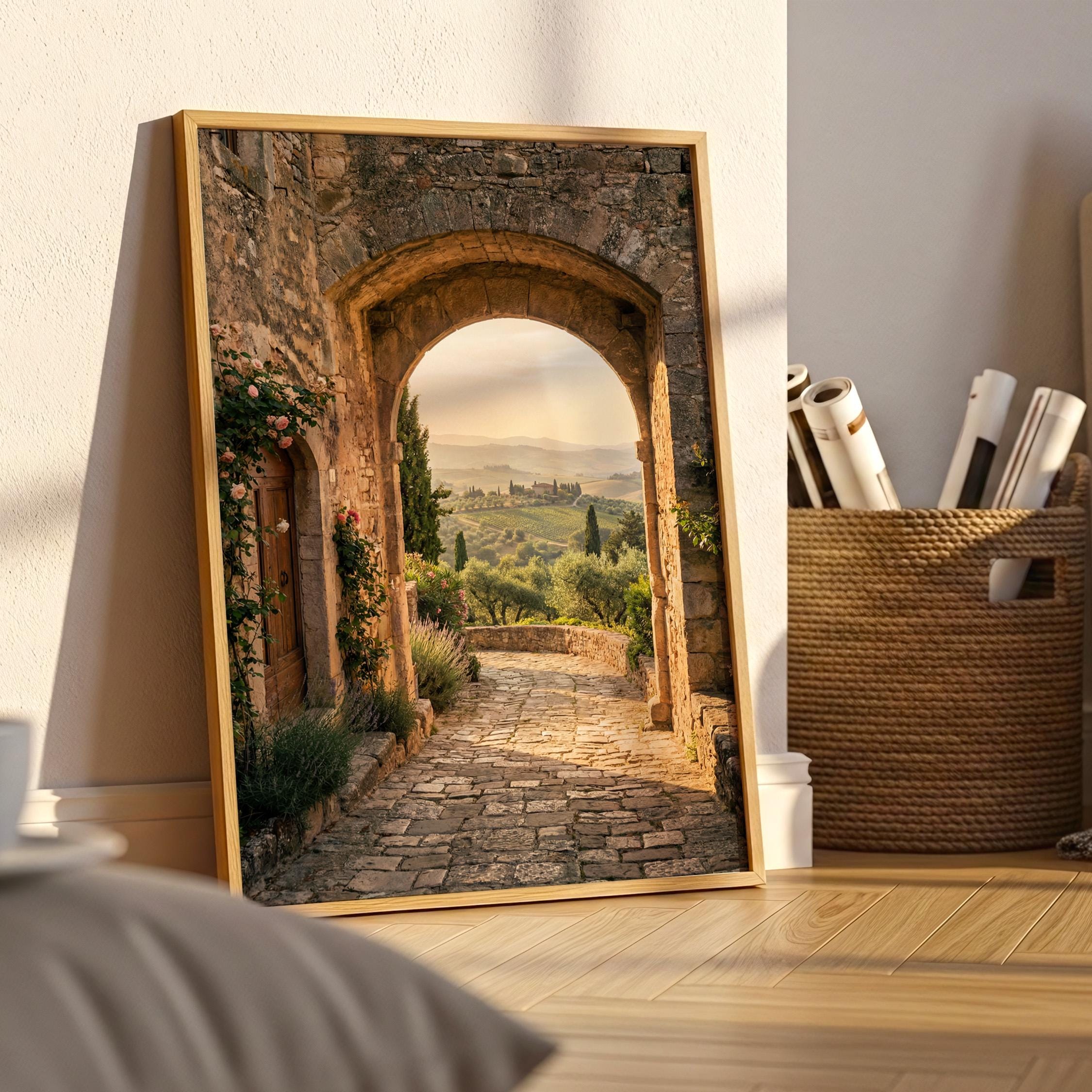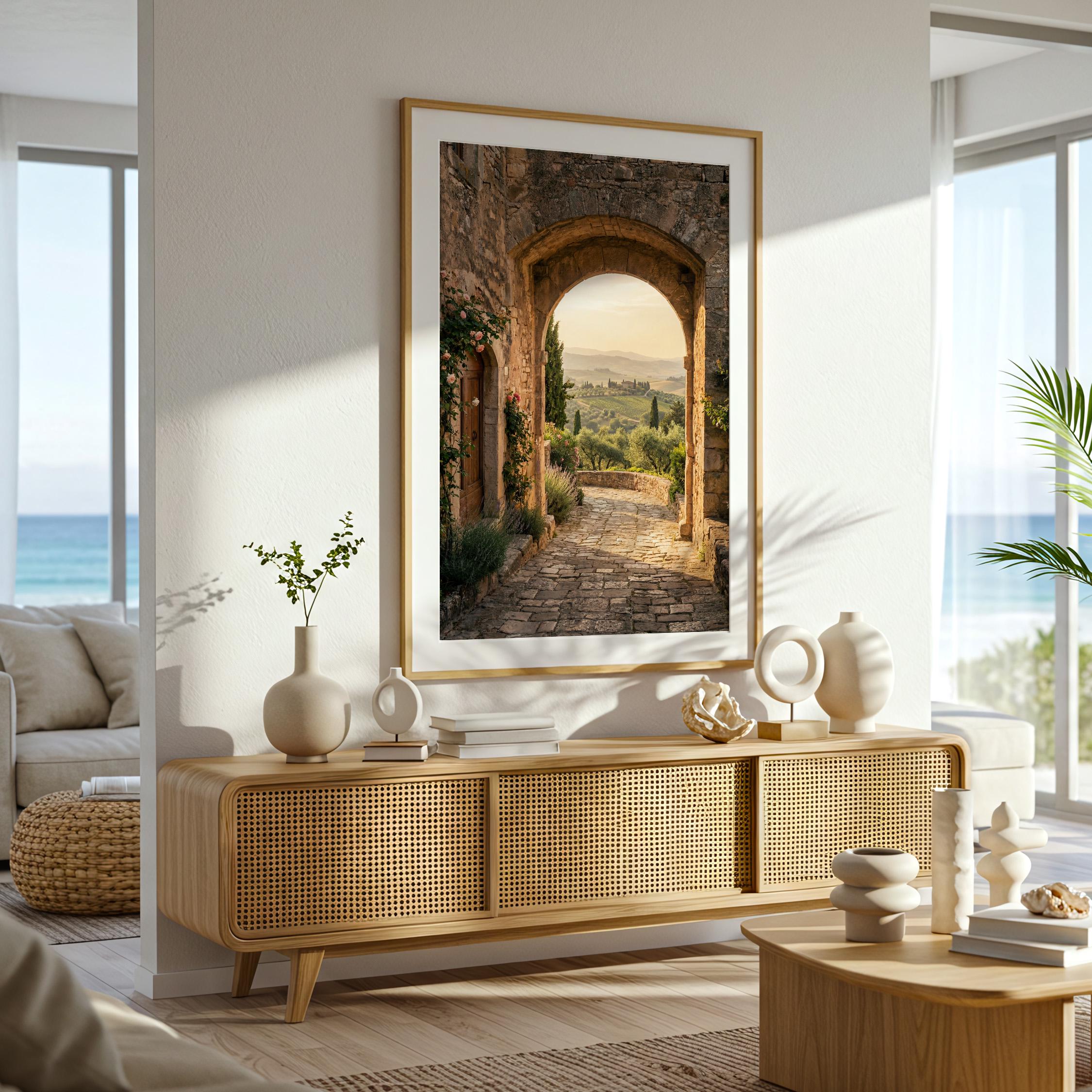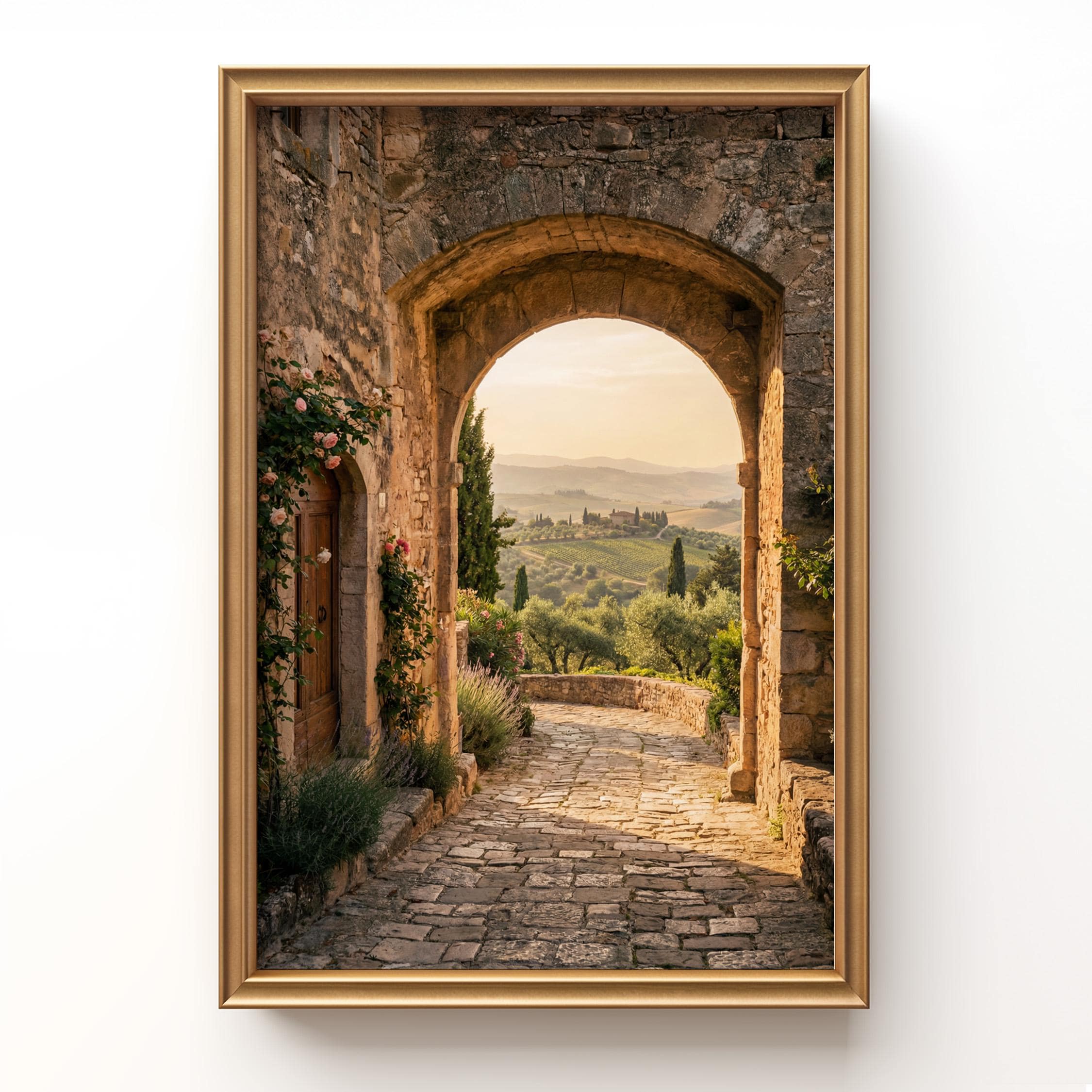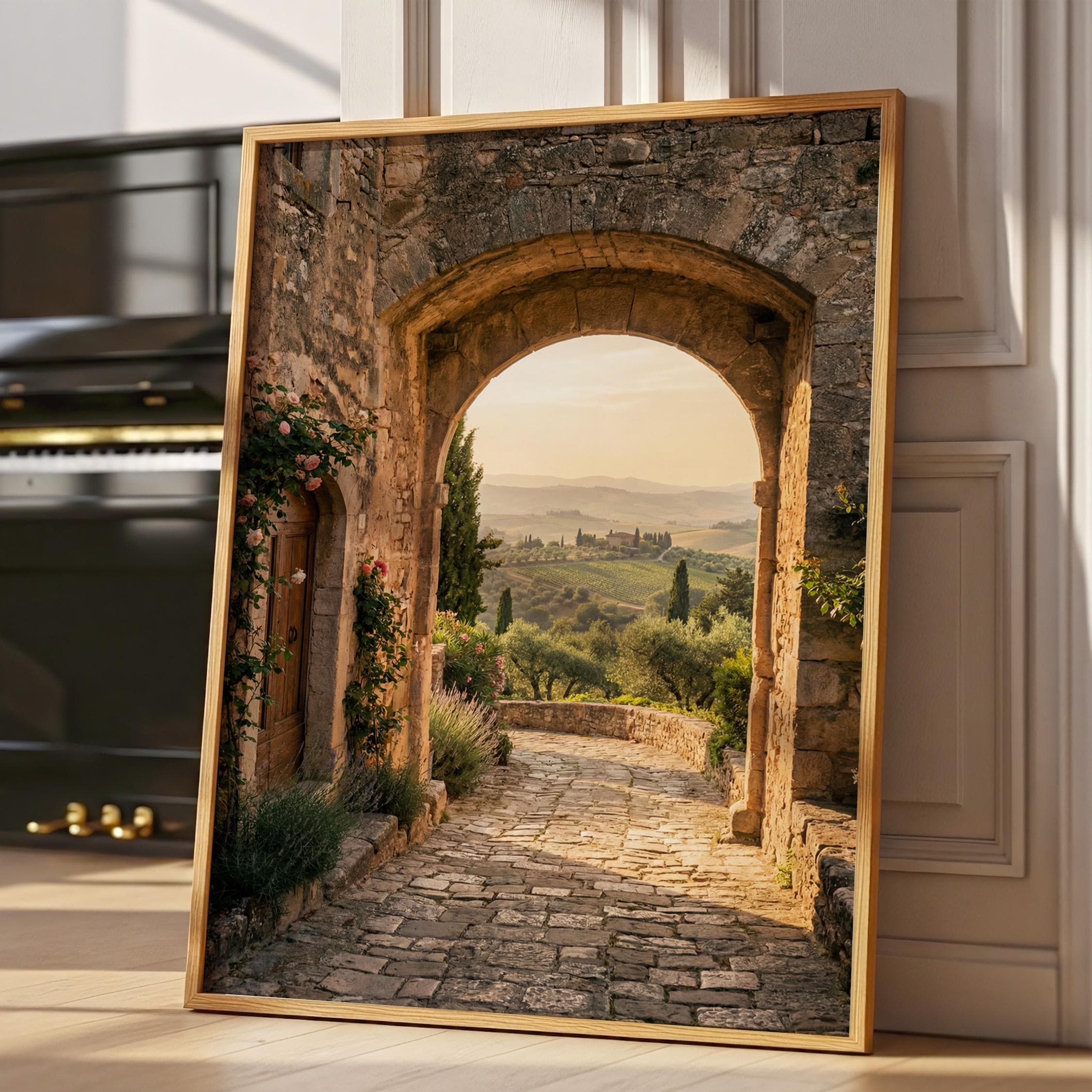 This print captures a quiet golden hour moment in the Italian countryside — warm light washing over cobblestones, olive trees, and distant vineyards. The textured stone arch frames the landscape like an invitation to slow down.