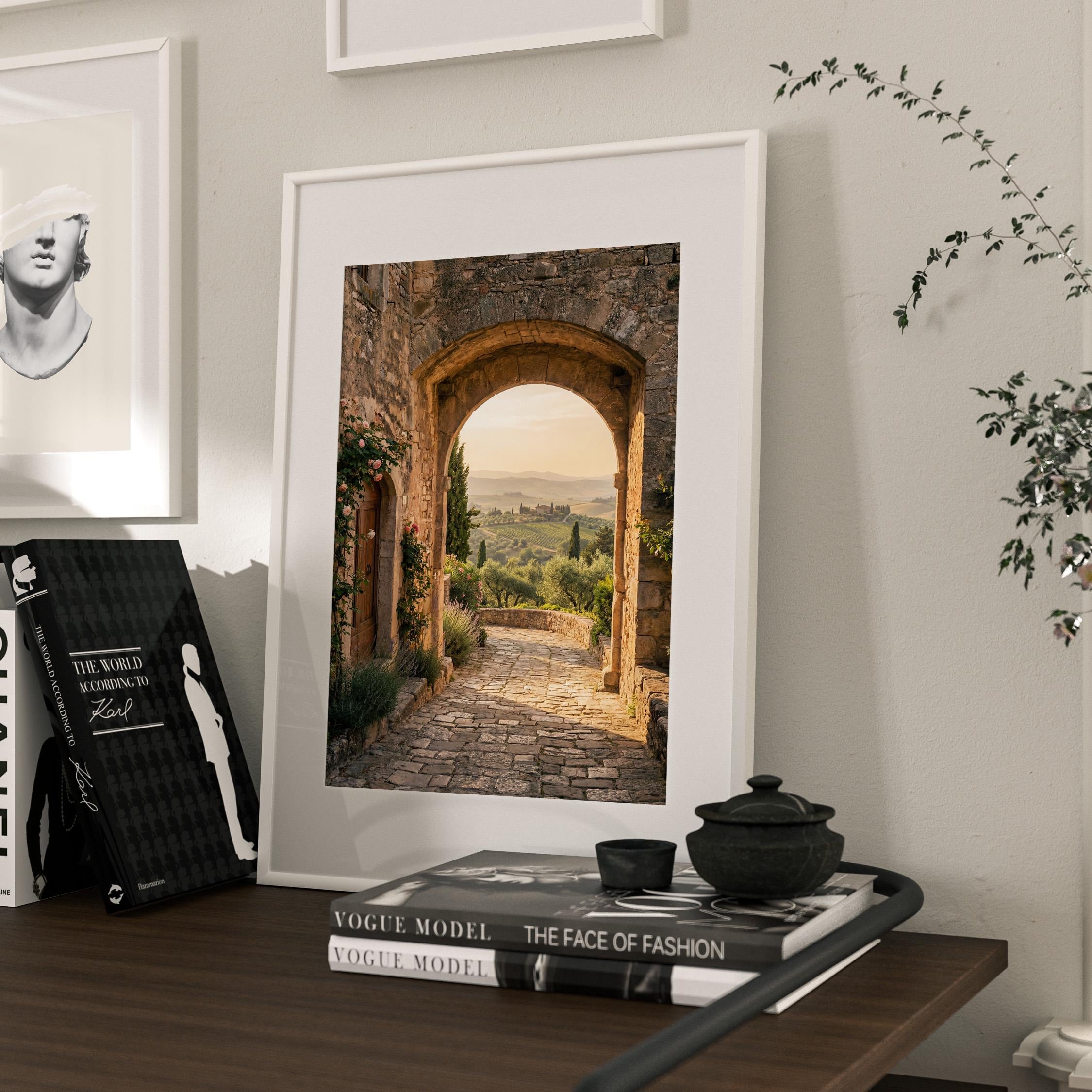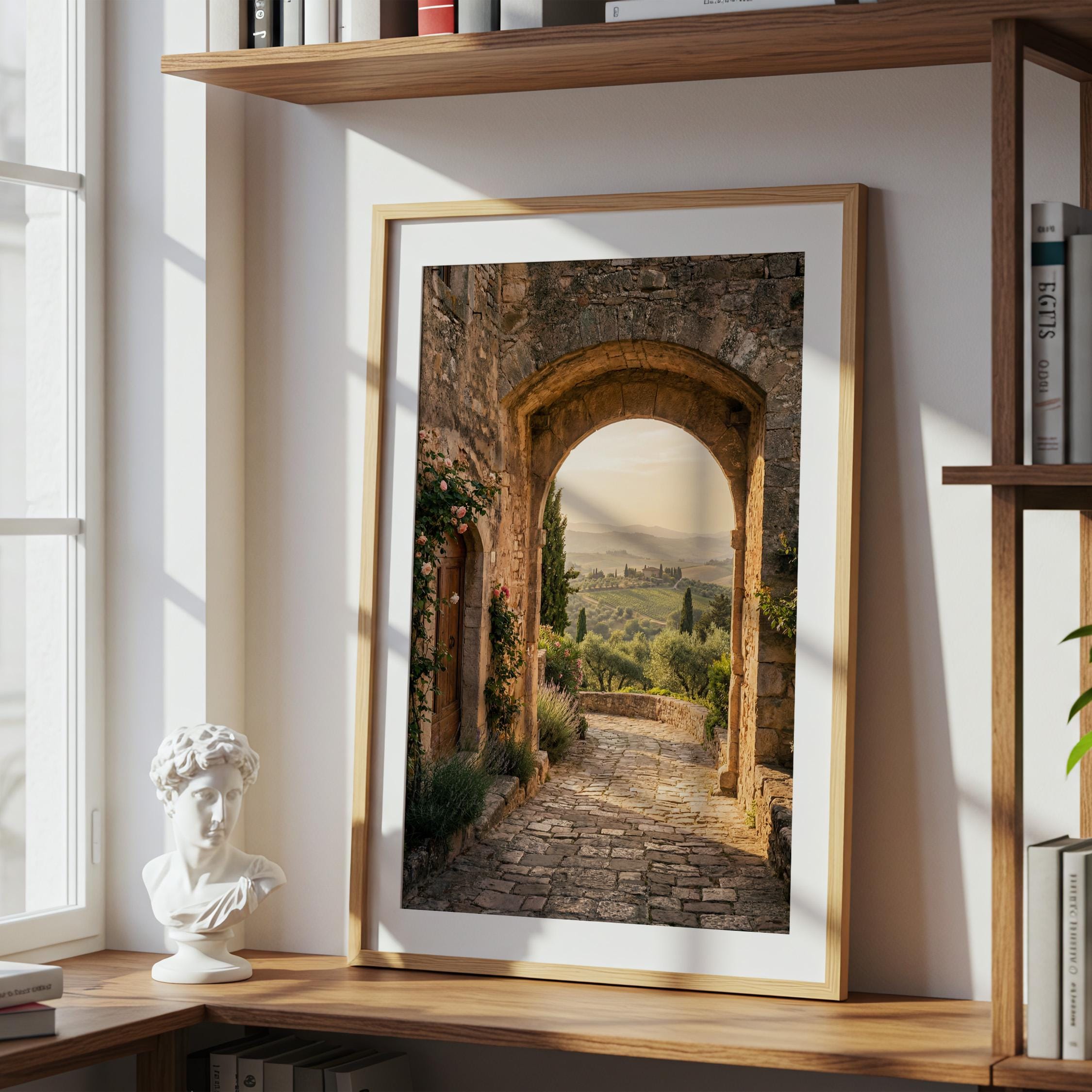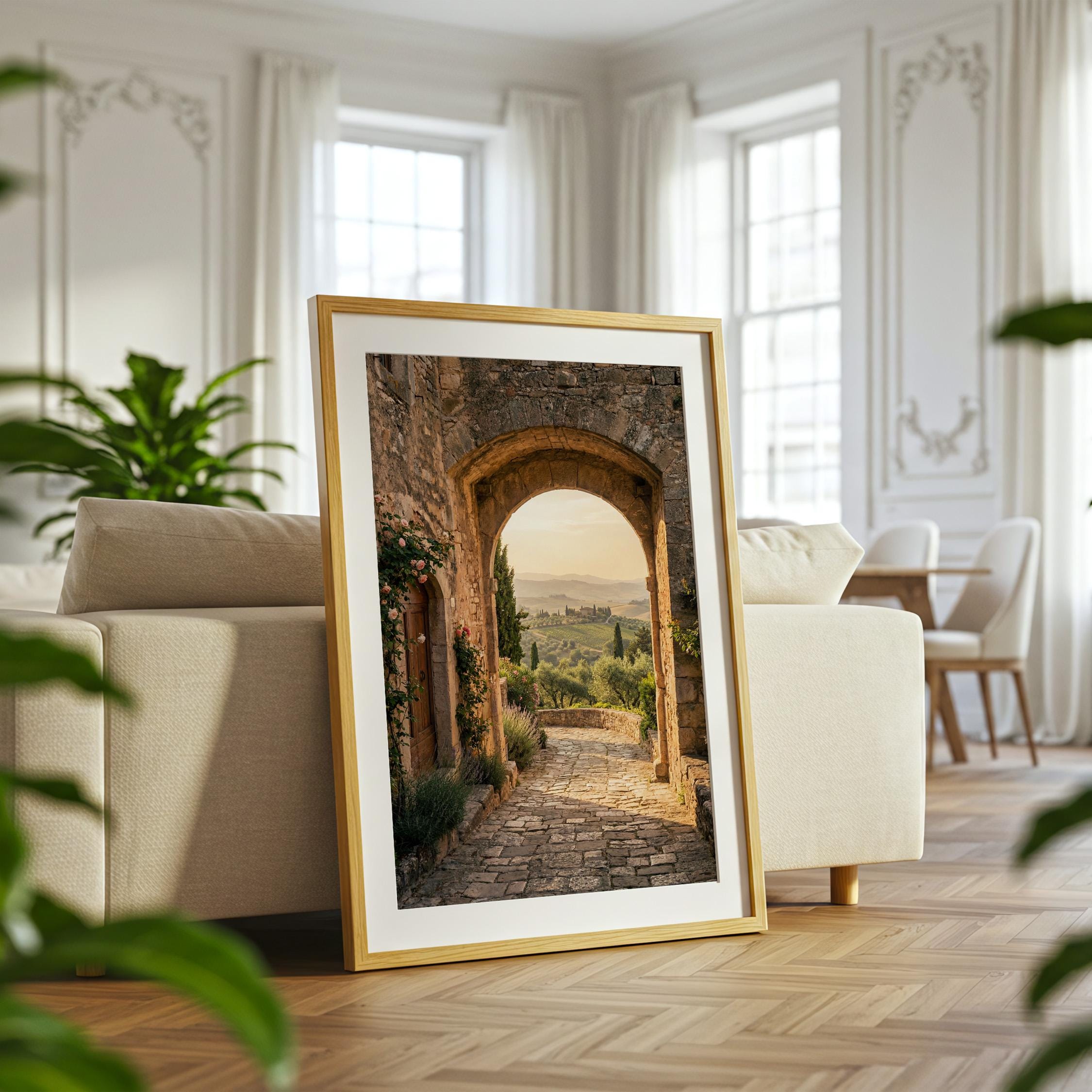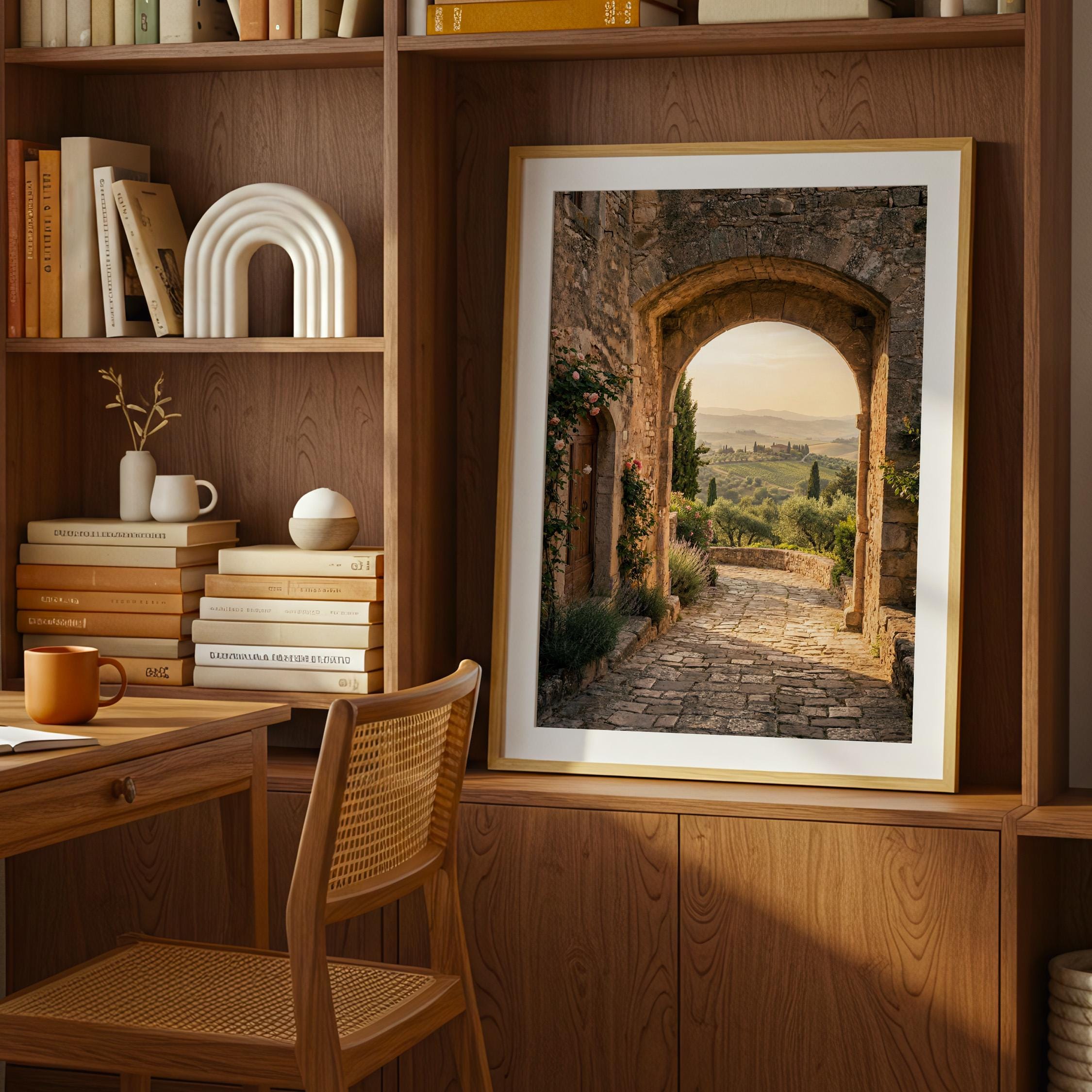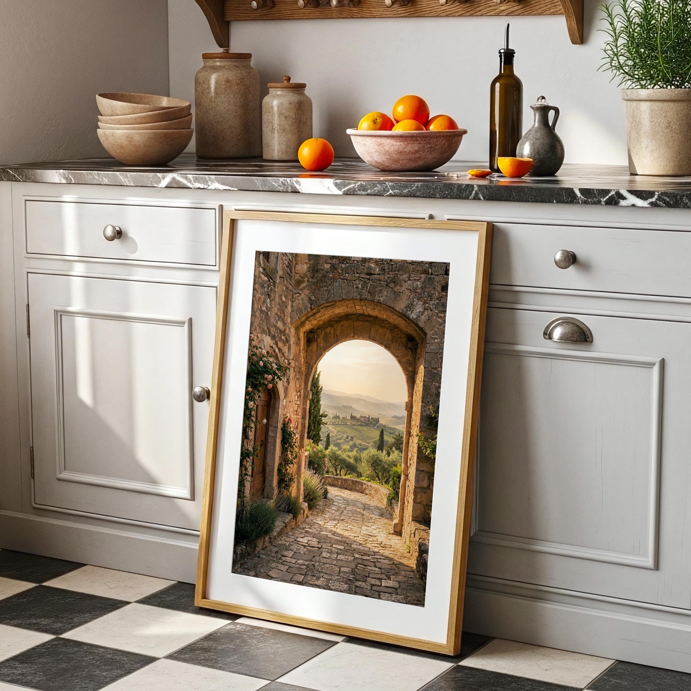 This print captures a quiet golden hour moment in the Italian countryside — warm light washing over cobblestones, olive trees, and distant vineyards. The textured stone arch frames the landscape like an invitation to slow down.