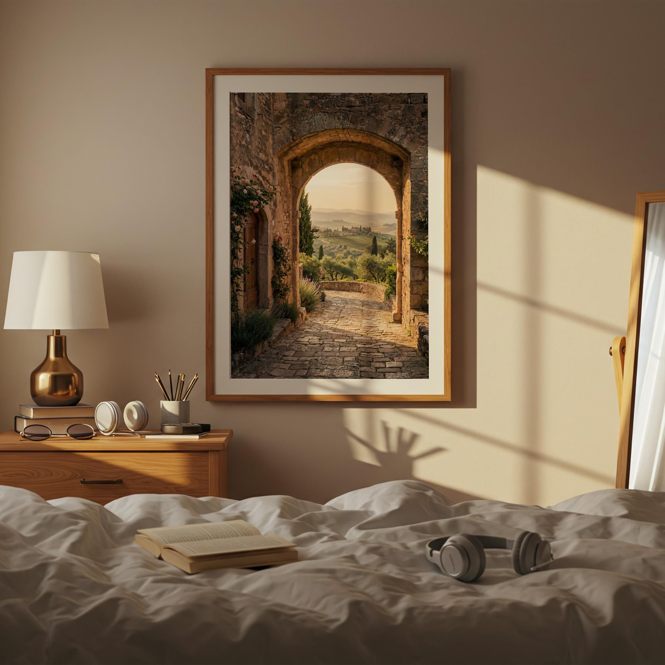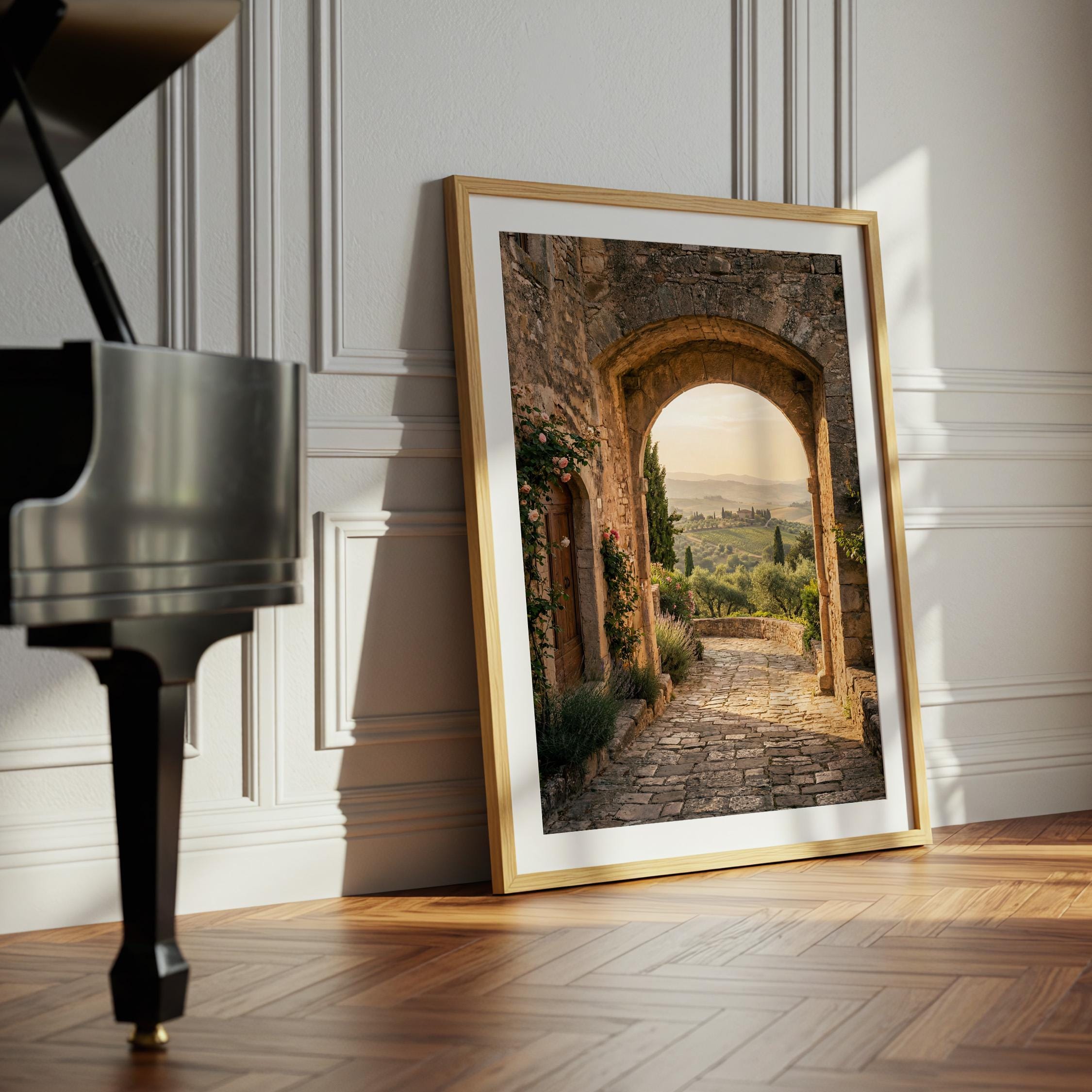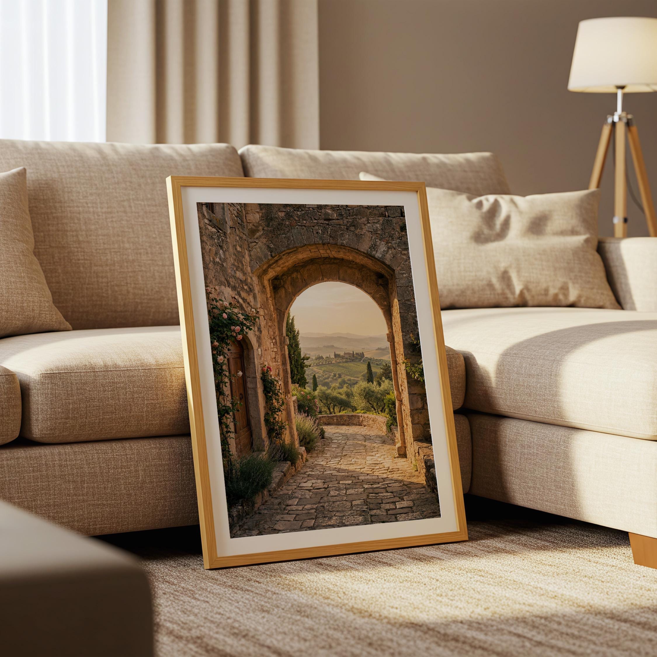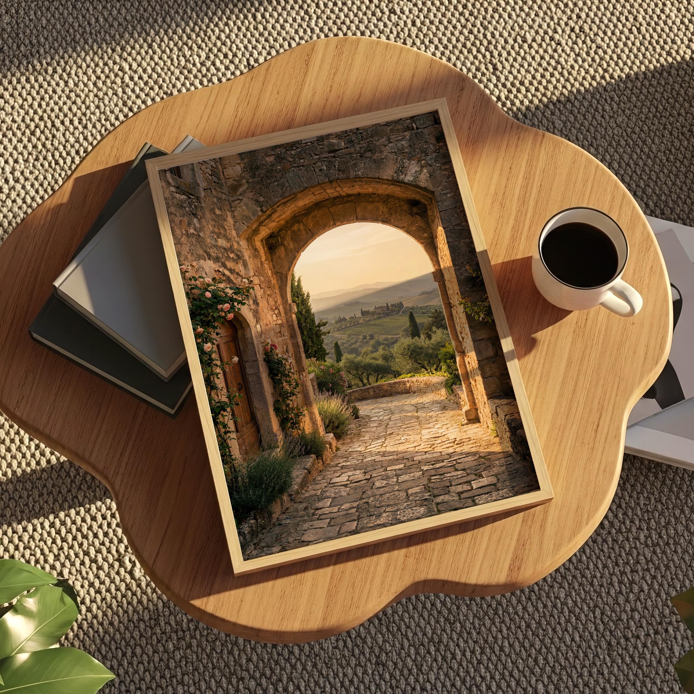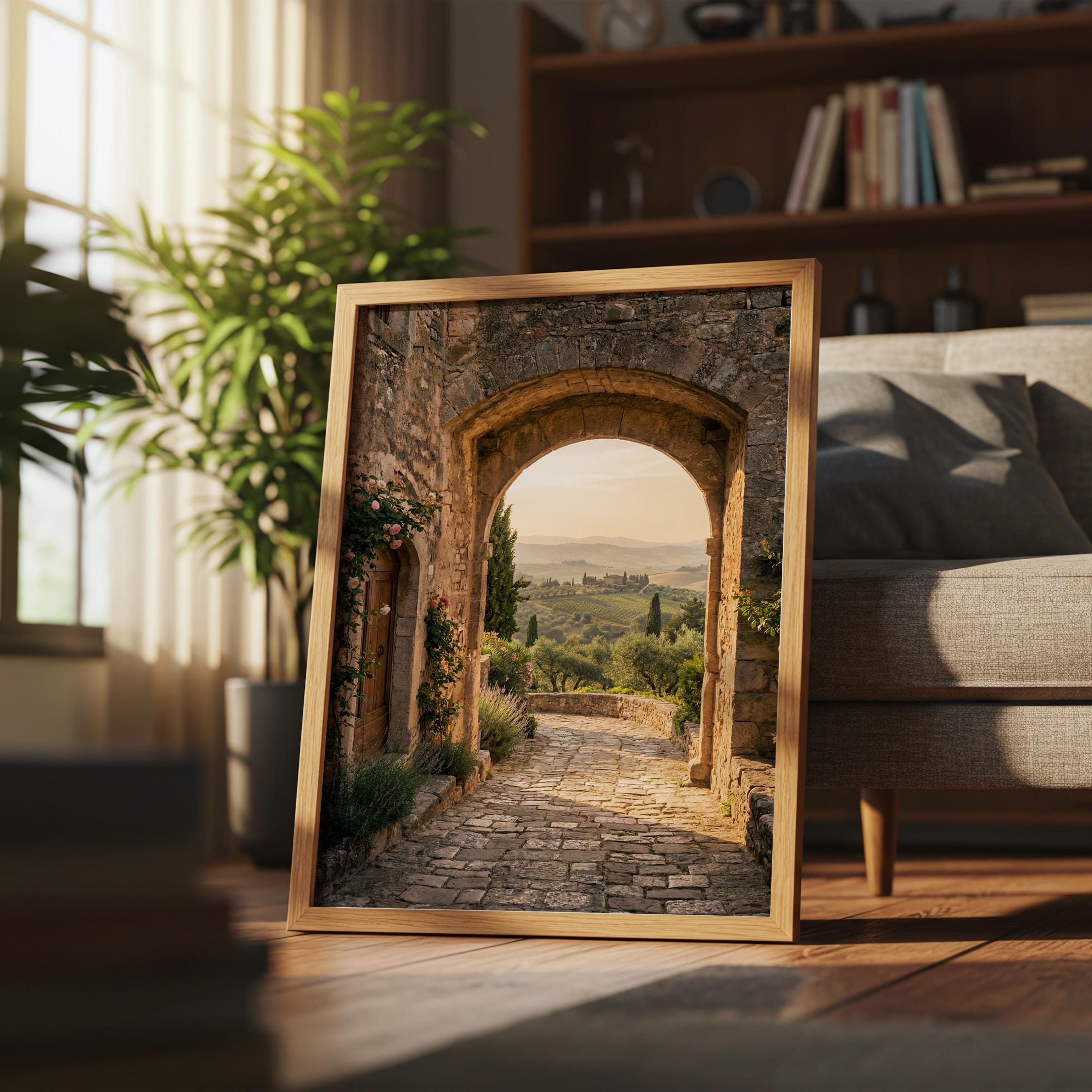 This print captures a quiet golden hour moment in the Italian countryside — warm light washing over cobblestones, olive trees, and distant vineyards. The textured stone arch frames the landscape like an invitation to slow down.