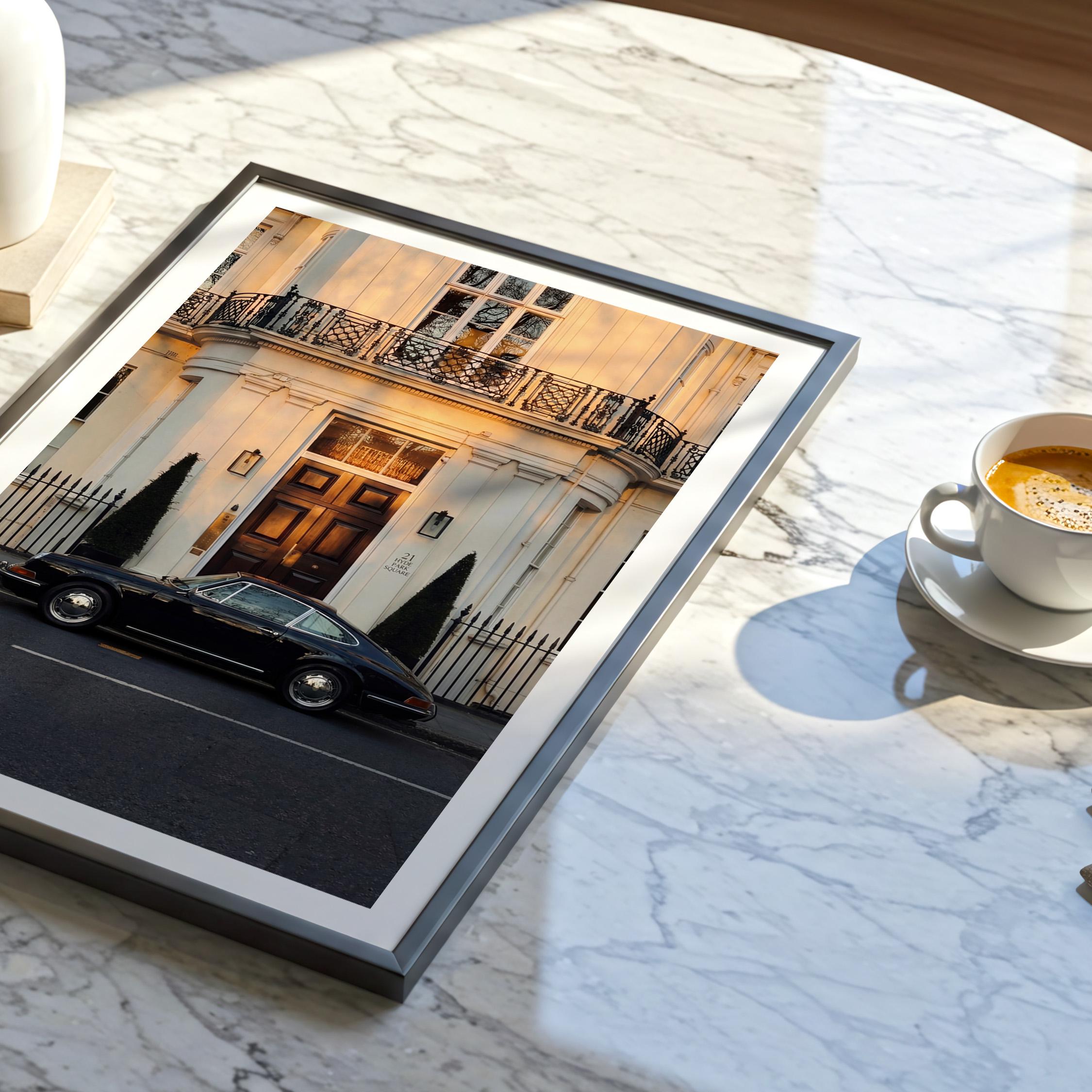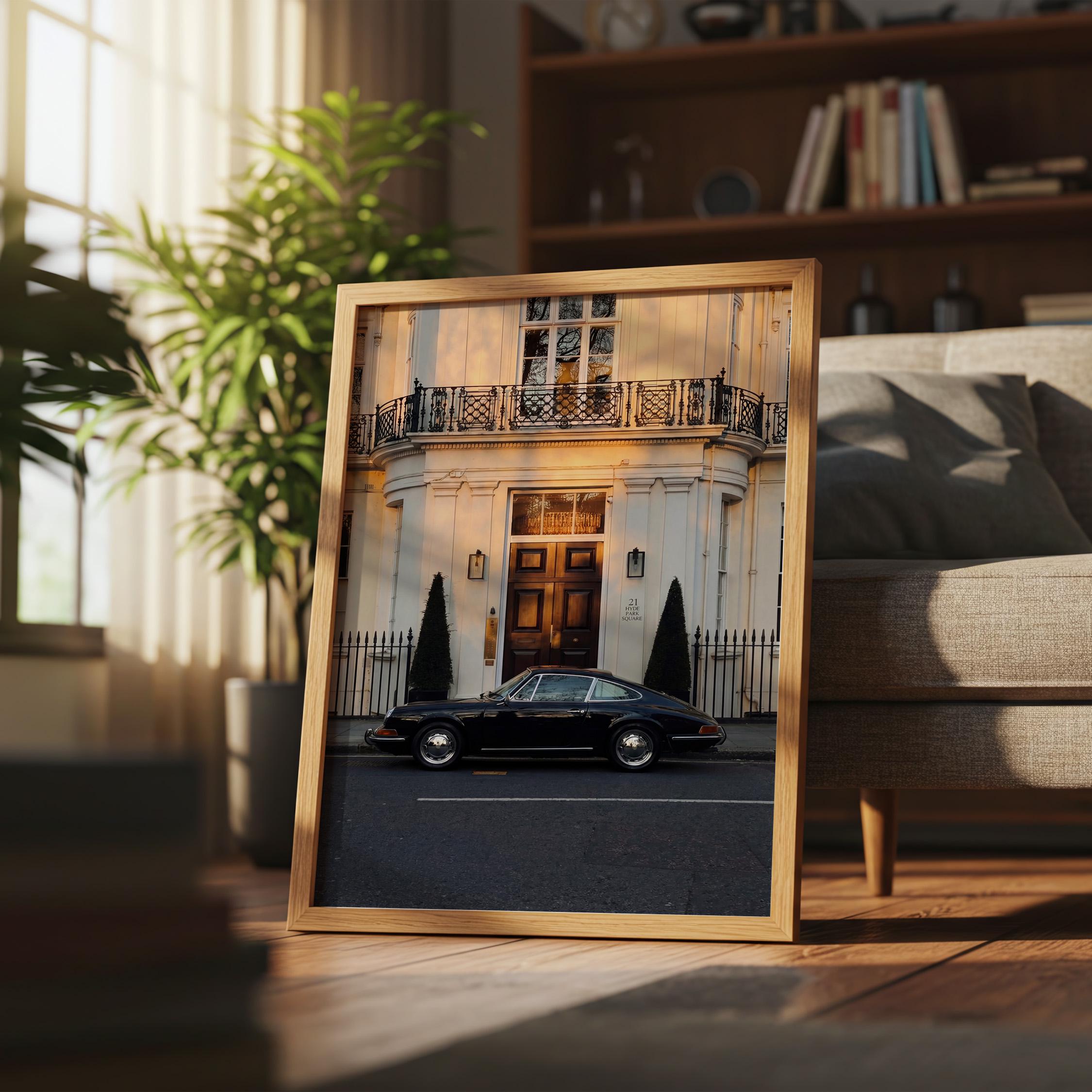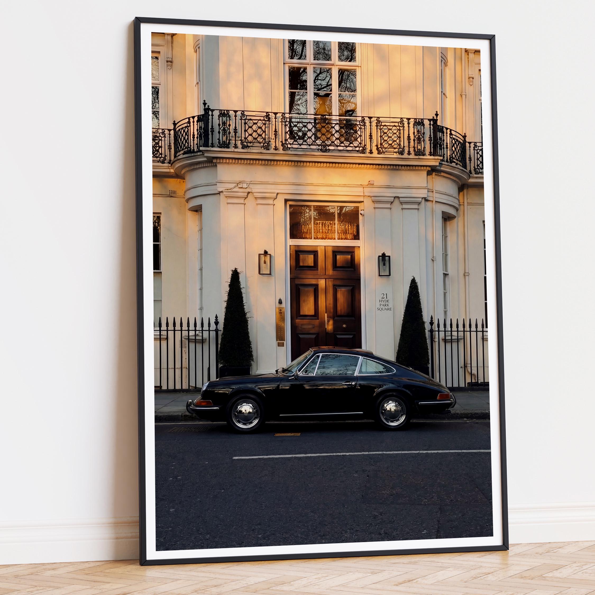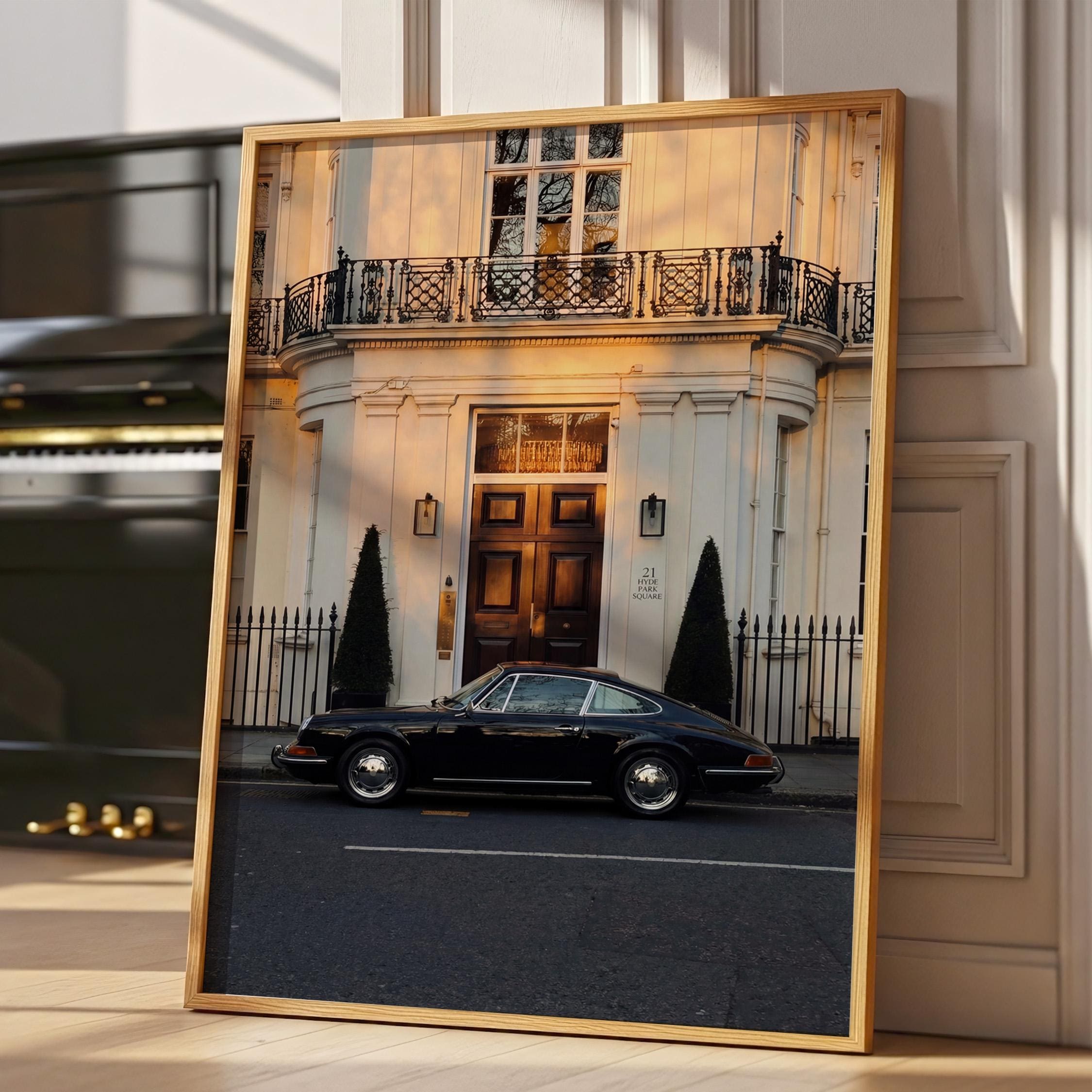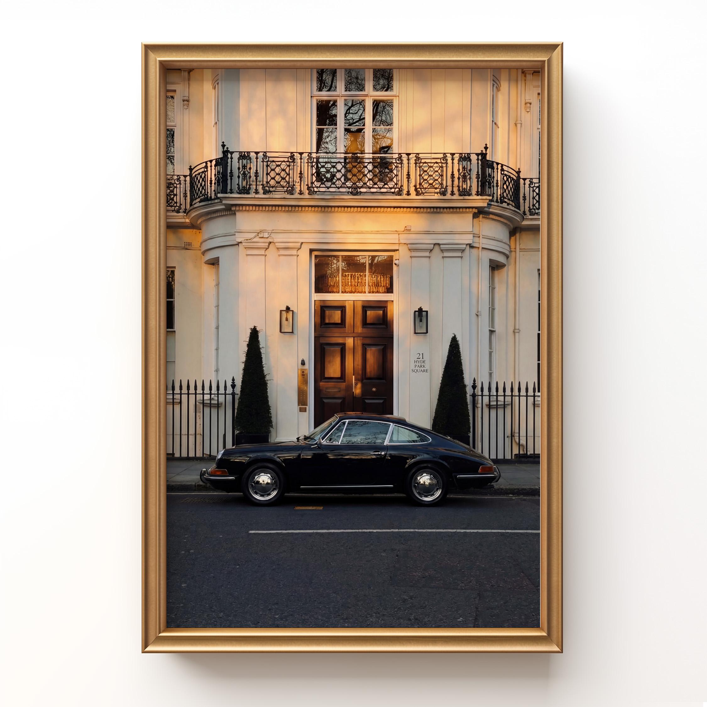 A black Porsche 911 rests quietly outside a classic London townhouse near Hyde Park. The clean white façade, iron balcony, and warm interior glow create a scene of understated British elegance.