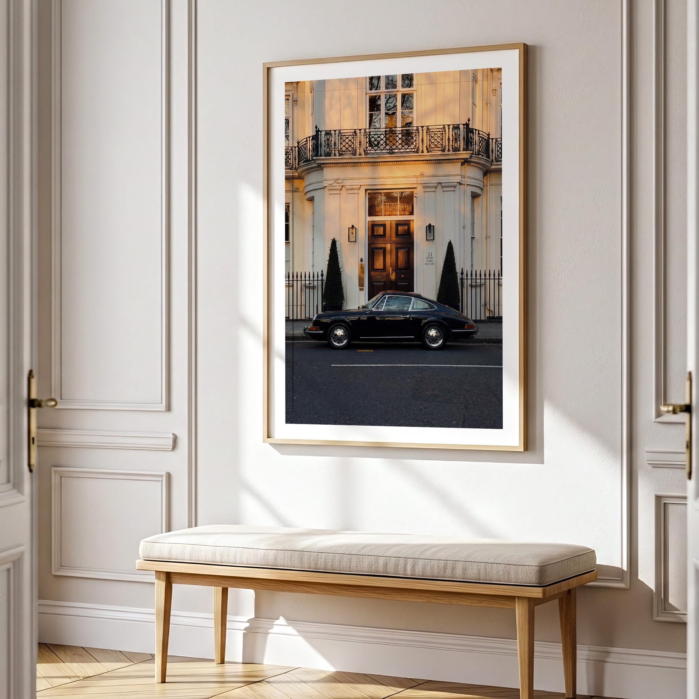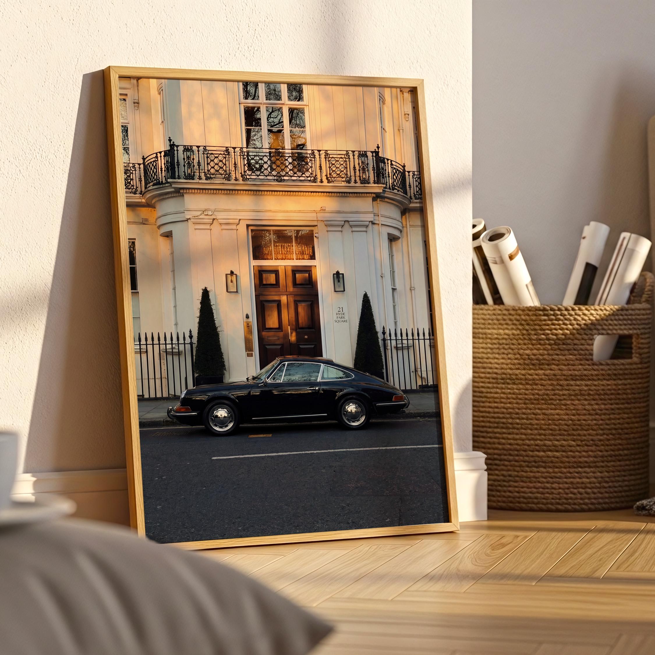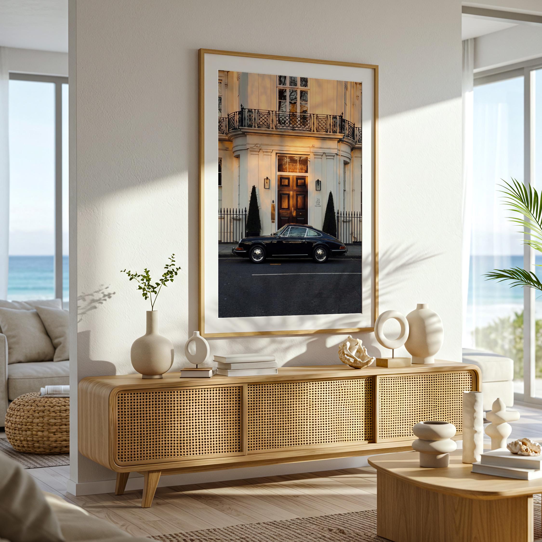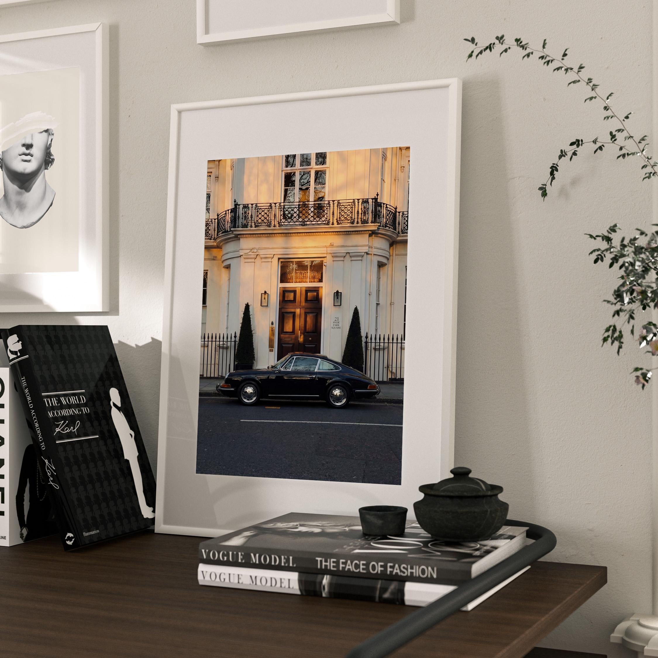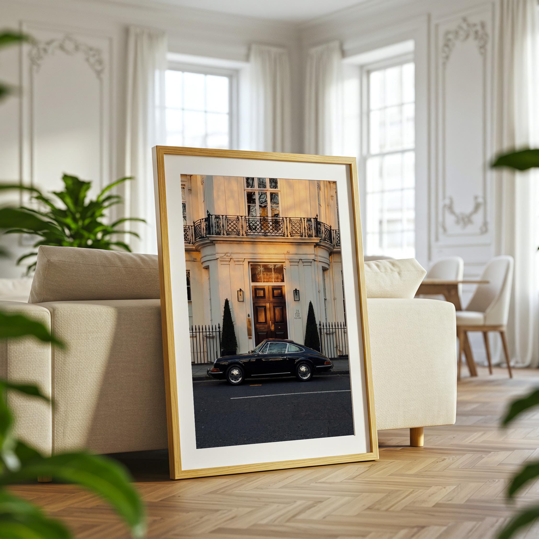 A black Porsche 911 rests quietly outside a classic London townhouse near Hyde Park. The clean white façade, iron balcony, and warm interior glow create a scene of understated British elegance.