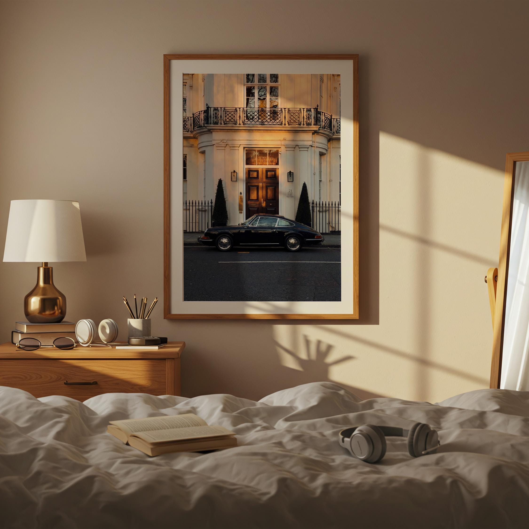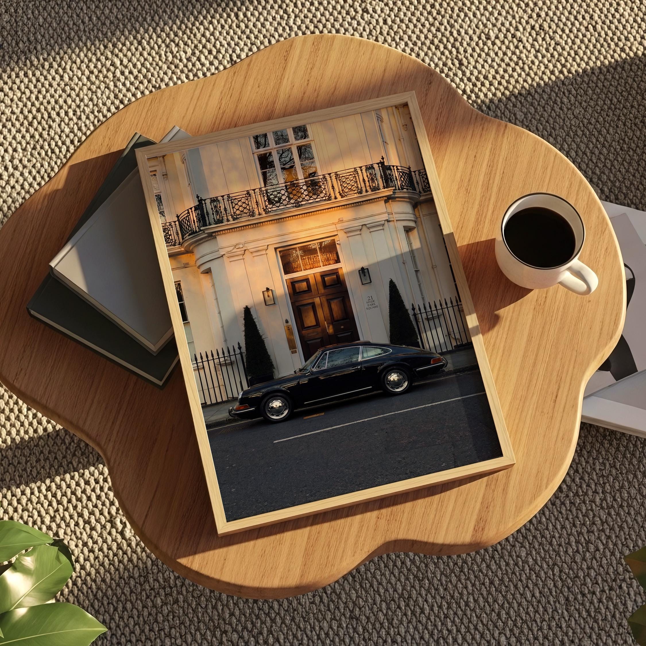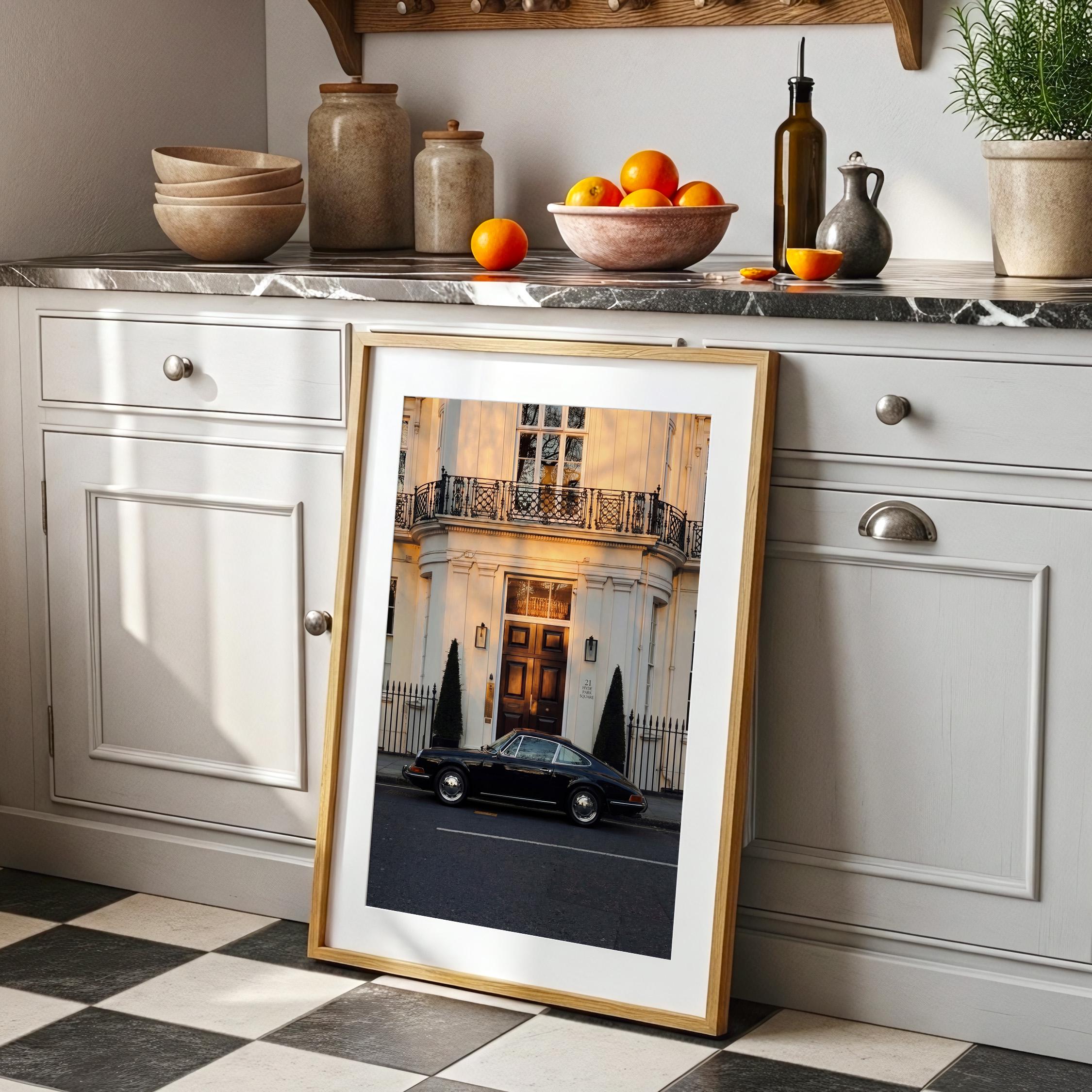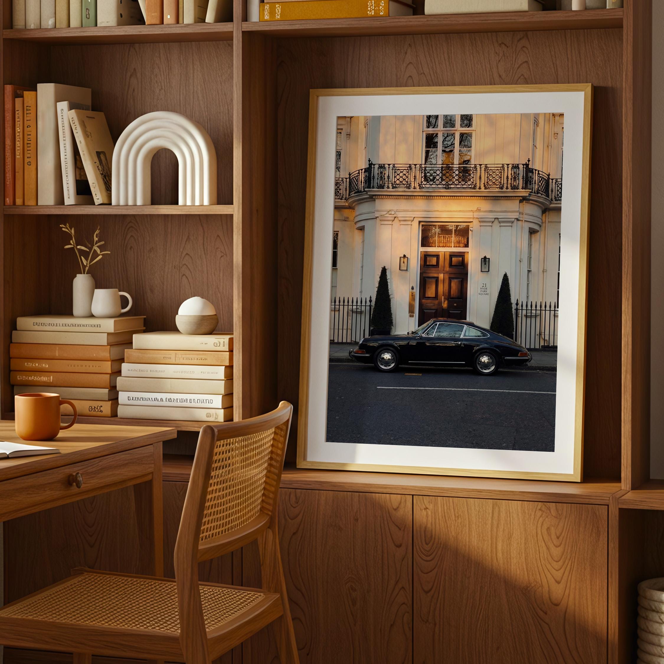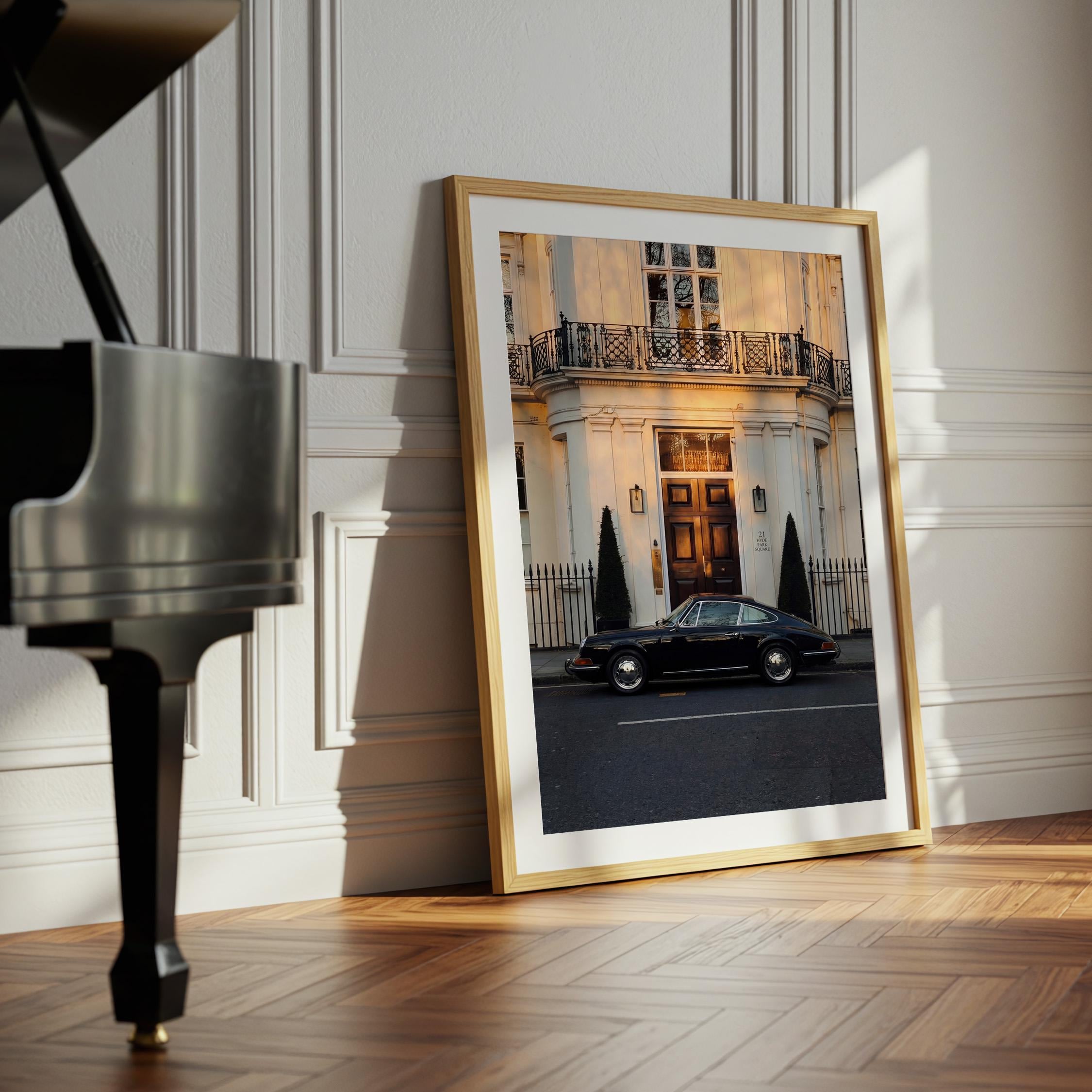 A black Porsche 911 rests quietly outside a classic London townhouse near Hyde Park. The clean white façade, iron balcony, and warm interior glow create a scene of understated British elegance.