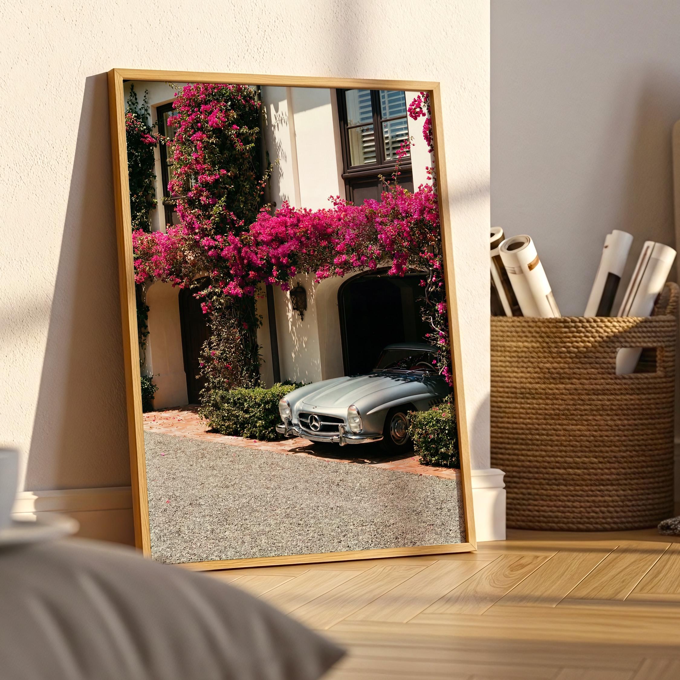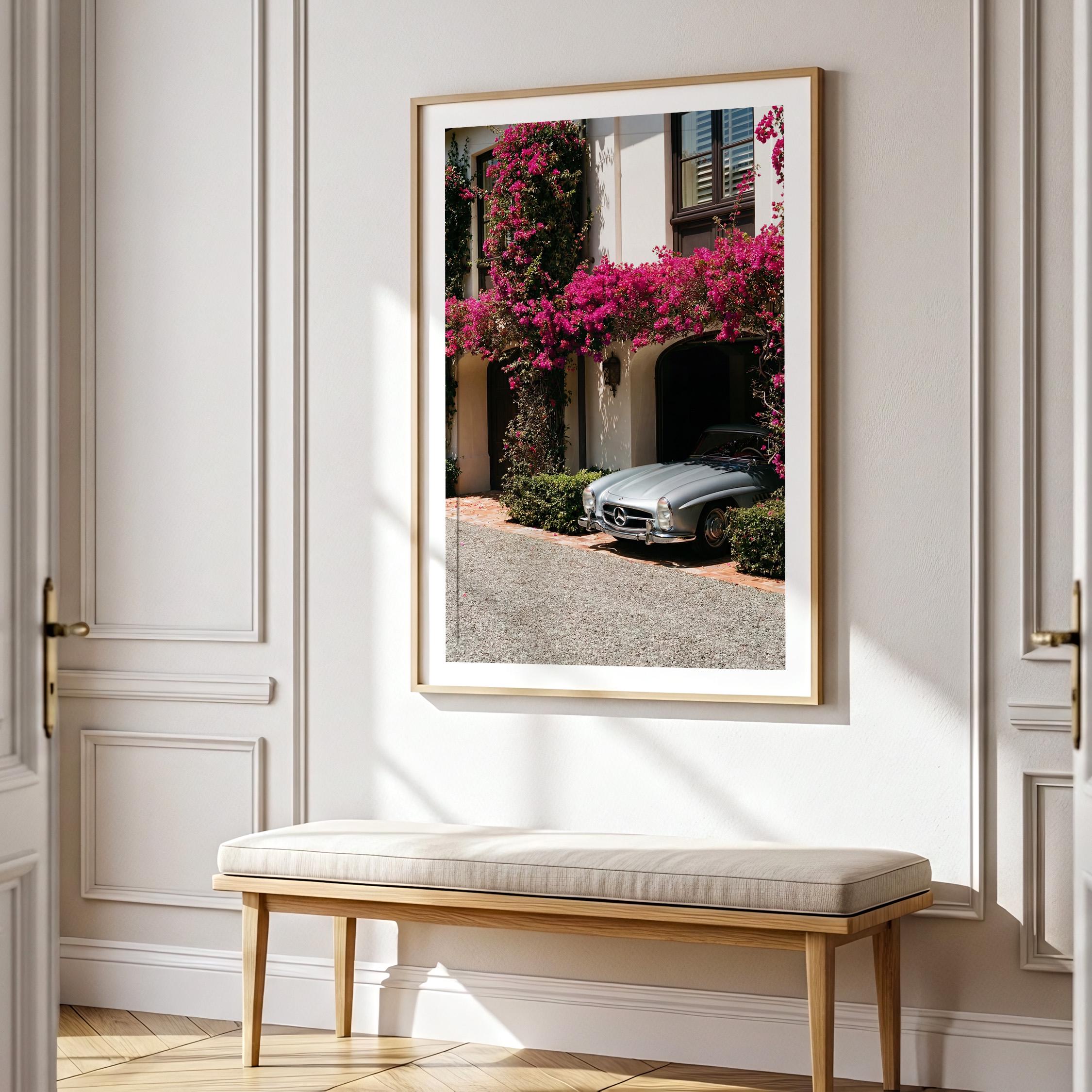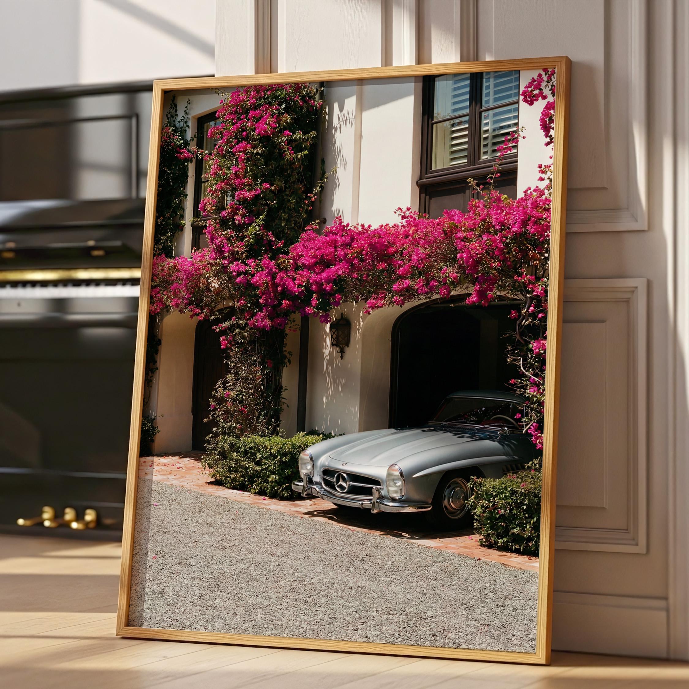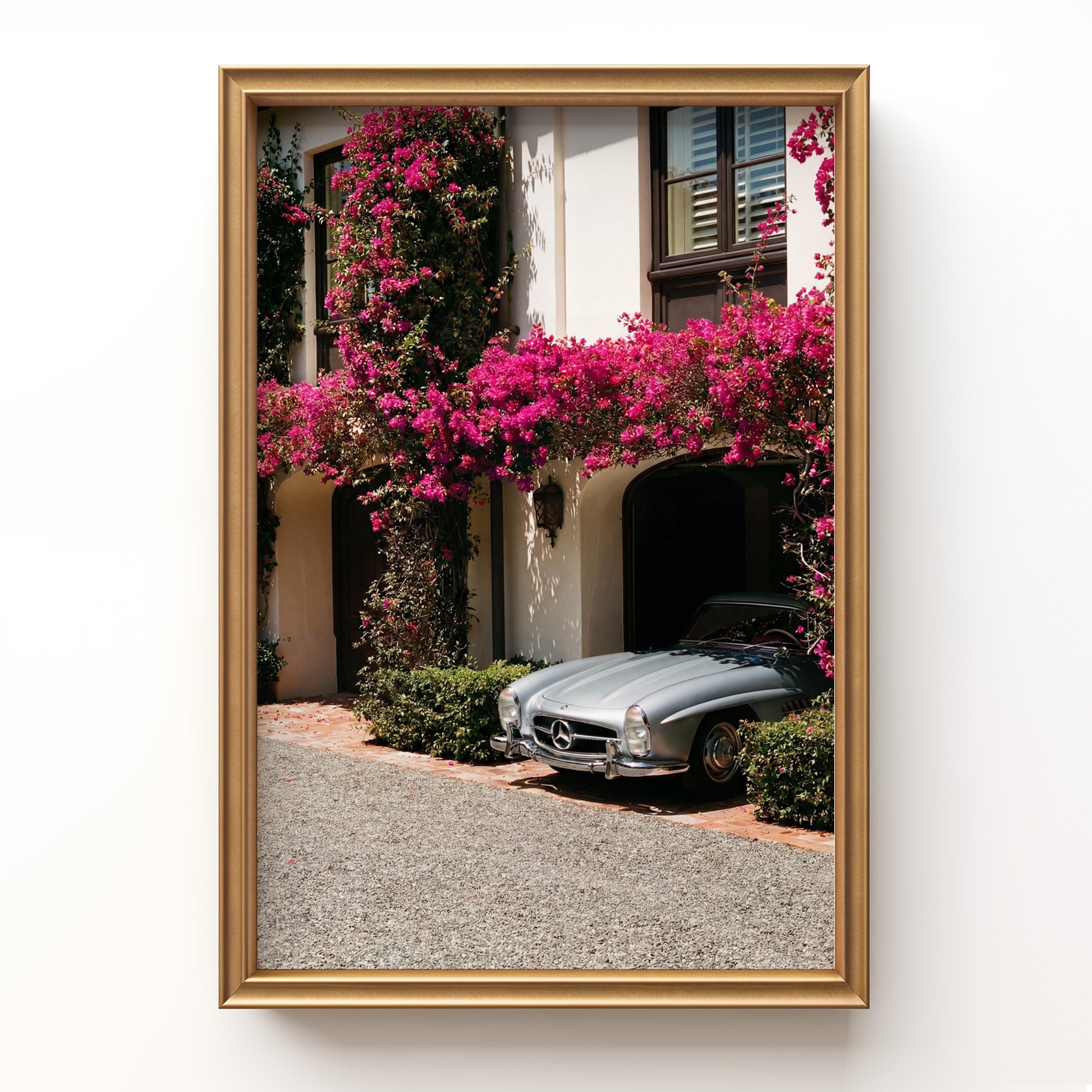 A classic Mercedes 300SL rests beneath cascading bougainvillea, framed by the warm stone façade of a Mediterranean villa.
