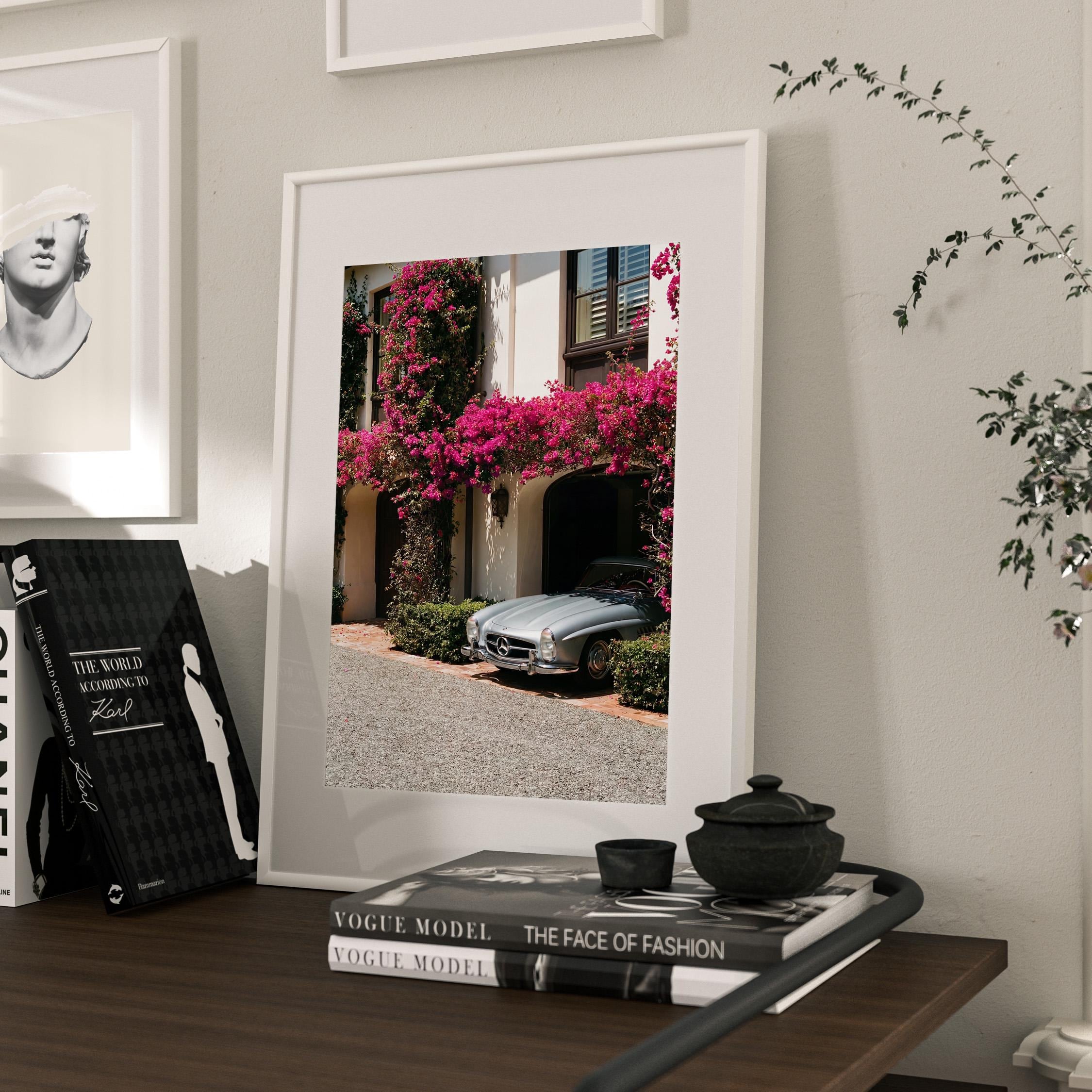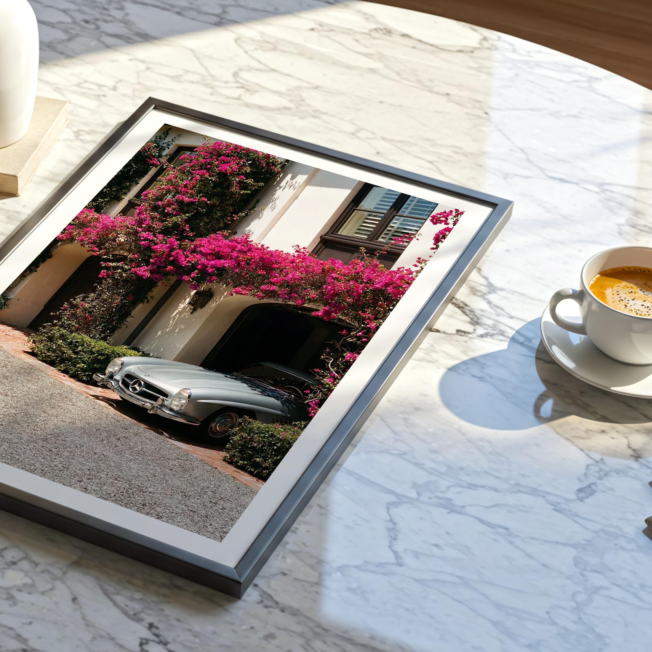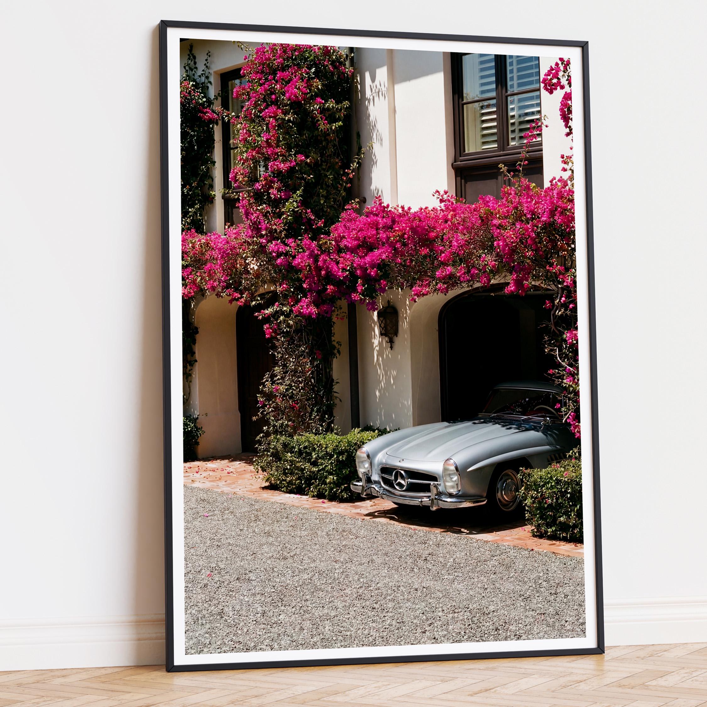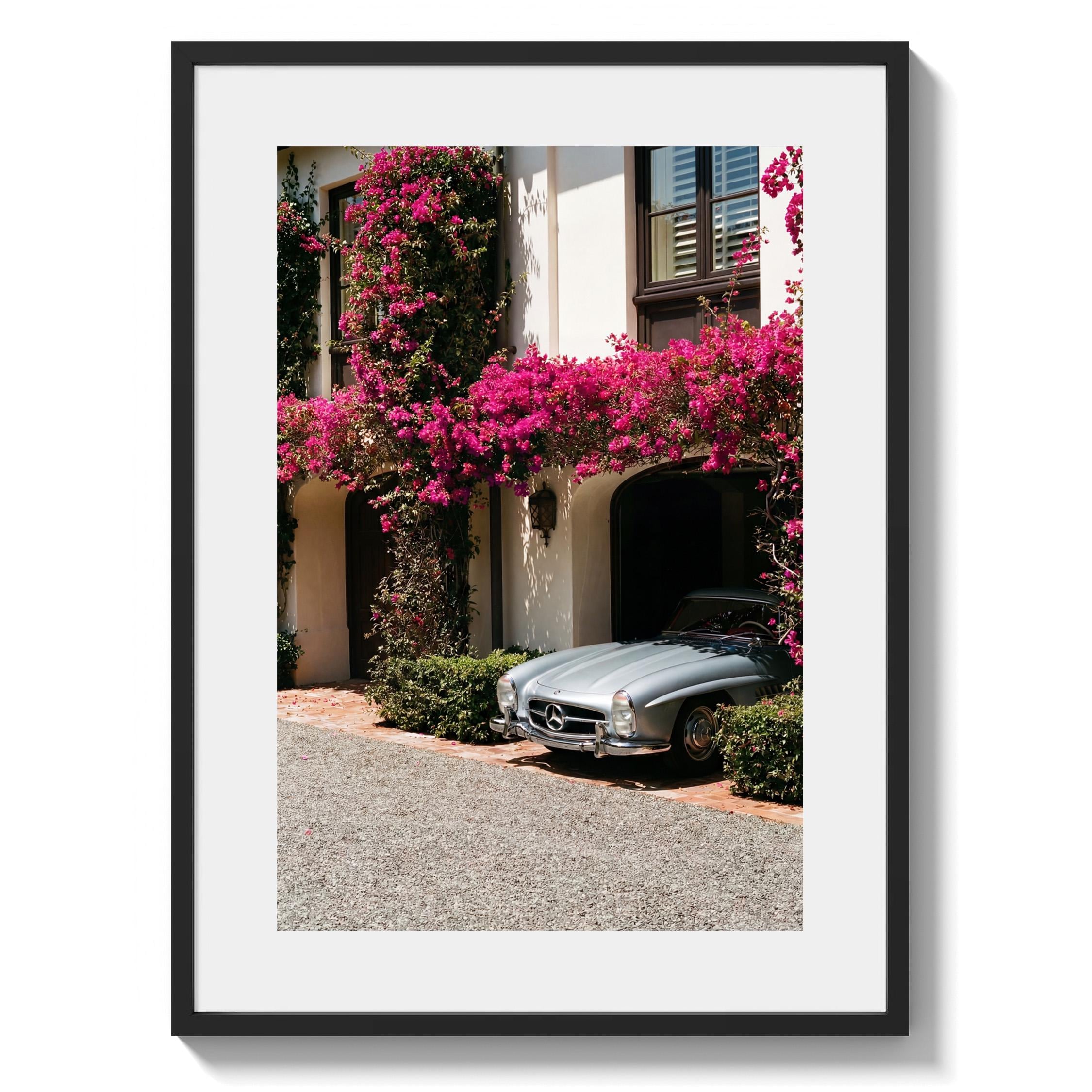 A classic Mercedes 300SL rests beneath cascading bougainvillea, framed by the warm stone façade of a Mediterranean villa.