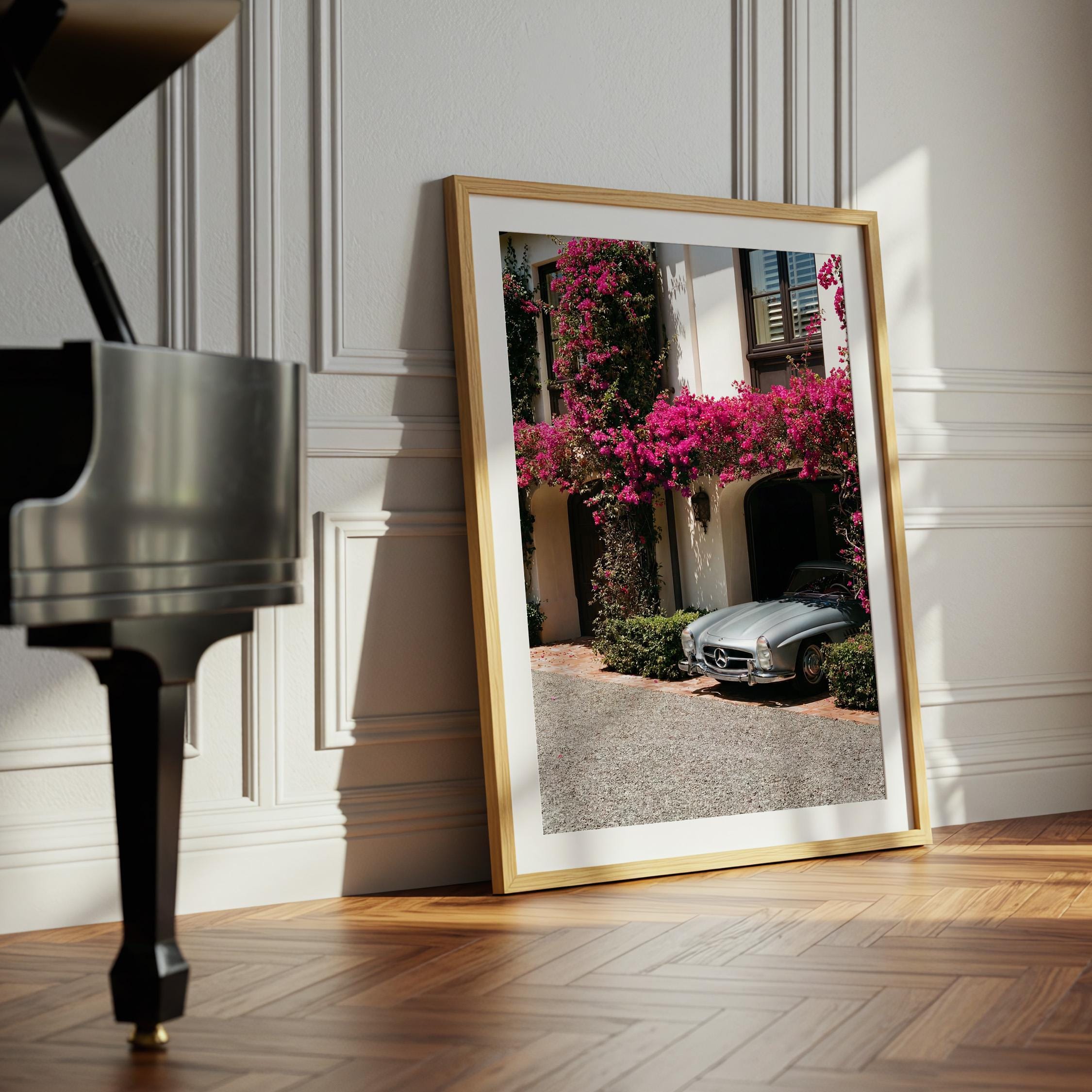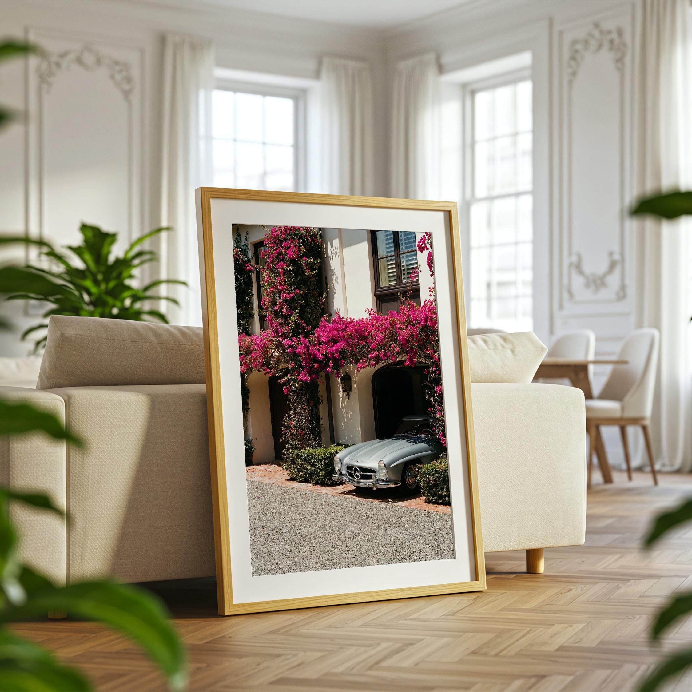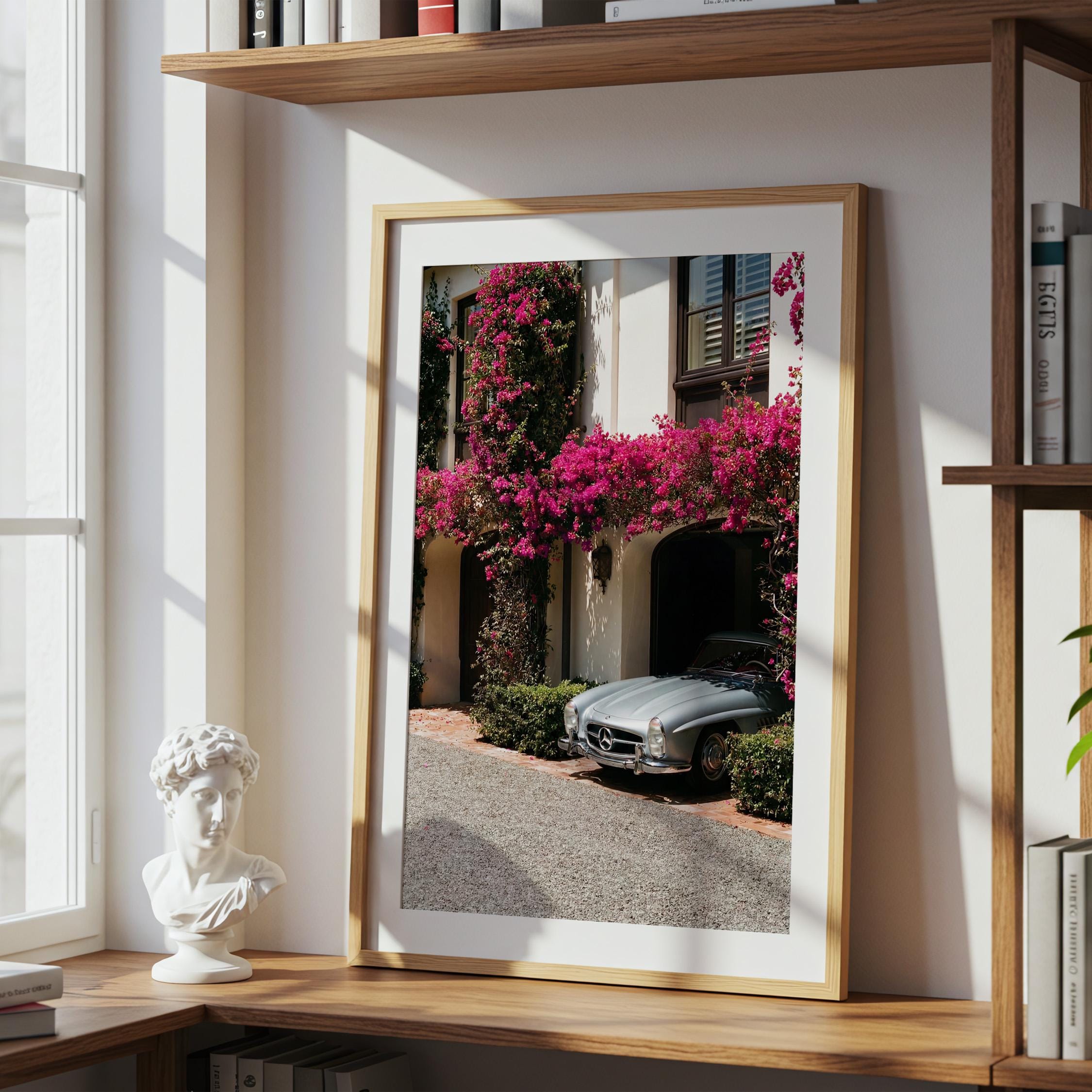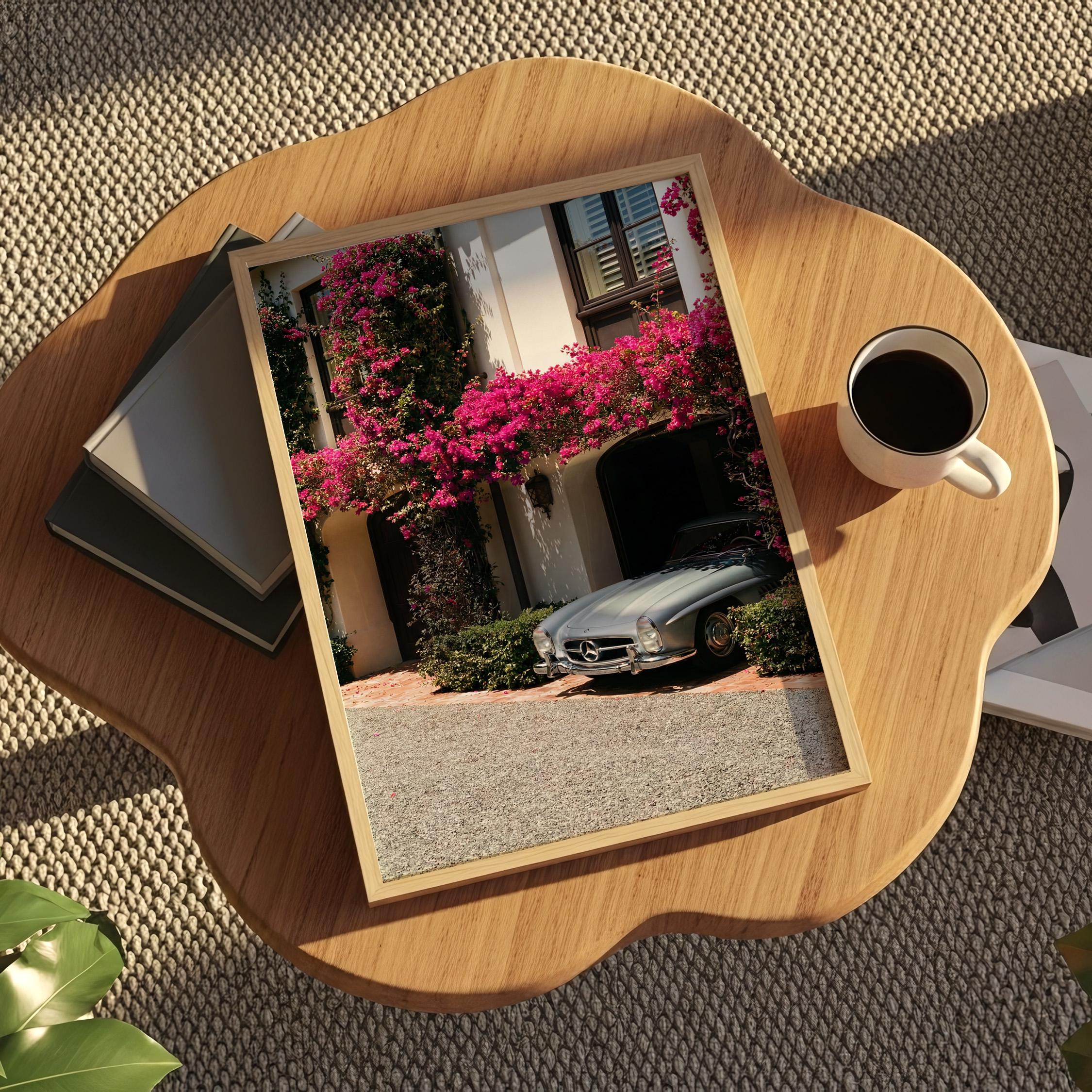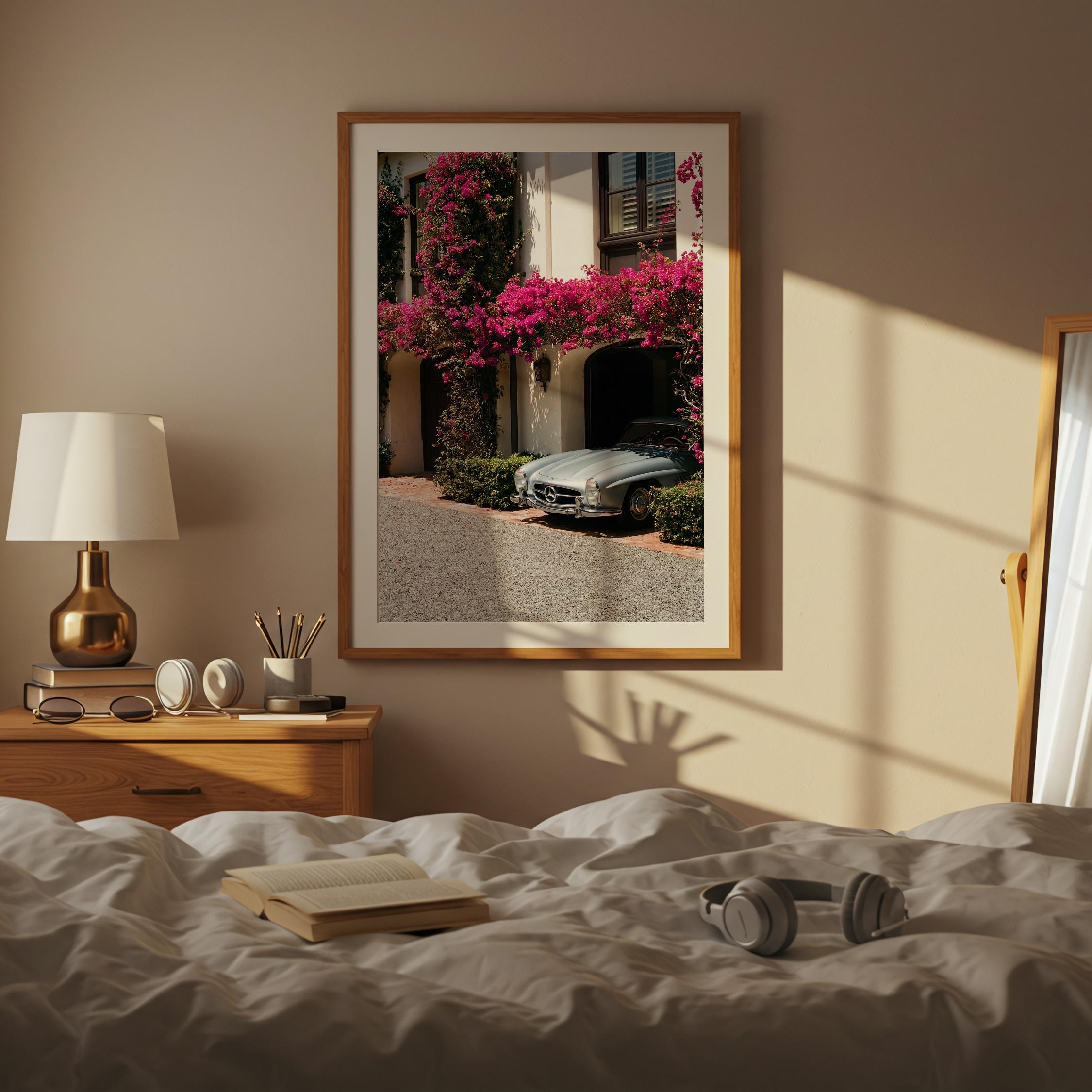 A classic Mercedes 300SL rests beneath cascading bougainvillea, framed by the warm stone façade of a Mediterranean villa.