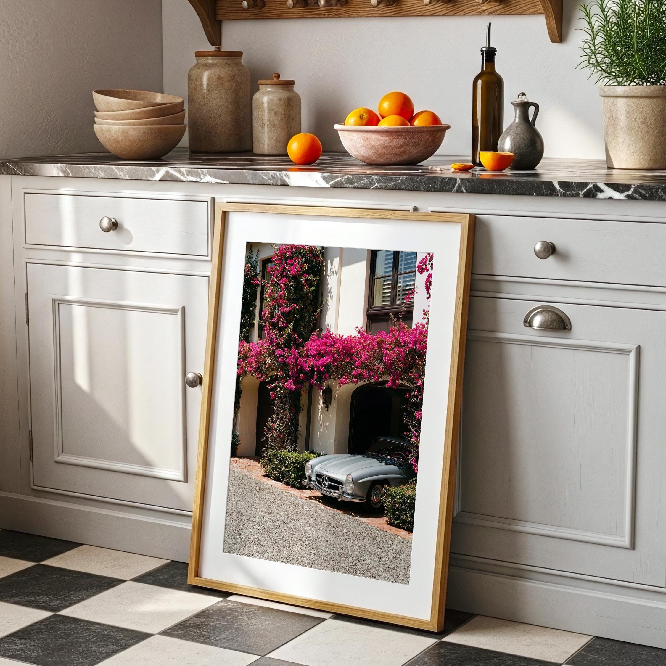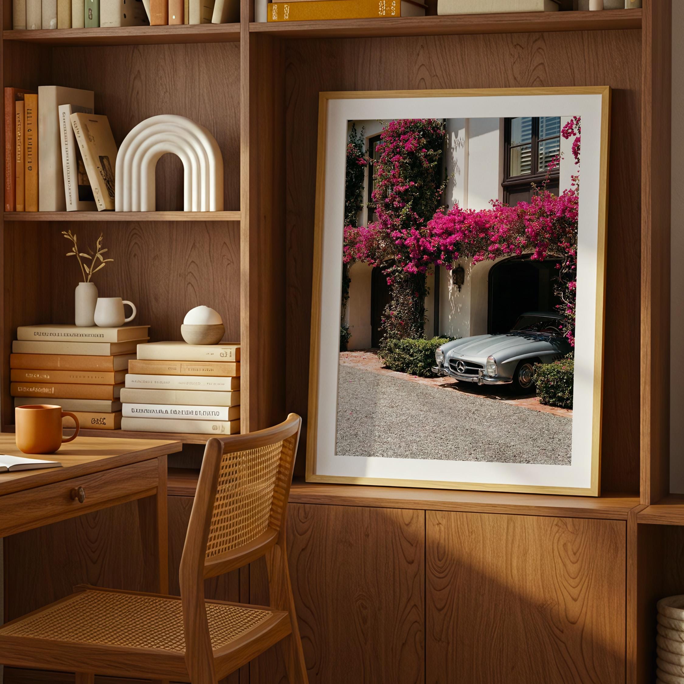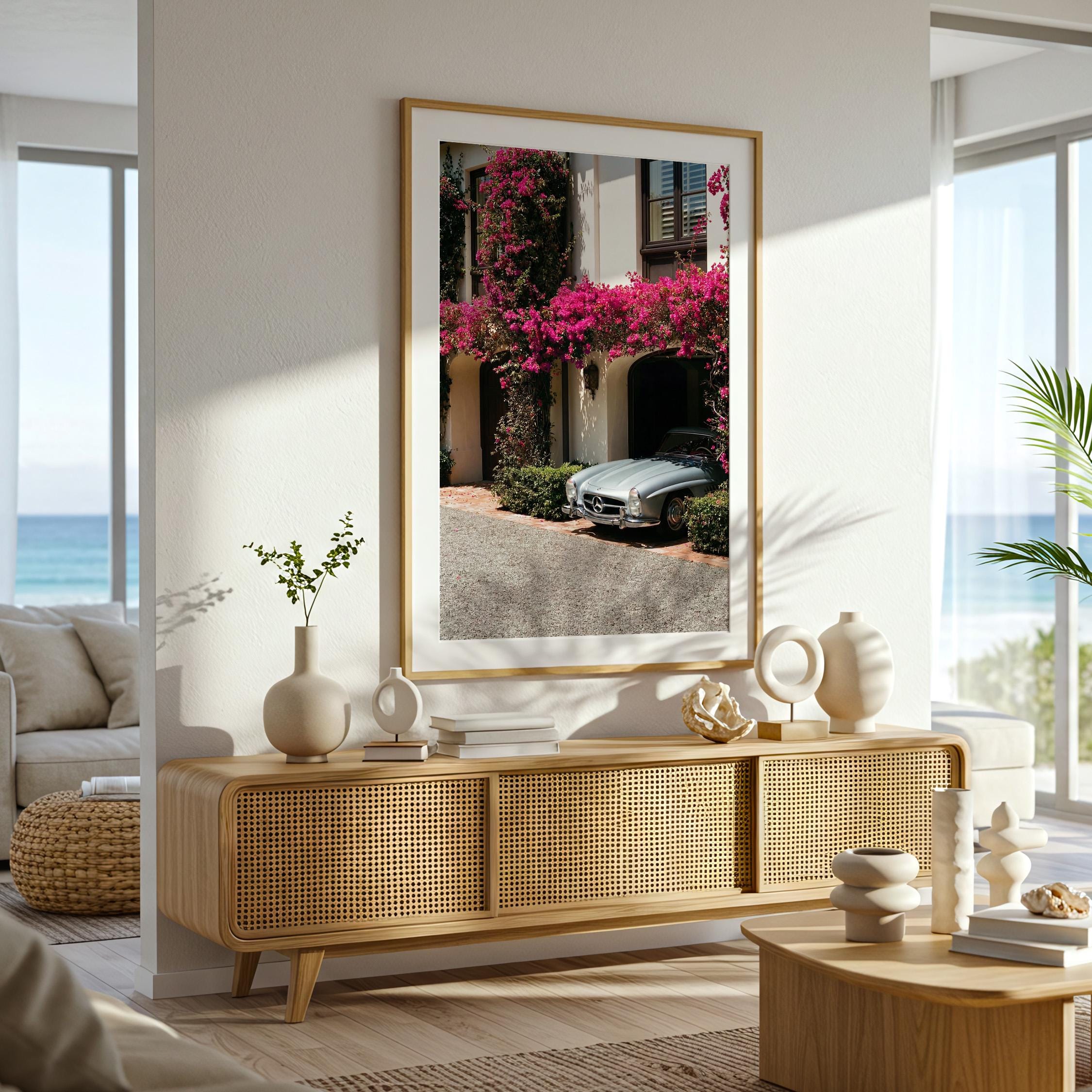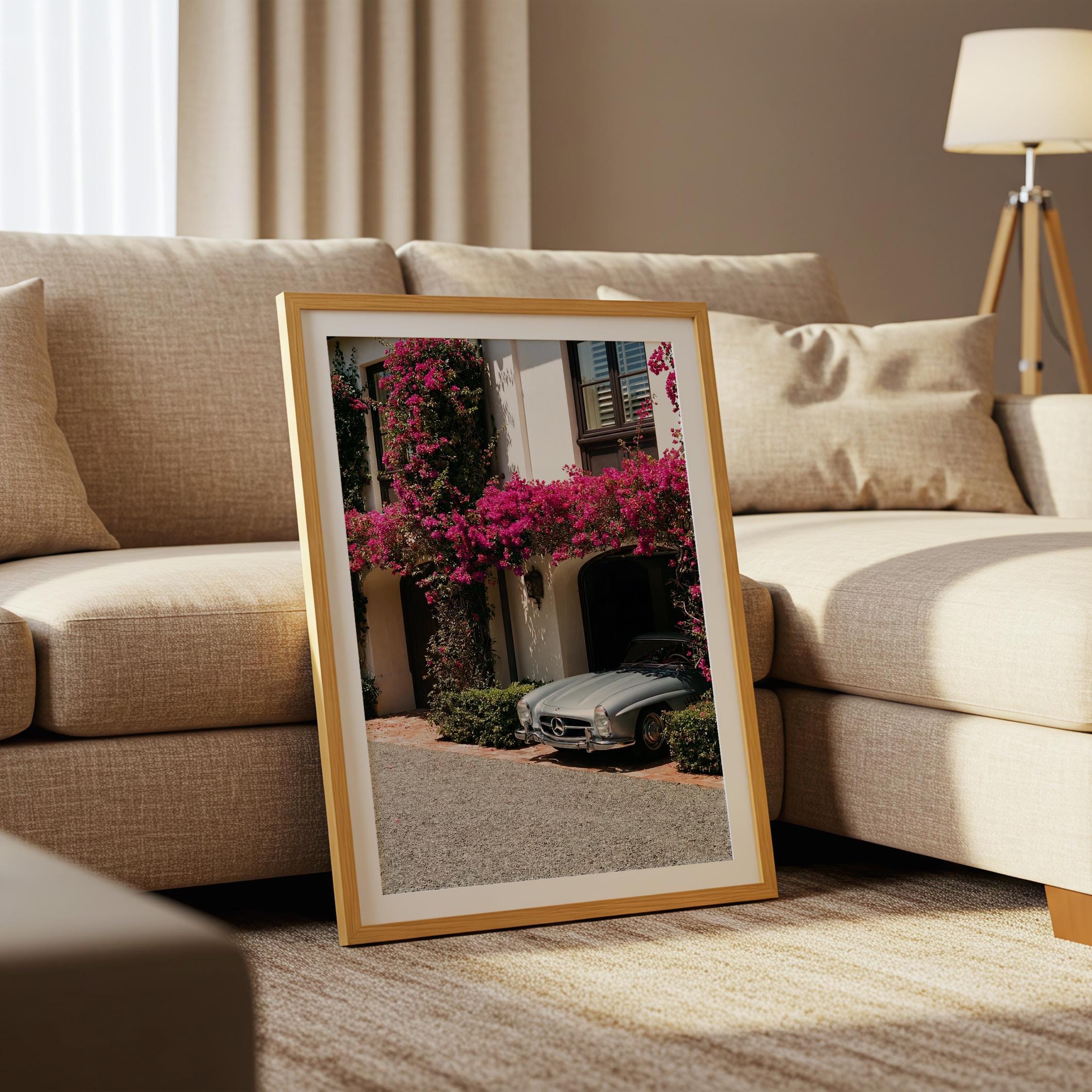 A classic Mercedes 300SL rests beneath cascading bougainvillea, framed by the warm stone façade of a Mediterranean villa.
