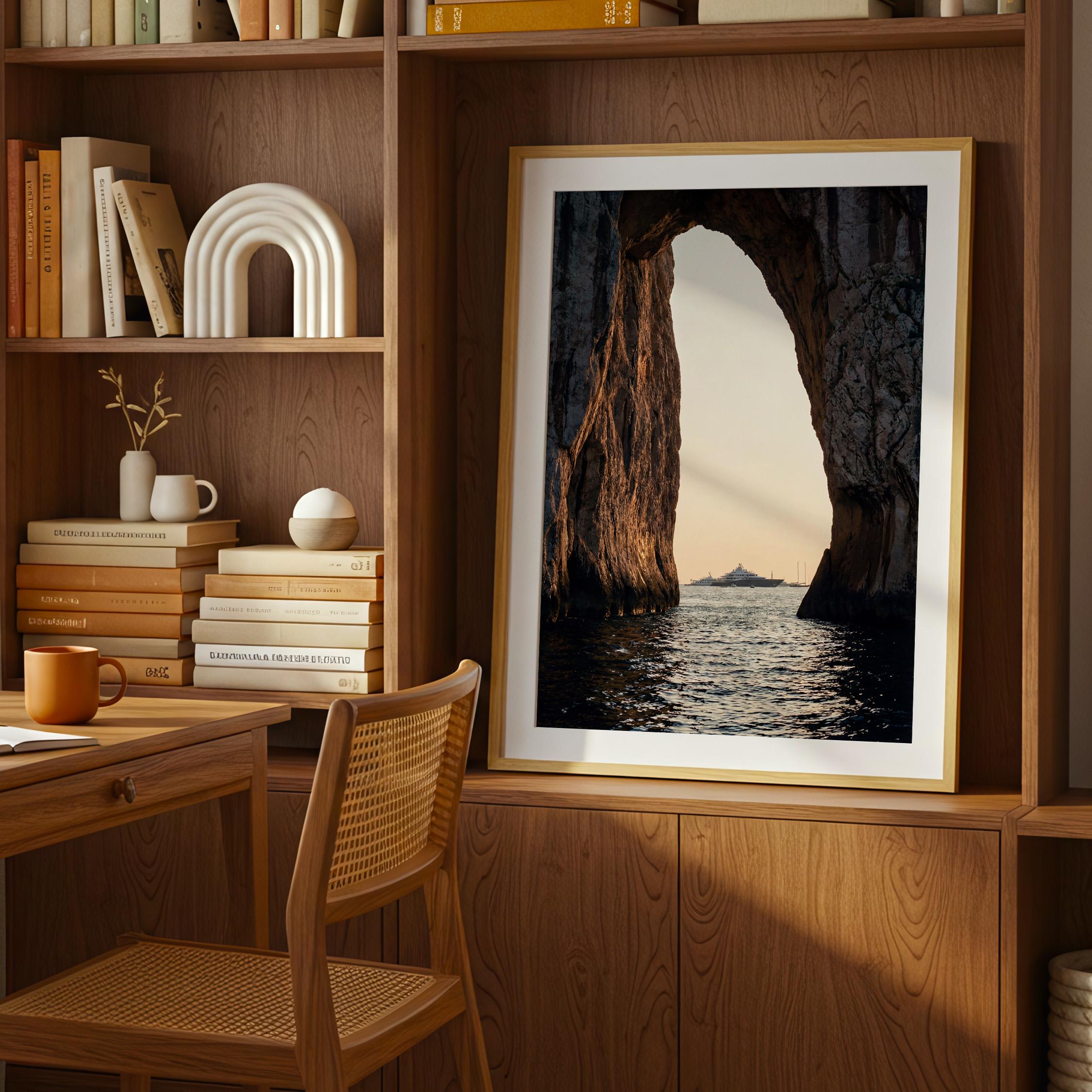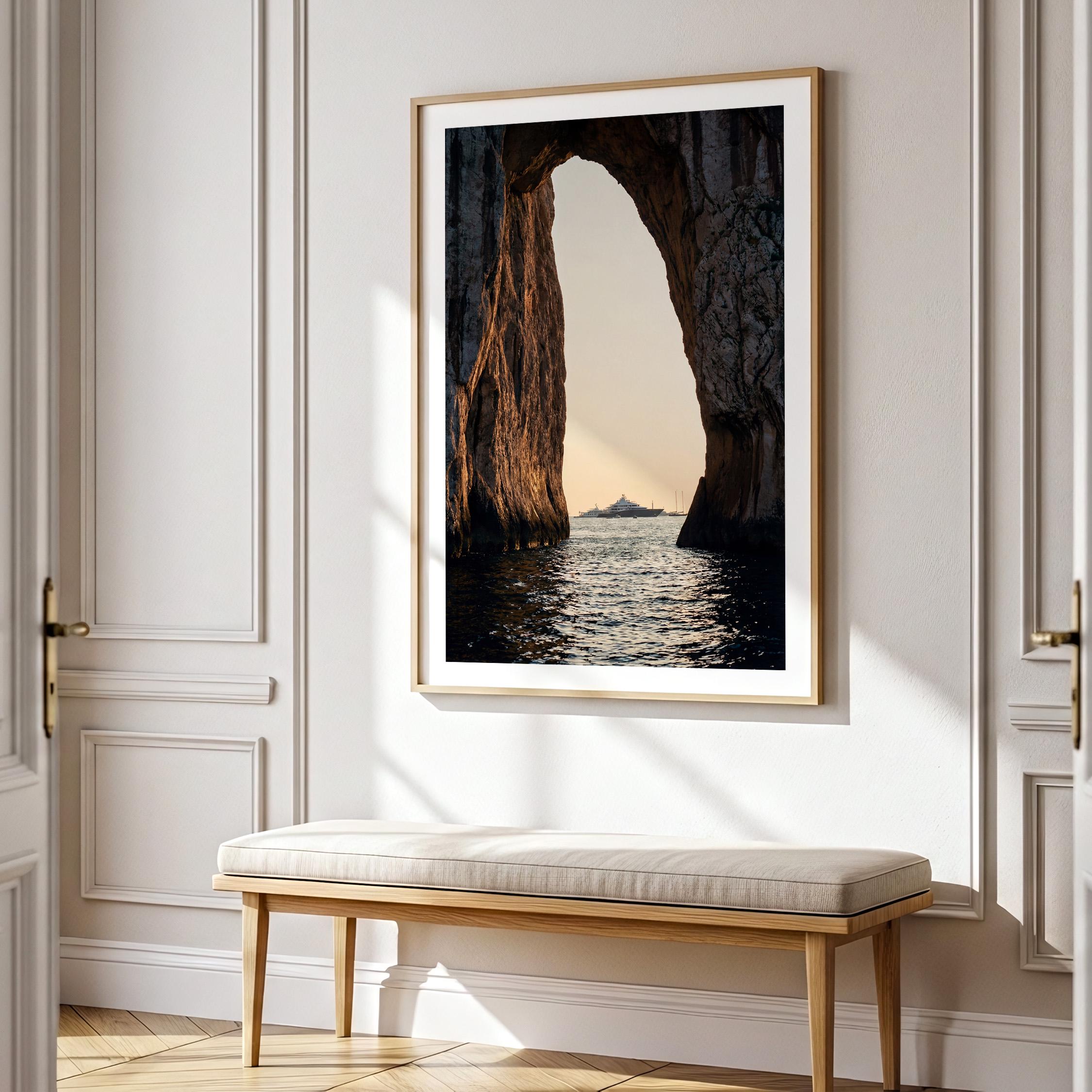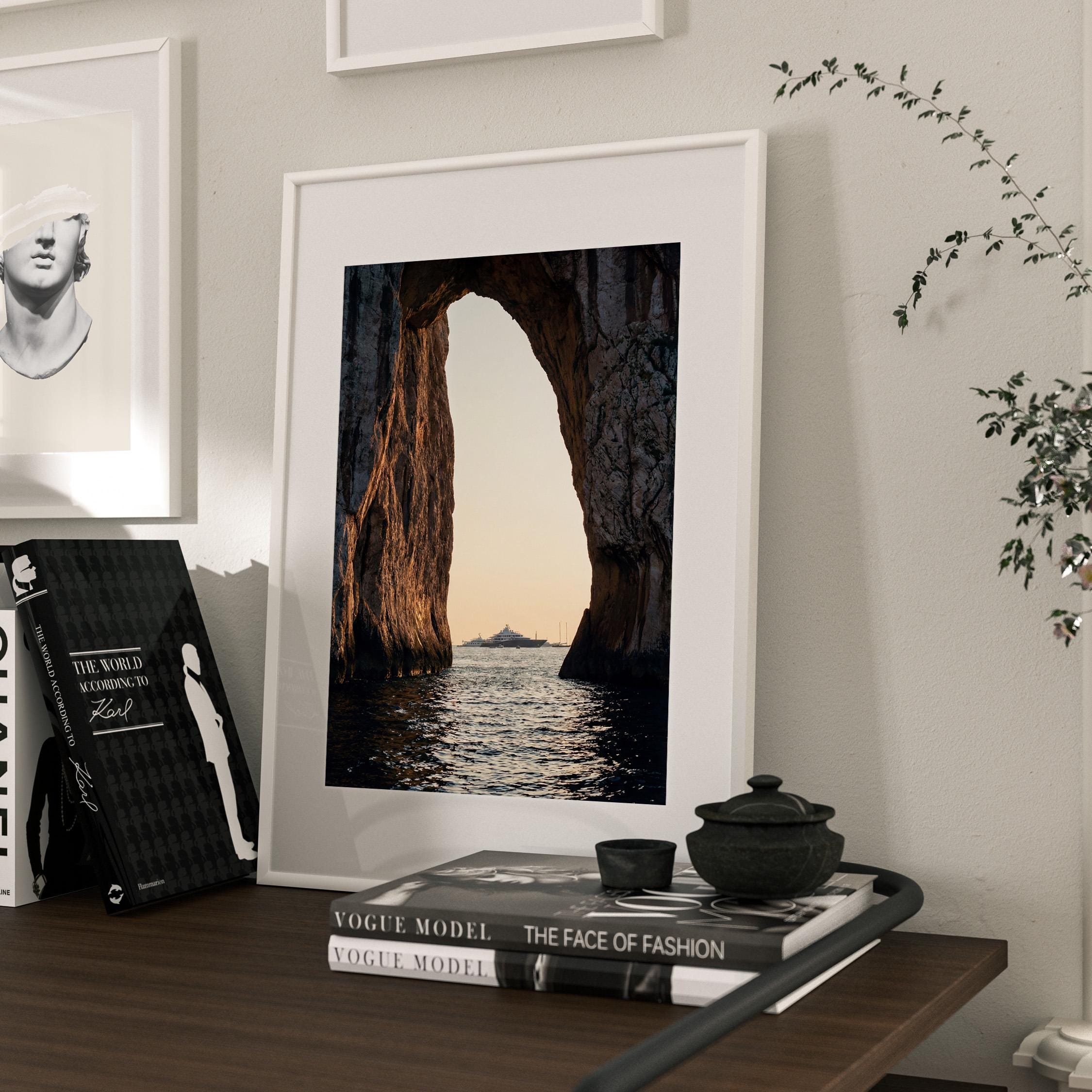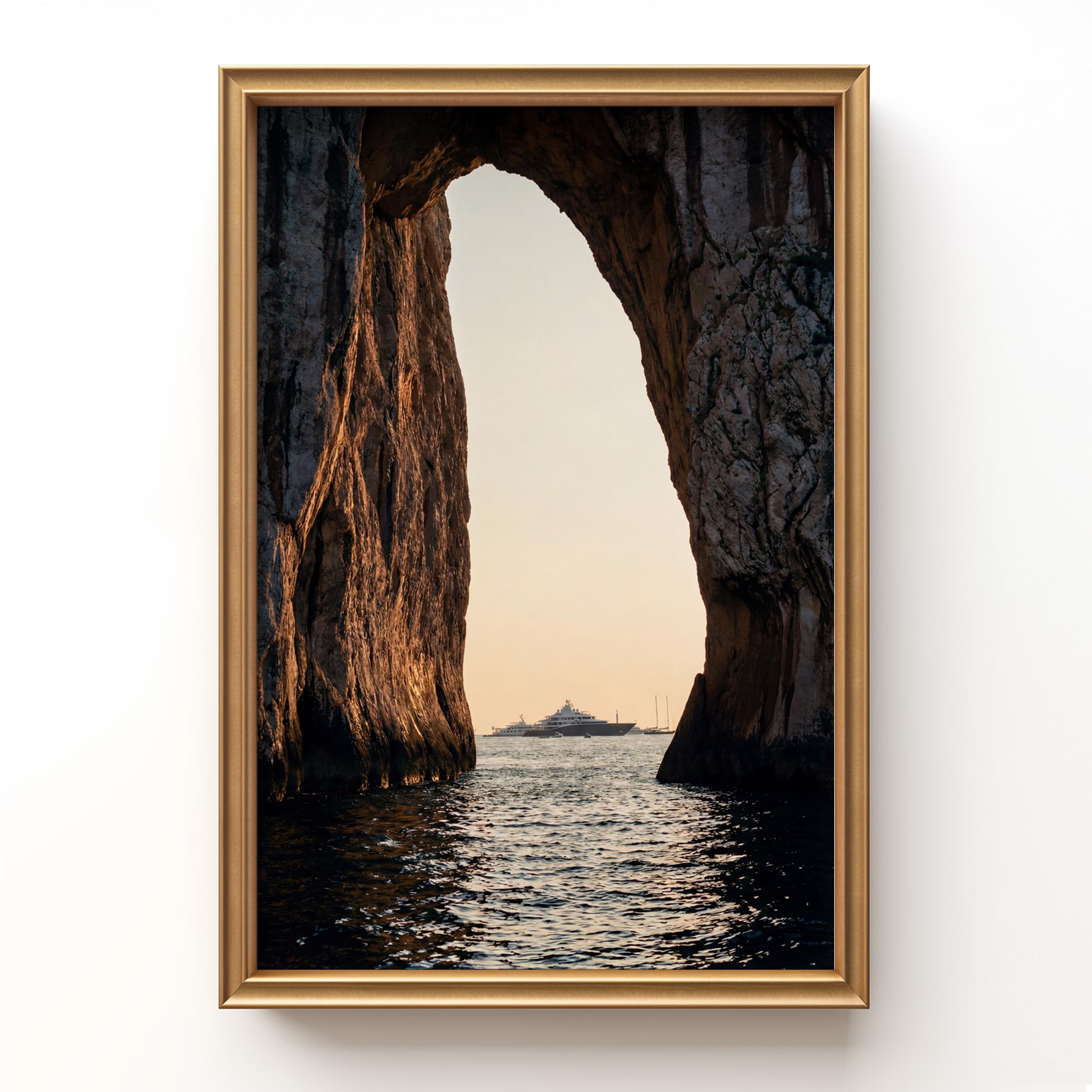 This print captures a dramatic coastal moment as a luxury yacht drifts across calm water beyond the cliffs. The contrast between rugged stone and shimmering sea creates depth and scale, drawing the eye outward.